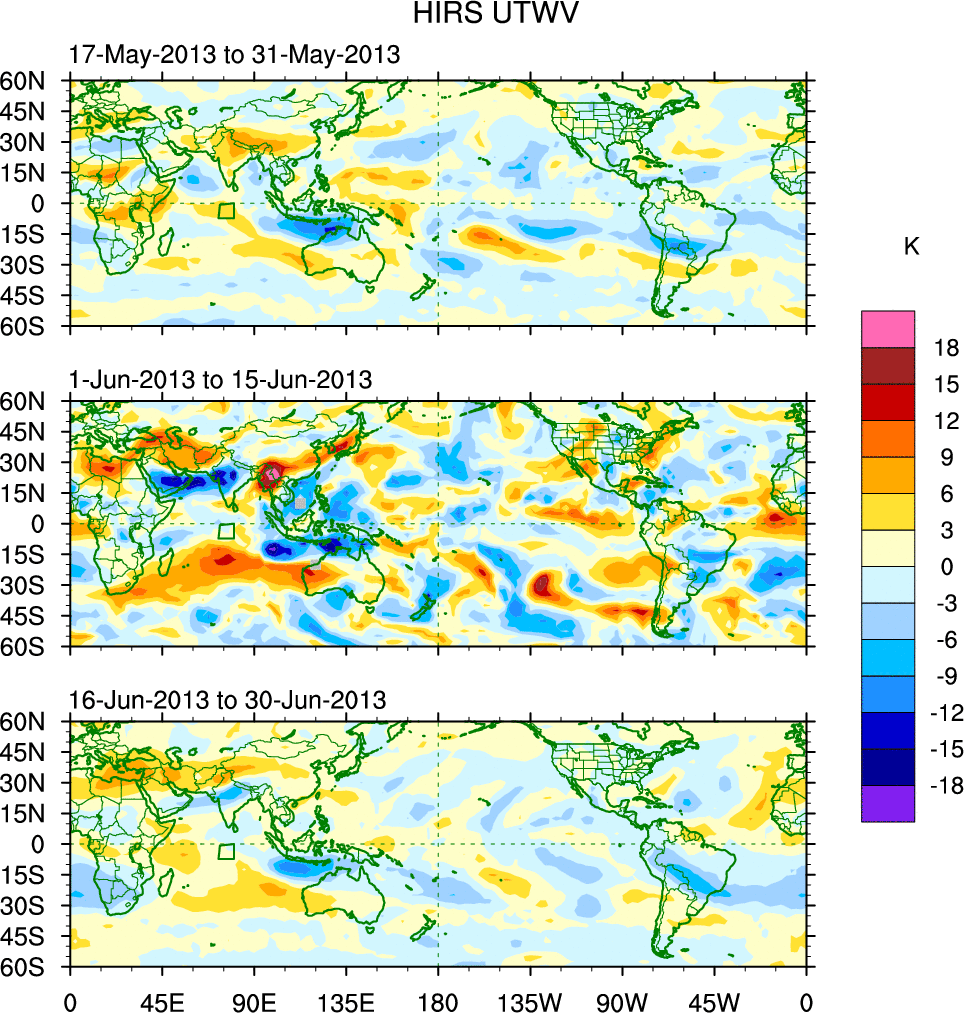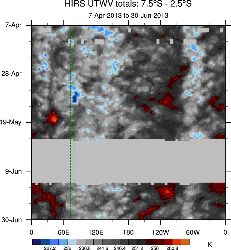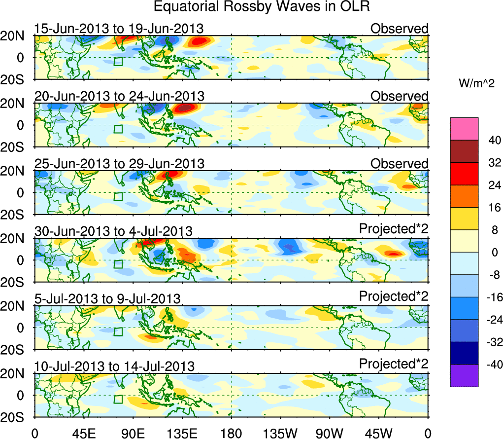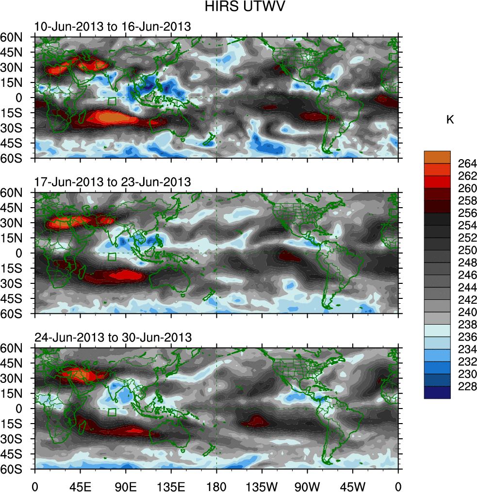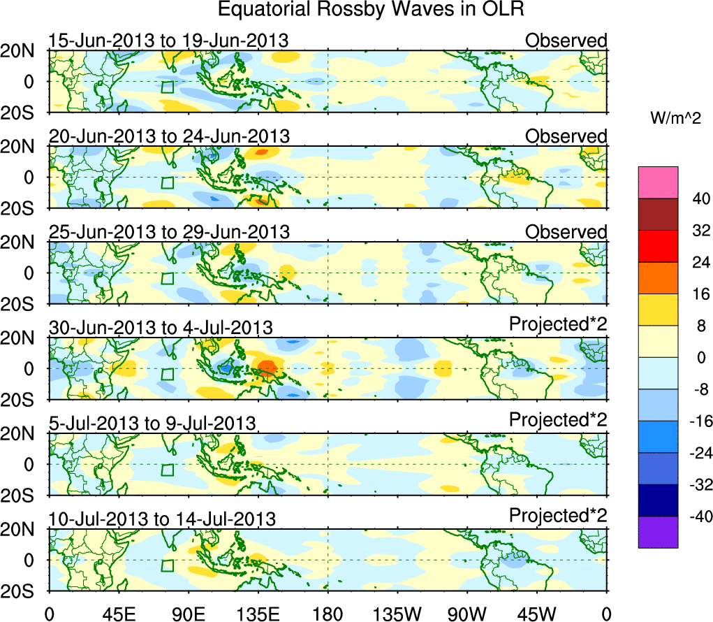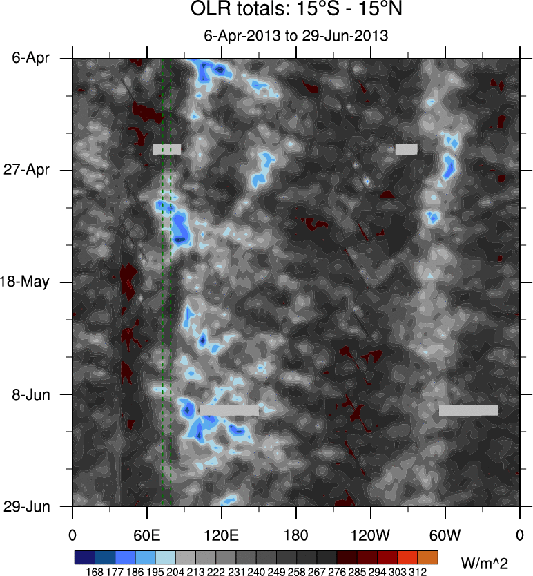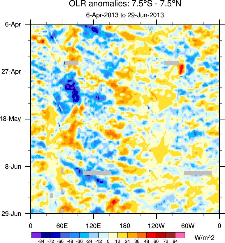 To identify tropical waves in near real-time, the OLR and UTWV data are filtered following Wheeler & Weickmann (2001 MWR). The daily anomalies are calculated using the first 3 harmonics of the seasonal cycle for 1979–2009. Missing values are then filled using linear interpolation in space and time. The most recent 365 days of anomalies are padded with 659 days of zeroes, and the result is filtered for each wave type.