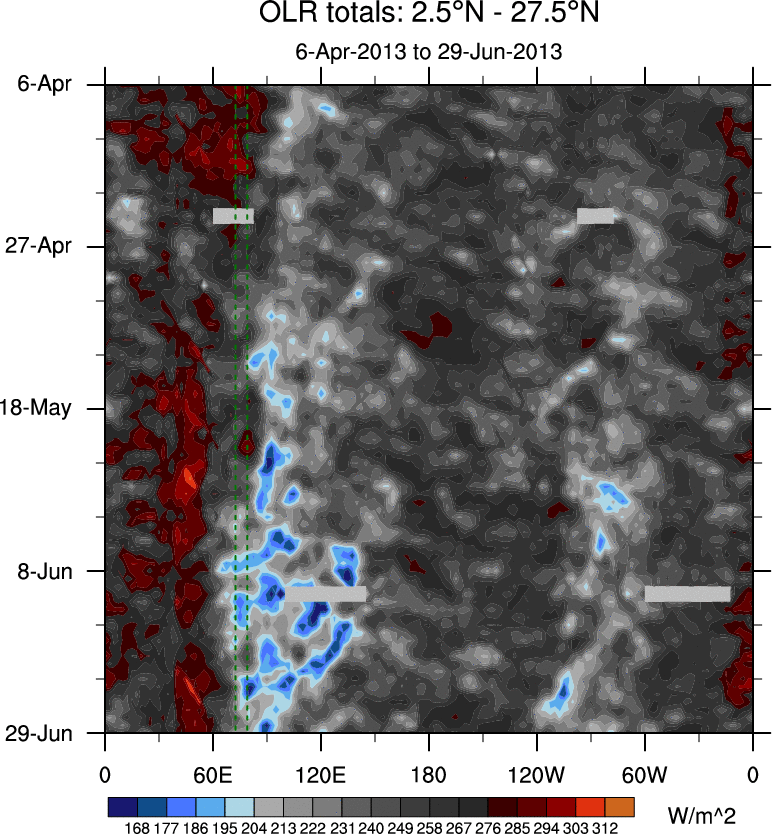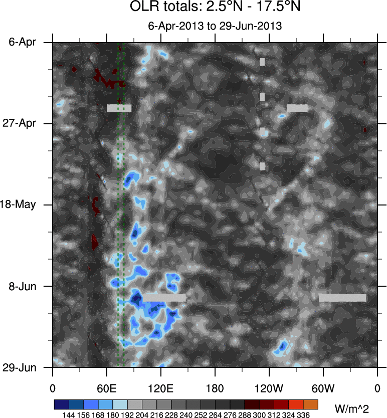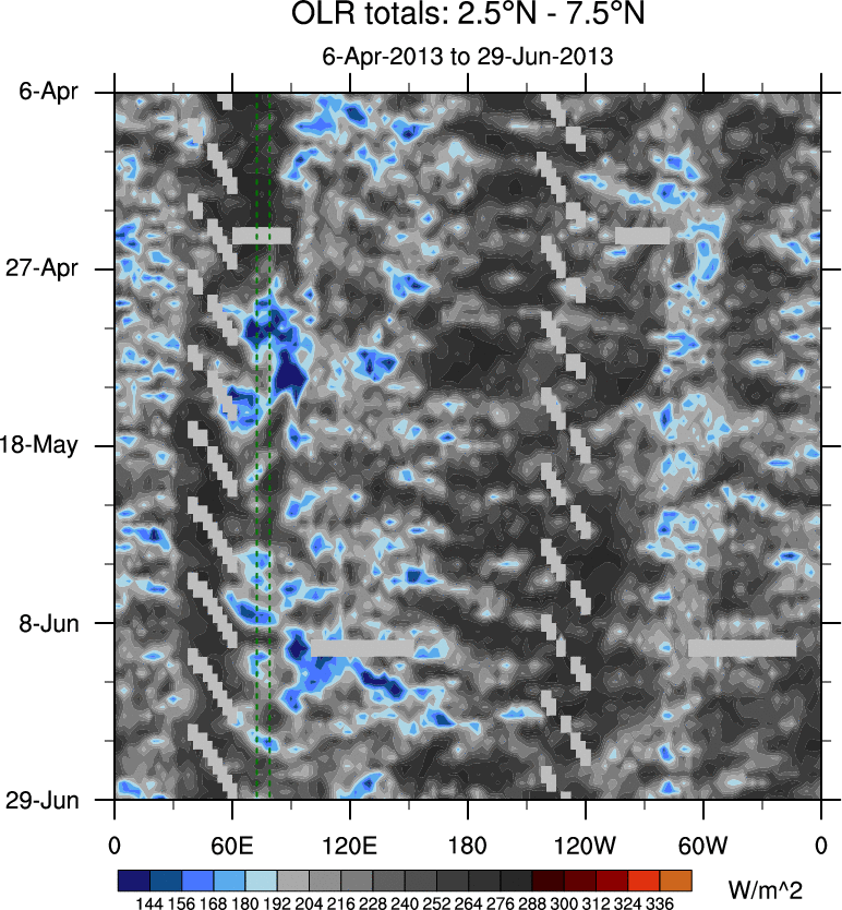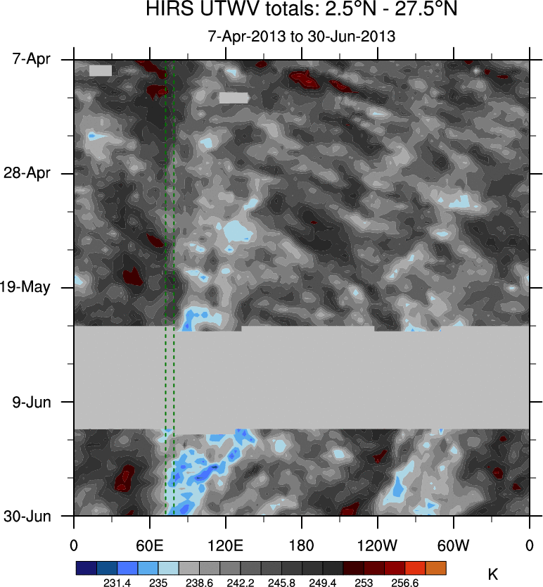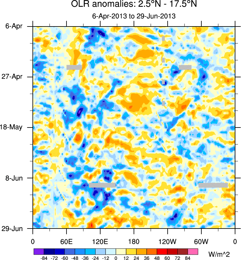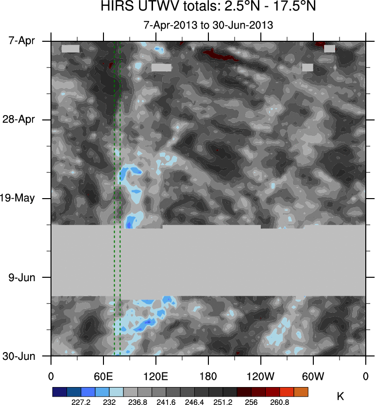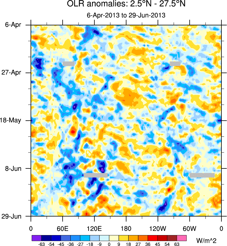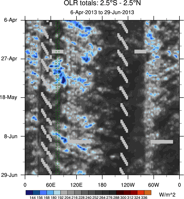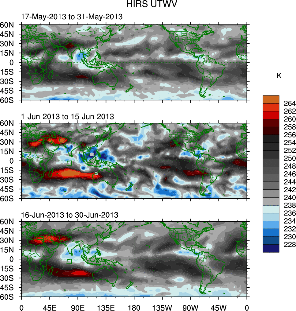 To identify tropical waves in near real-time, the OLR and UTWV data are filtered following Wheeler & Weickmann (2001 MWR). The daily anomalies are calculated using the first 3 harmonics of the seasonal cycle for 1979–2009. Missing values are then filled using linear interpolation in space and time. The most recent 365 days of anomalies are padded with 659 days of zeroes, and the result is filtered for each wave type.