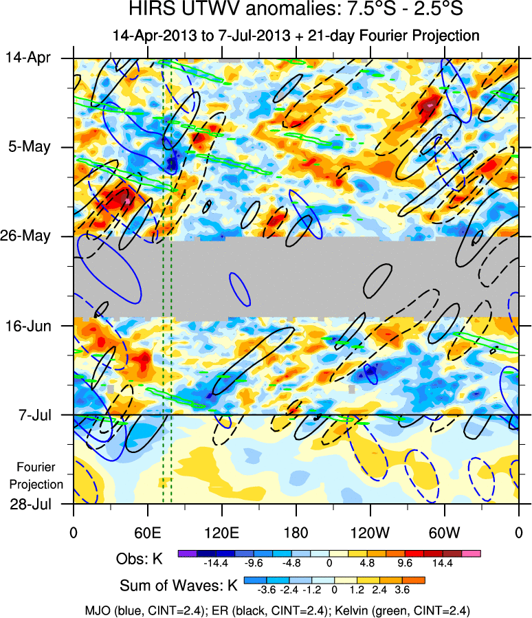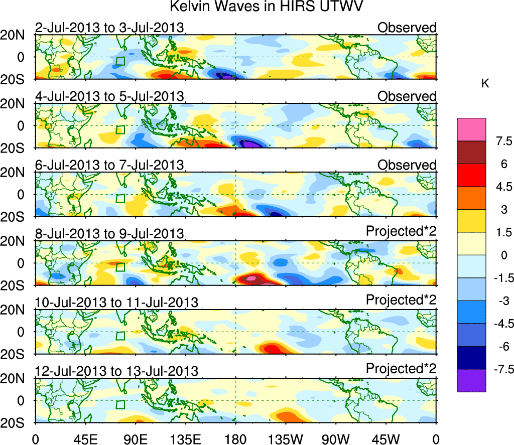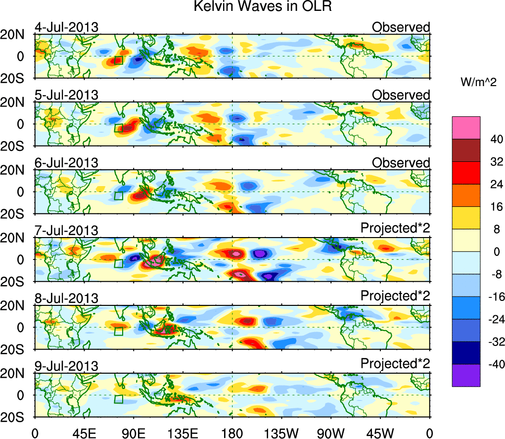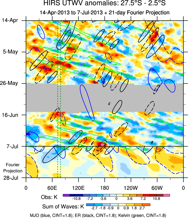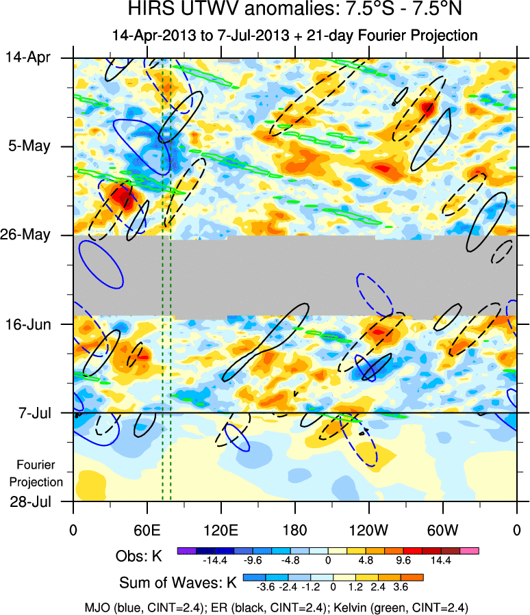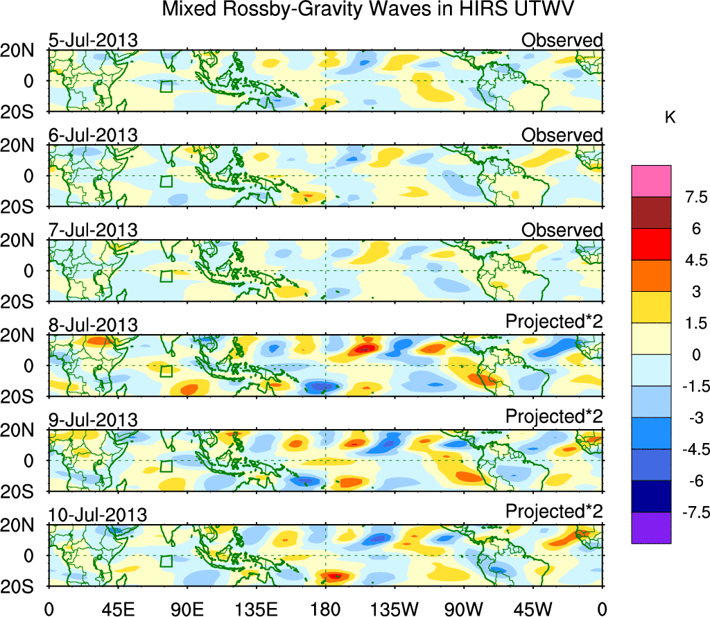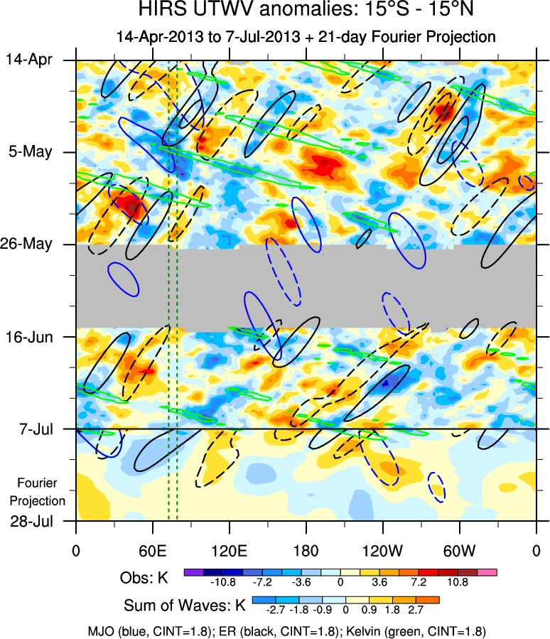 To identify tropical waves in near real-time, the OLR and UTWV data are filtered following Wheeler & Weickmann (2001 MWR). The daily anomalies are calculated using the first 3 harmonics of the seasonal cycle for 1979–2009. Missing values are then filled using linear interpolation in space and time. The most recent 365 days of anomalies are padded with 659 days of zeroes, and the result is filtered for each wave type.