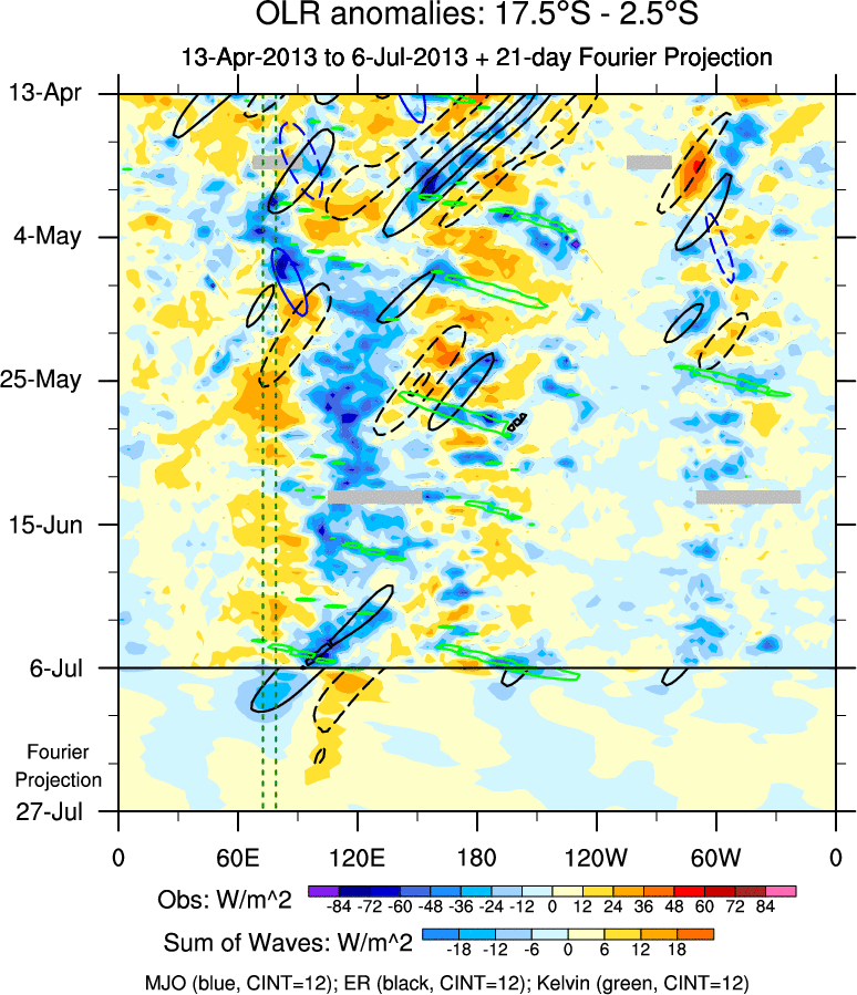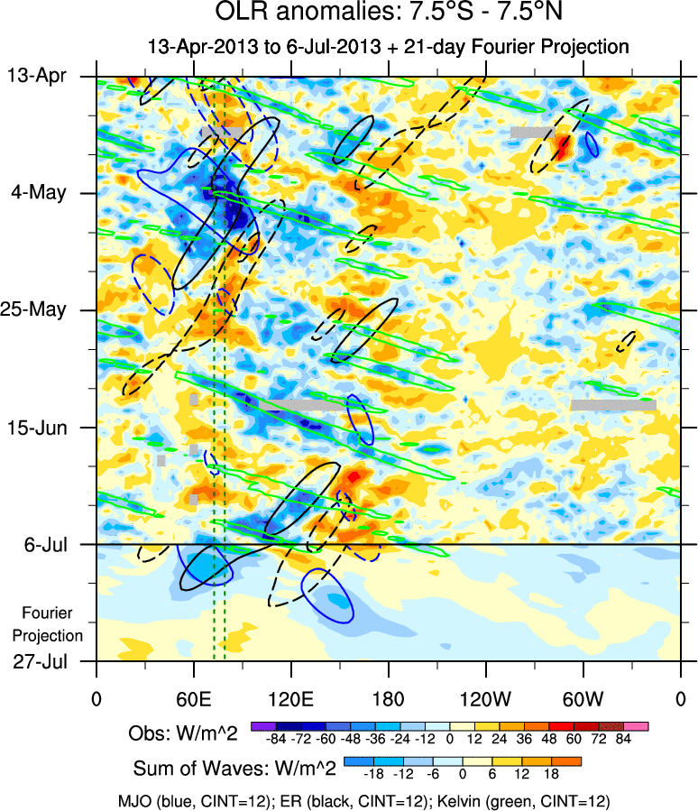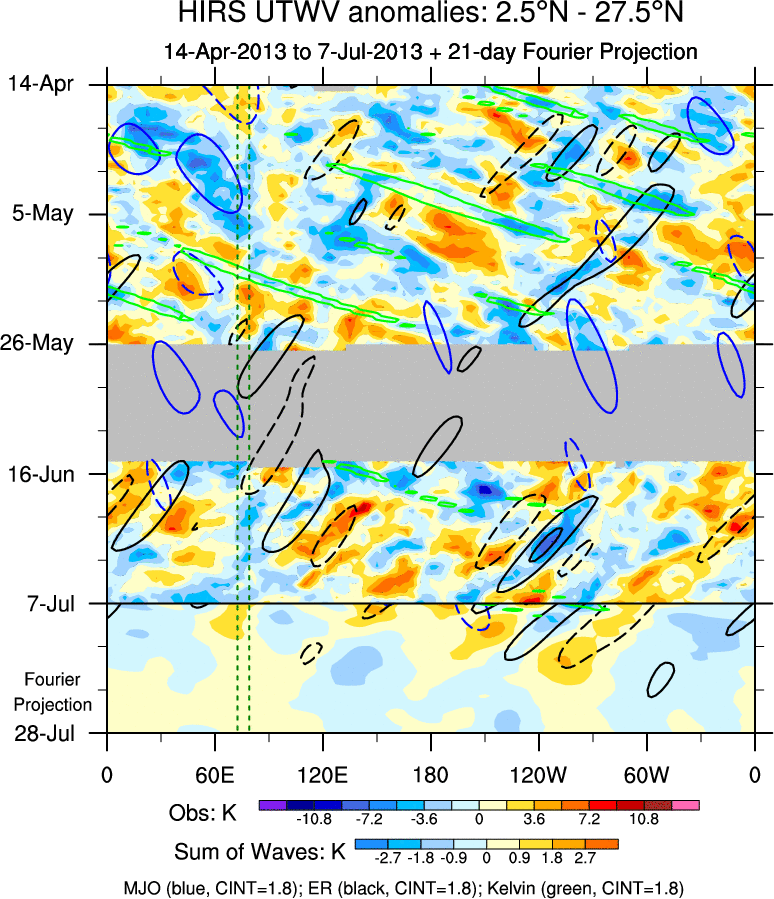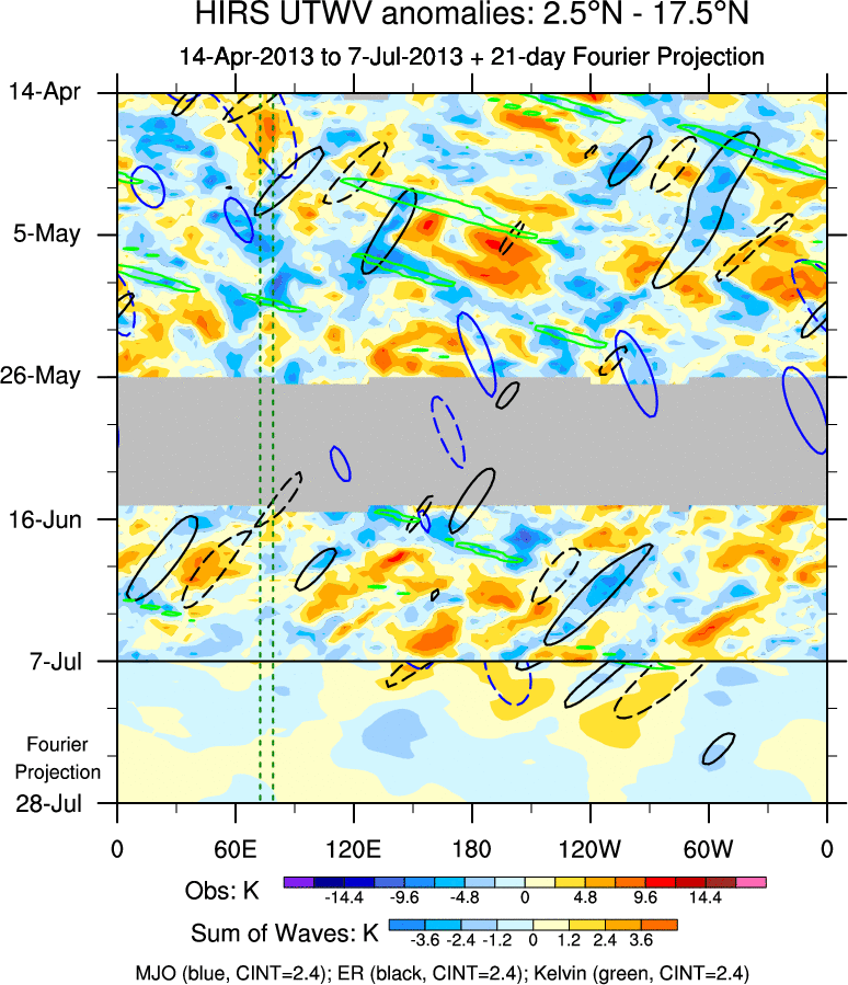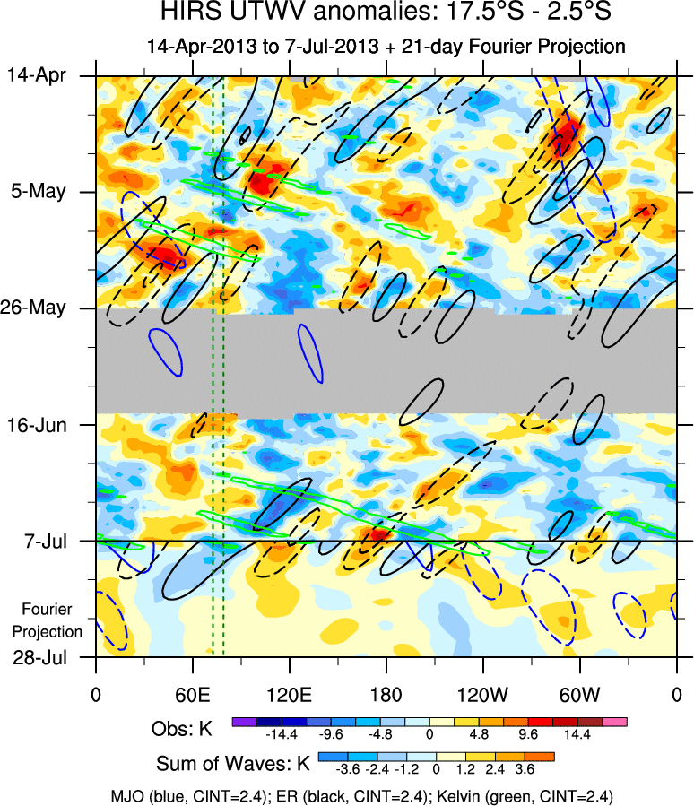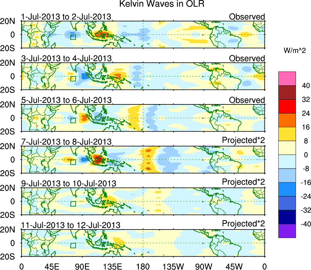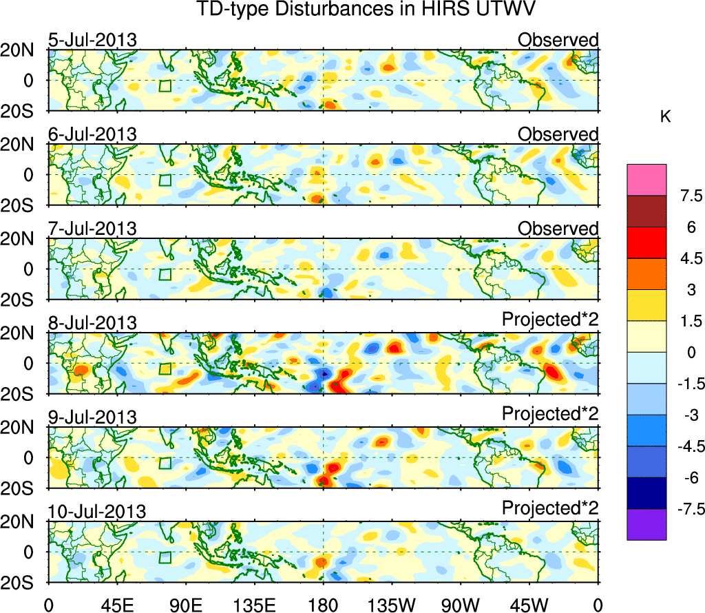 To identify tropical waves in near real-time, the OLR and UTWV data are filtered following Wheeler & Weickmann (2001 MWR). The daily anomalies are calculated using the first 3 harmonics of the seasonal cycle for 1979–2009. Missing values are then filled using linear interpolation in space and time. The most recent 365 days of anomalies are padded with 659 days of zeroes, and the result is filtered for each wave type.