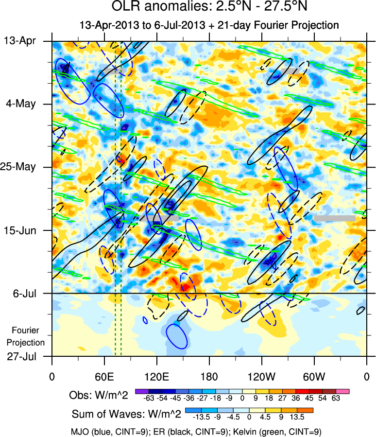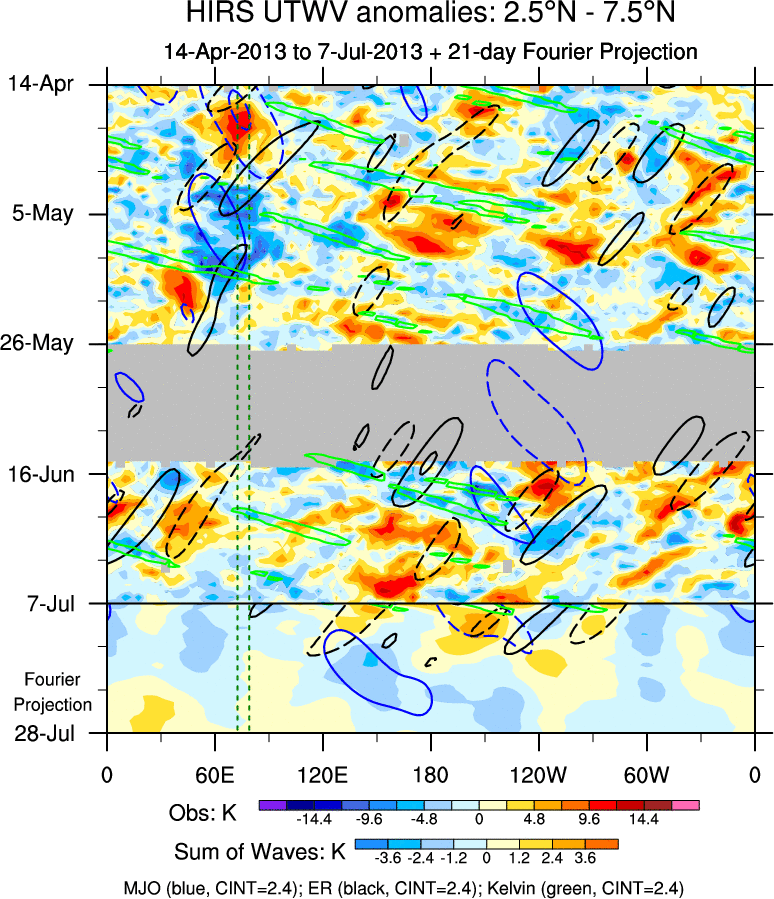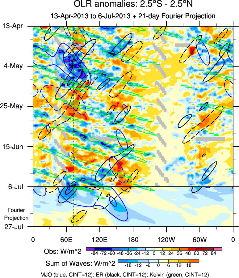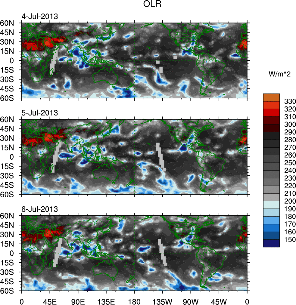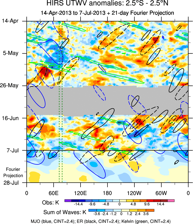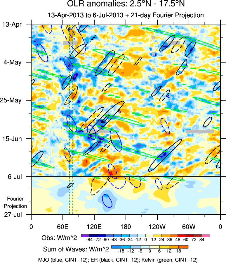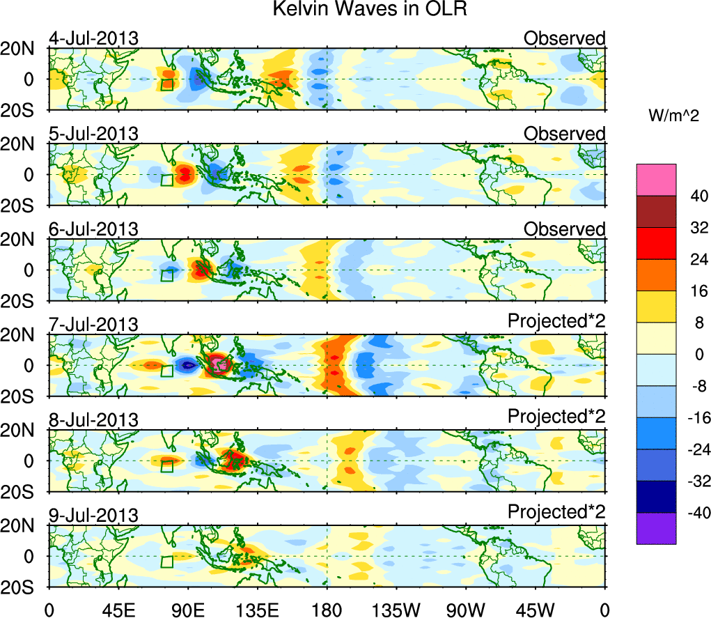 To identify tropical waves in near real-time, the OLR and UTWV data are filtered following Wheeler & Weickmann (2001 MWR). The daily anomalies are calculated using the first 3 harmonics of the seasonal cycle for 1979–2009. Missing values are then filled using linear interpolation in space and time. The most recent 365 days of anomalies are padded with 659 days of zeroes, and the result is filtered for each wave type.