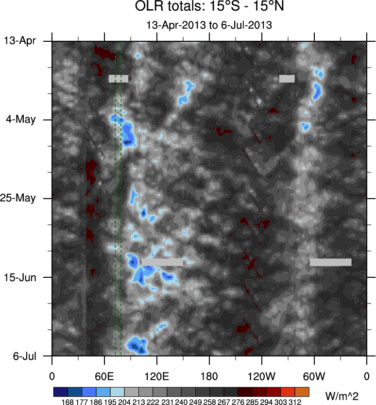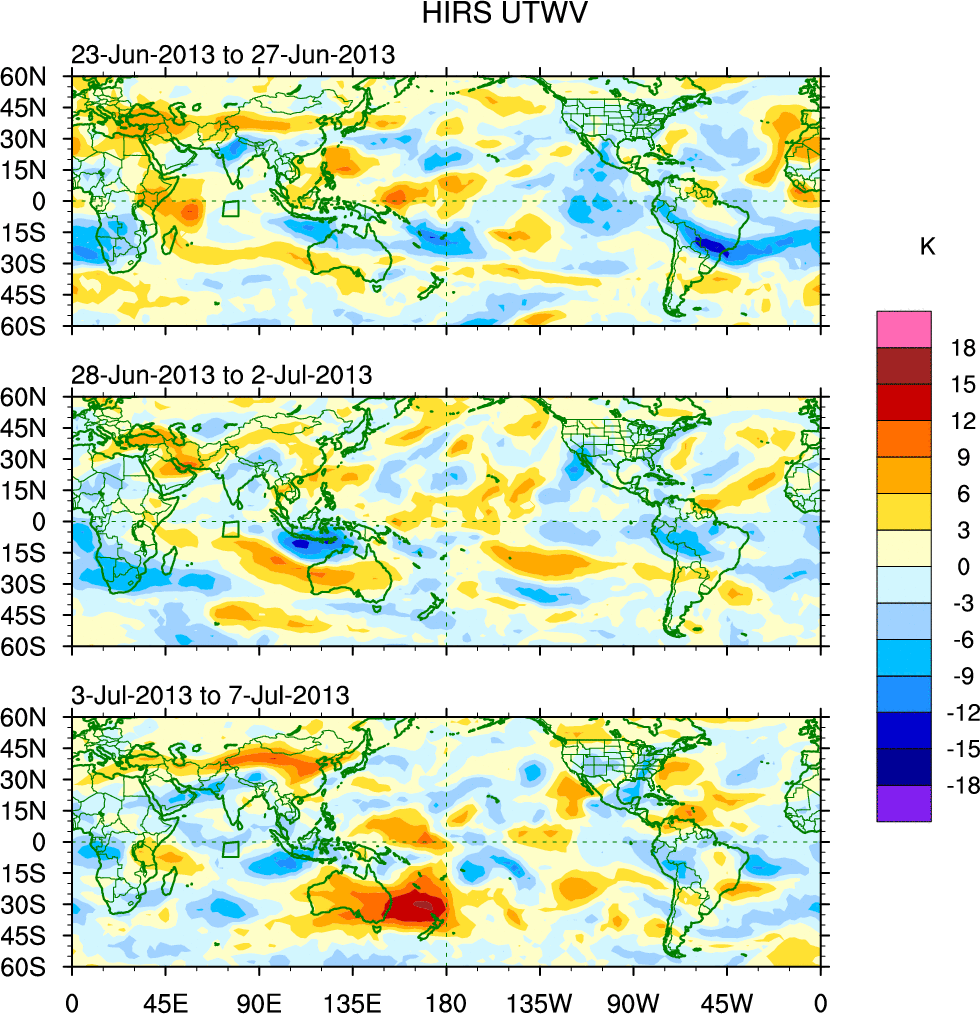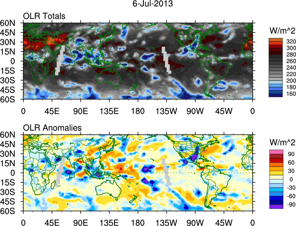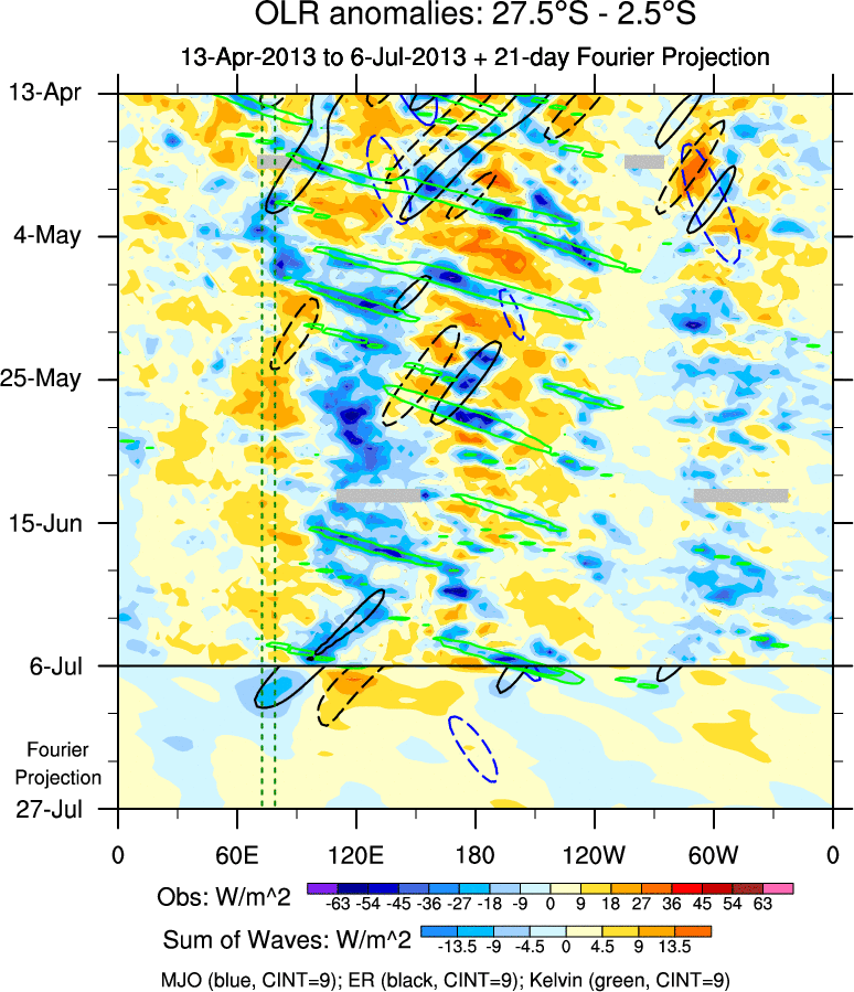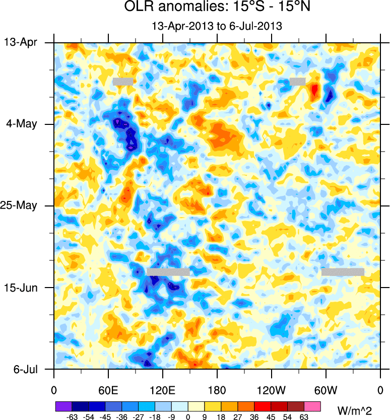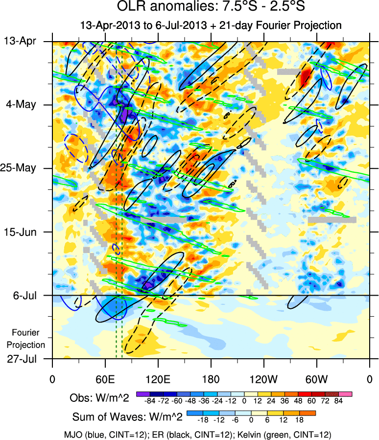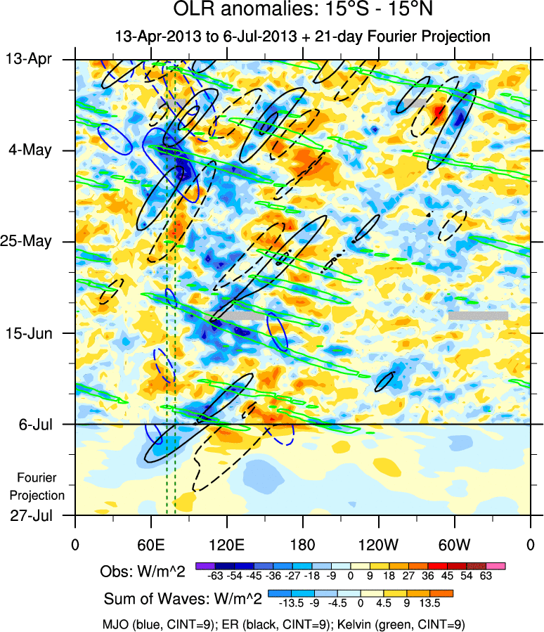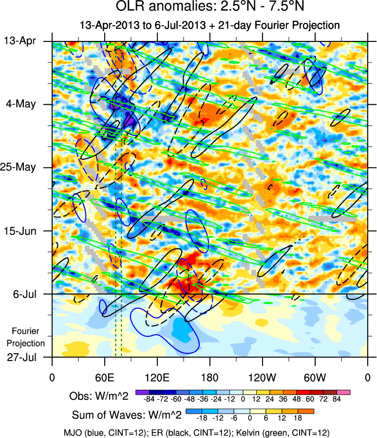 To identify tropical waves in near real-time, the OLR and UTWV data are filtered following Wheeler & Weickmann (2001 MWR). The daily anomalies are calculated using the first 3 harmonics of the seasonal cycle for 1979–2009. Missing values are then filled using linear interpolation in space and time. The most recent 365 days of anomalies are padded with 659 days of zeroes, and the result is filtered for each wave type.
