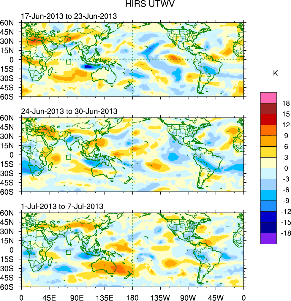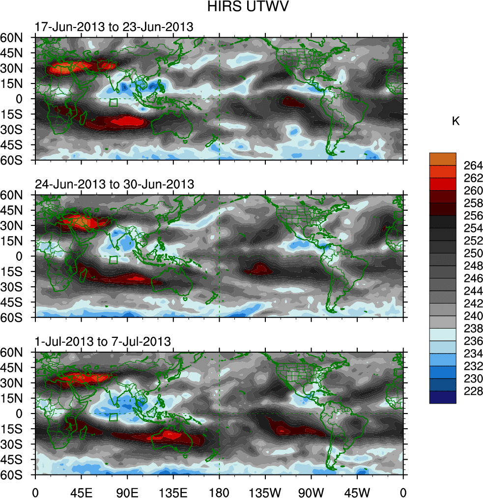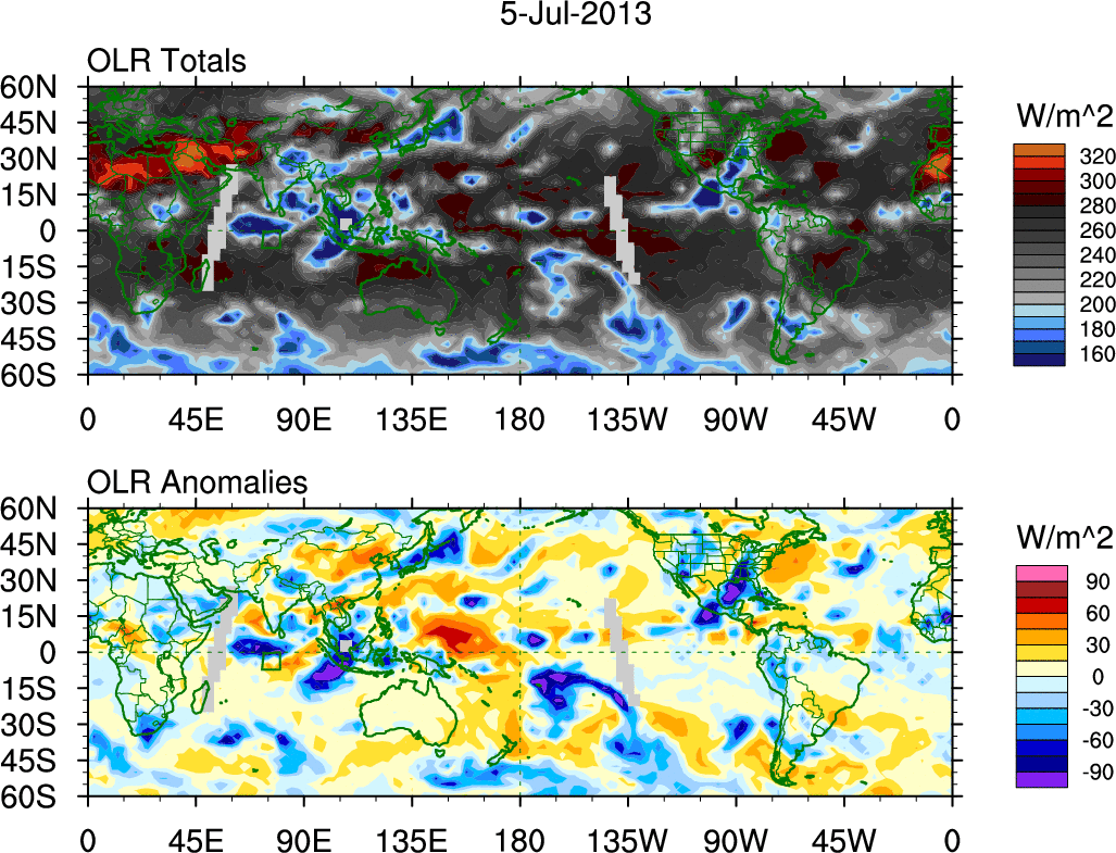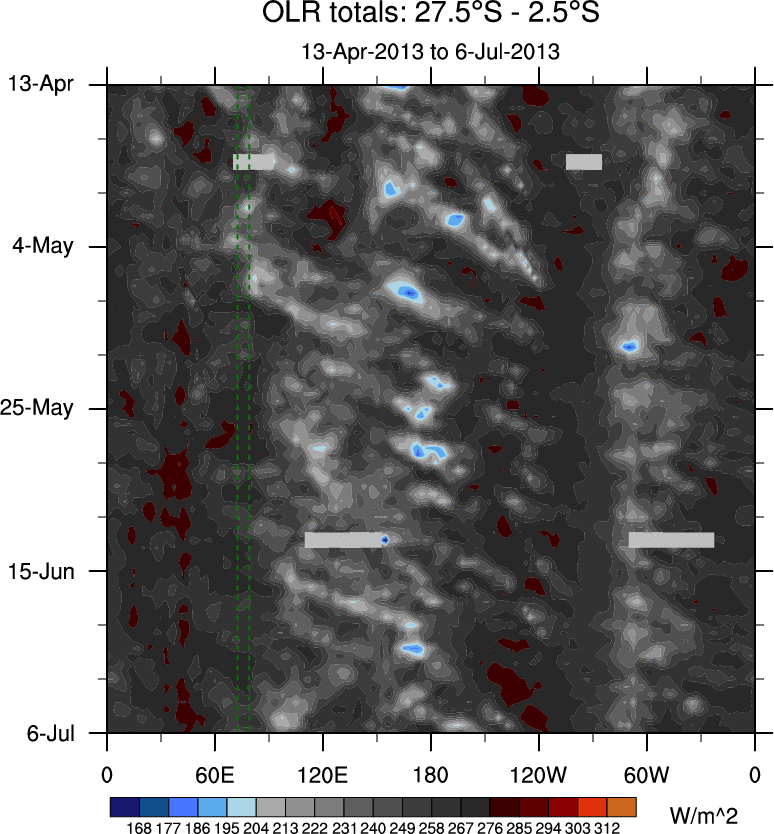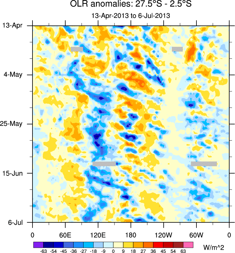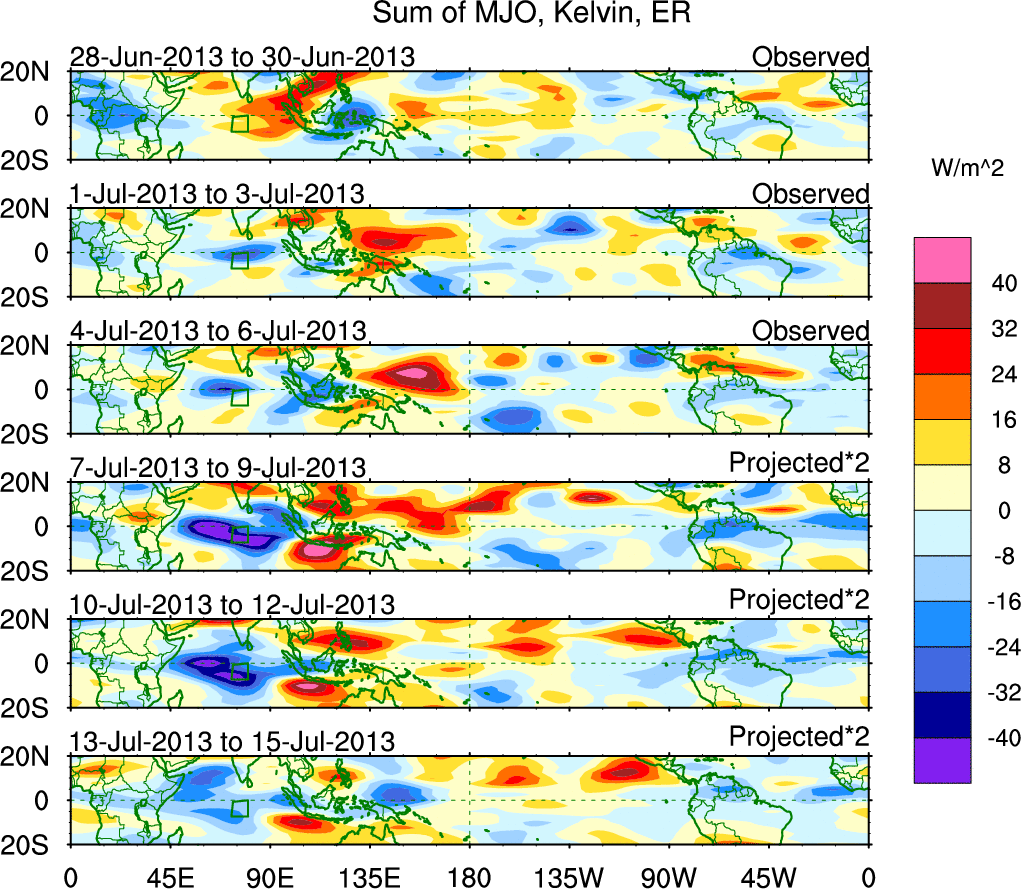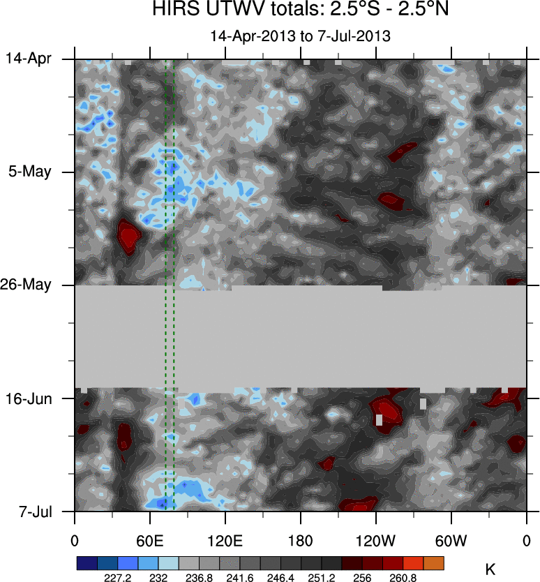 To identify tropical waves in near real-time, the OLR and UTWV data are filtered following Wheeler & Weickmann (2001 MWR). The daily anomalies are calculated using the first 3 harmonics of the seasonal cycle for 1979–2009. Missing values are then filled using linear interpolation in space and time. The most recent 365 days of anomalies are padded with 659 days of zeroes, and the result is filtered for each wave type.