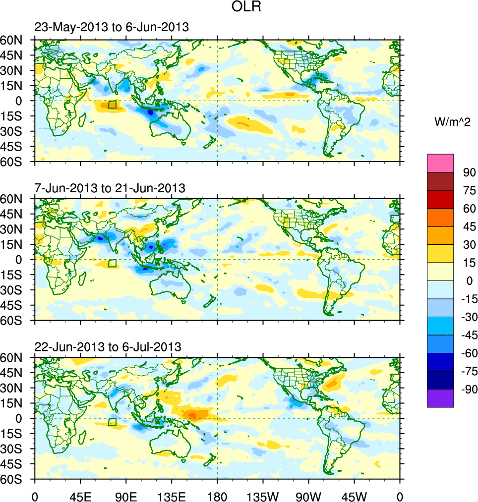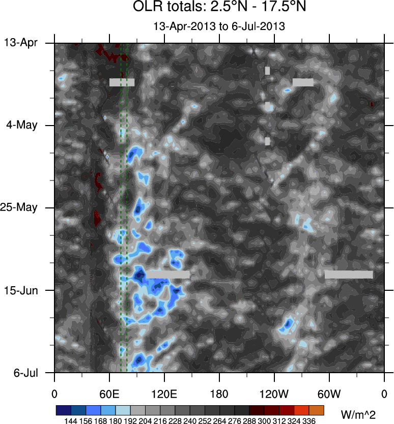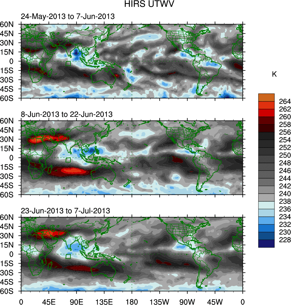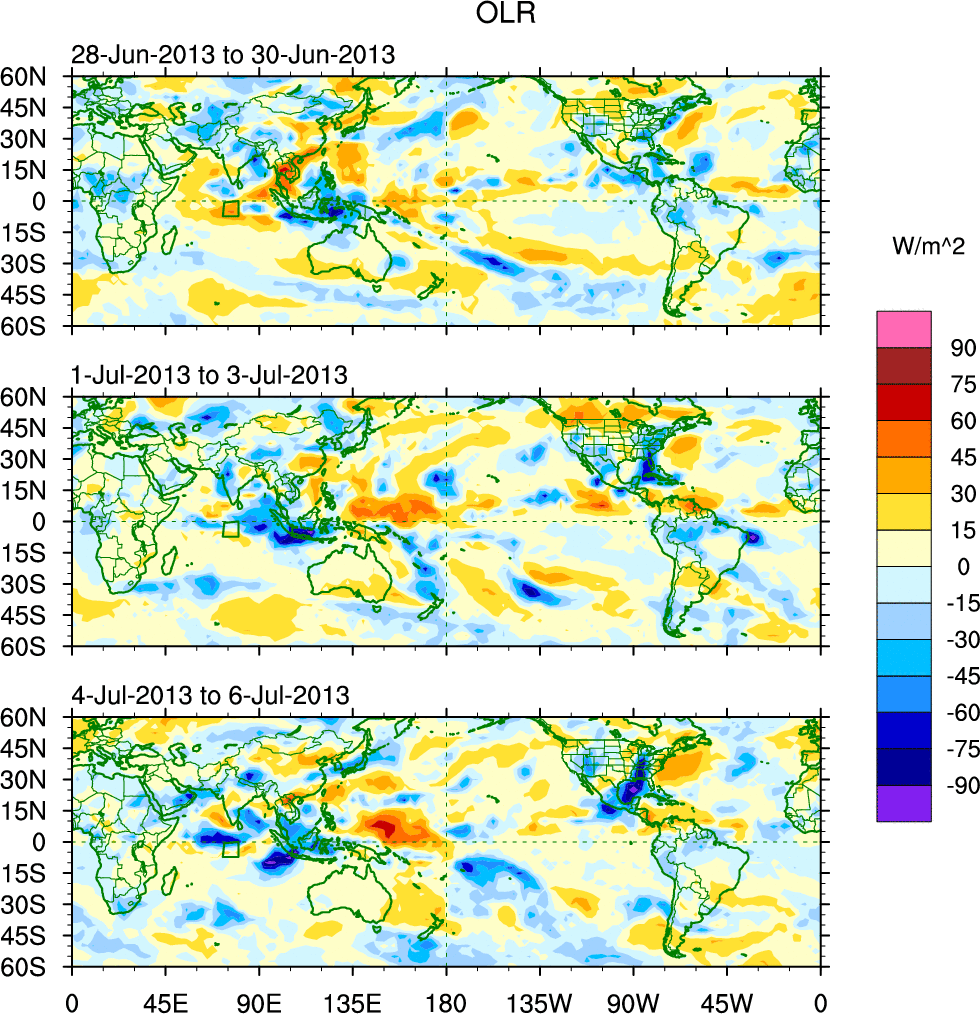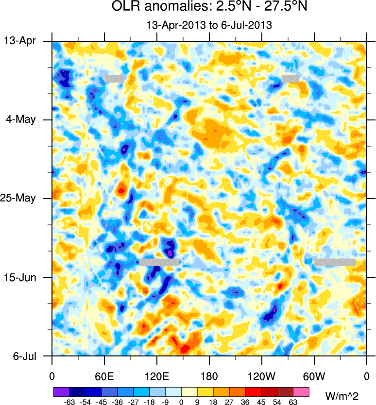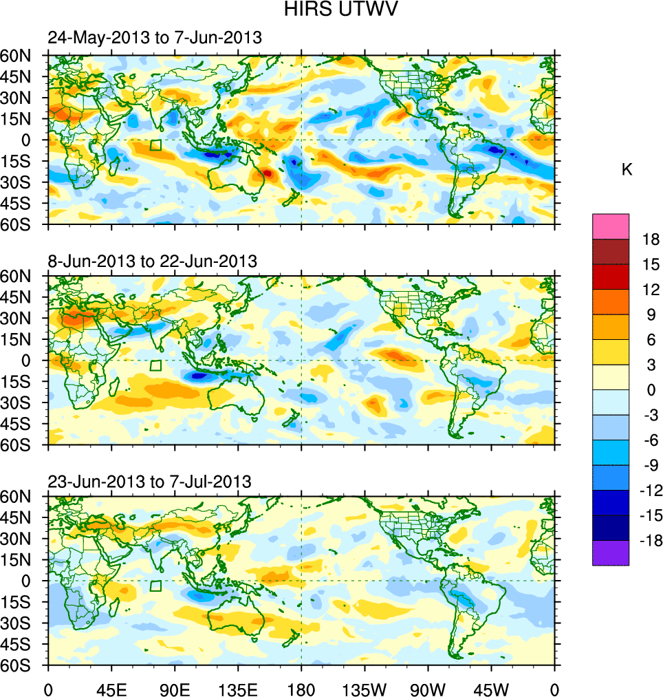 To identify tropical waves in near real-time, the OLR and UTWV data are filtered following Wheeler & Weickmann (2001 MWR). The daily anomalies are calculated using the first 3 harmonics of the seasonal cycle for 1979–2009. Missing values are then filled using linear interpolation in space and time. The most recent 365 days of anomalies are padded with 659 days of zeroes, and the result is filtered for each wave type.