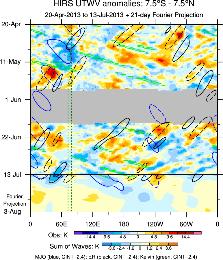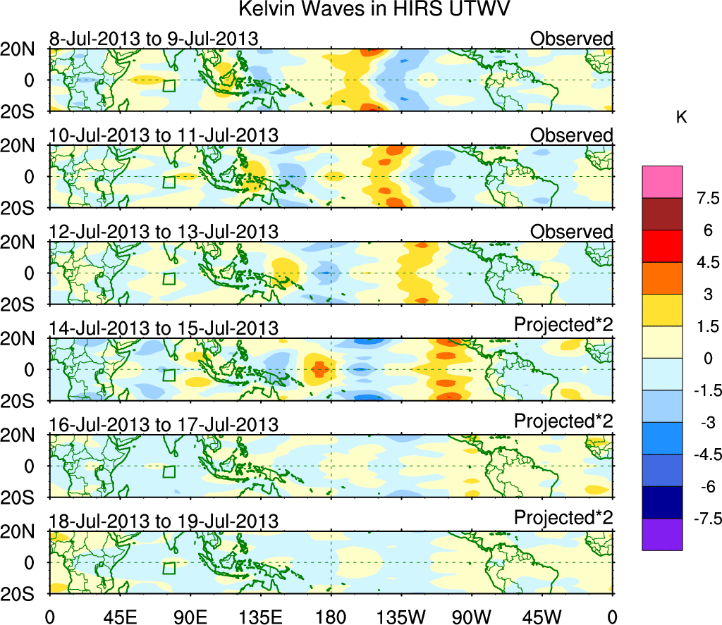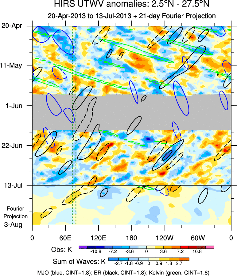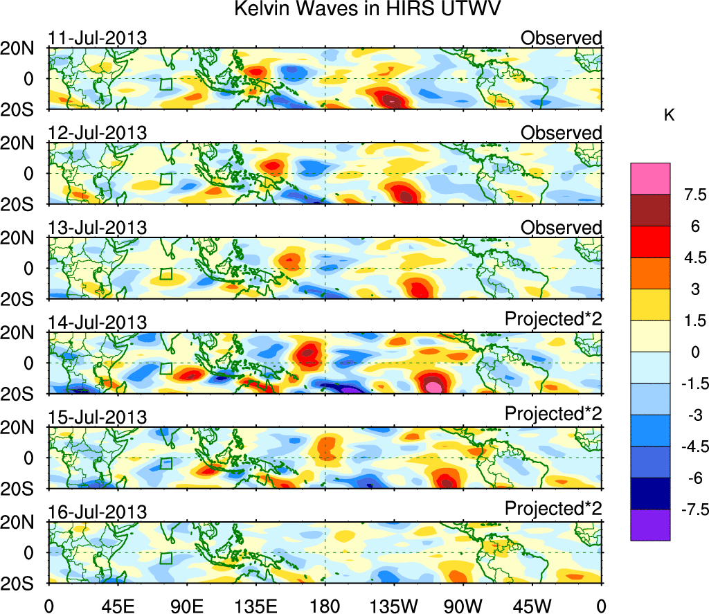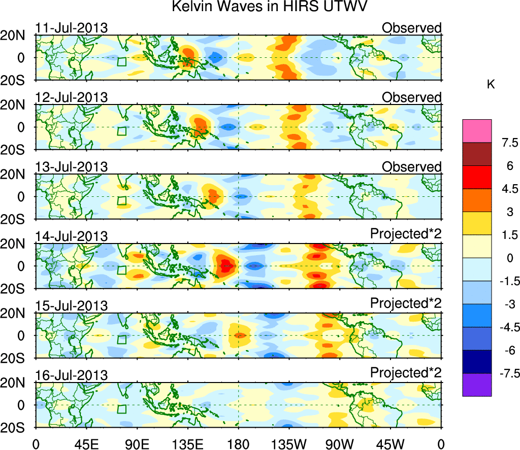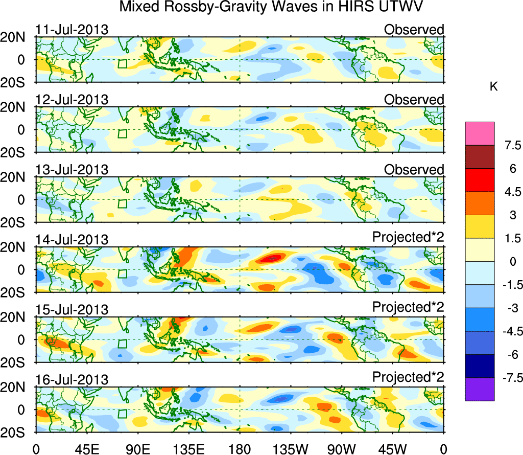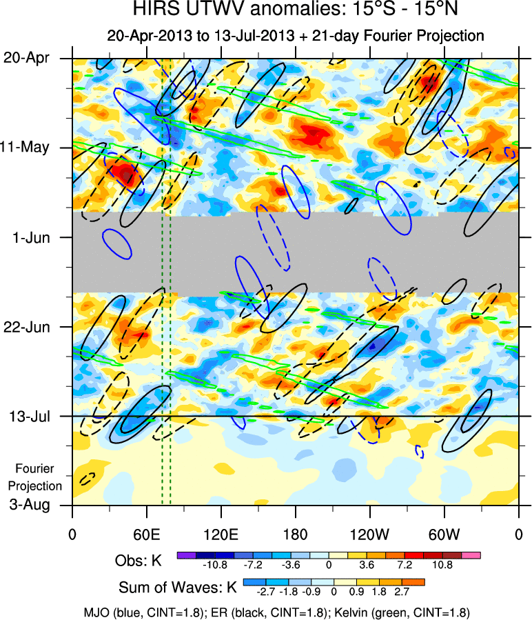 To identify tropical waves in near real-time, the OLR and UTWV data are filtered following Wheeler & Weickmann (2001 MWR). The daily anomalies are calculated using the first 3 harmonics of the seasonal cycle for 1979–2009. Missing values are then filled using linear interpolation in space and time. The most recent 365 days of anomalies are padded with 659 days of zeroes, and the result is filtered for each wave type.