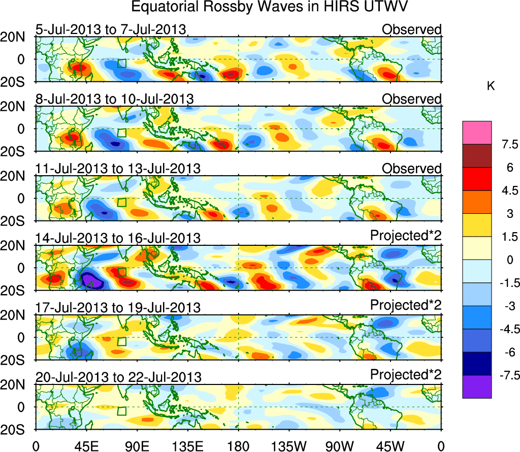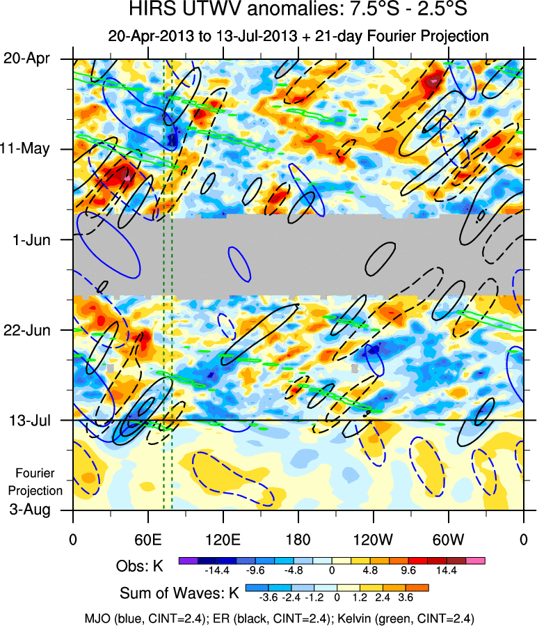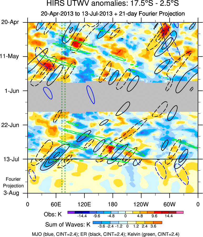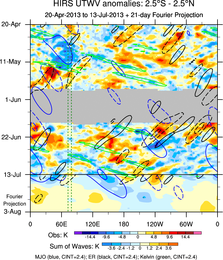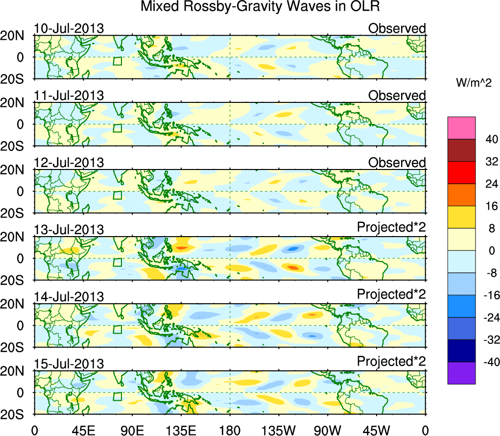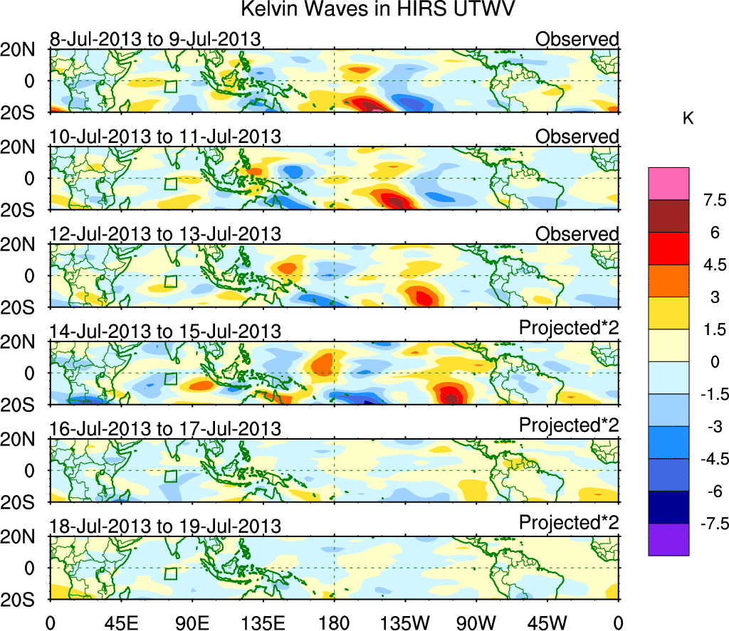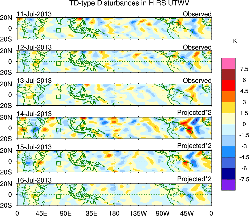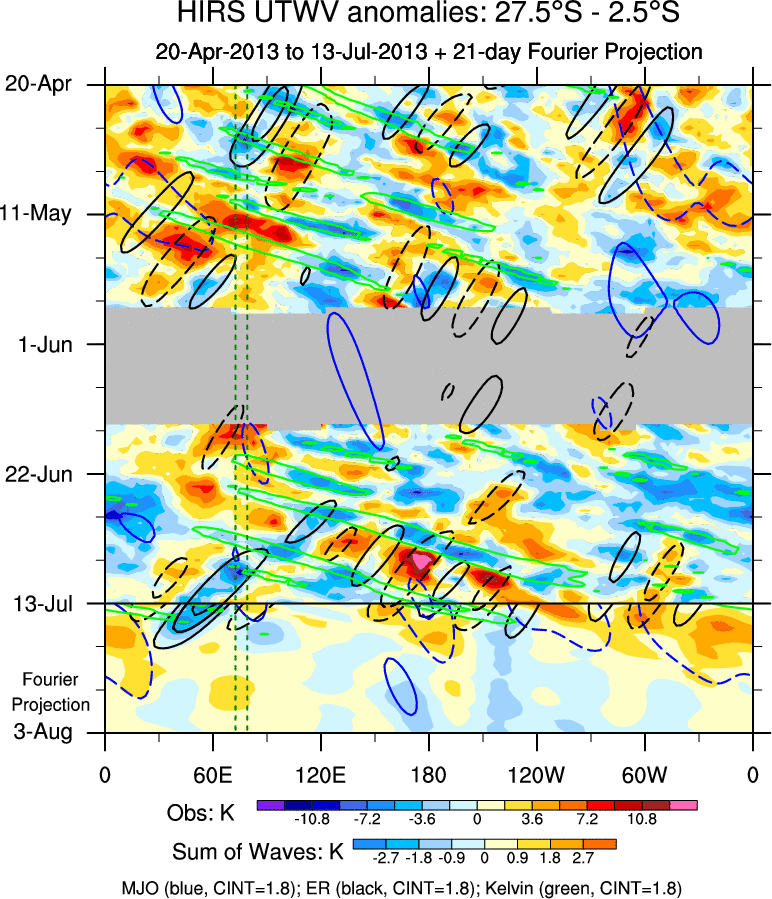 To identify tropical waves in near real-time, the OLR and UTWV data are filtered following Wheeler & Weickmann (2001 MWR). The daily anomalies are calculated using the first 3 harmonics of the seasonal cycle for 1979–2009. Missing values are then filled using linear interpolation in space and time. The most recent 365 days of anomalies are padded with 659 days of zeroes, and the result is filtered for each wave type.