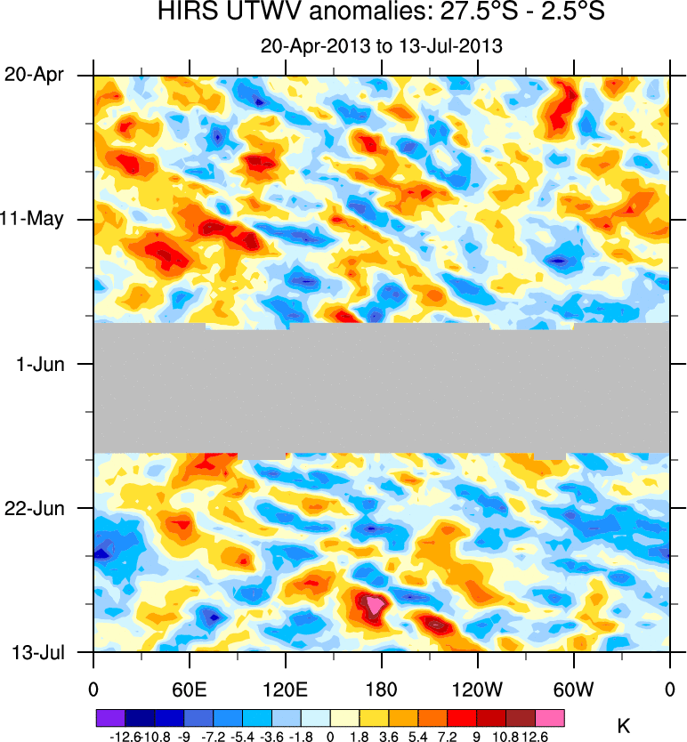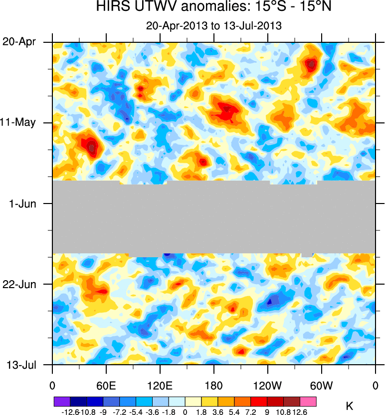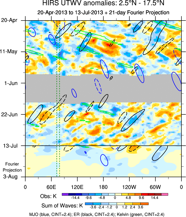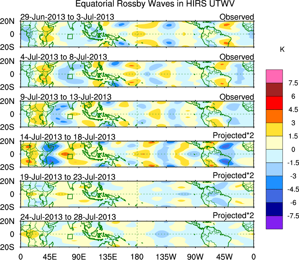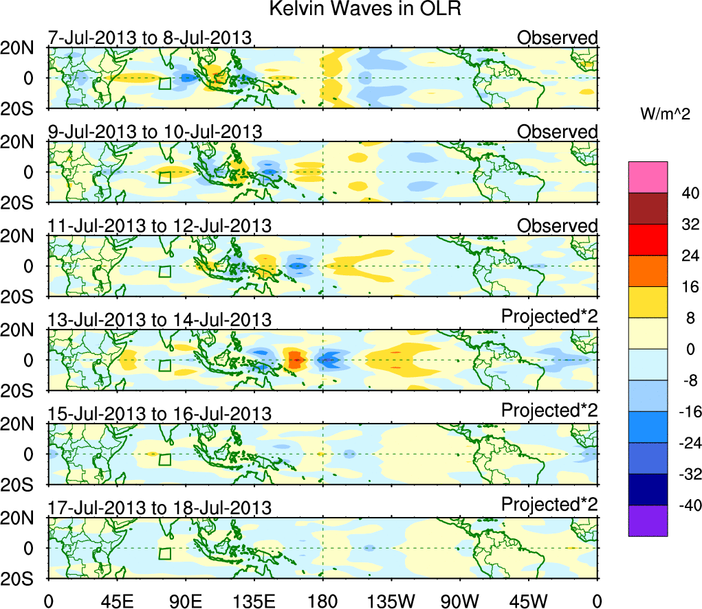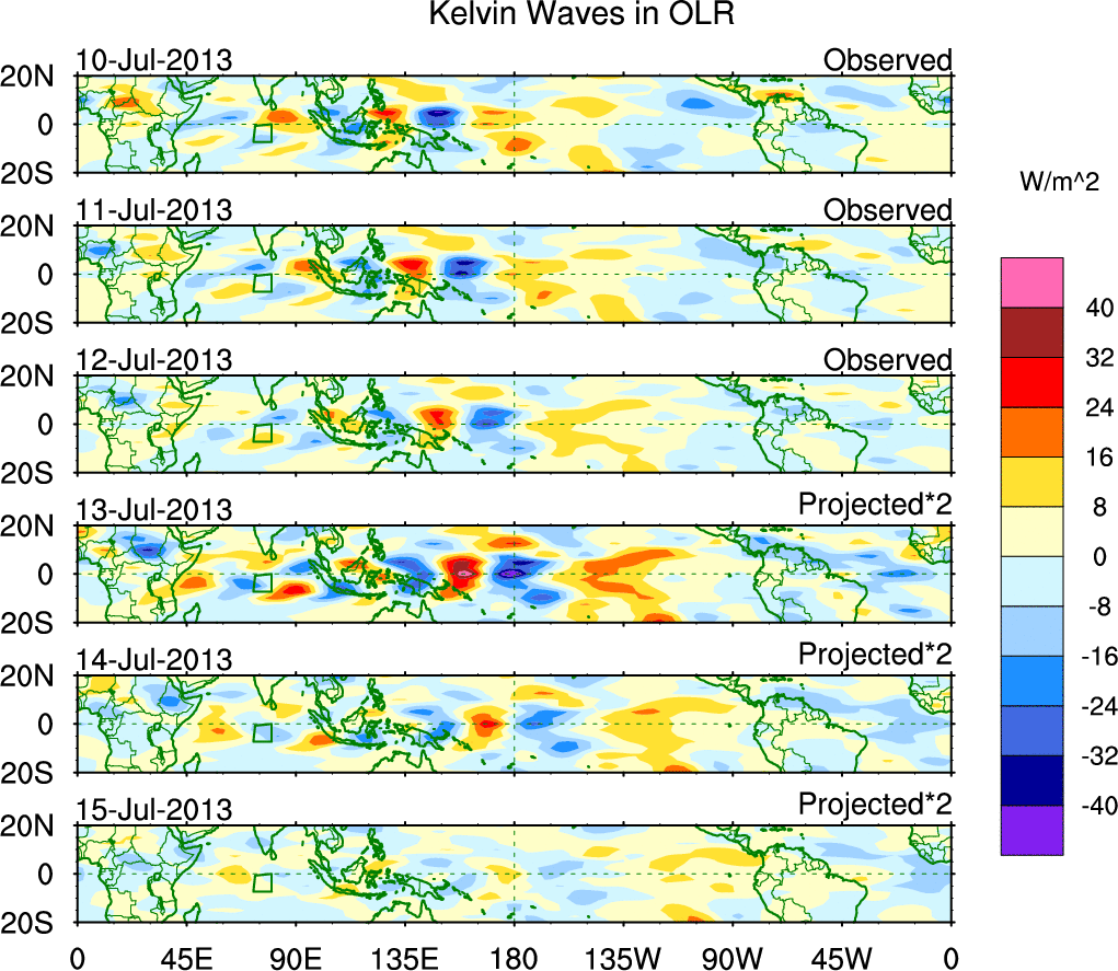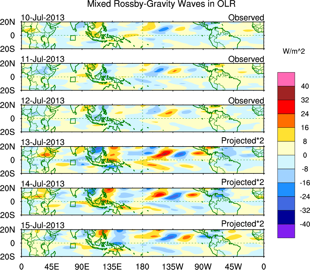 To identify tropical waves in near real-time, the OLR and UTWV data are filtered following Wheeler & Weickmann (2001 MWR). The daily anomalies are calculated using the first 3 harmonics of the seasonal cycle for 1979–2009. Missing values are then filled using linear interpolation in space and time. The most recent 365 days of anomalies are padded with 659 days of zeroes, and the result is filtered for each wave type.
