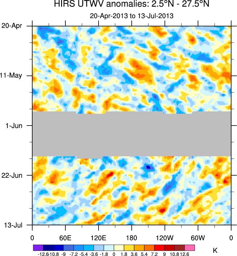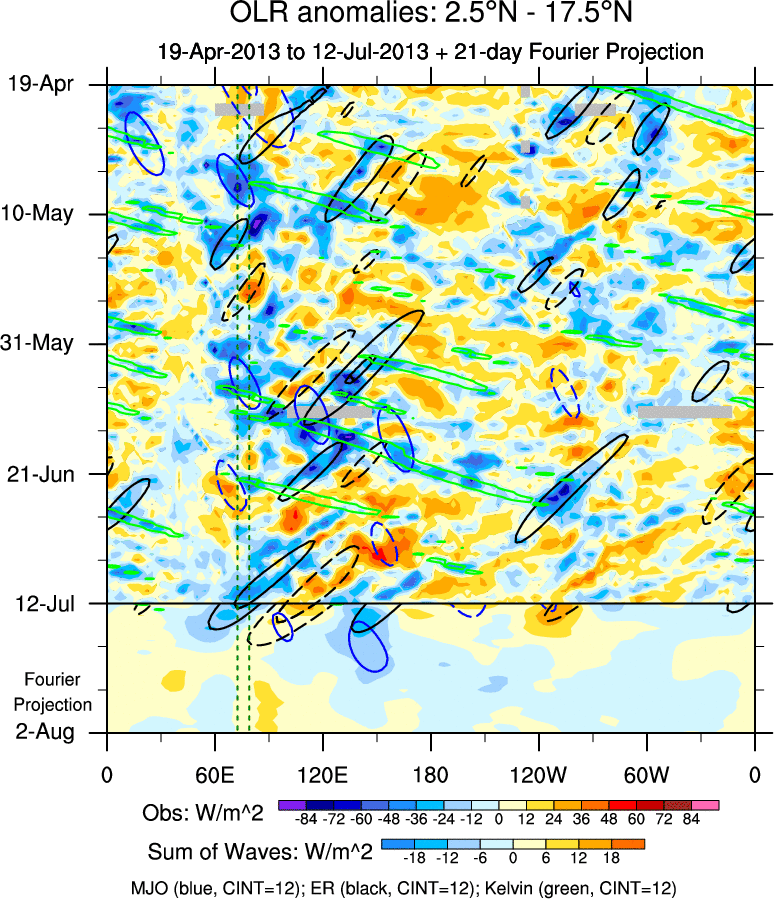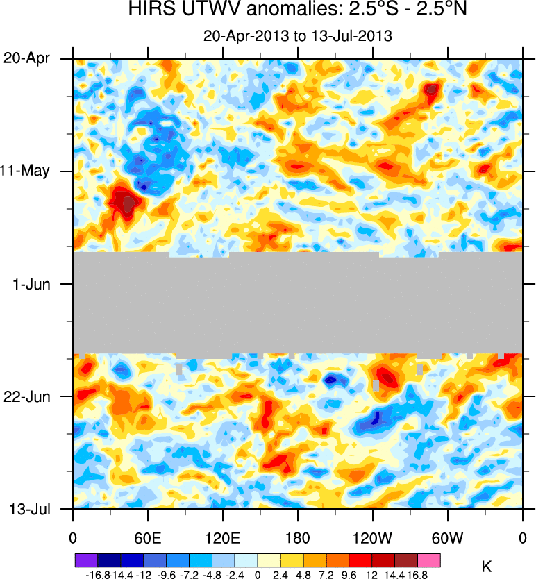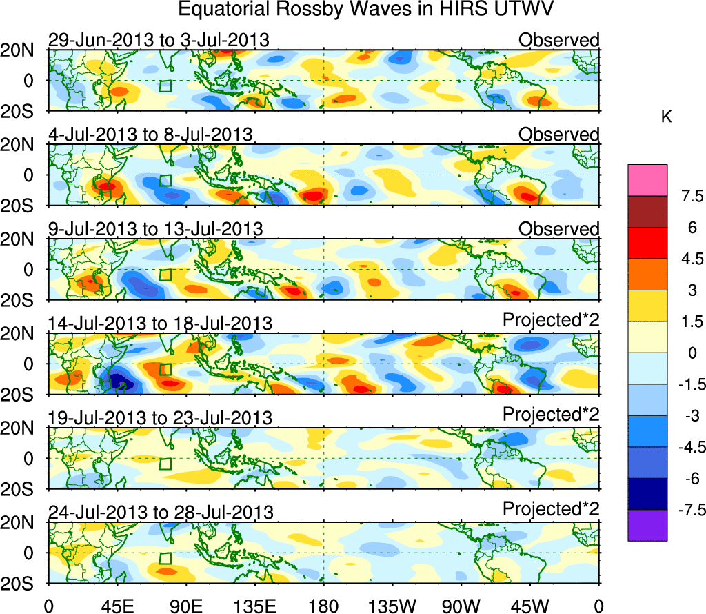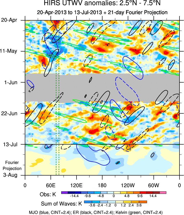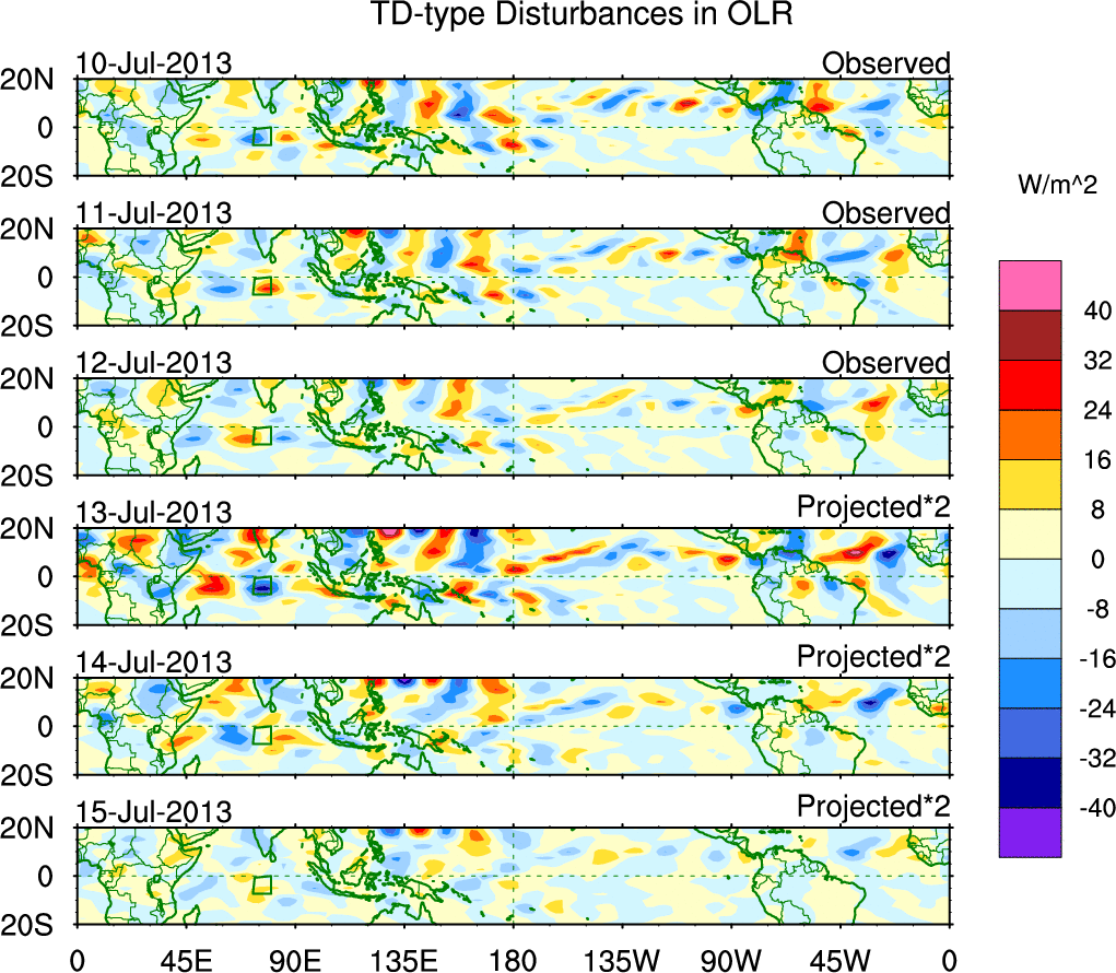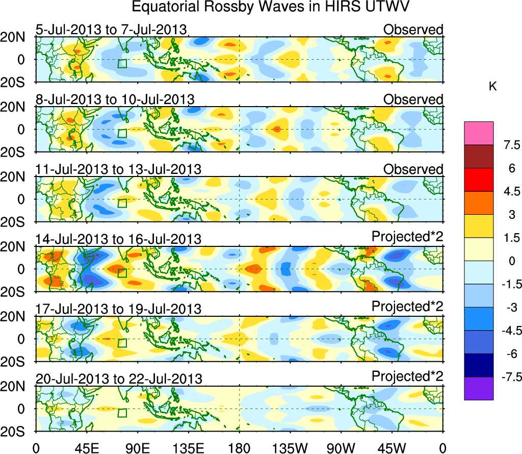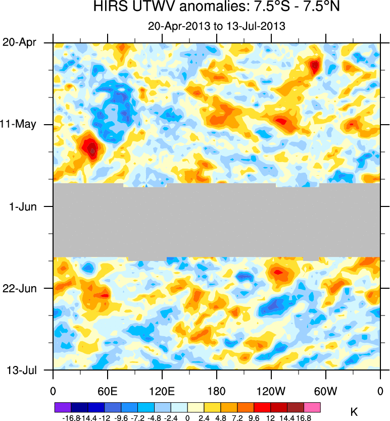 To identify tropical waves in near real-time, the OLR and UTWV data are filtered following Wheeler & Weickmann (2001 MWR). The daily anomalies are calculated using the first 3 harmonics of the seasonal cycle for 1979–2009. Missing values are then filled using linear interpolation in space and time. The most recent 365 days of anomalies are padded with 659 days of zeroes, and the result is filtered for each wave type.