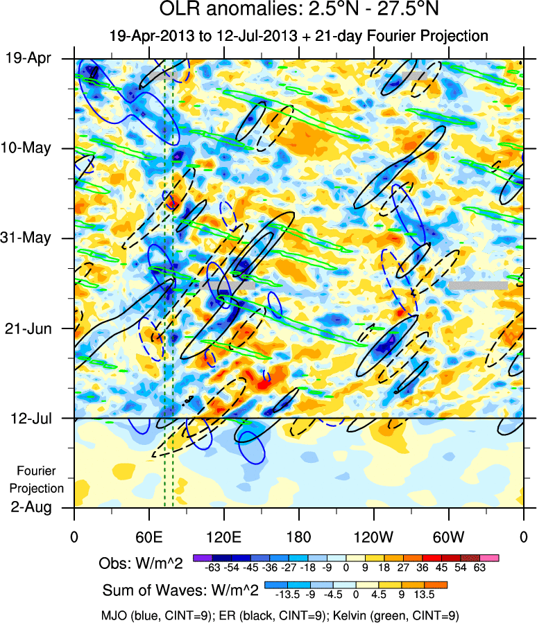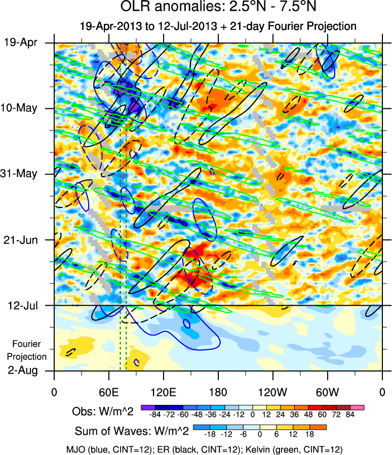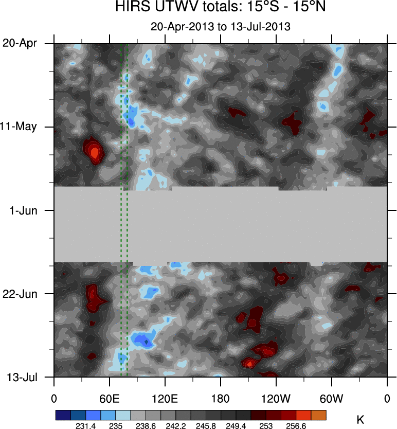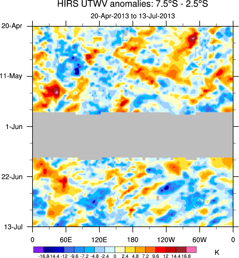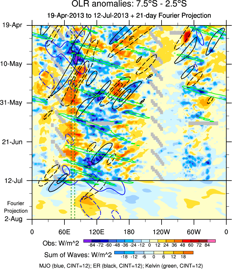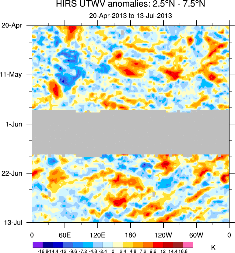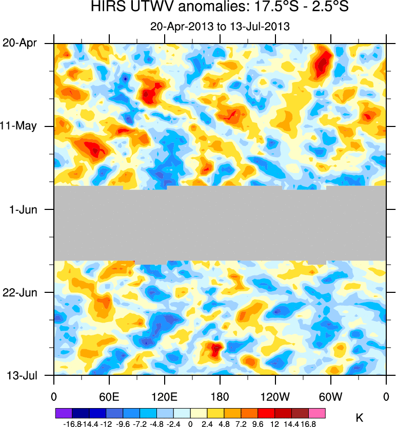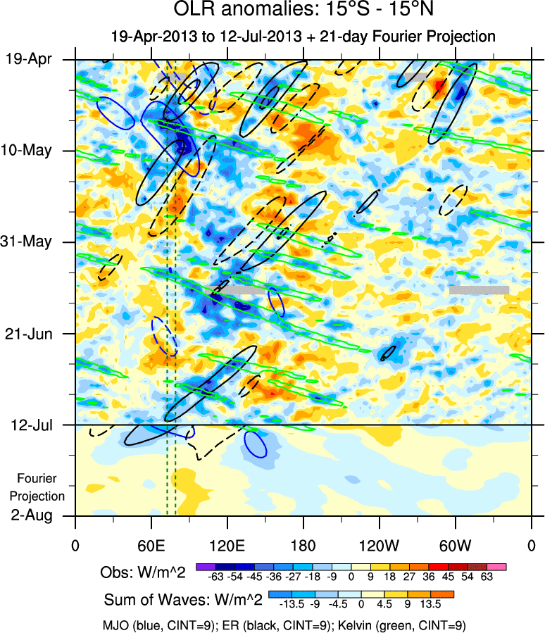 To identify tropical waves in near real-time, the OLR and UTWV data are filtered following Wheeler & Weickmann (2001 MWR). The daily anomalies are calculated using the first 3 harmonics of the seasonal cycle for 1979–2009. Missing values are then filled using linear interpolation in space and time. The most recent 365 days of anomalies are padded with 659 days of zeroes, and the result is filtered for each wave type.