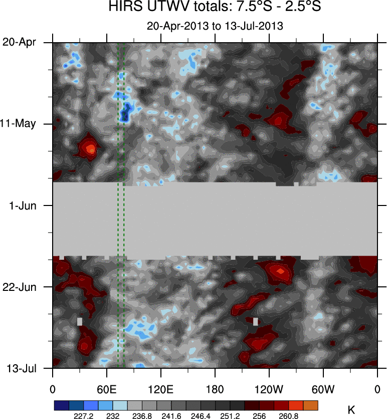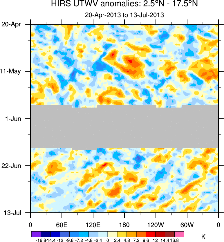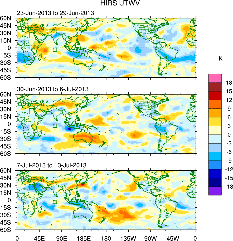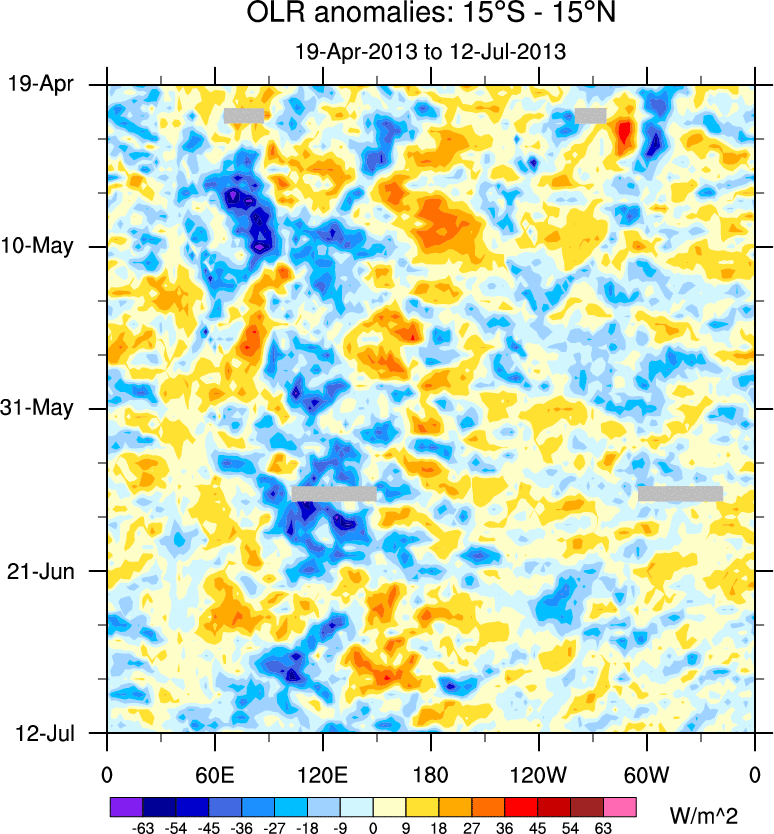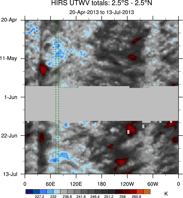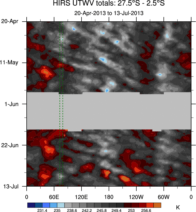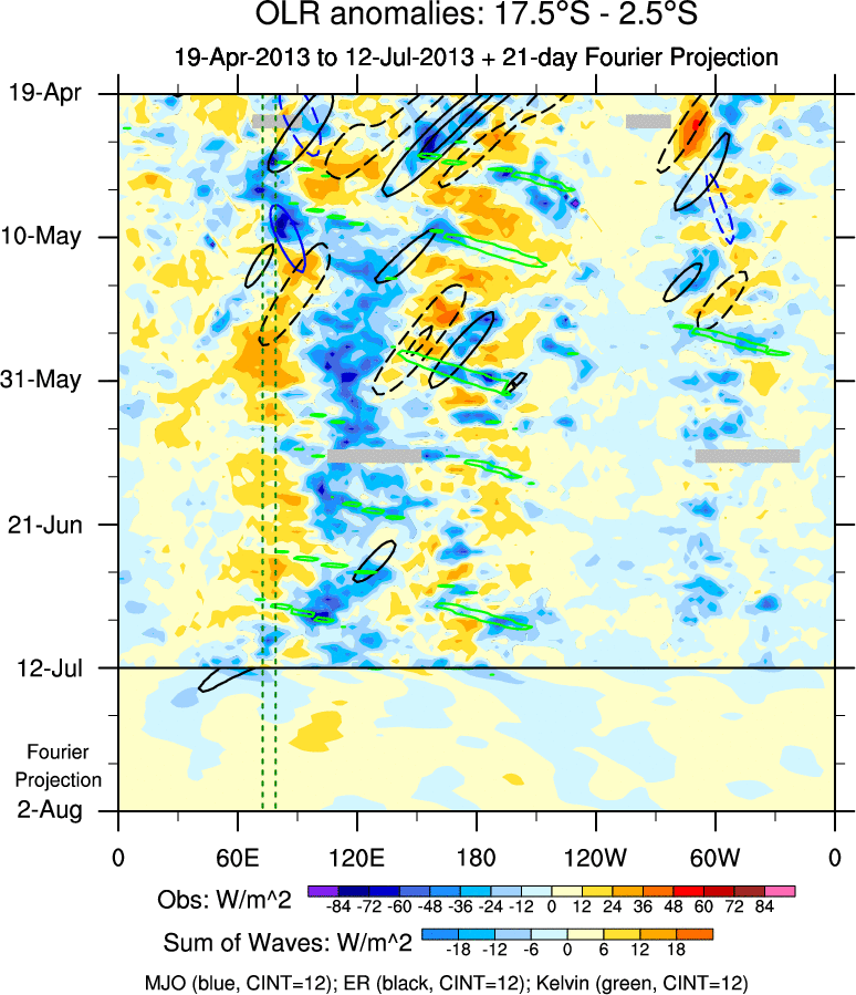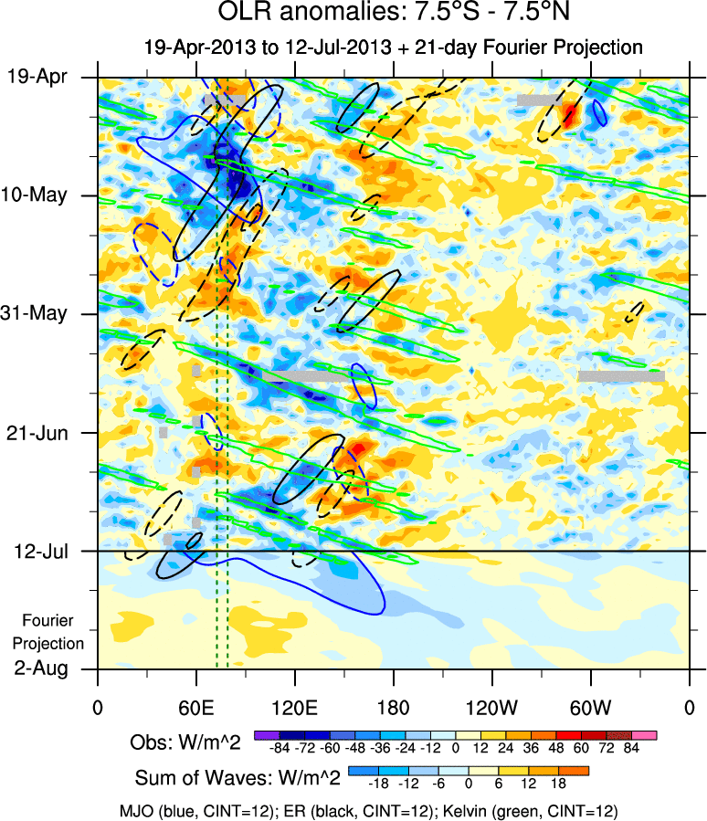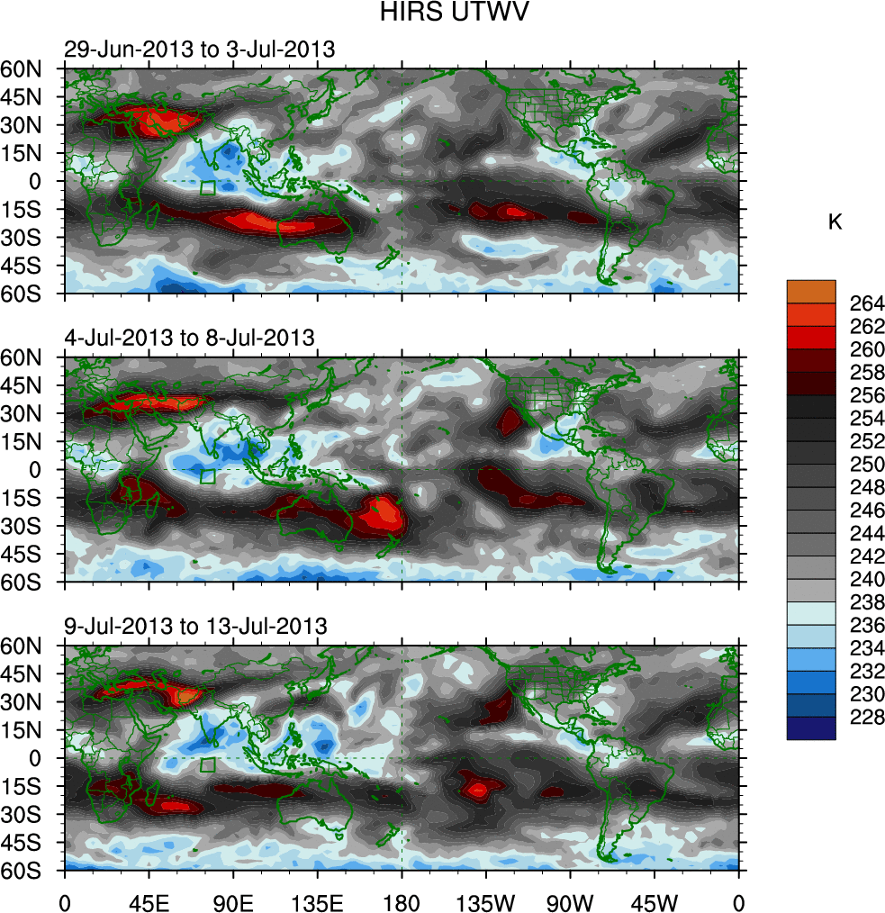To identify tropical waves in near real-time, the OLR and UTWV data are filtered following Wheeler & Weickmann (2001 MWR). The daily anomalies are calculated using the first 3 harmonics of the seasonal cycle for 1979–2009. Missing values are then filled using linear interpolation in space and time. The most recent 365 days of anomalies are padded with 659 days of zeroes, and the result is filtered for each wave type.