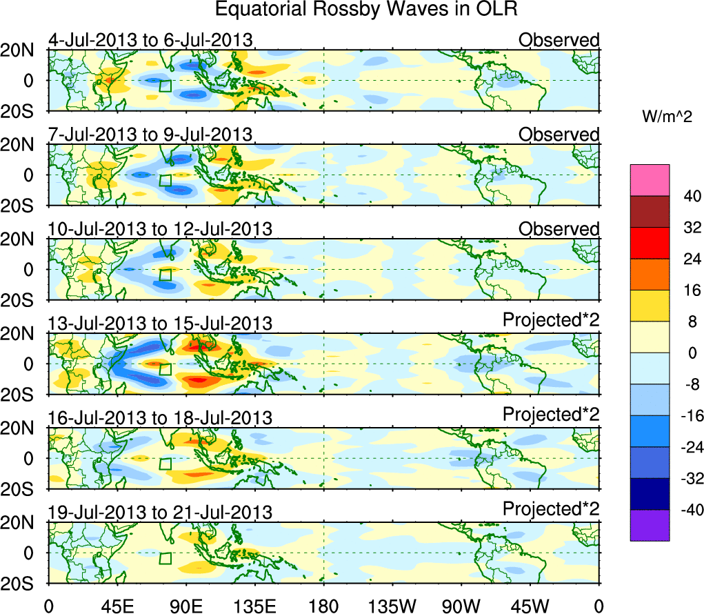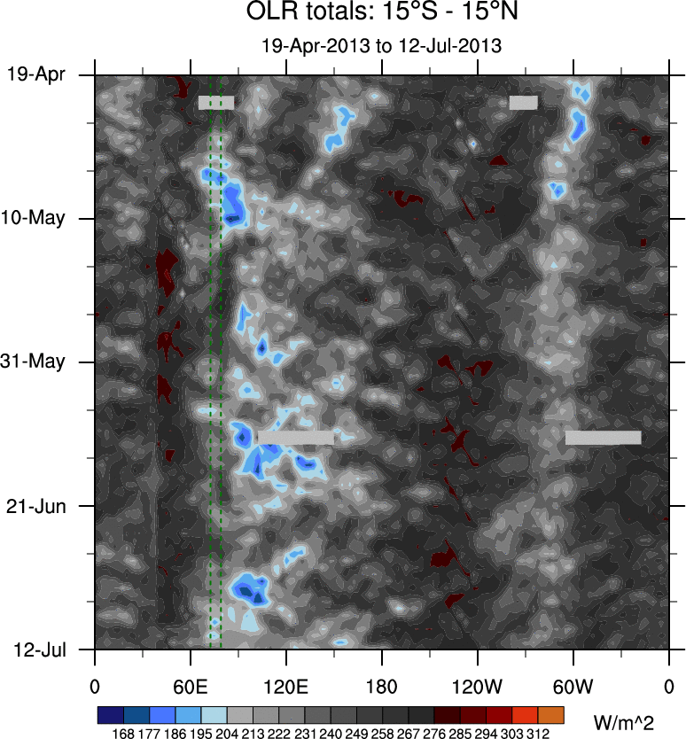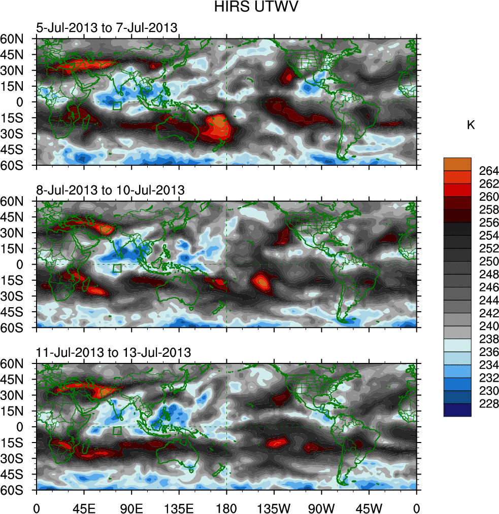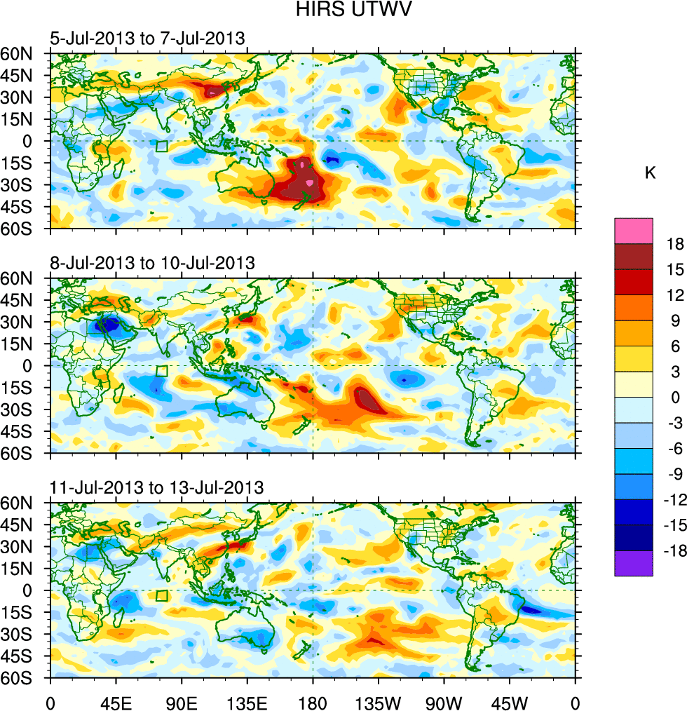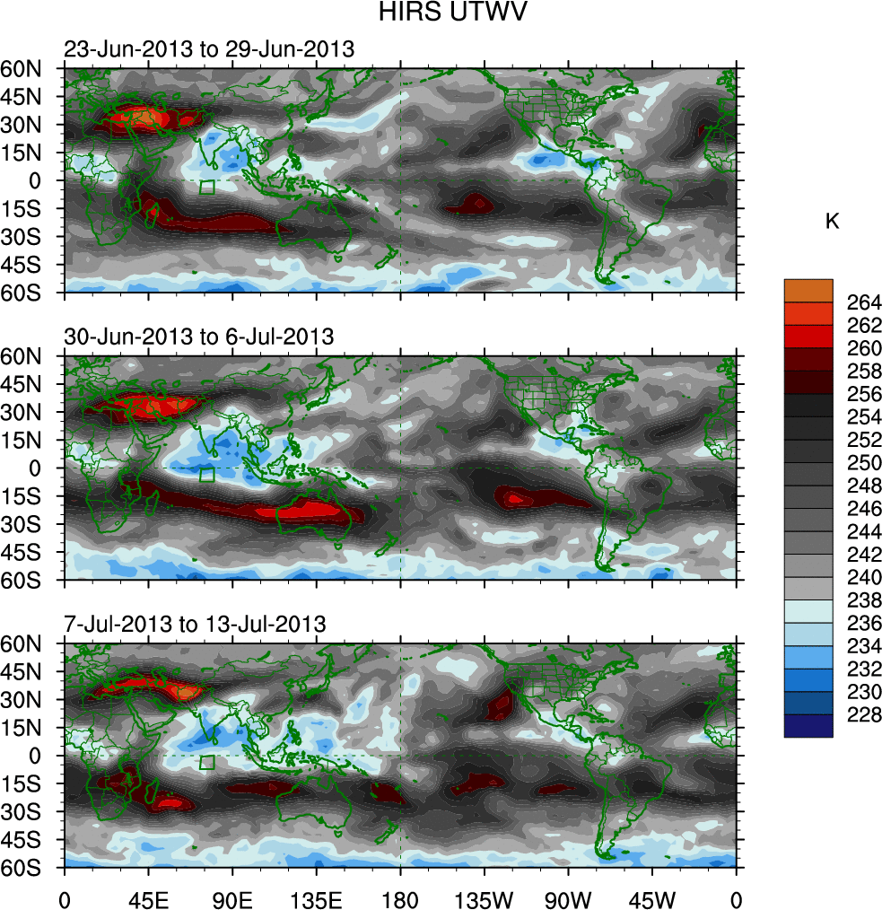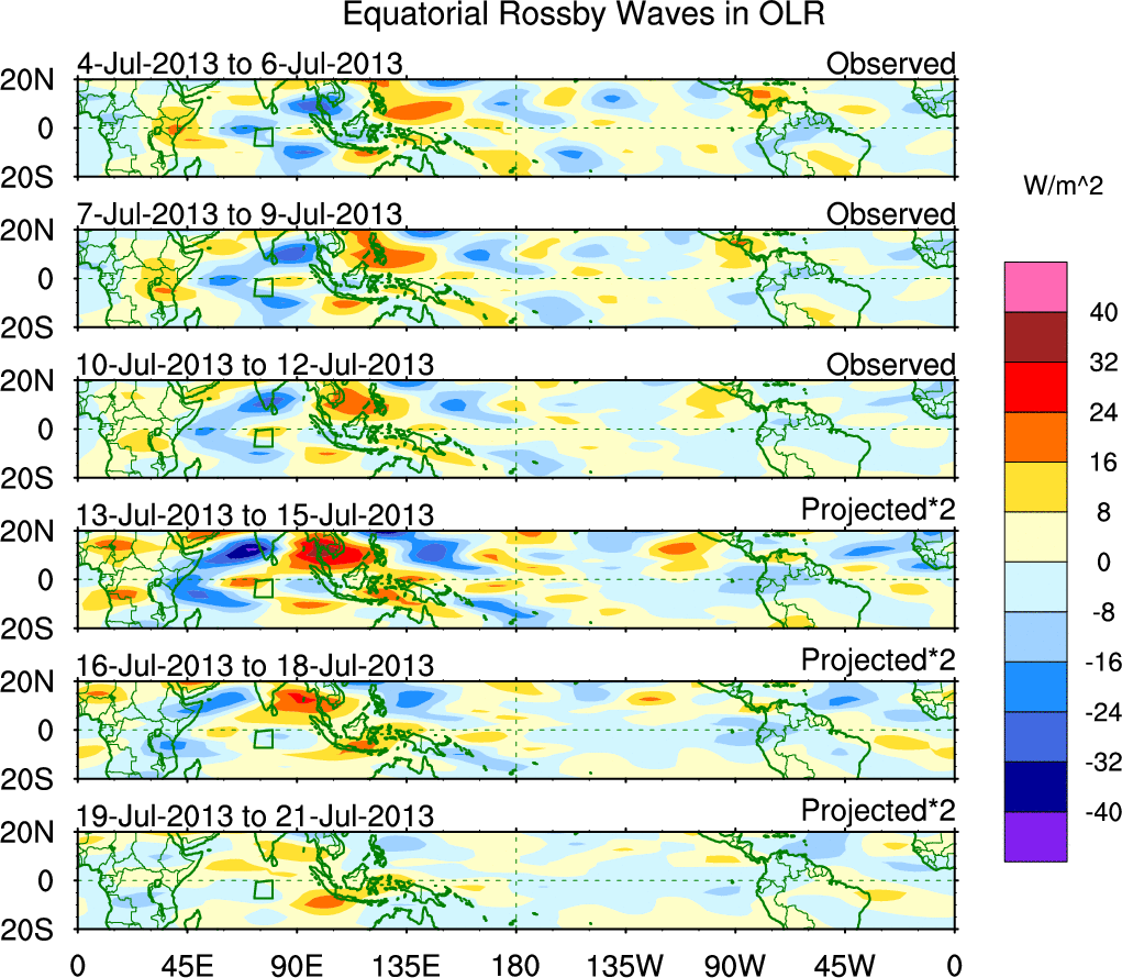 To identify tropical waves in near real-time, the OLR and UTWV data are filtered following Wheeler & Weickmann (2001 MWR). The daily anomalies are calculated using the first 3 harmonics of the seasonal cycle for 1979–2009. Missing values are then filled using linear interpolation in space and time. The most recent 365 days of anomalies are padded with 659 days of zeroes, and the result is filtered for each wave type.