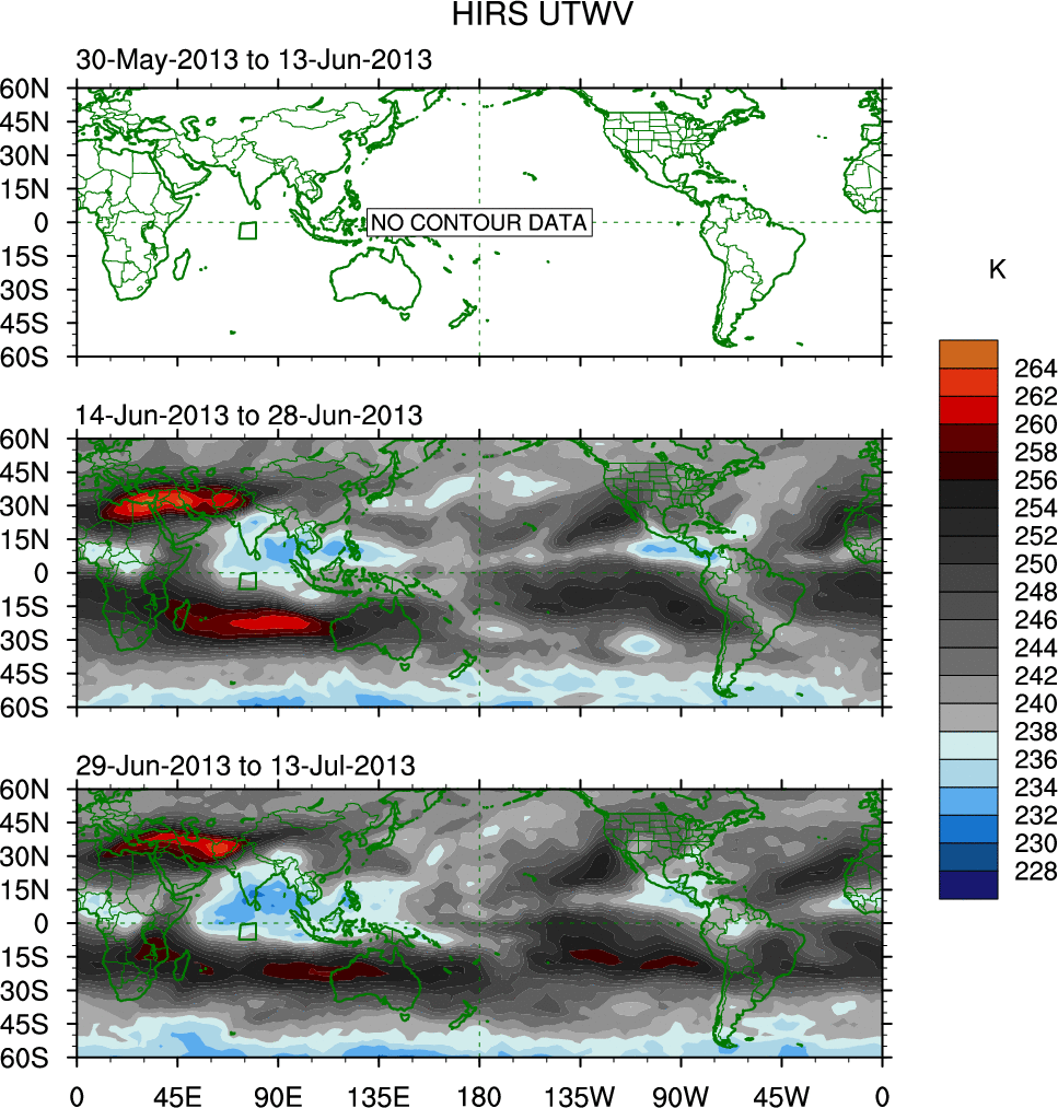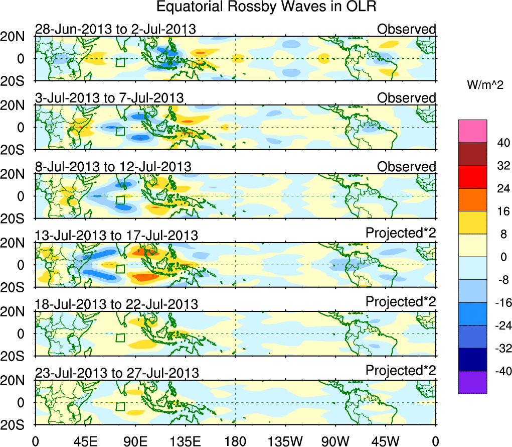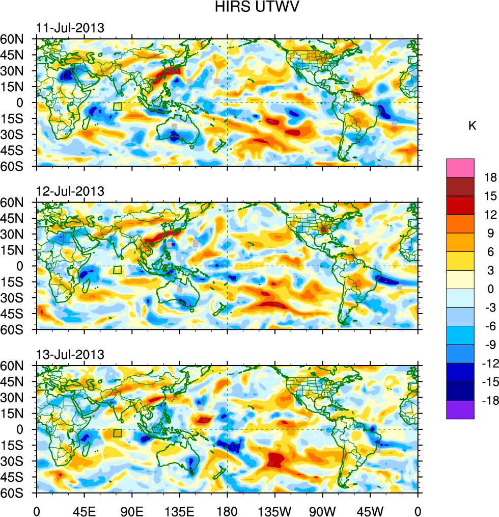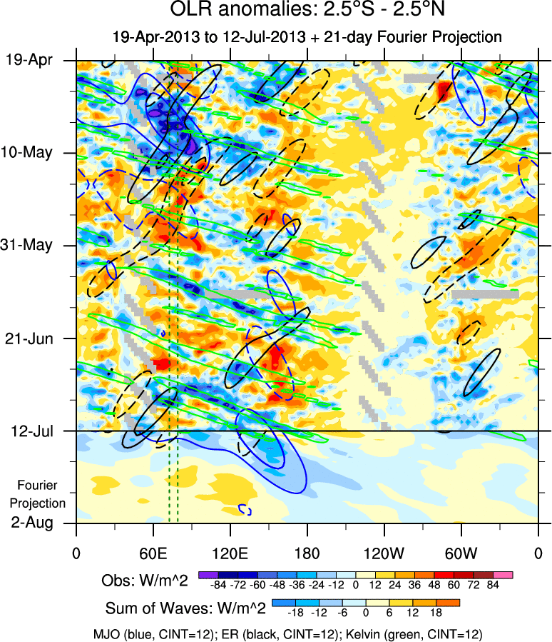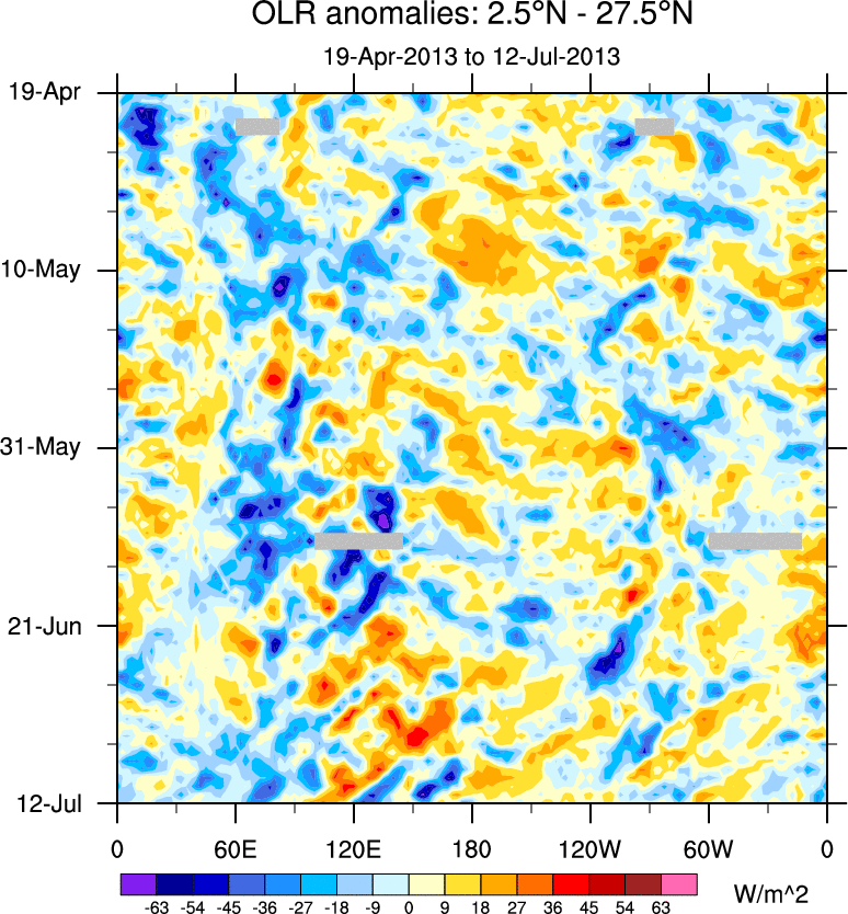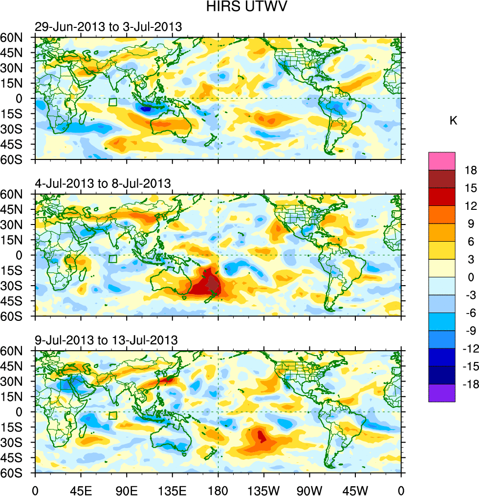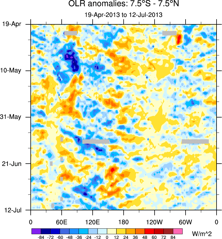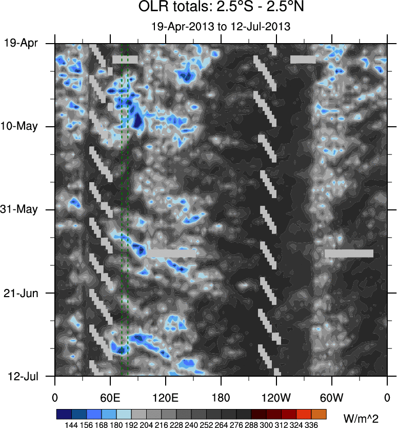To identify tropical waves in near real-time, the OLR and UTWV data are filtered following Wheeler & Weickmann (2001 MWR). The daily anomalies are calculated using the first 3 harmonics of the seasonal cycle for 1979–2009. Missing values are then filled using linear interpolation in space and time. The most recent 365 days of anomalies are padded with 659 days of zeroes, and the result is filtered for each wave type.