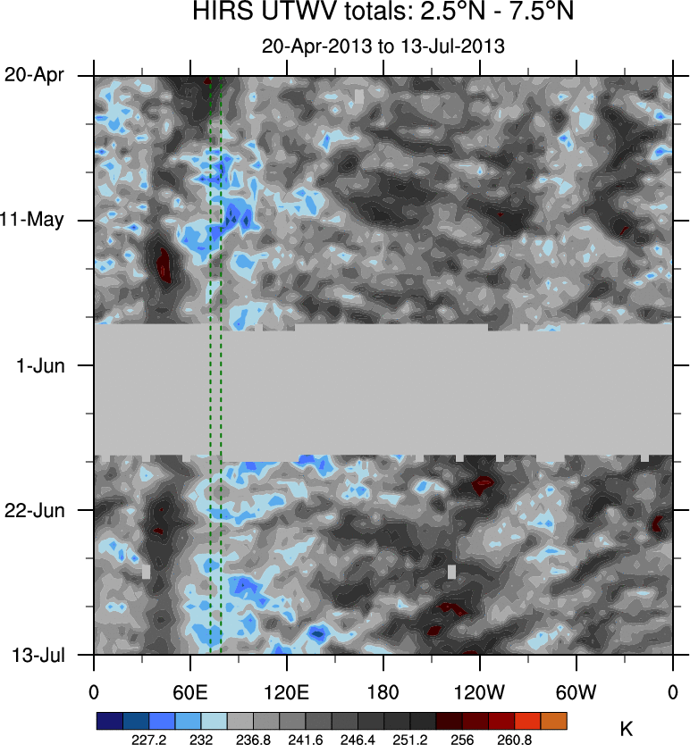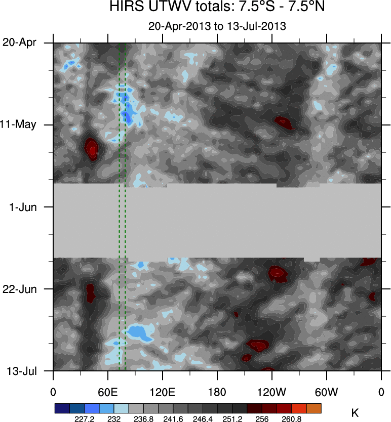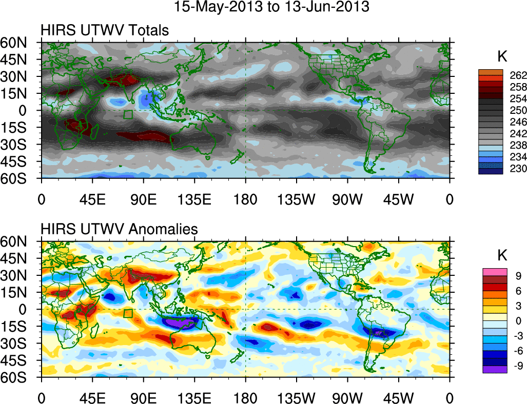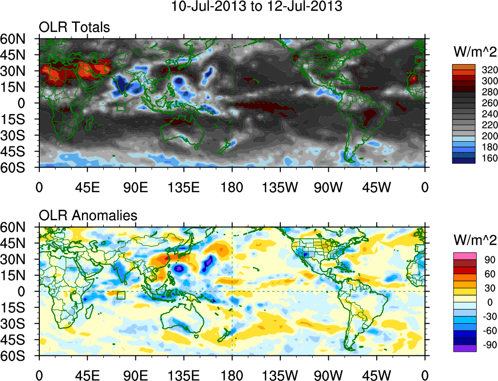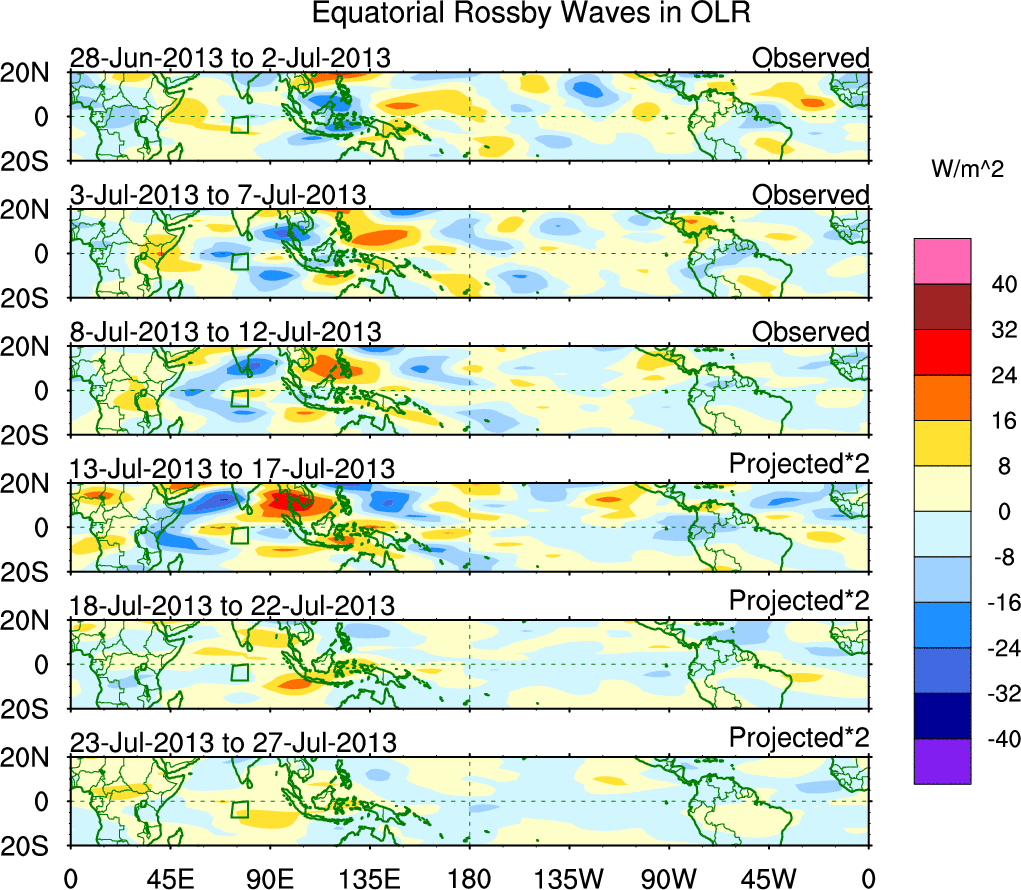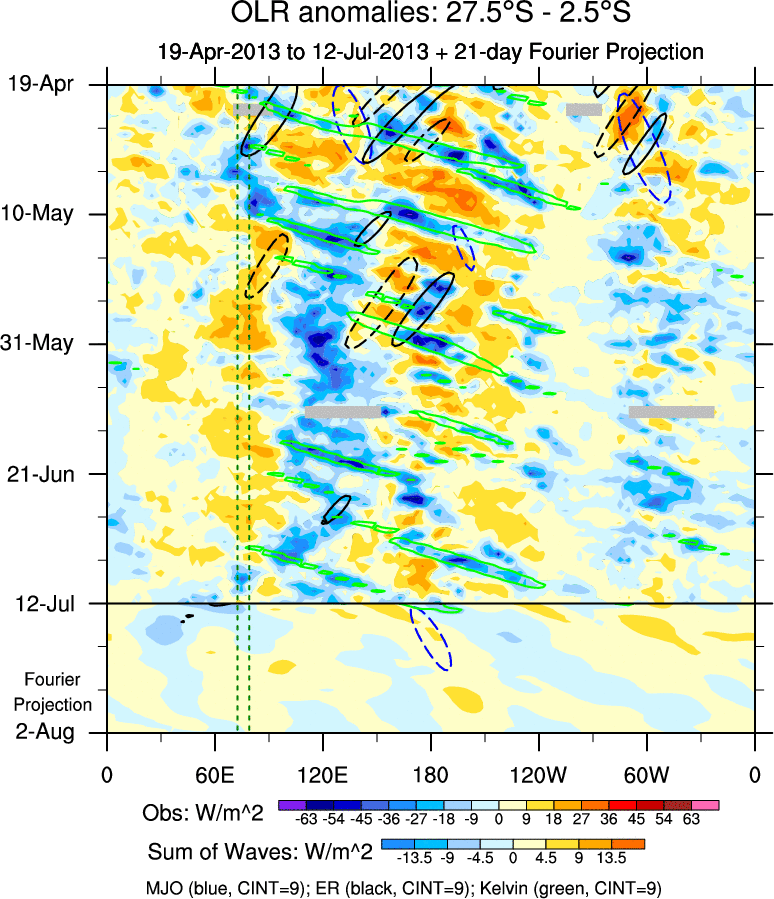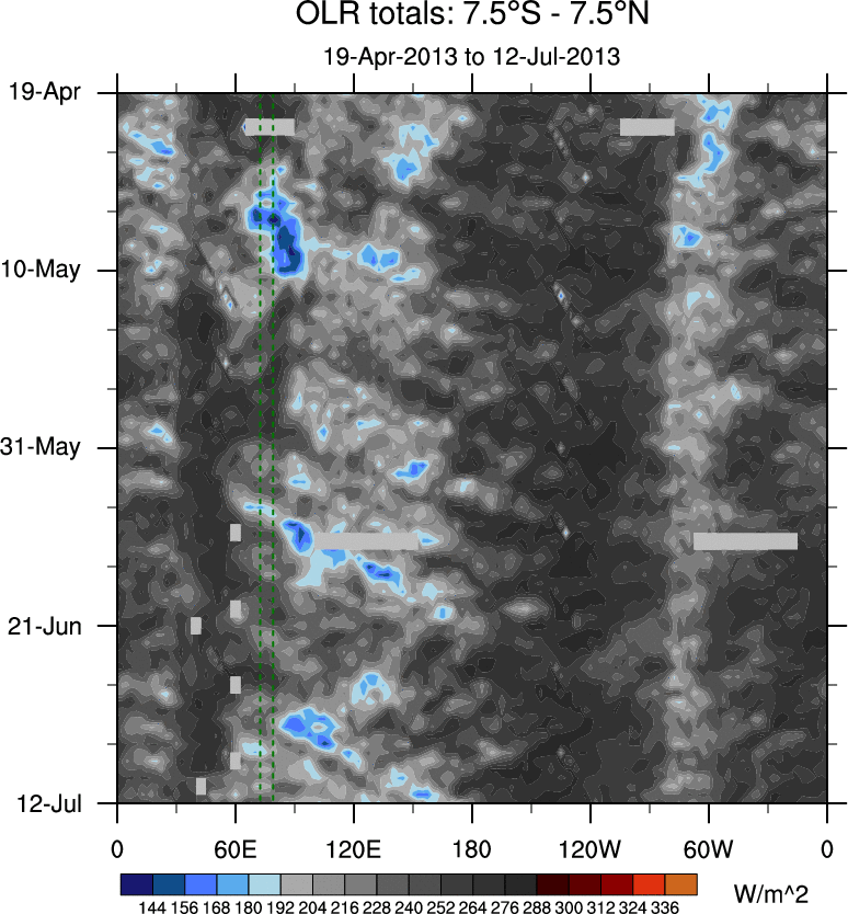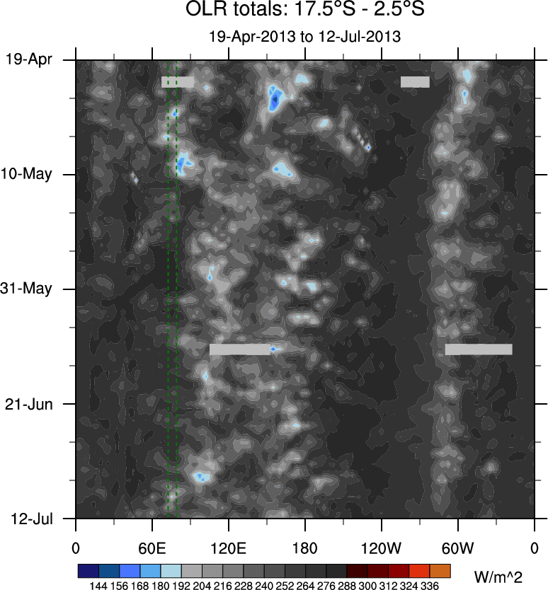 To identify tropical waves in near real-time, the OLR and UTWV data are filtered following Wheeler & Weickmann (2001 MWR). The daily anomalies are calculated using the first 3 harmonics of the seasonal cycle for 1979–2009. Missing values are then filled using linear interpolation in space and time. The most recent 365 days of anomalies are padded with 659 days of zeroes, and the result is filtered for each wave type.