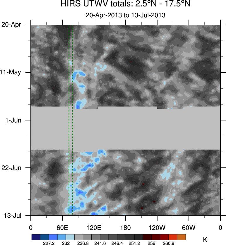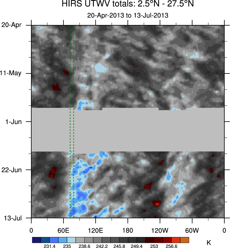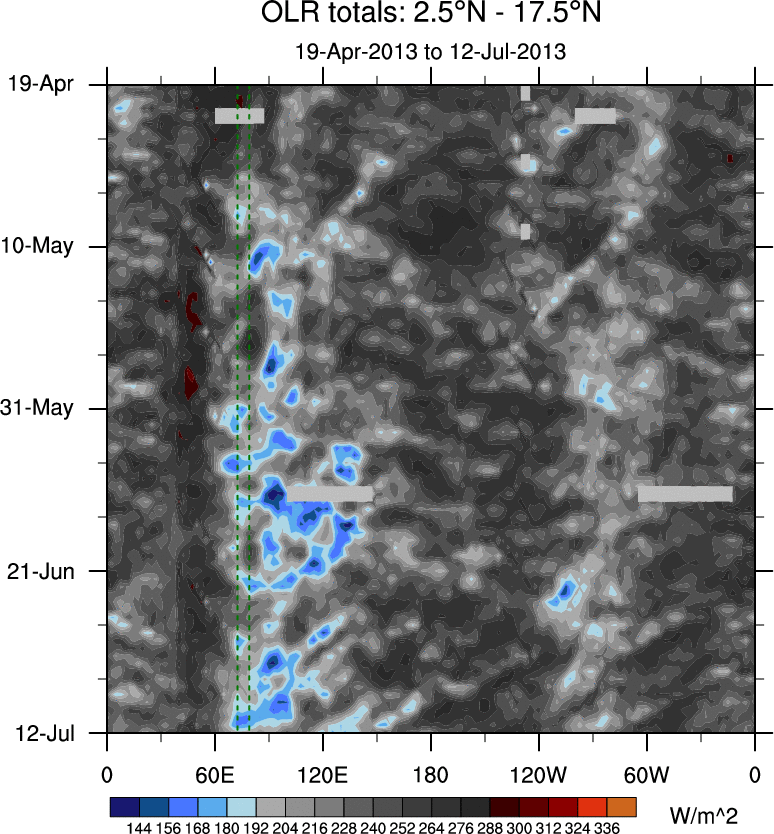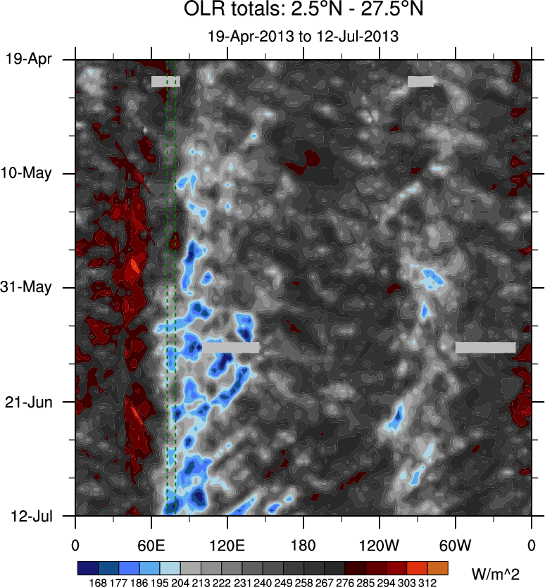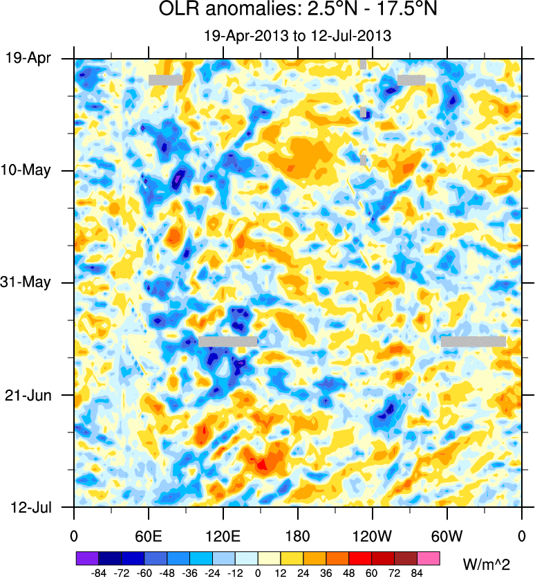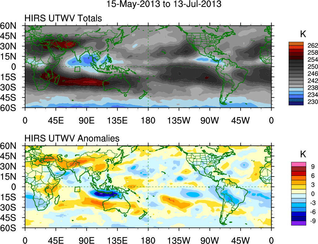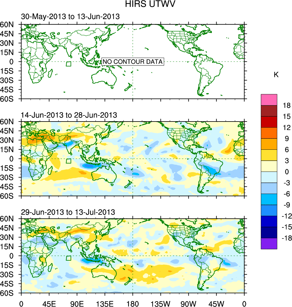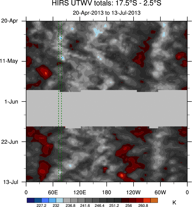 To identify tropical waves in near real-time, the OLR and UTWV data are filtered following Wheeler & Weickmann (2001 MWR). The daily anomalies are calculated using the first 3 harmonics of the seasonal cycle for 1979–2009. Missing values are then filled using linear interpolation in space and time. The most recent 365 days of anomalies are padded with 659 days of zeroes, and the result is filtered for each wave type.
