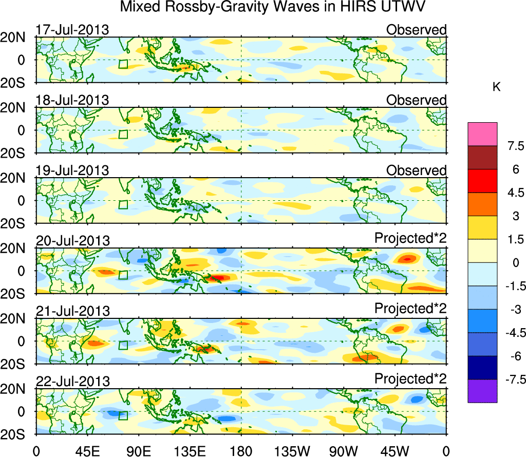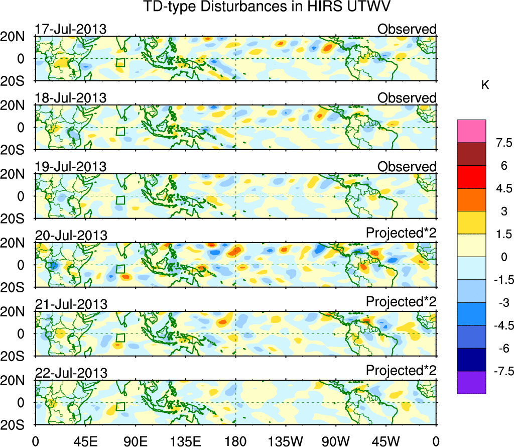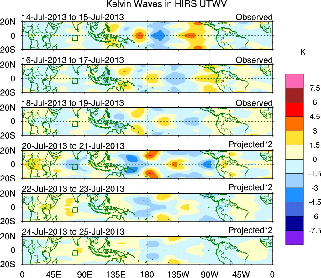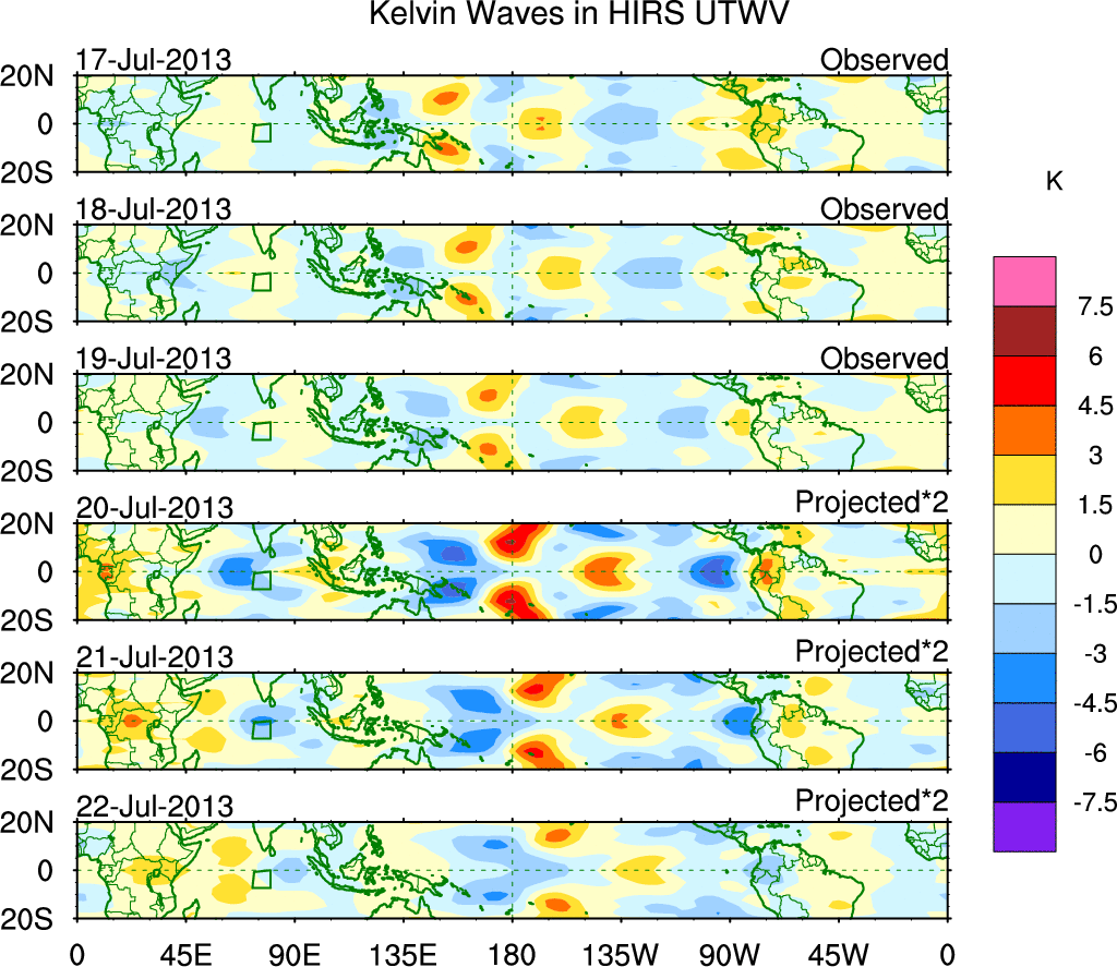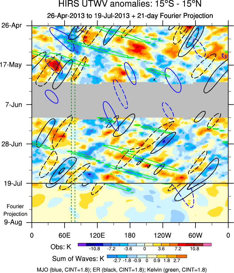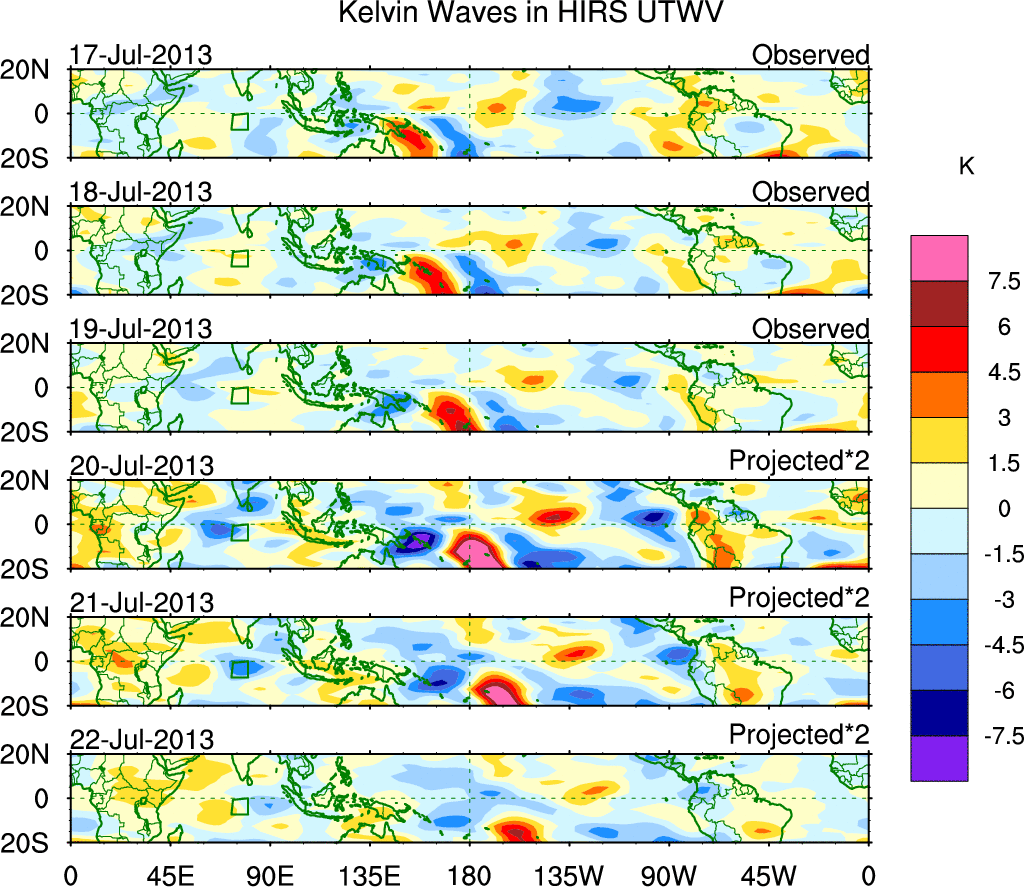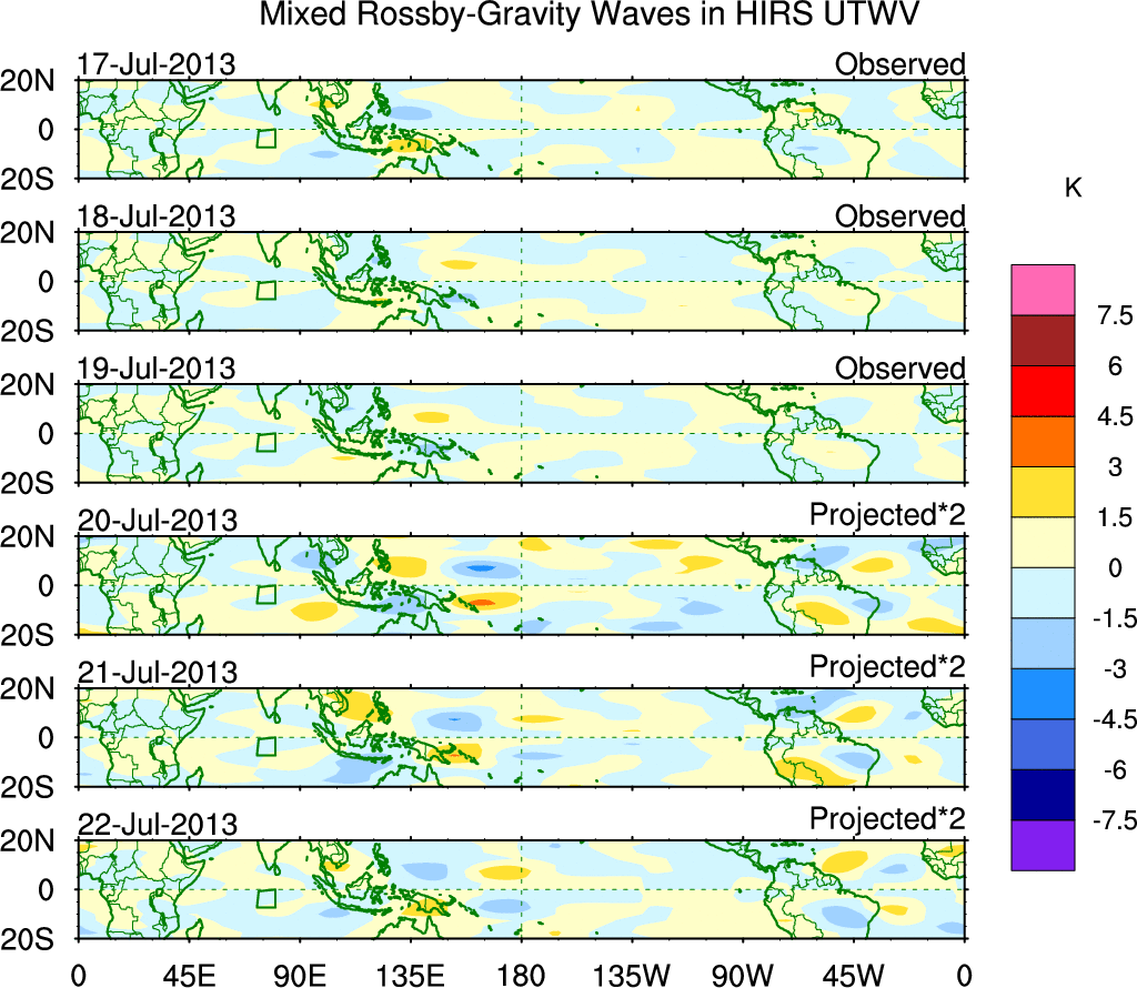 To identify tropical waves in near real-time, the OLR and UTWV data are filtered following Wheeler & Weickmann (2001 MWR). The daily anomalies are calculated using the first 3 harmonics of the seasonal cycle for 1979–2009. Missing values are then filled using linear interpolation in space and time. The most recent 365 days of anomalies are padded with 659 days of zeroes, and the result is filtered for each wave type.