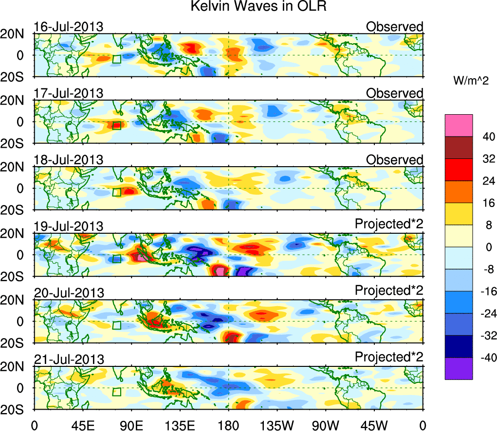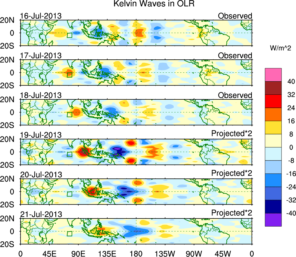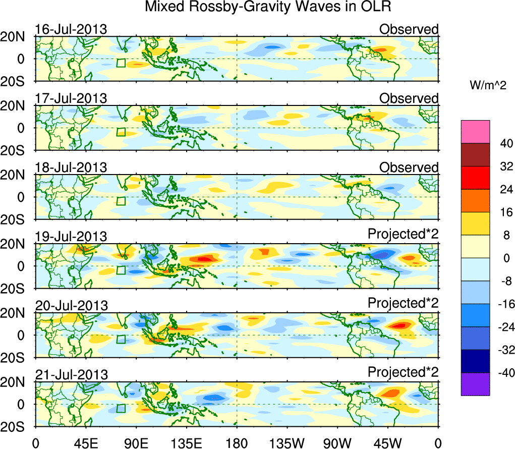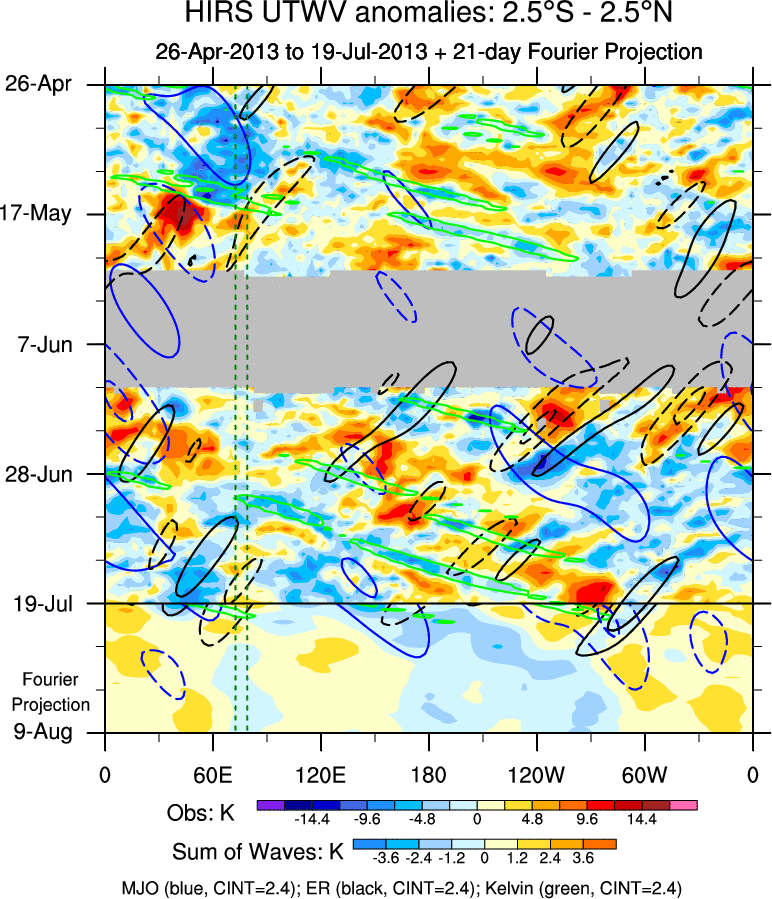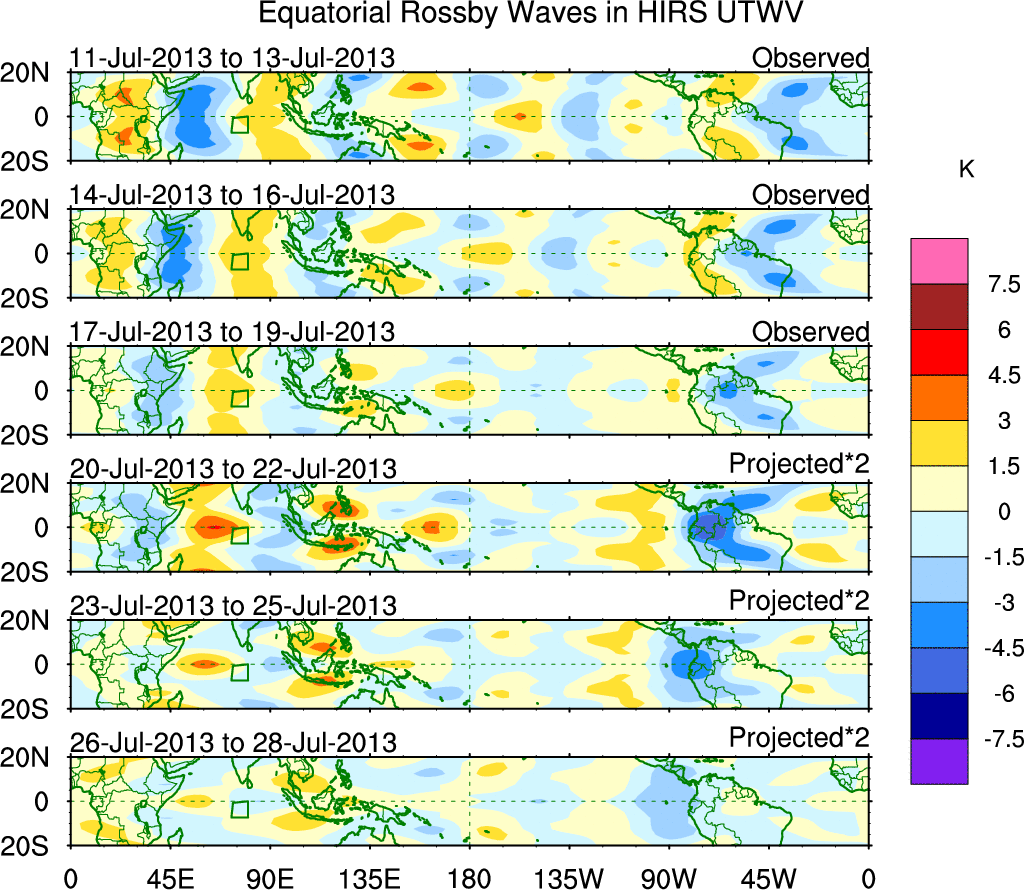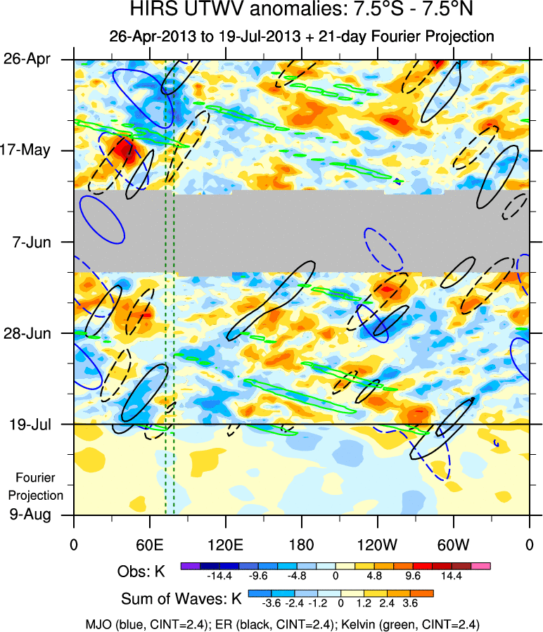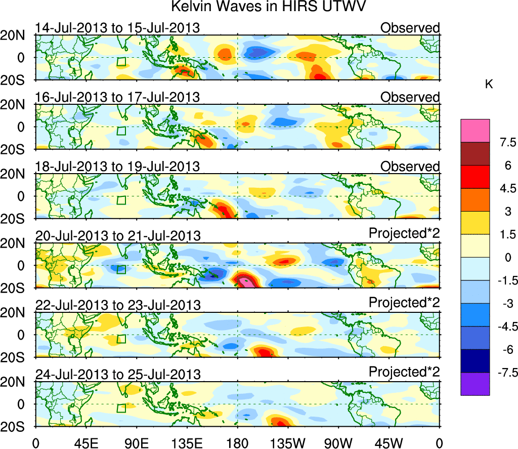 To identify tropical waves in near real-time, the OLR and UTWV data are filtered following Wheeler & Weickmann (2001 MWR). The daily anomalies are calculated using the first 3 harmonics of the seasonal cycle for 1979–2009. Missing values are then filled using linear interpolation in space and time. The most recent 365 days of anomalies are padded with 659 days of zeroes, and the result is filtered for each wave type.
