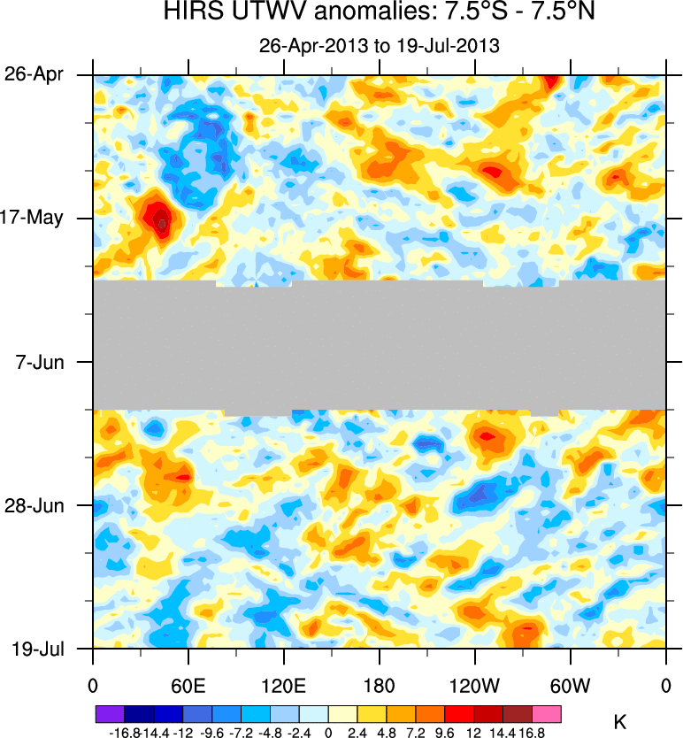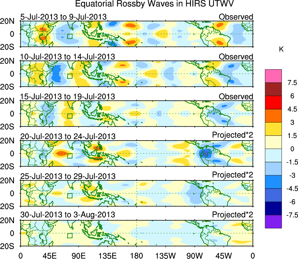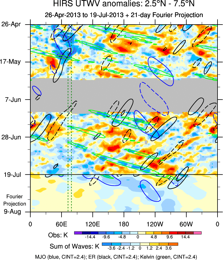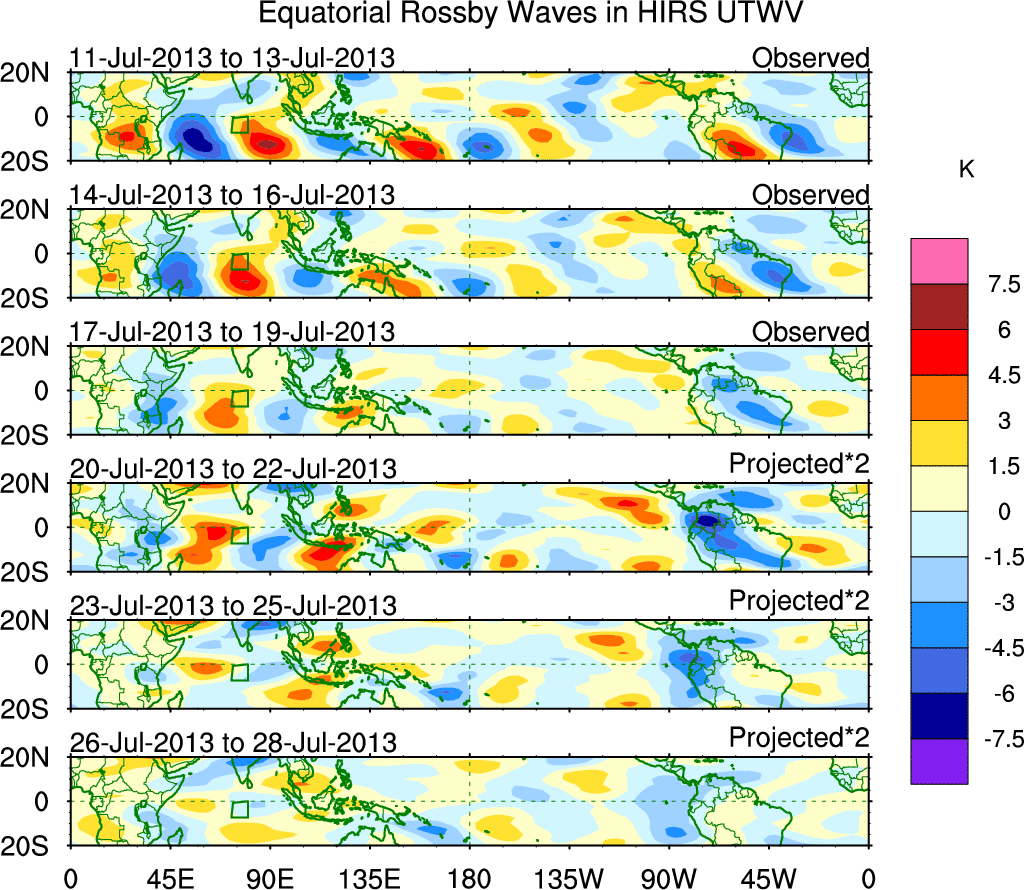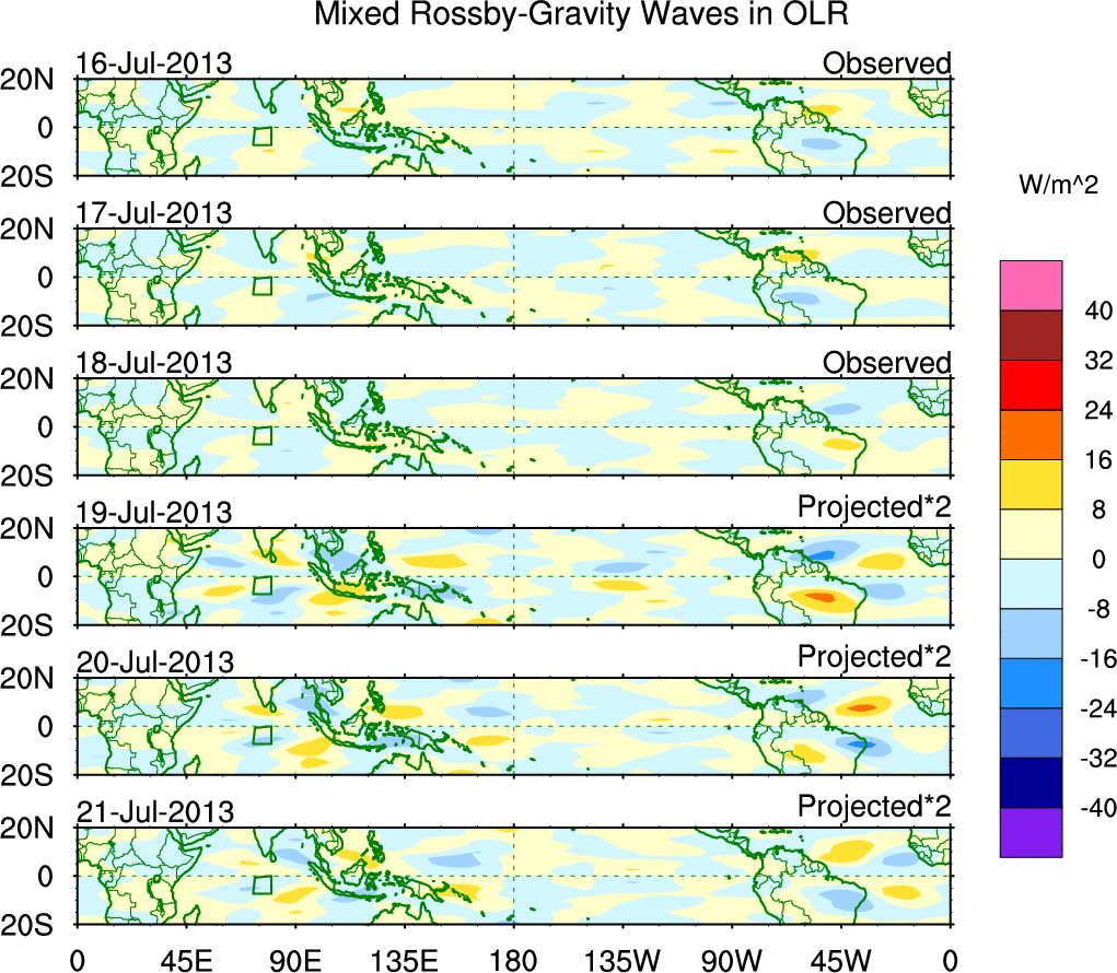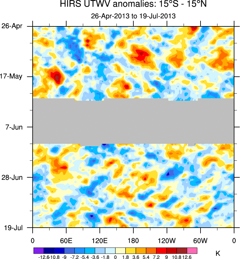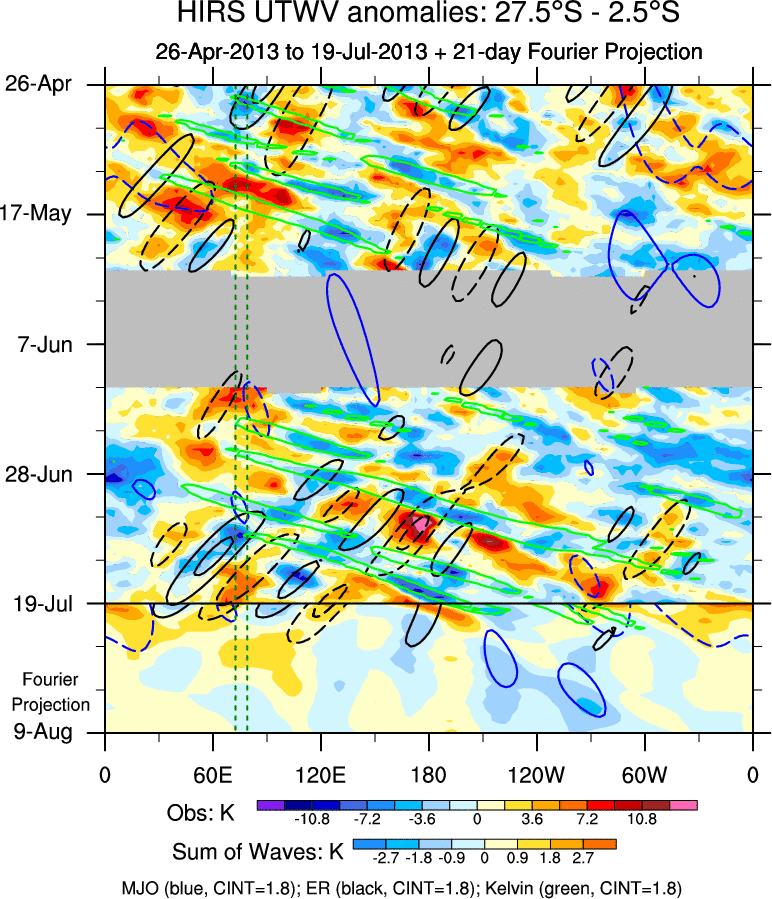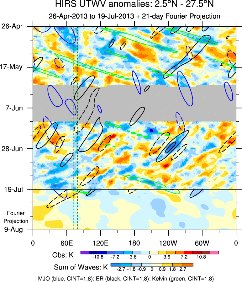 To identify tropical waves in near real-time, the OLR and UTWV data are filtered following Wheeler & Weickmann (2001 MWR). The daily anomalies are calculated using the first 3 harmonics of the seasonal cycle for 1979–2009. Missing values are then filled using linear interpolation in space and time. The most recent 365 days of anomalies are padded with 659 days of zeroes, and the result is filtered for each wave type.