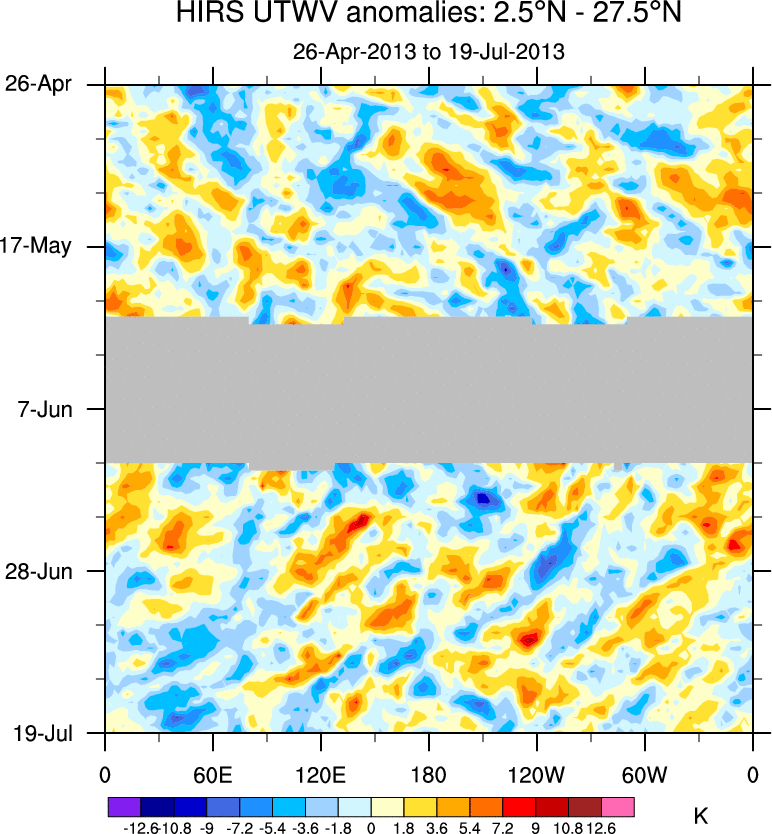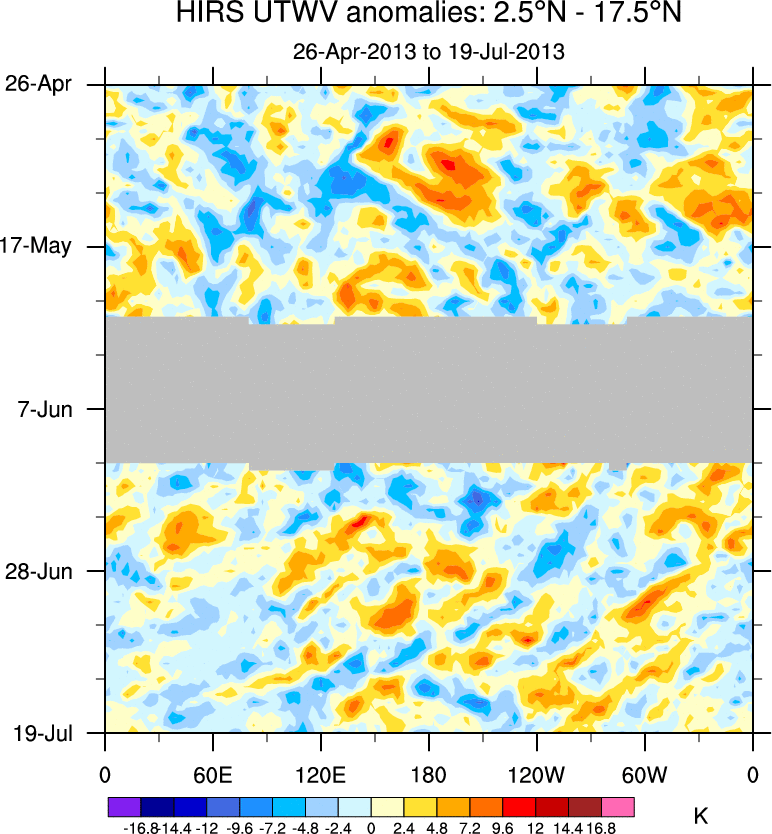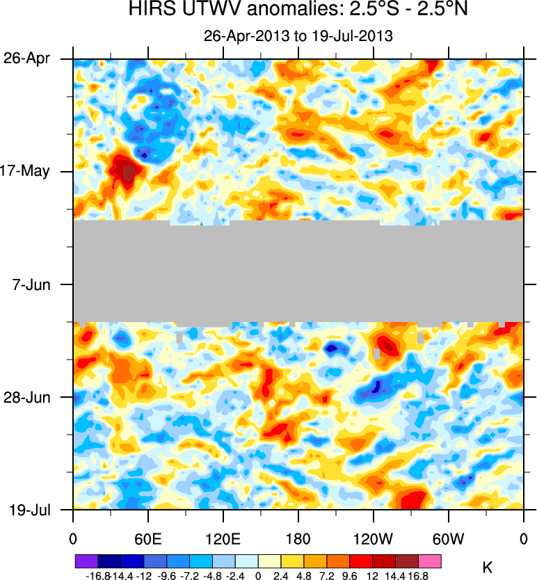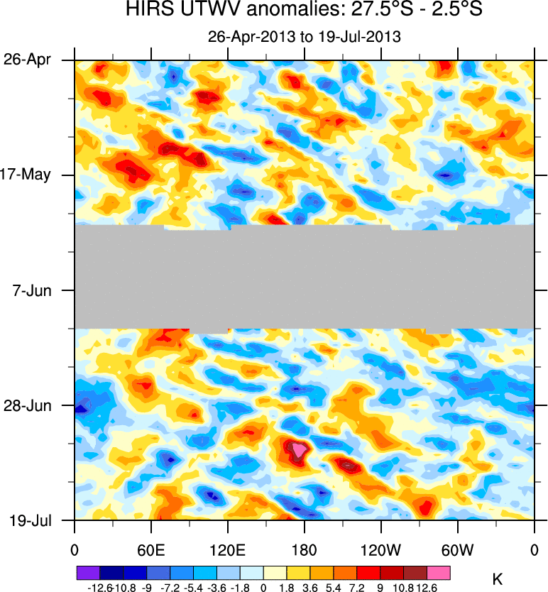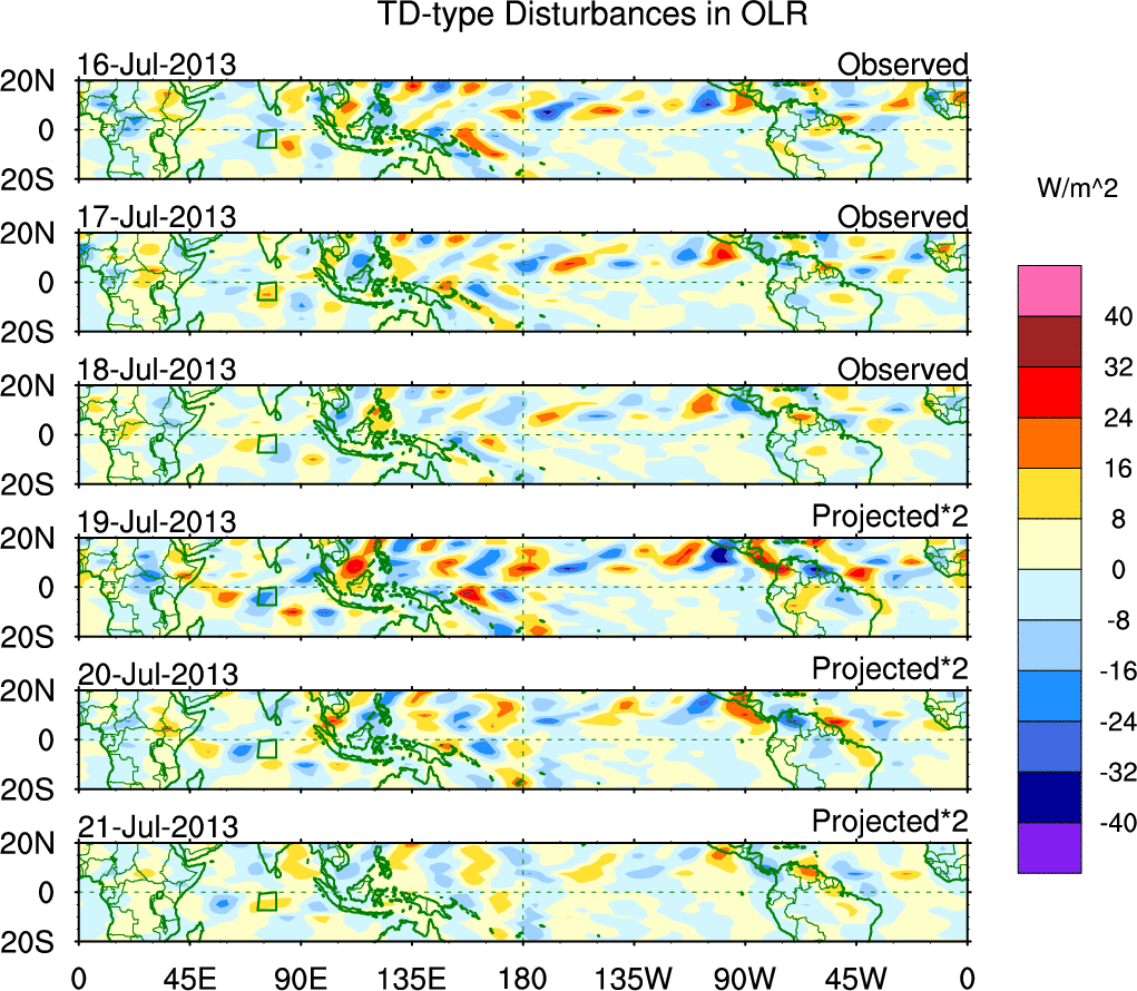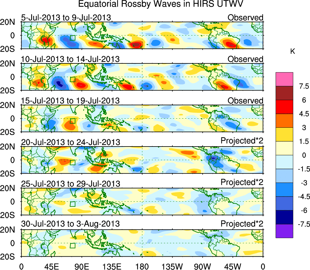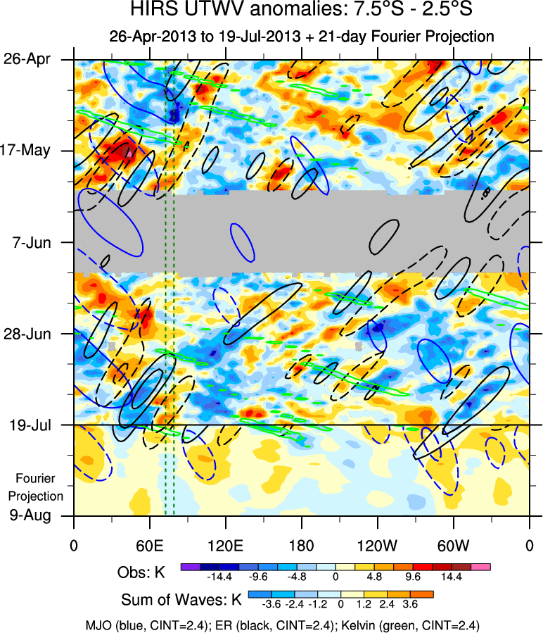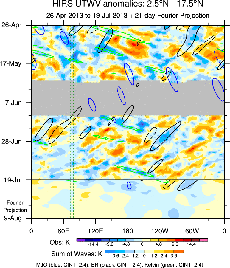To identify tropical waves in near real-time, the OLR and UTWV data are filtered following Wheeler & Weickmann (2001 MWR). The daily anomalies are calculated using the first 3 harmonics of the seasonal cycle for 1979–2009. Missing values are then filled using linear interpolation in space and time. The most recent 365 days of anomalies are padded with 659 days of zeroes, and the result is filtered for each wave type.