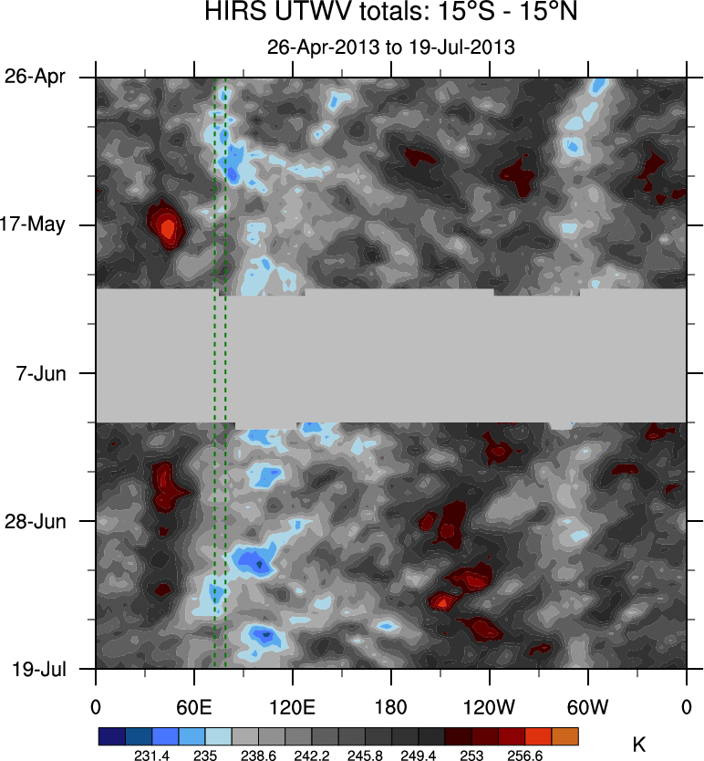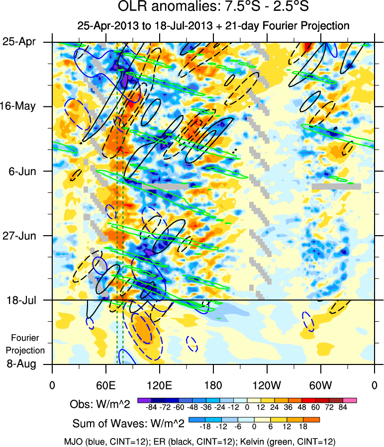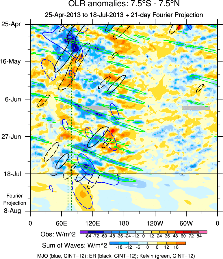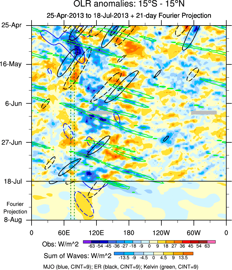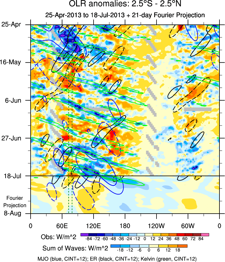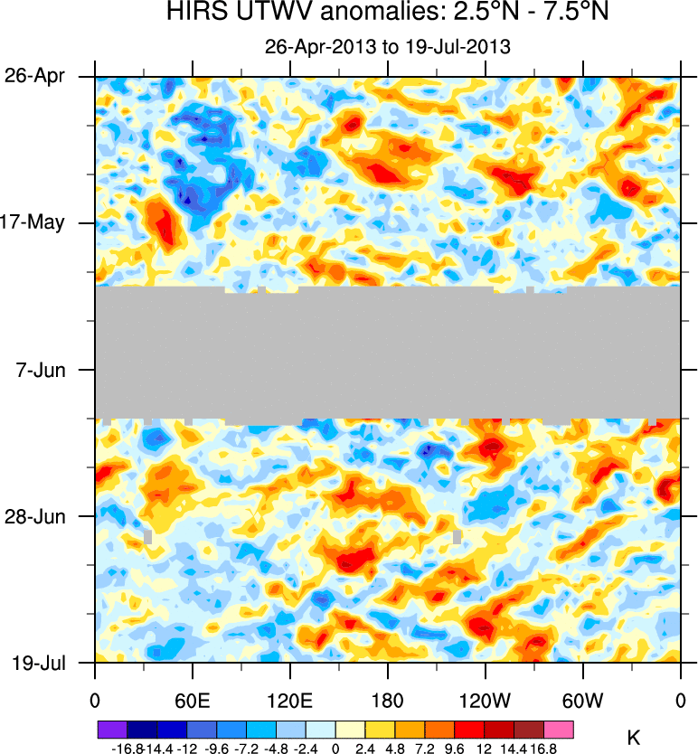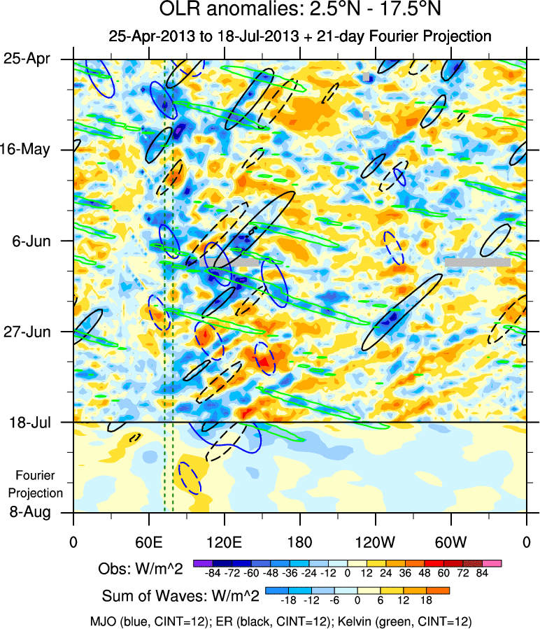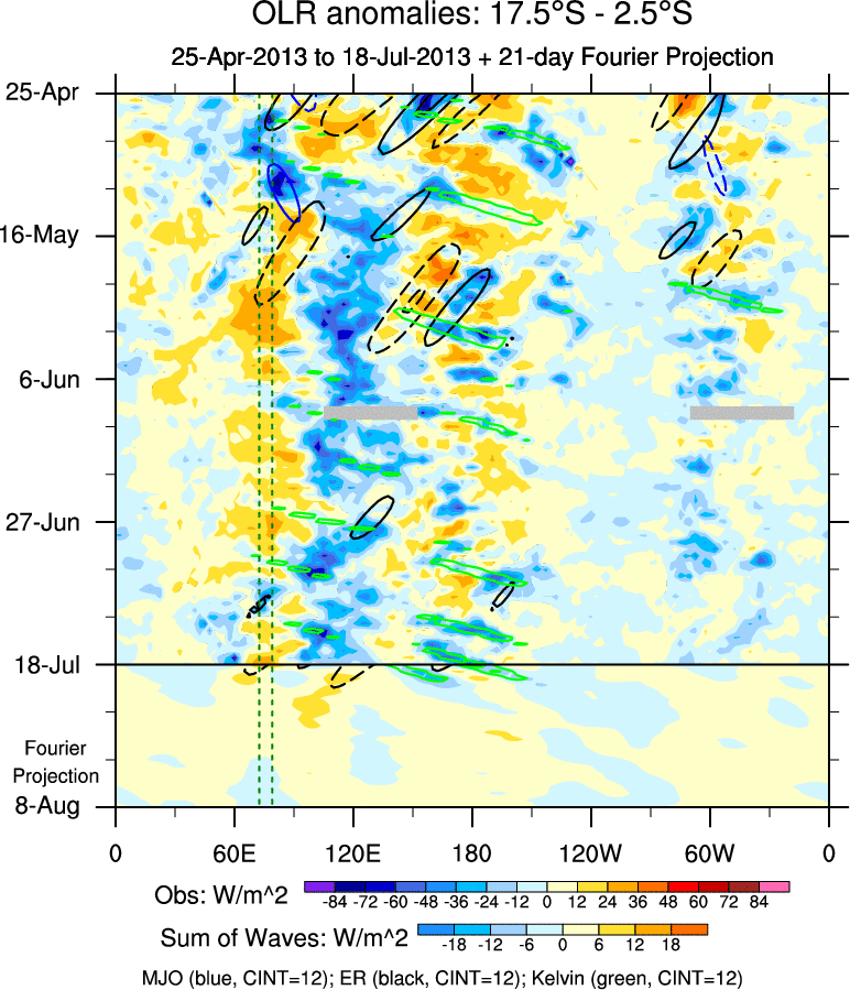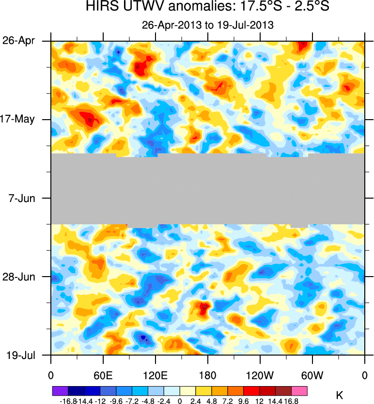 To identify tropical waves in near real-time, the OLR and UTWV data are filtered following Wheeler & Weickmann (2001 MWR). The daily anomalies are calculated using the first 3 harmonics of the seasonal cycle for 1979–2009. Missing values are then filled using linear interpolation in space and time. The most recent 365 days of anomalies are padded with 659 days of zeroes, and the result is filtered for each wave type.