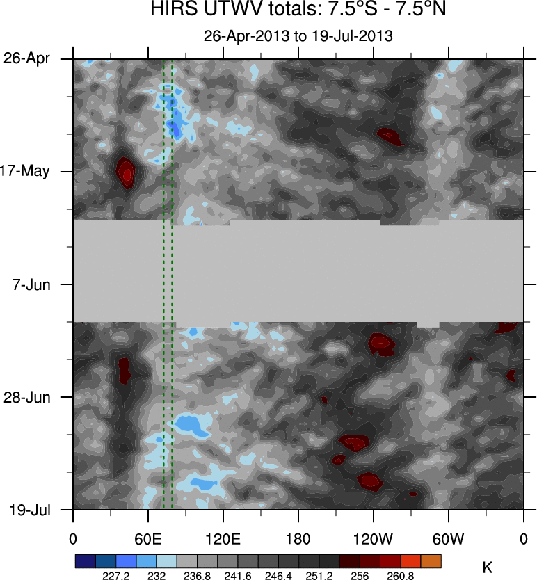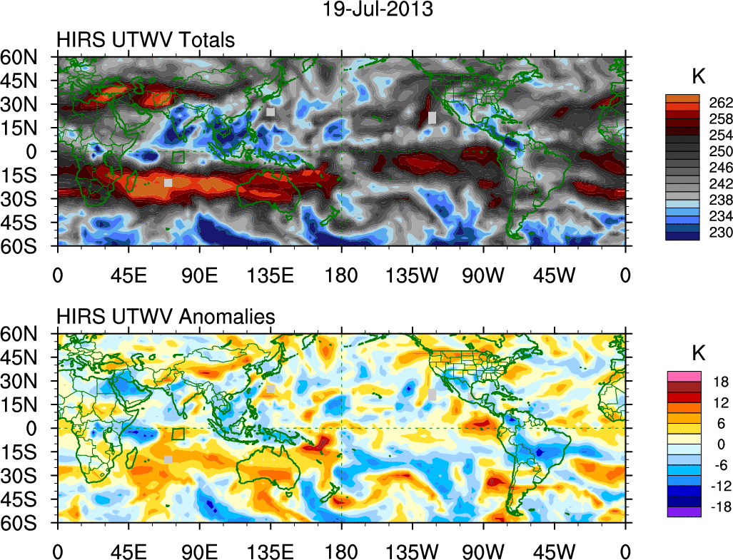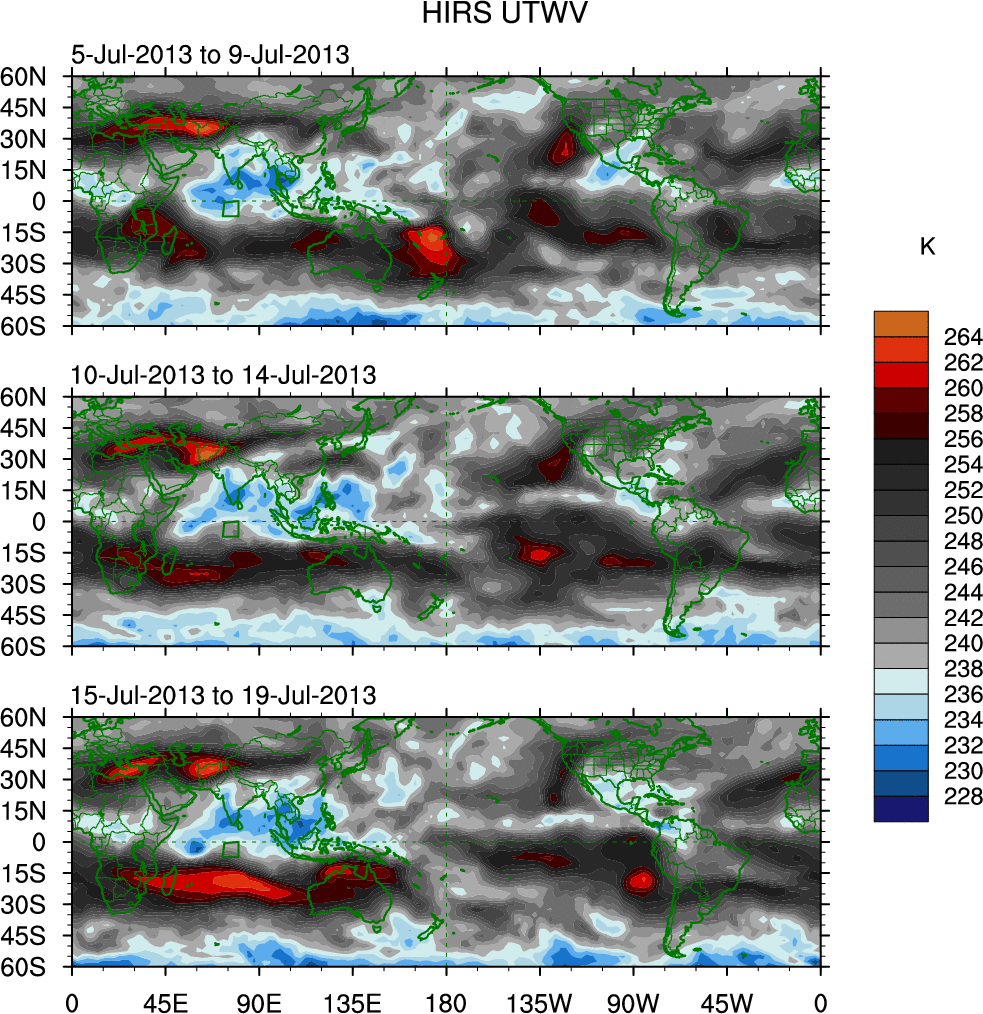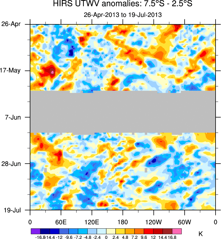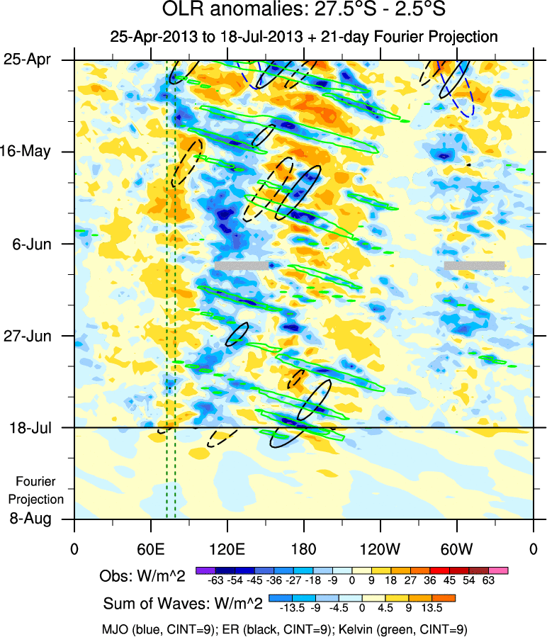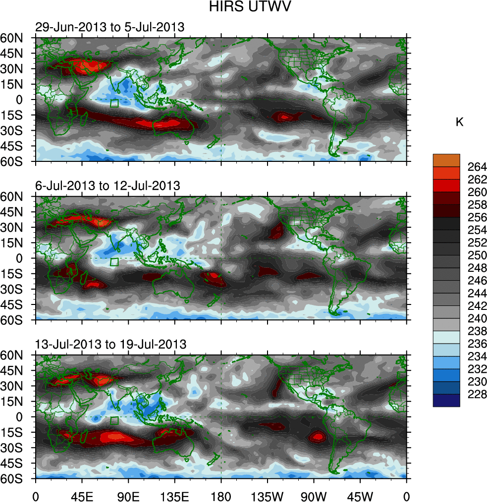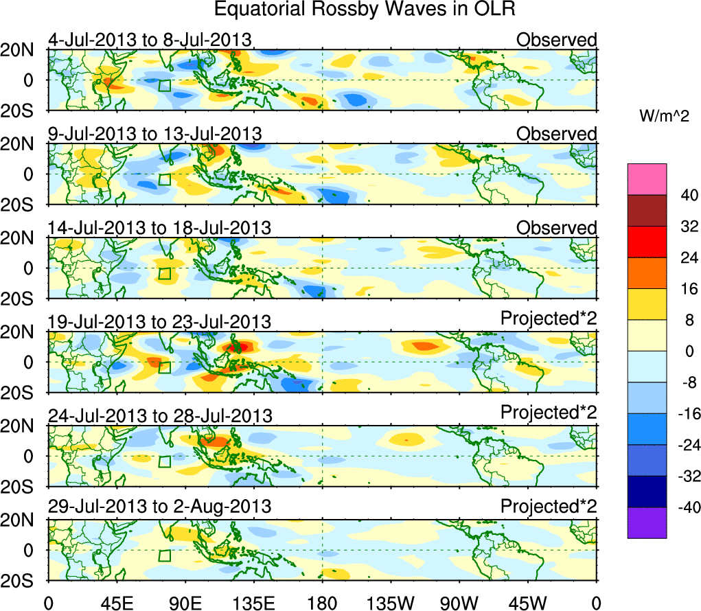 To identify tropical waves in near real-time, the OLR and UTWV data are filtered following Wheeler & Weickmann (2001 MWR). The daily anomalies are calculated using the first 3 harmonics of the seasonal cycle for 1979–2009. Missing values are then filled using linear interpolation in space and time. The most recent 365 days of anomalies are padded with 659 days of zeroes, and the result is filtered for each wave type.