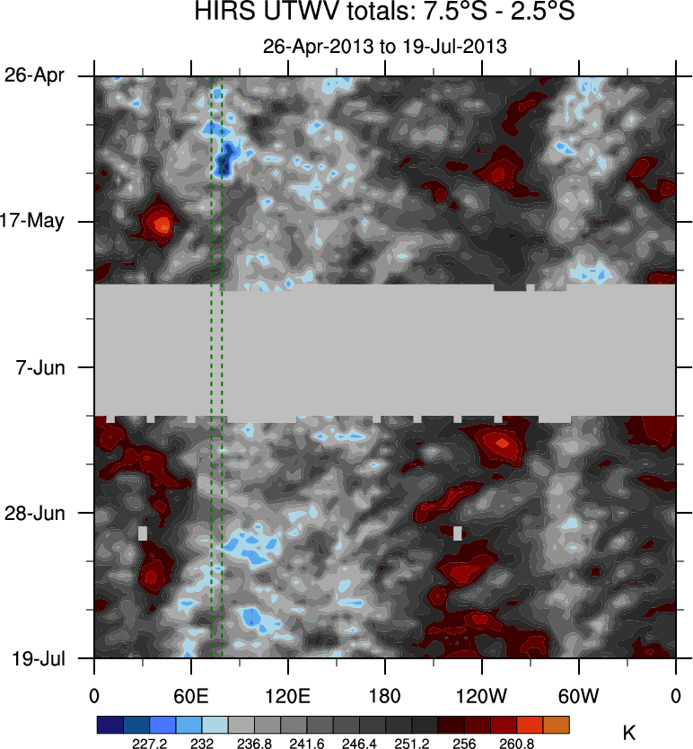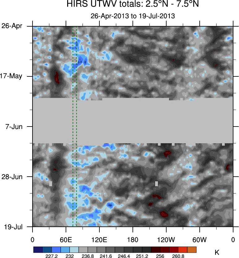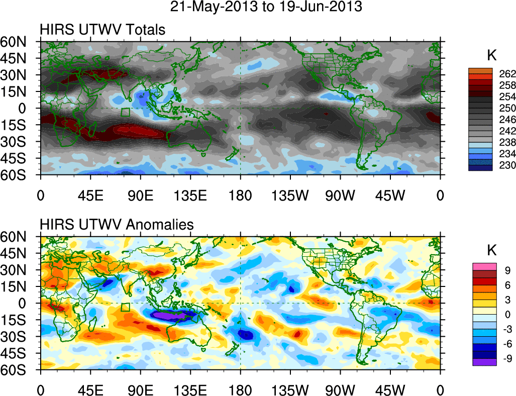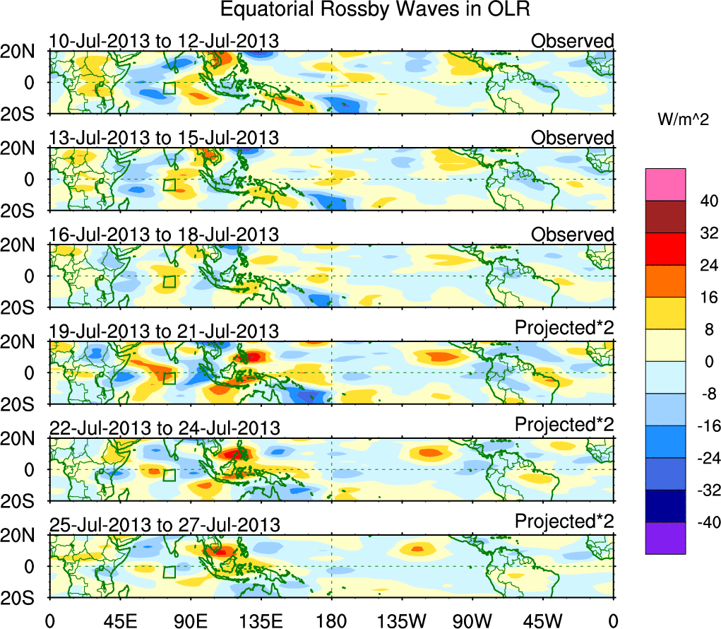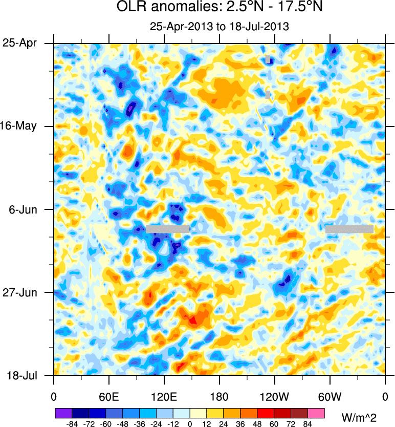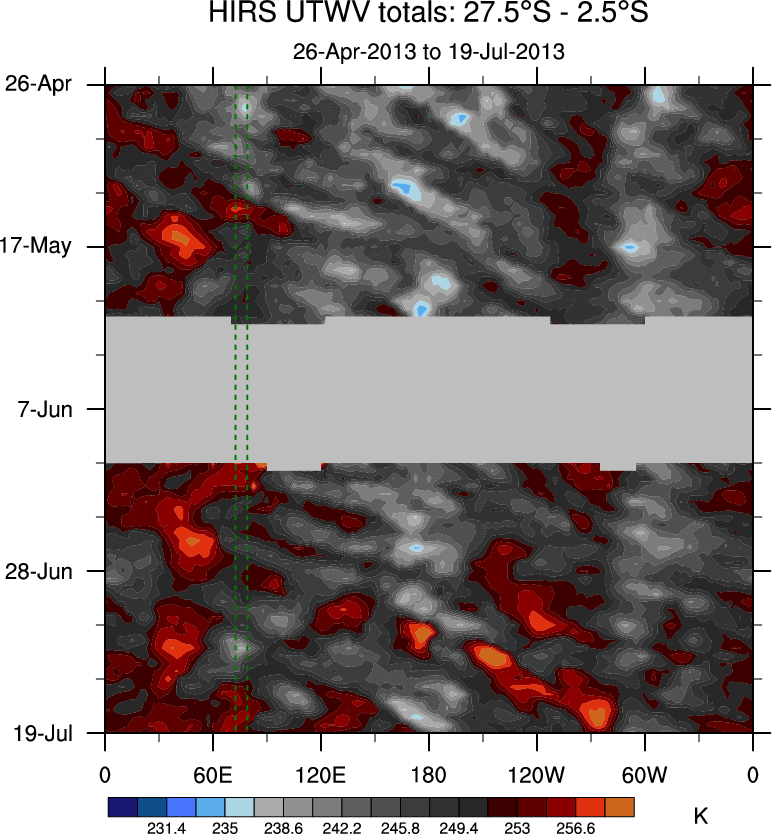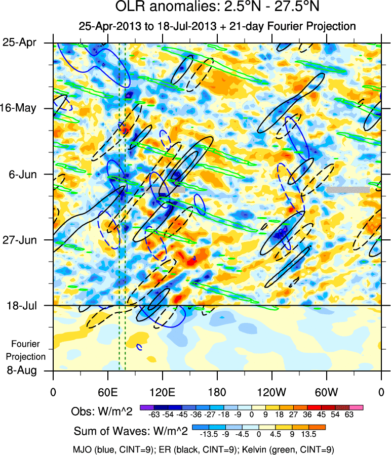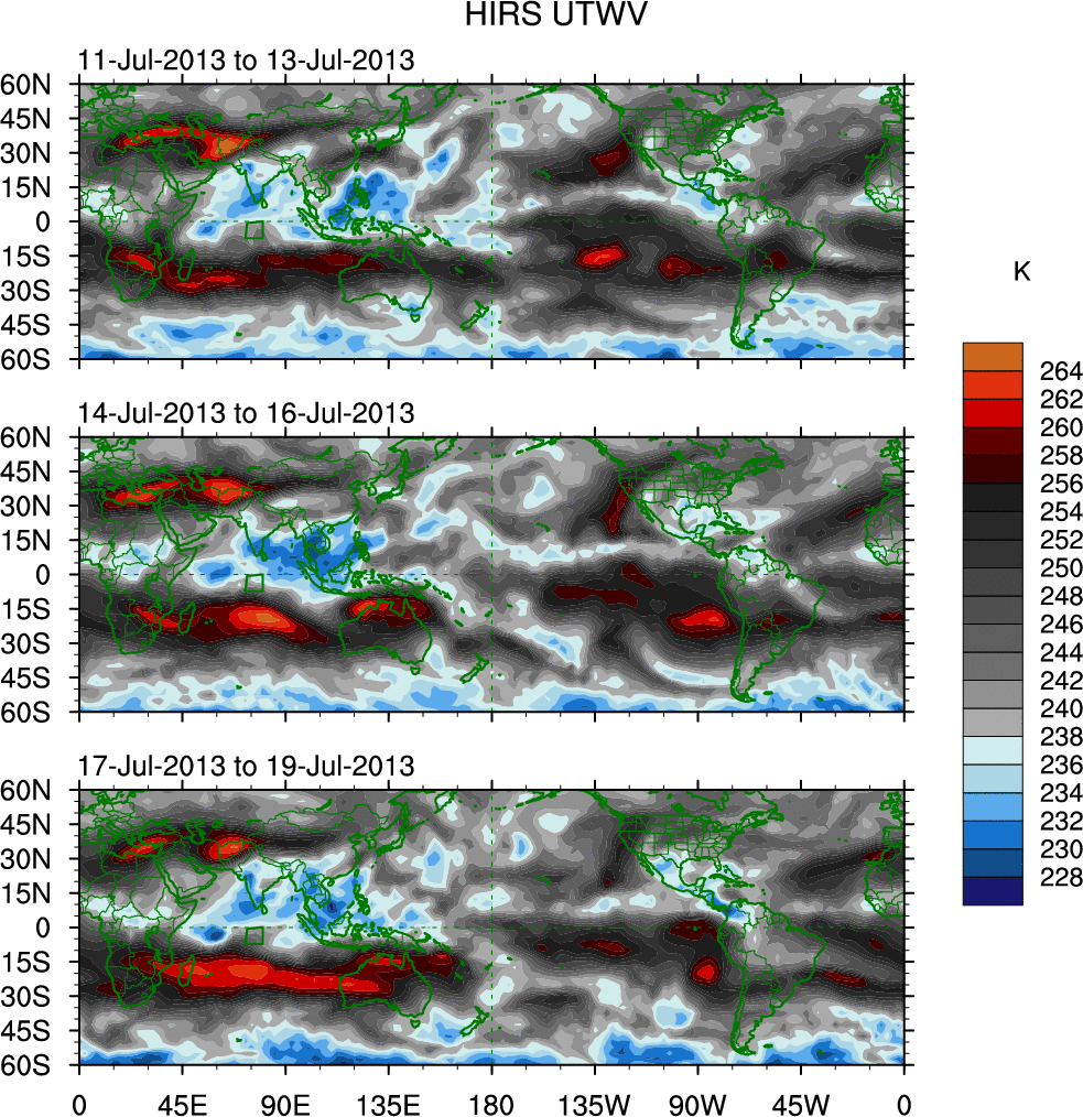 To identify tropical waves in near real-time, the OLR and UTWV data are filtered following Wheeler & Weickmann (2001 MWR). The daily anomalies are calculated using the first 3 harmonics of the seasonal cycle for 1979–2009. Missing values are then filled using linear interpolation in space and time. The most recent 365 days of anomalies are padded with 659 days of zeroes, and the result is filtered for each wave type.