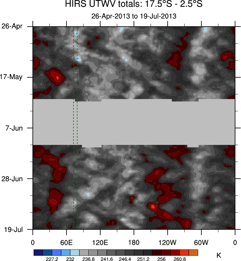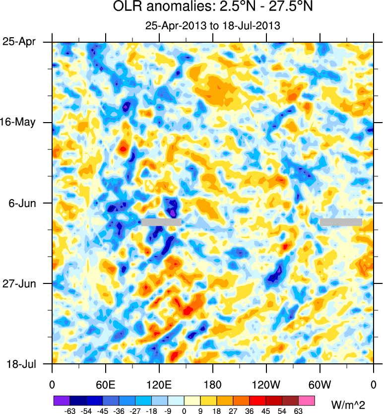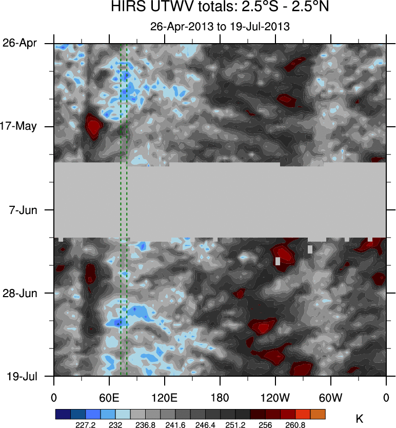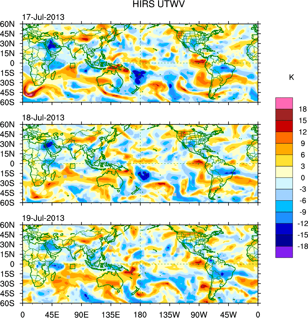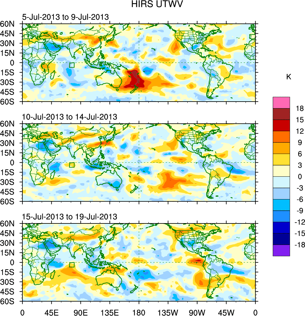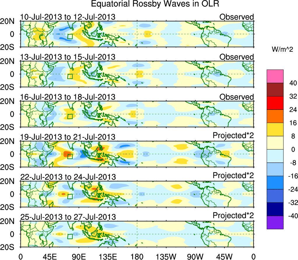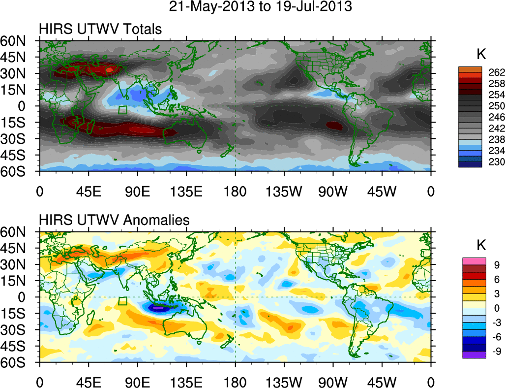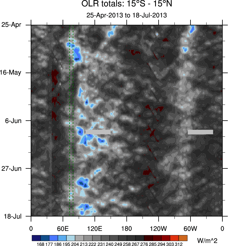 To identify tropical waves in near real-time, the OLR and UTWV data are filtered following Wheeler & Weickmann (2001 MWR). The daily anomalies are calculated using the first 3 harmonics of the seasonal cycle for 1979–2009. Missing values are then filled using linear interpolation in space and time. The most recent 365 days of anomalies are padded with 659 days of zeroes, and the result is filtered for each wave type.