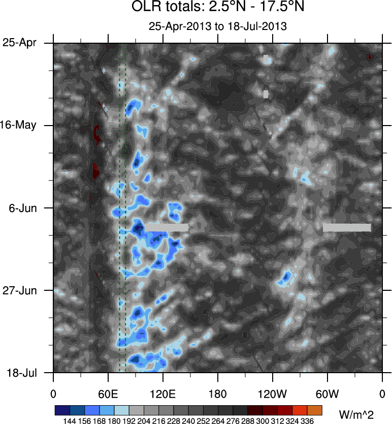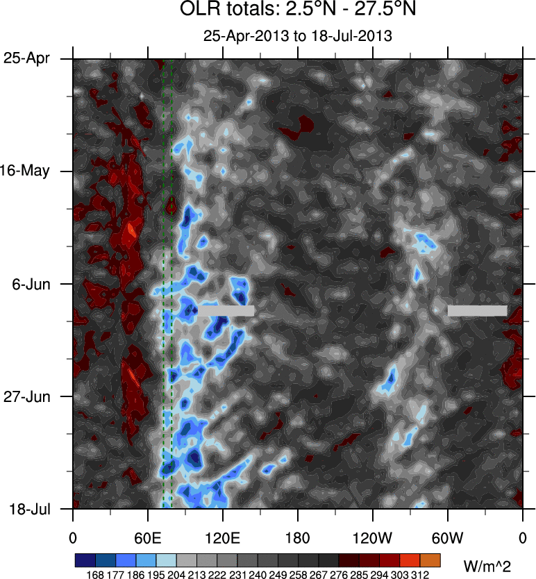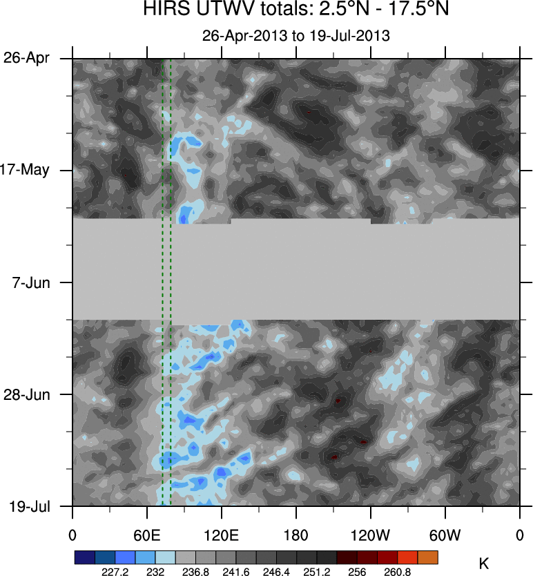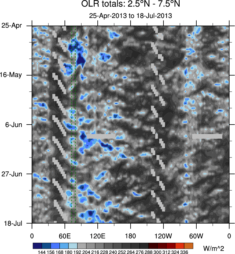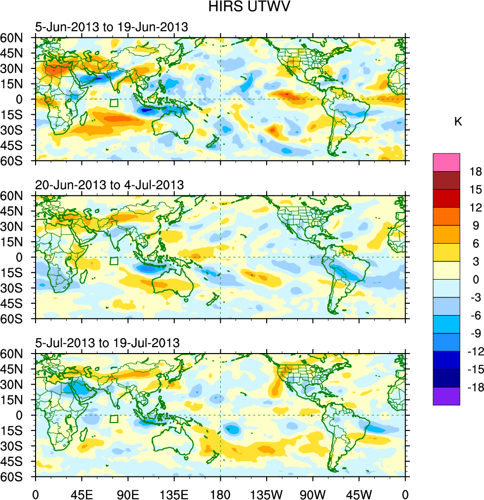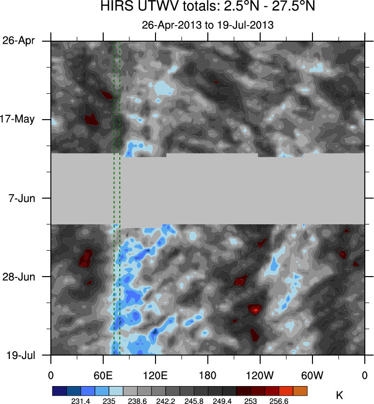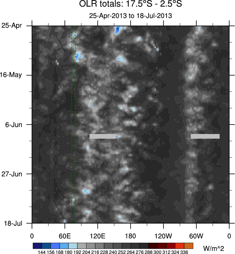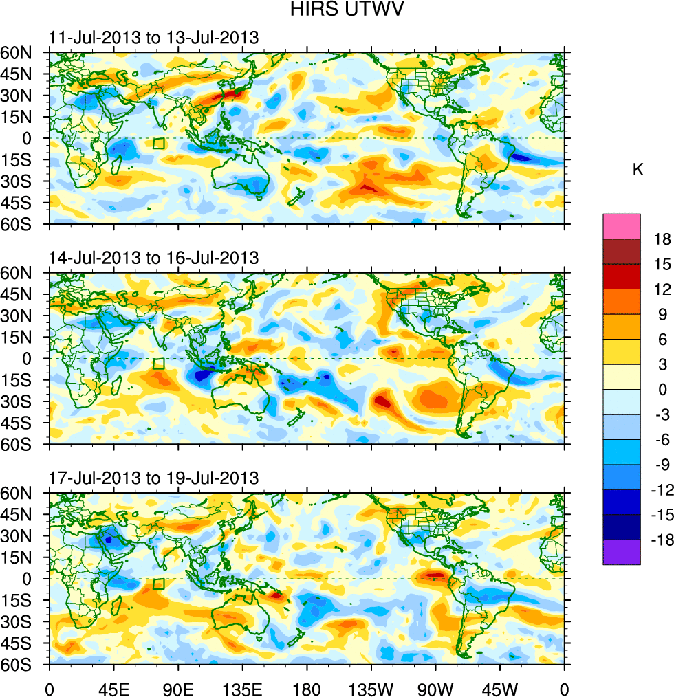 To identify tropical waves in near real-time, the OLR and UTWV data are filtered following Wheeler & Weickmann (2001 MWR). The daily anomalies are calculated using the first 3 harmonics of the seasonal cycle for 1979–2009. Missing values are then filled using linear interpolation in space and time. The most recent 365 days of anomalies are padded with 659 days of zeroes, and the result is filtered for each wave type.