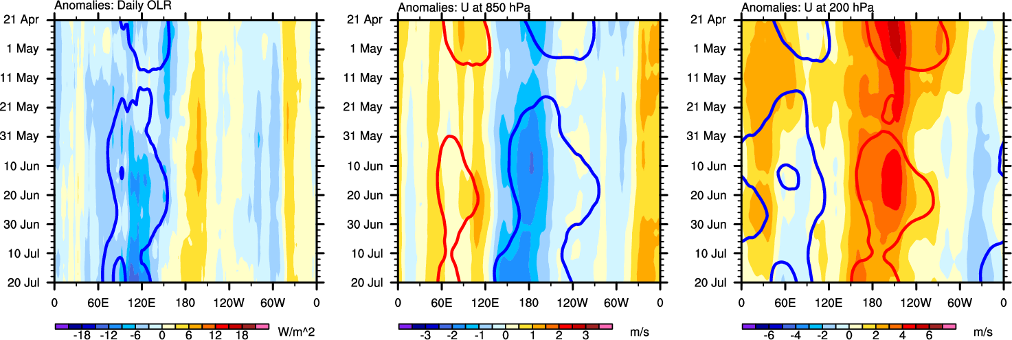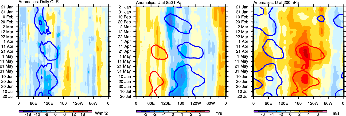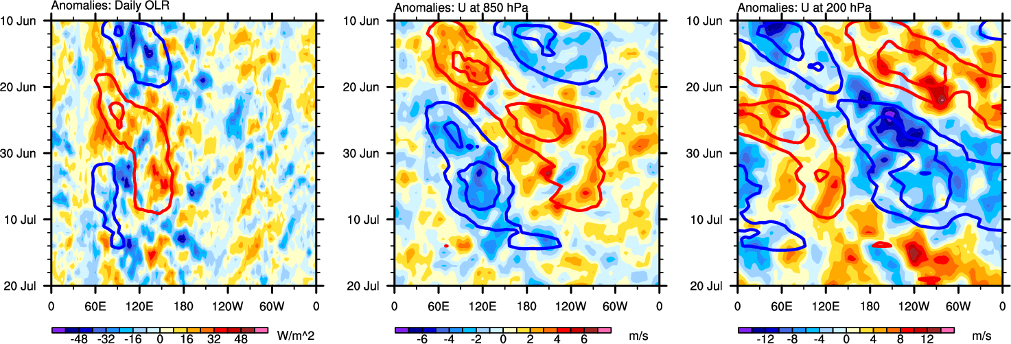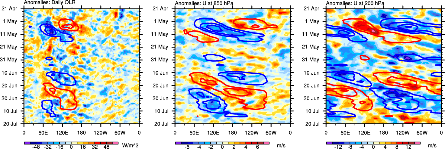 The Hovmollers show longitude-time plots for OLR, U-850, and U-200. The shading indicates the observed anomalies, while the contours are the projection of those anomalies onto the RMM EOFs.