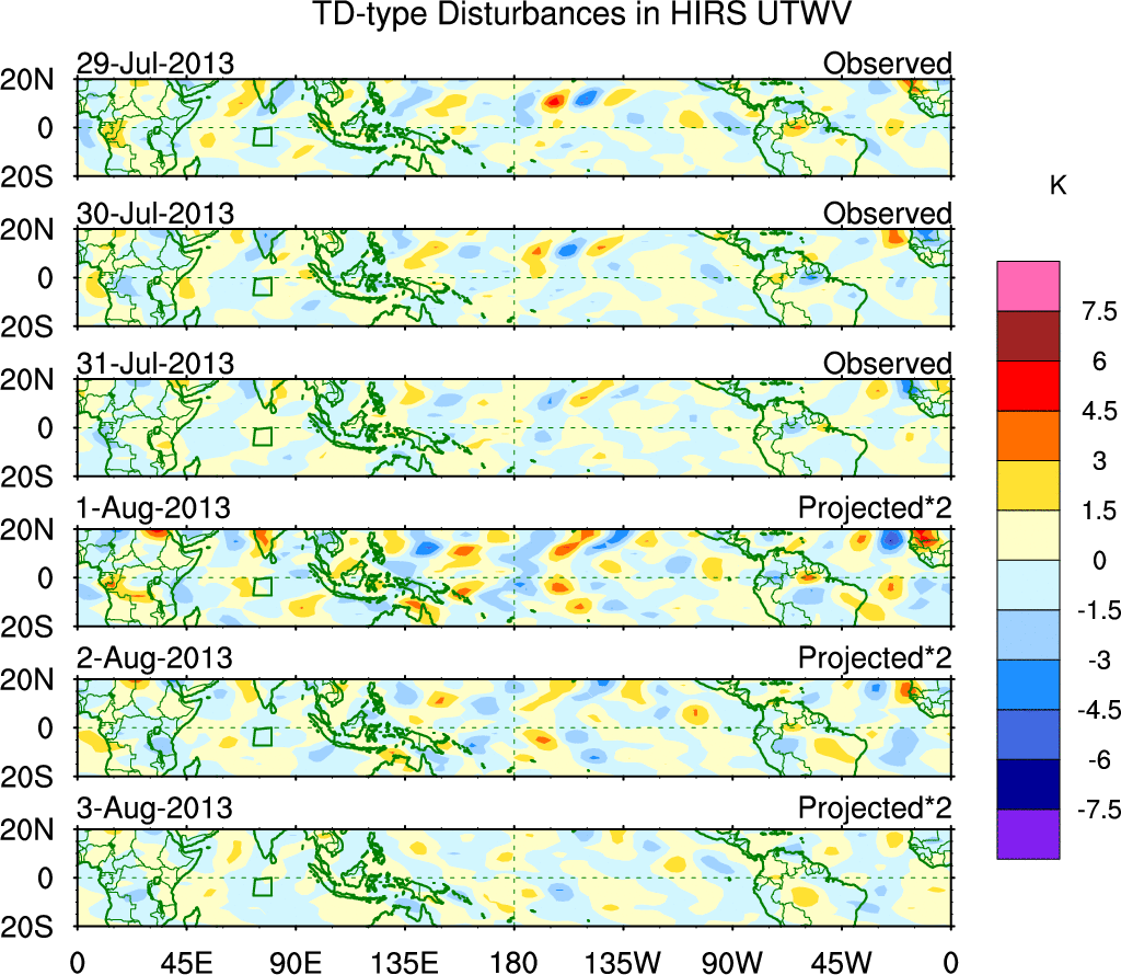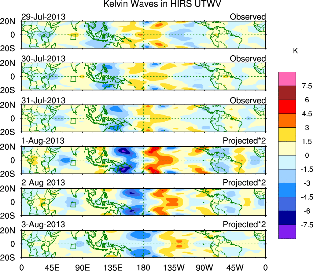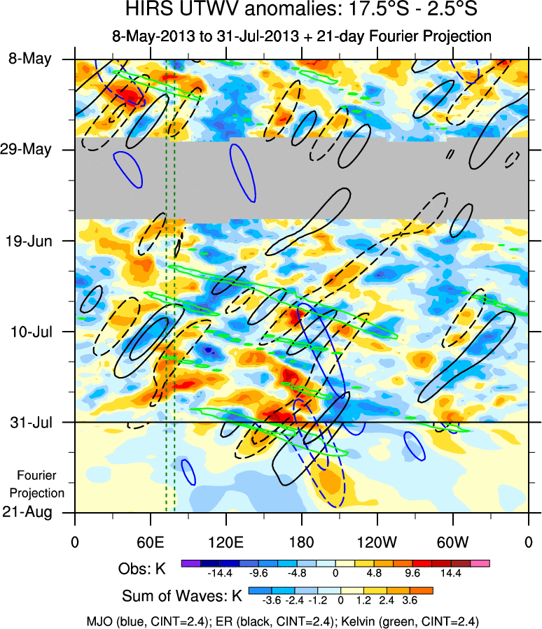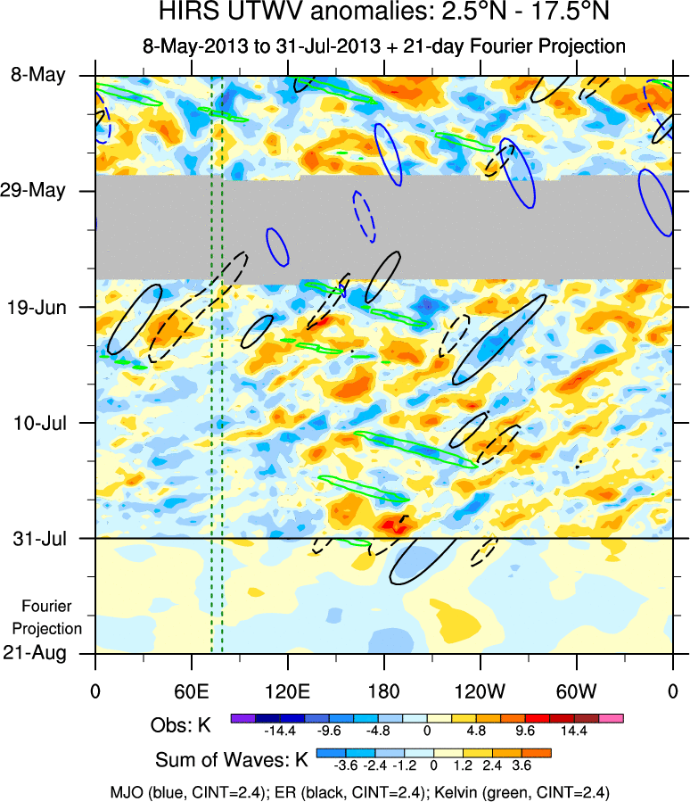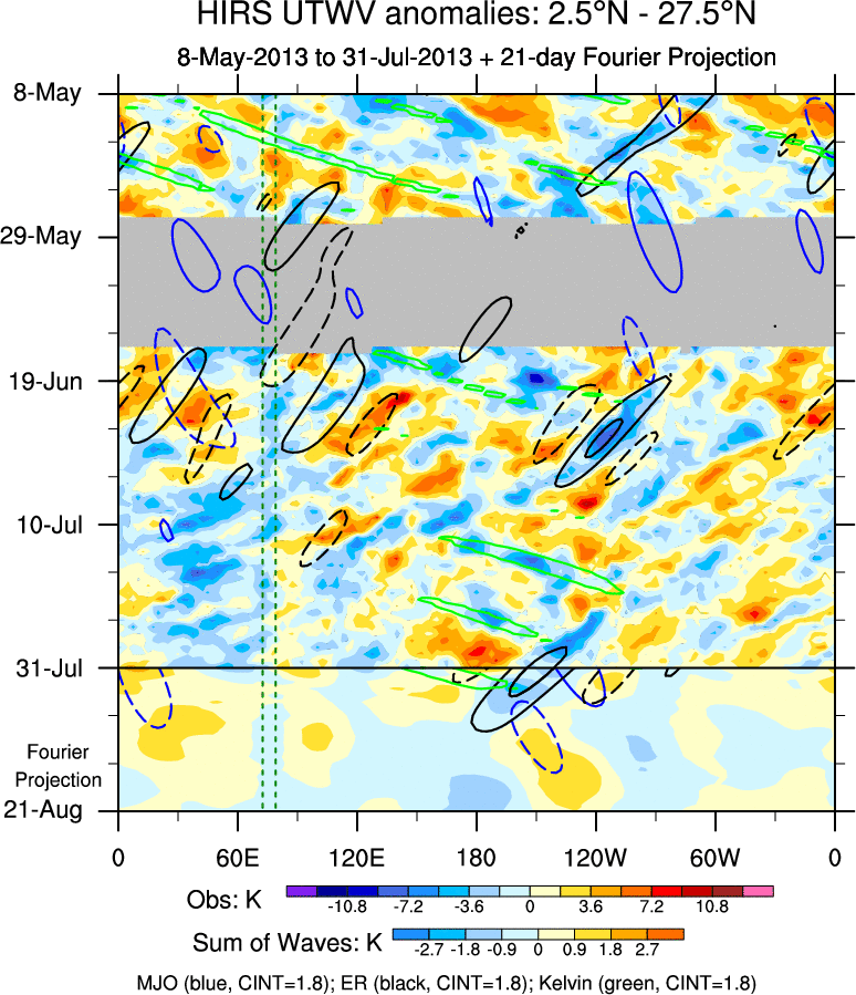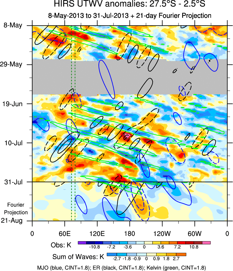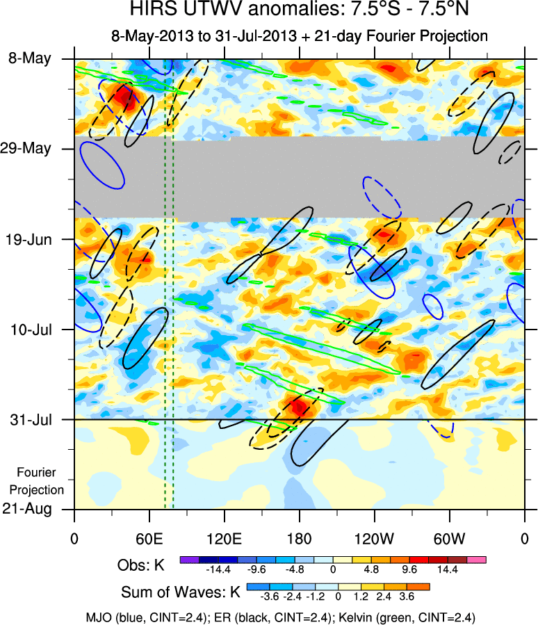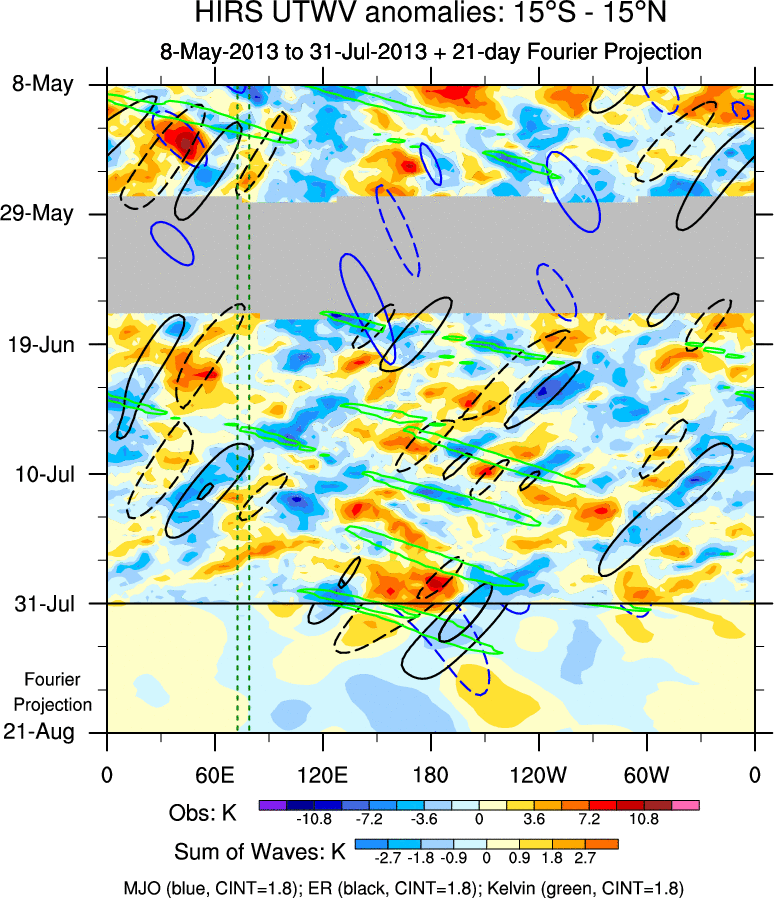 To identify tropical waves in near real-time, the OLR and UTWV data are filtered following Wheeler & Weickmann (2001 MWR). The daily anomalies are calculated using the first 3 harmonics of the seasonal cycle for 1979–2009. Missing values are then filled using linear interpolation in space and time. The most recent 365 days of anomalies are padded with 659 days of zeroes, and the result is filtered for each wave type.