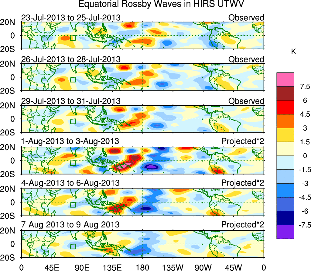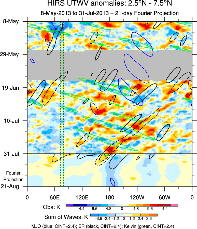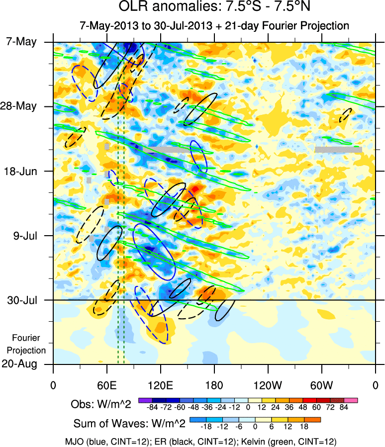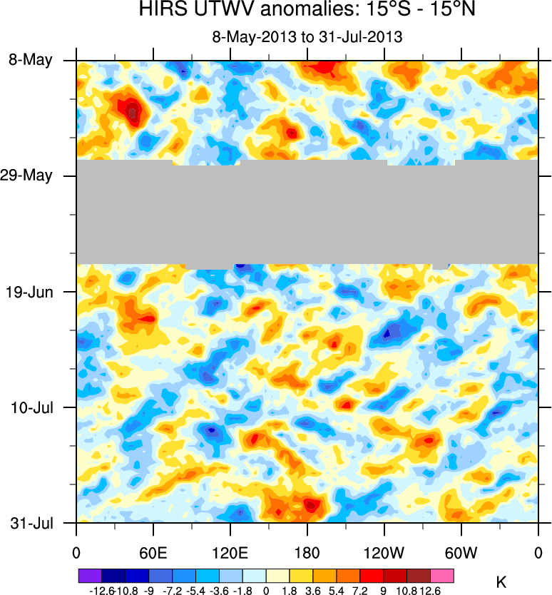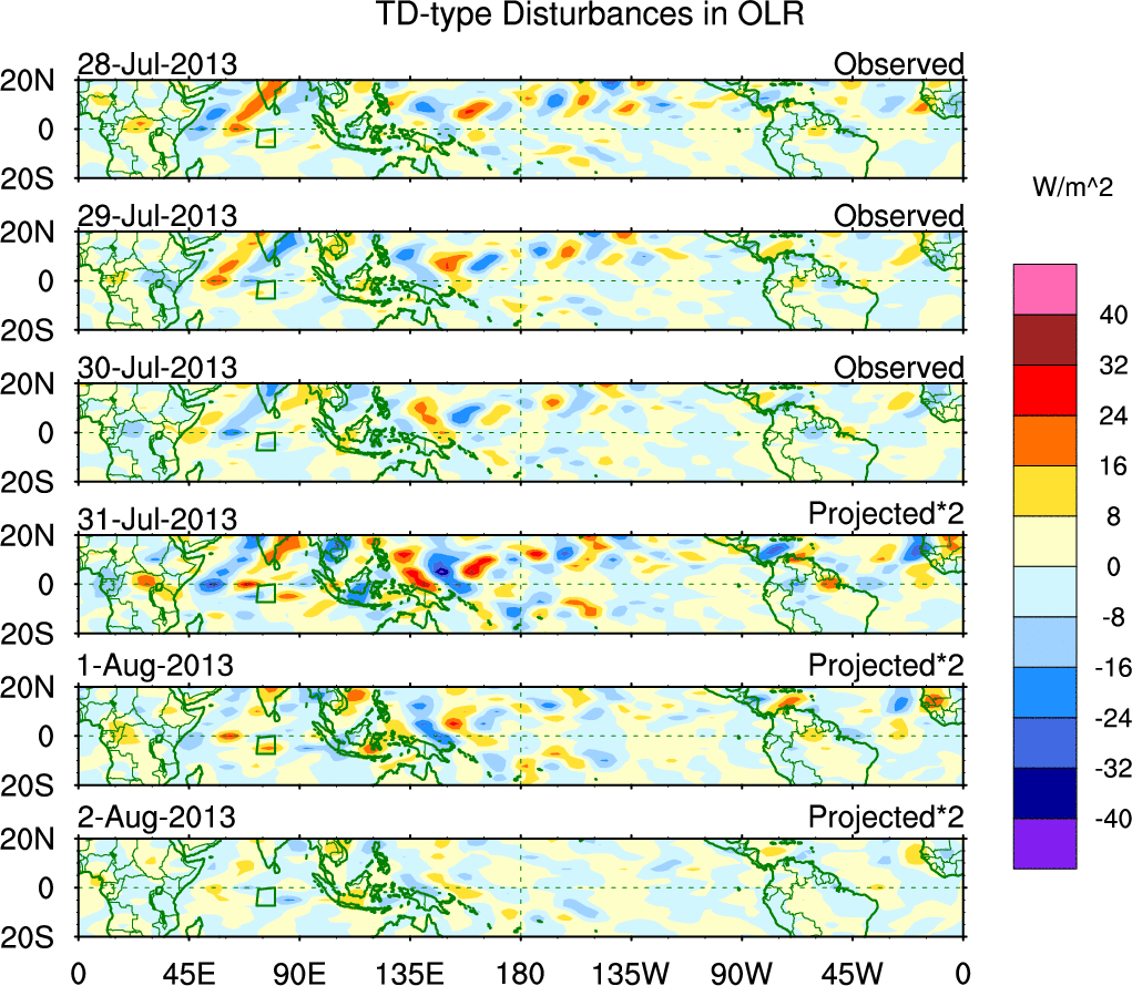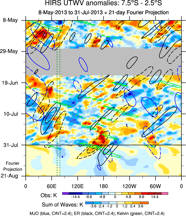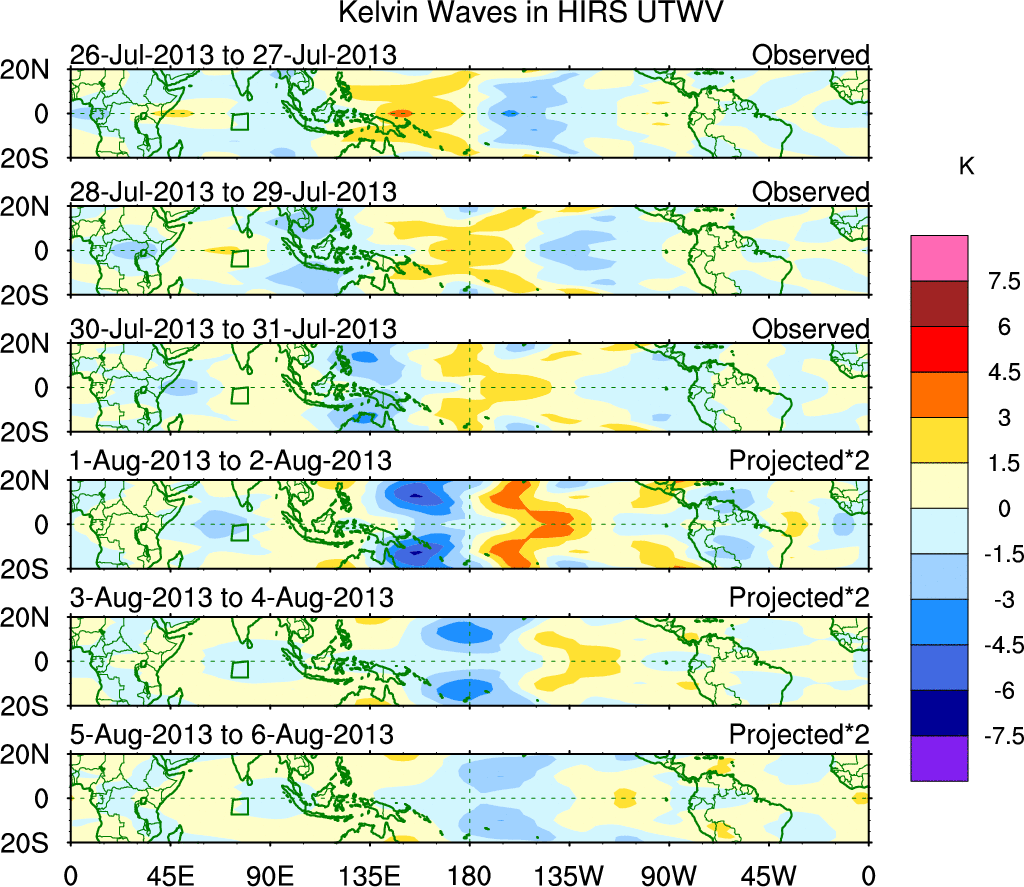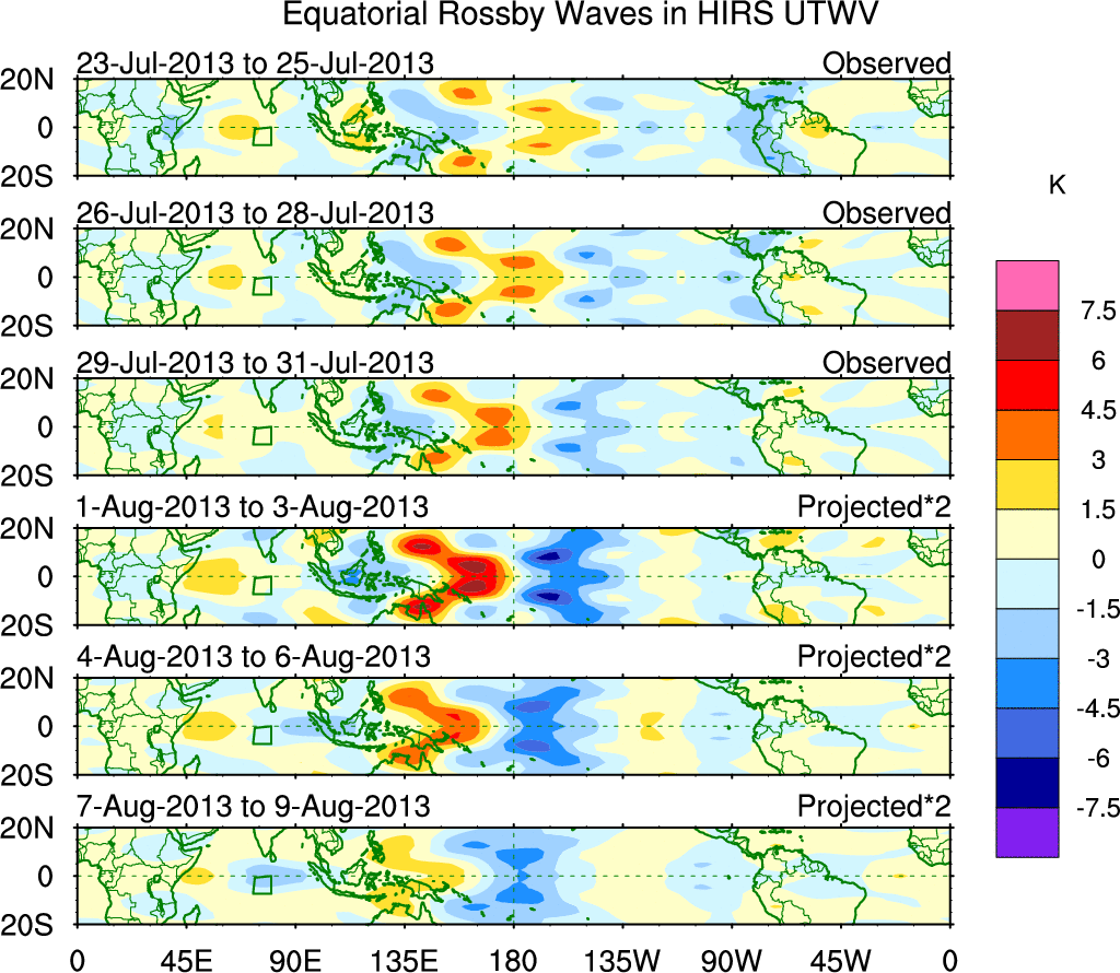 To identify tropical waves in near real-time, the OLR and UTWV data are filtered following Wheeler & Weickmann (2001 MWR). The daily anomalies are calculated using the first 3 harmonics of the seasonal cycle for 1979–2009. Missing values are then filled using linear interpolation in space and time. The most recent 365 days of anomalies are padded with 659 days of zeroes, and the result is filtered for each wave type.