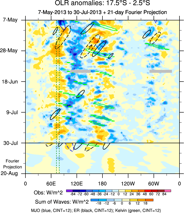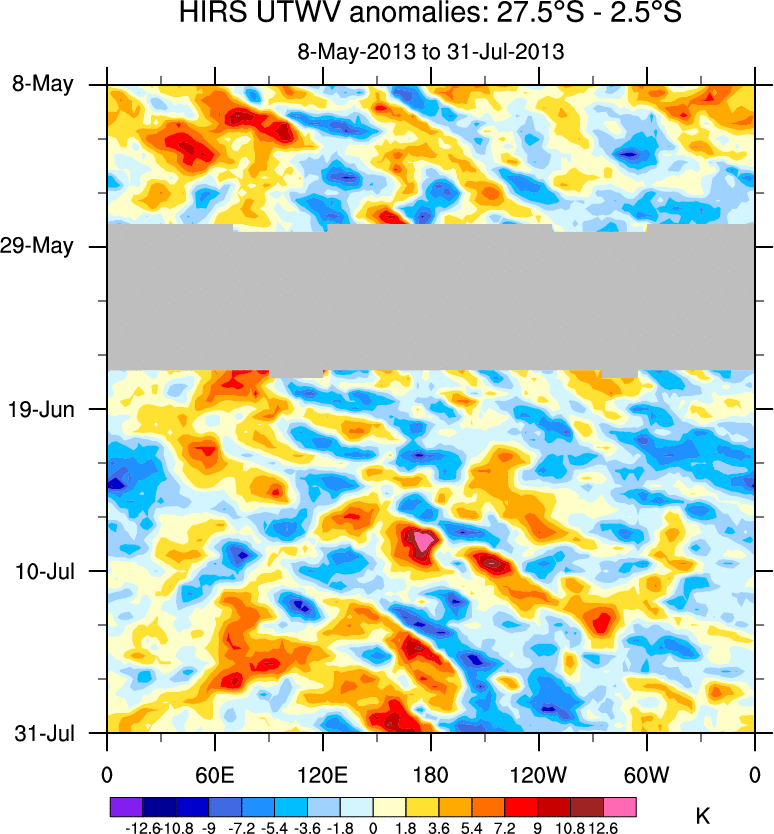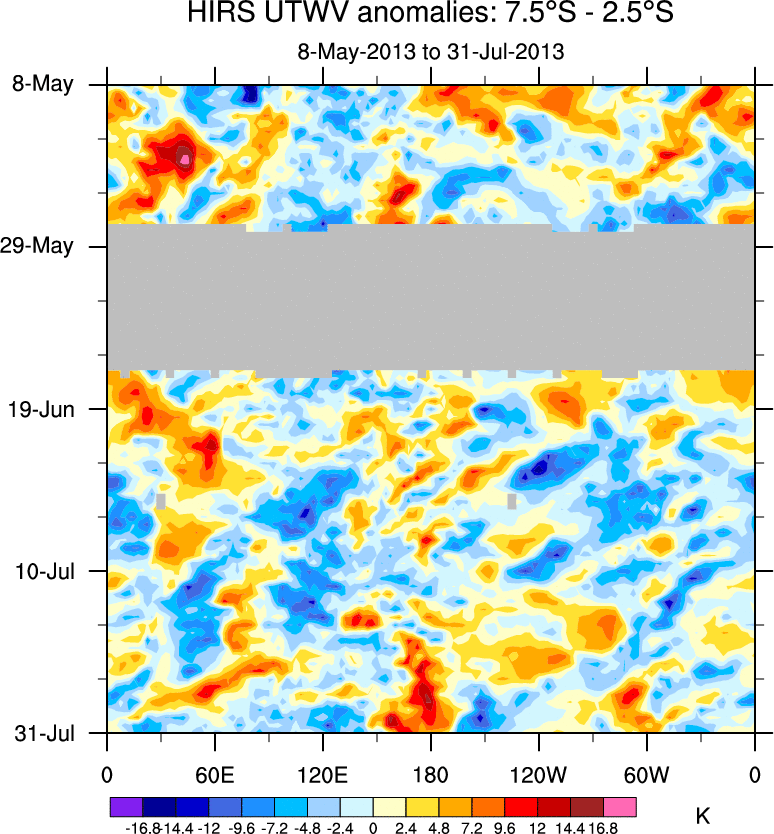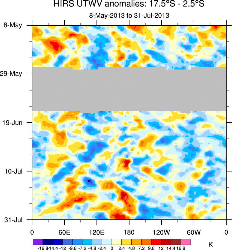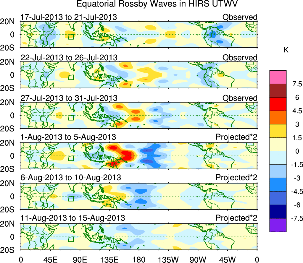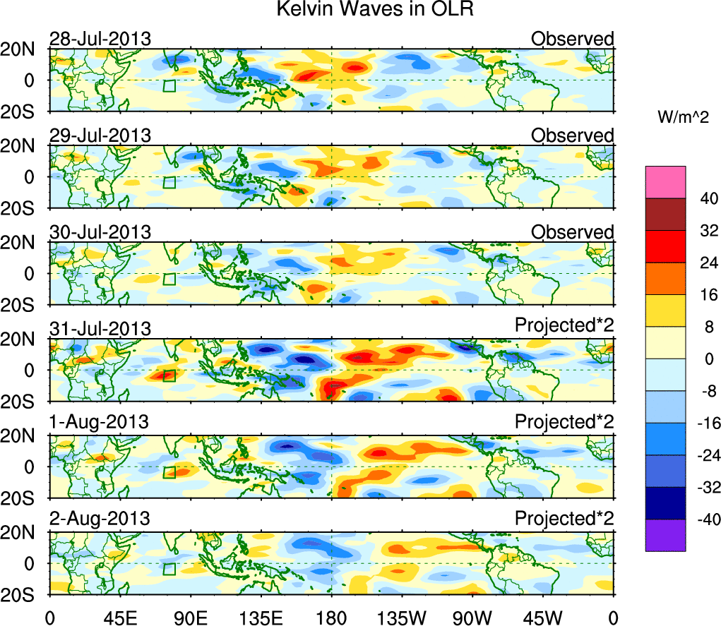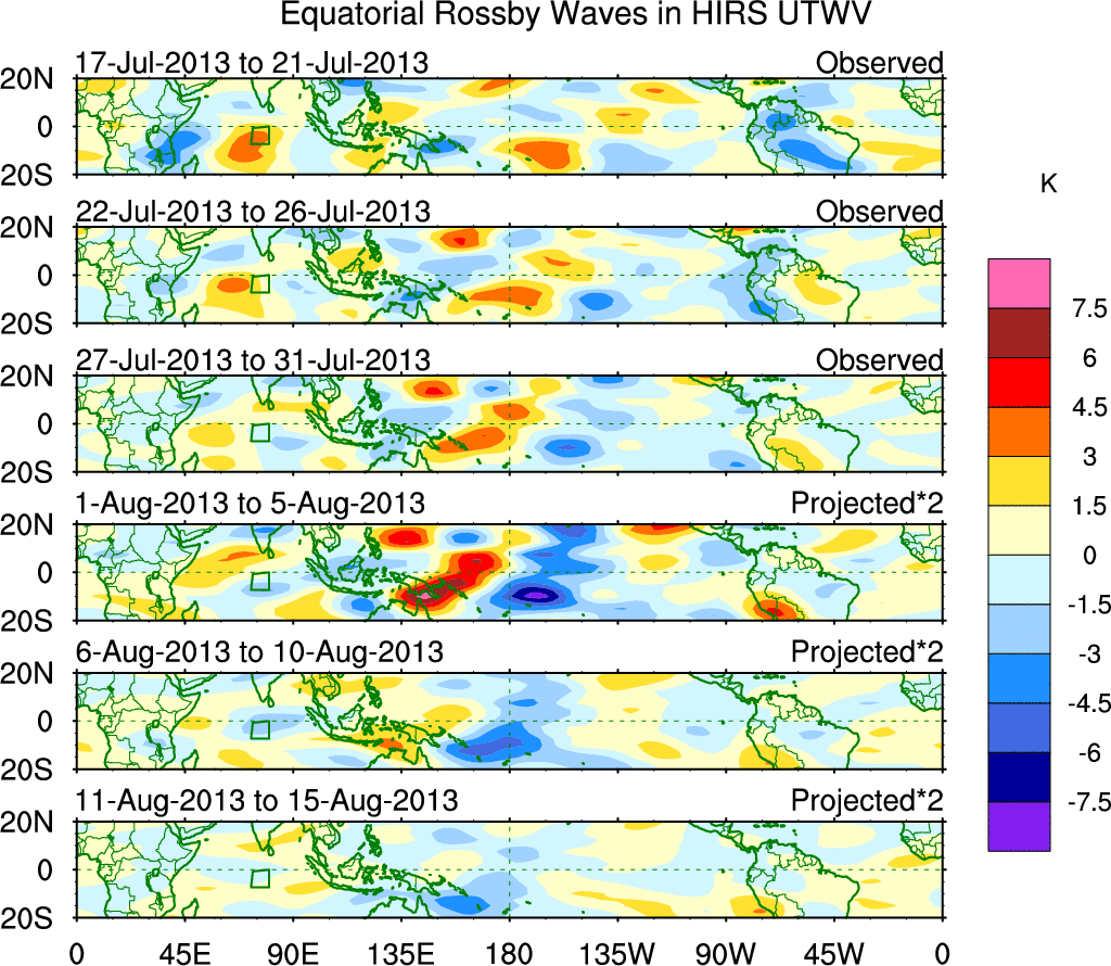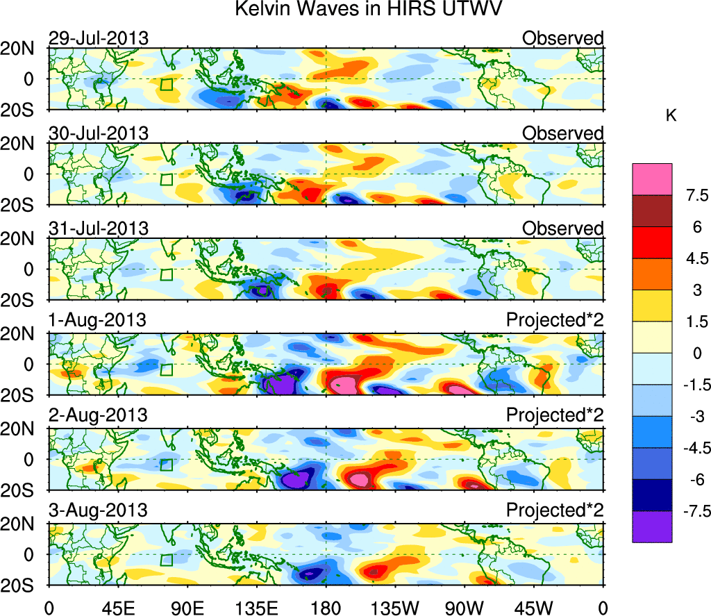 To identify tropical waves in near real-time, the OLR and UTWV data are filtered following Wheeler & Weickmann (2001 MWR). The daily anomalies are calculated using the first 3 harmonics of the seasonal cycle for 1979–2009. Missing values are then filled using linear interpolation in space and time. The most recent 365 days of anomalies are padded with 659 days of zeroes, and the result is filtered for each wave type.