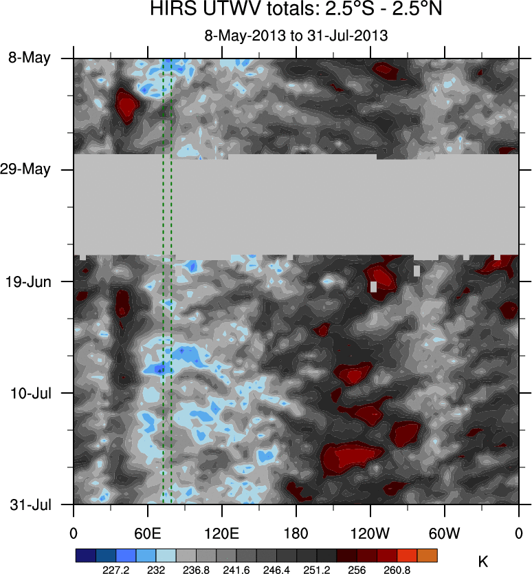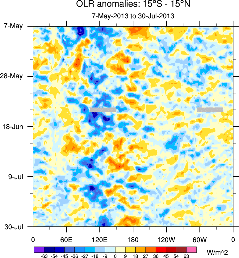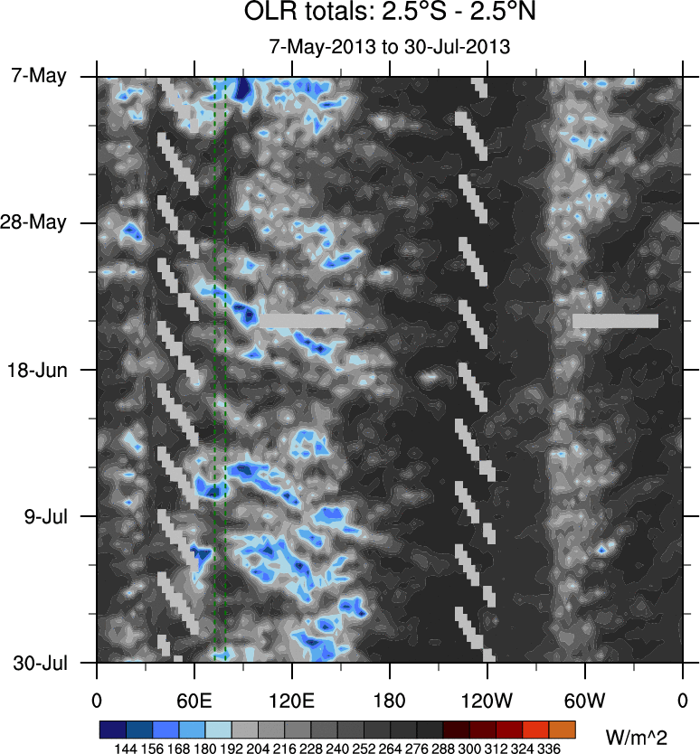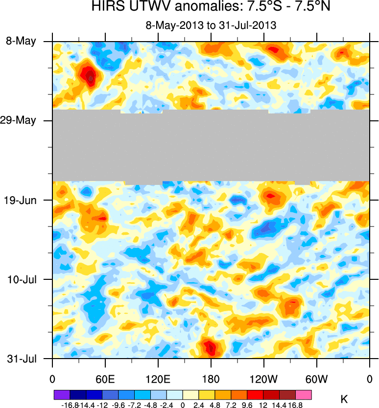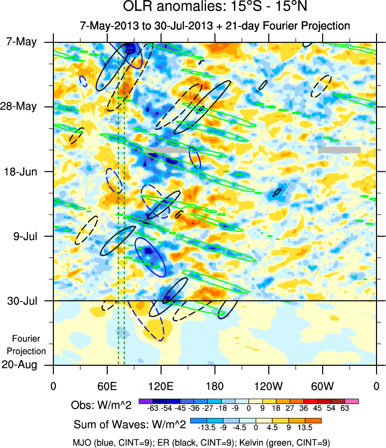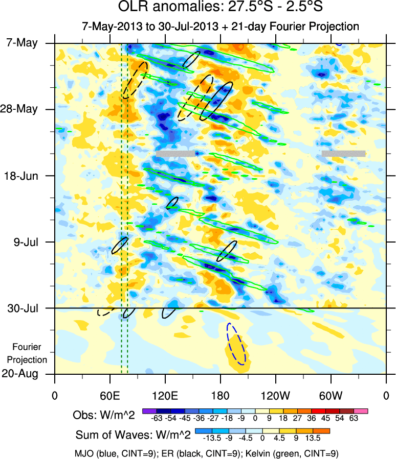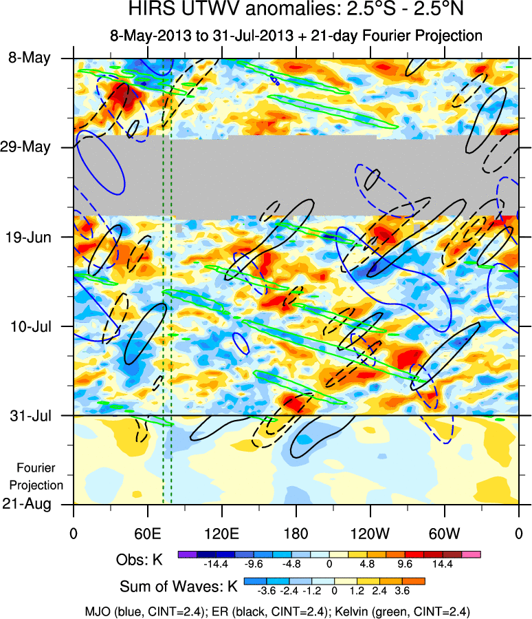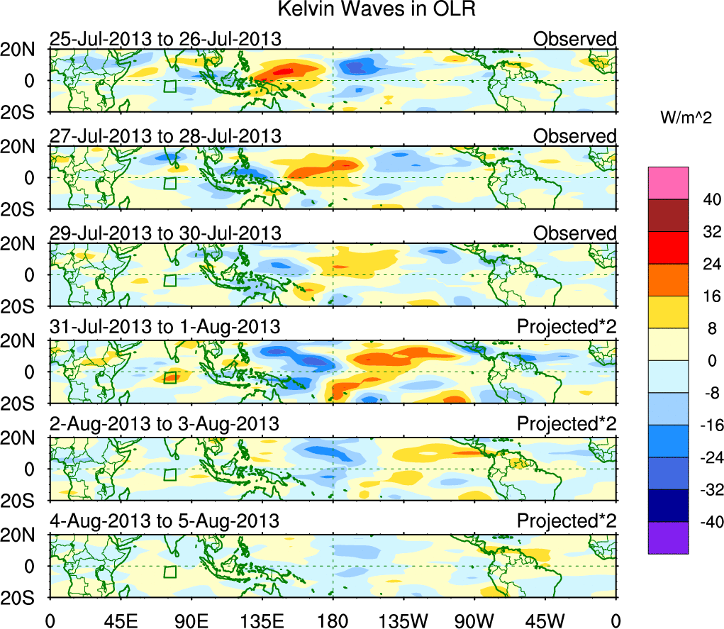 To identify tropical waves in near real-time, the OLR and UTWV data are filtered following Wheeler & Weickmann (2001 MWR). The daily anomalies are calculated using the first 3 harmonics of the seasonal cycle for 1979–2009. Missing values are then filled using linear interpolation in space and time. The most recent 365 days of anomalies are padded with 659 days of zeroes, and the result is filtered for each wave type.