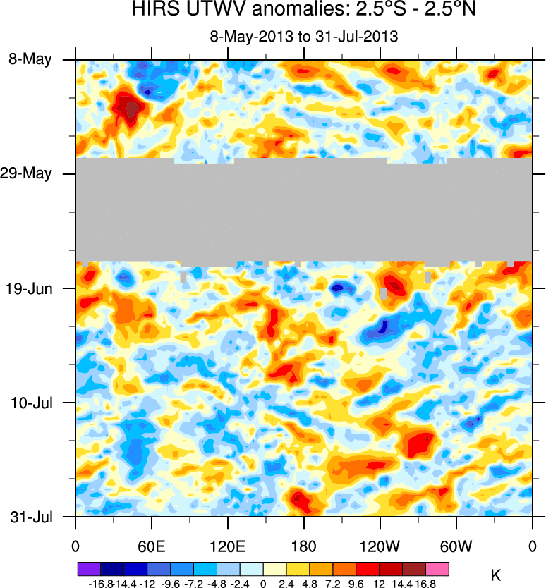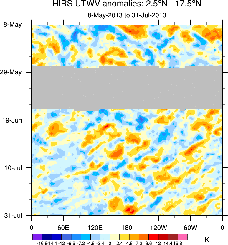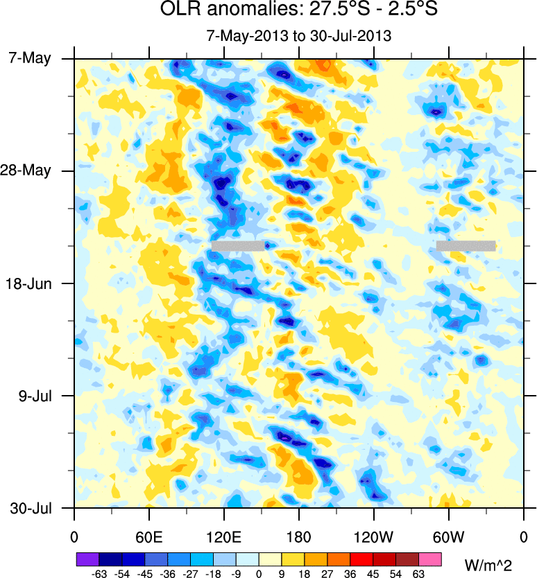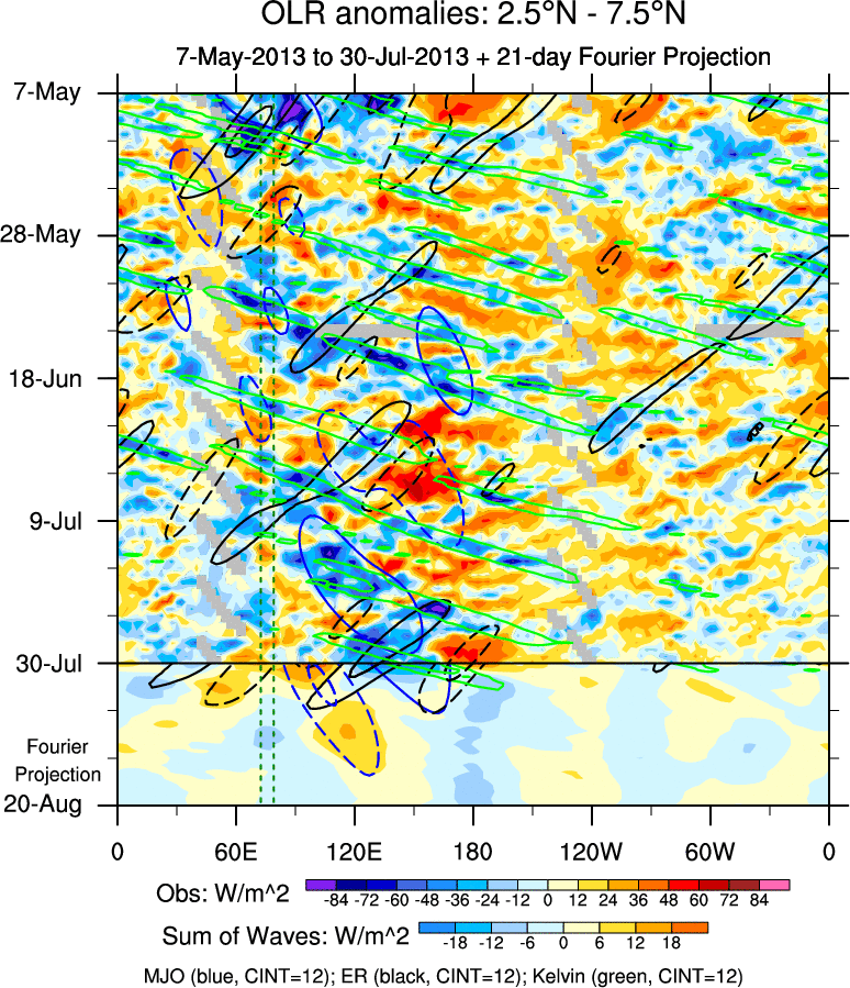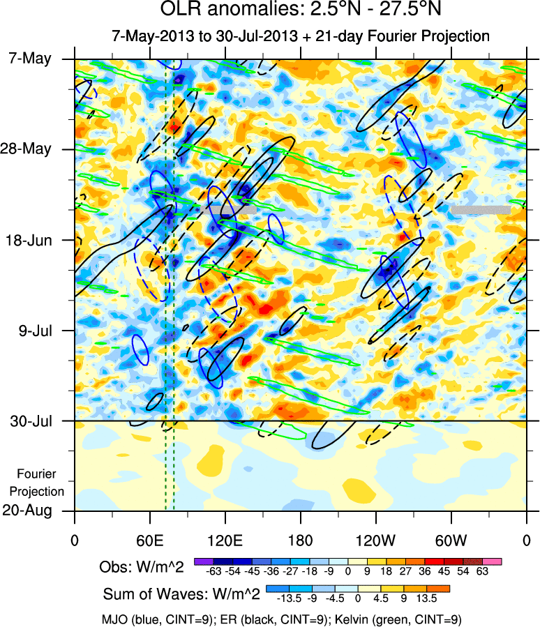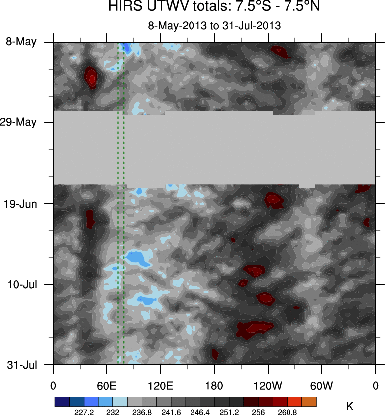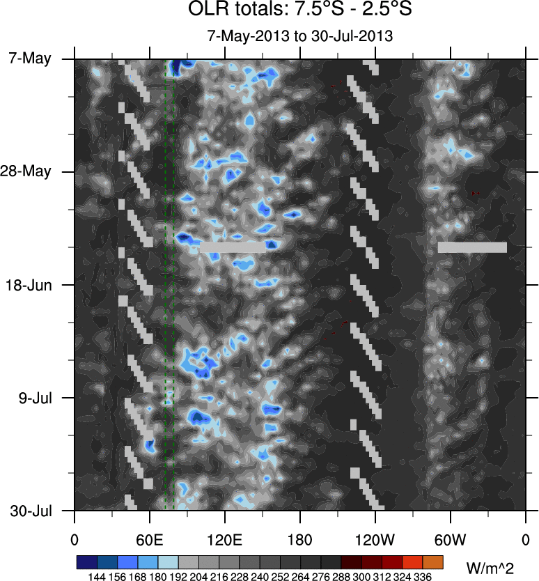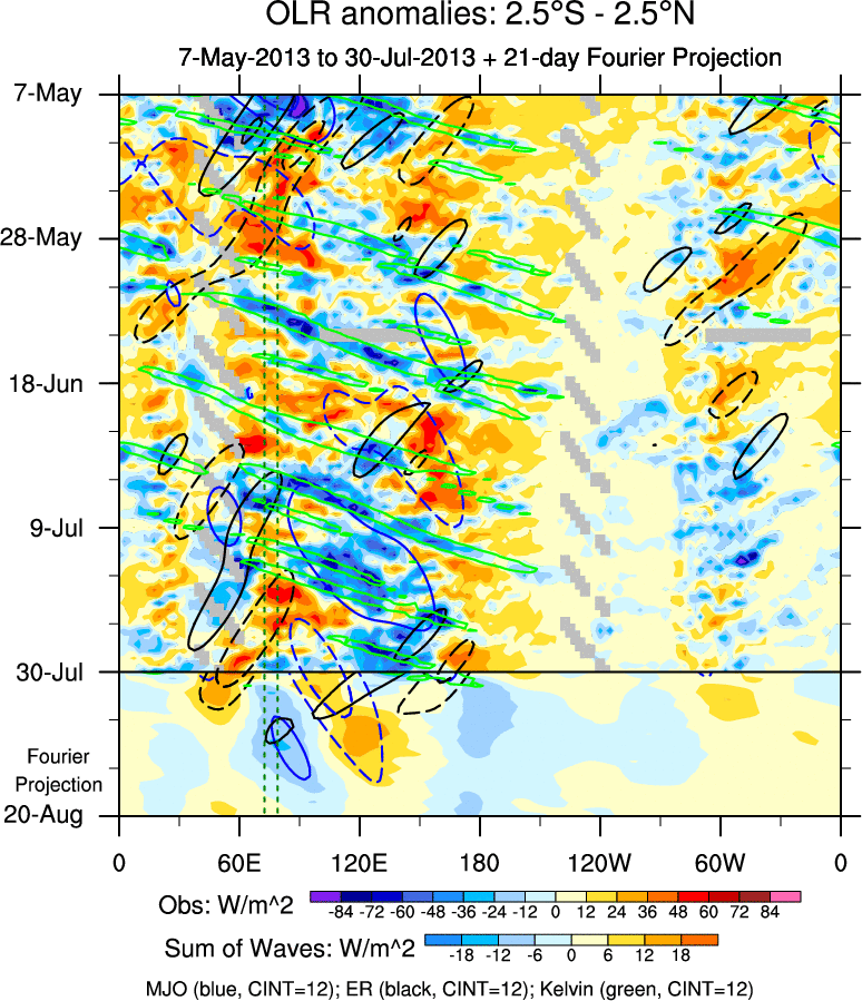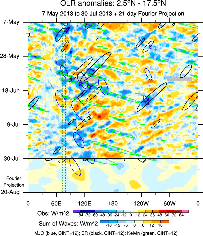 To identify tropical waves in near real-time, the OLR and UTWV data are filtered following Wheeler & Weickmann (2001 MWR). The daily anomalies are calculated using the first 3 harmonics of the seasonal cycle for 1979–2009. Missing values are then filled using linear interpolation in space and time. The most recent 365 days of anomalies are padded with 659 days of zeroes, and the result is filtered for each wave type.