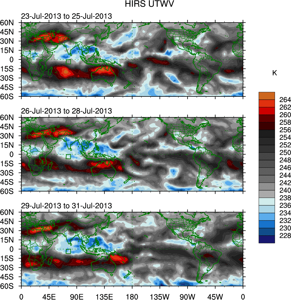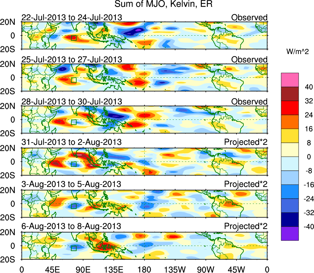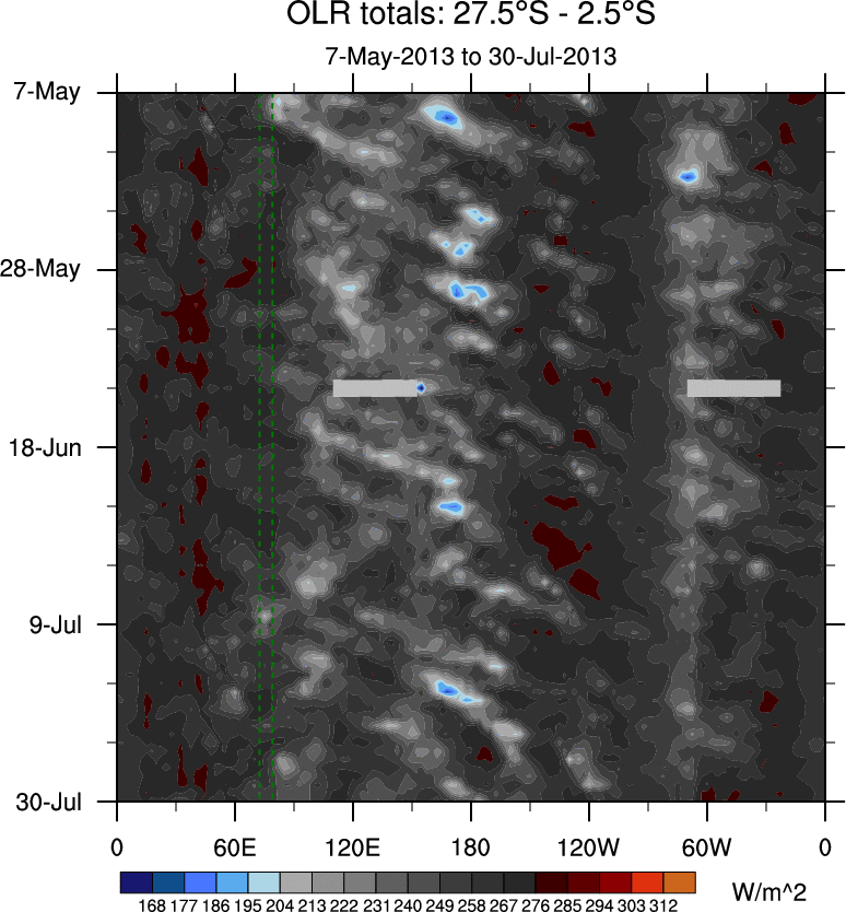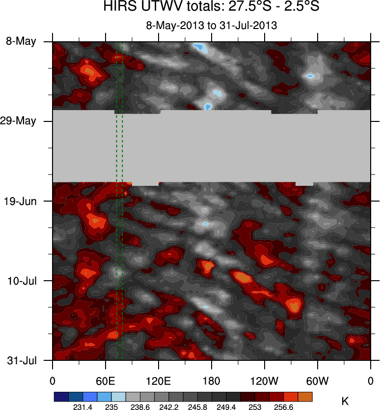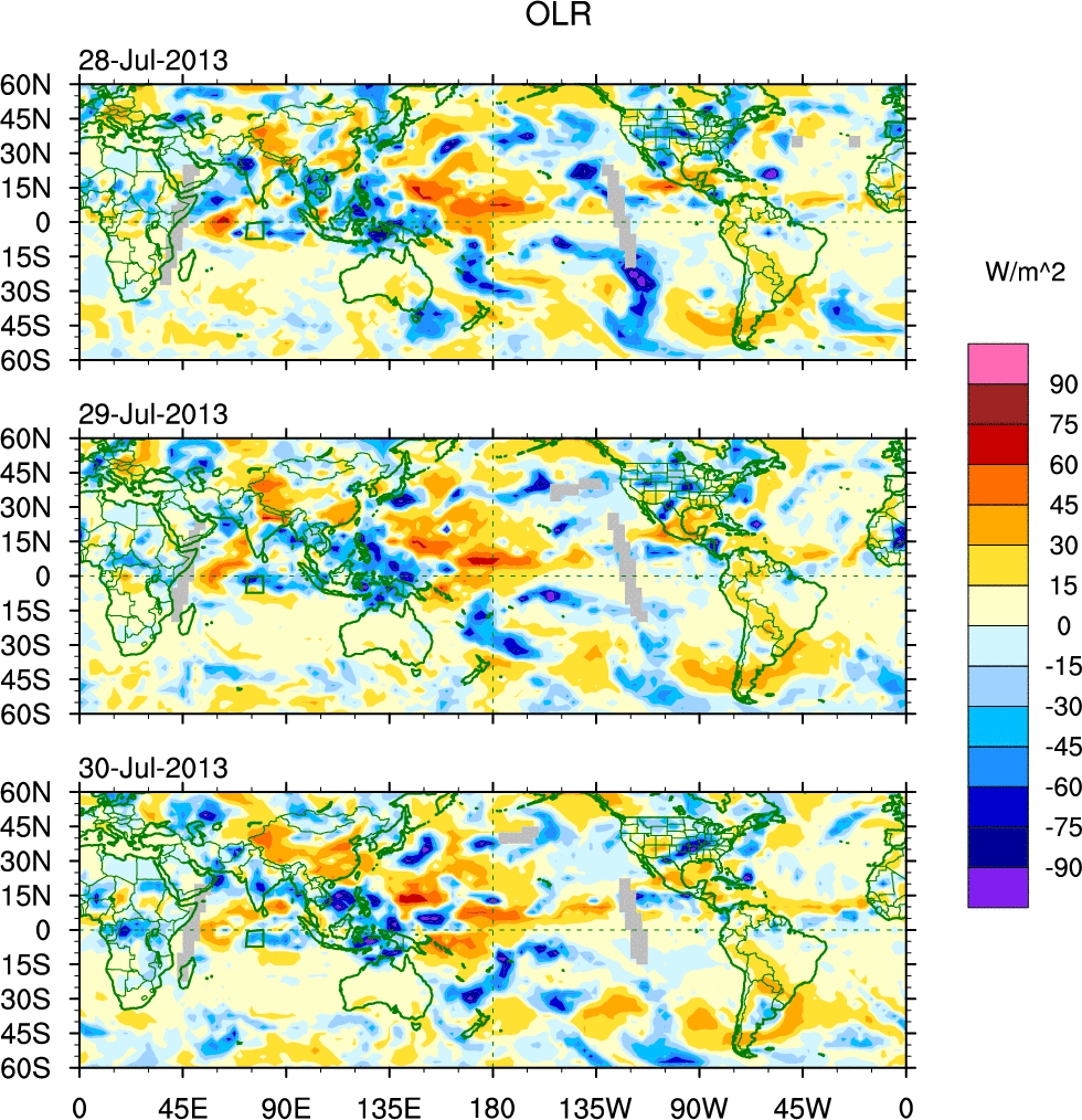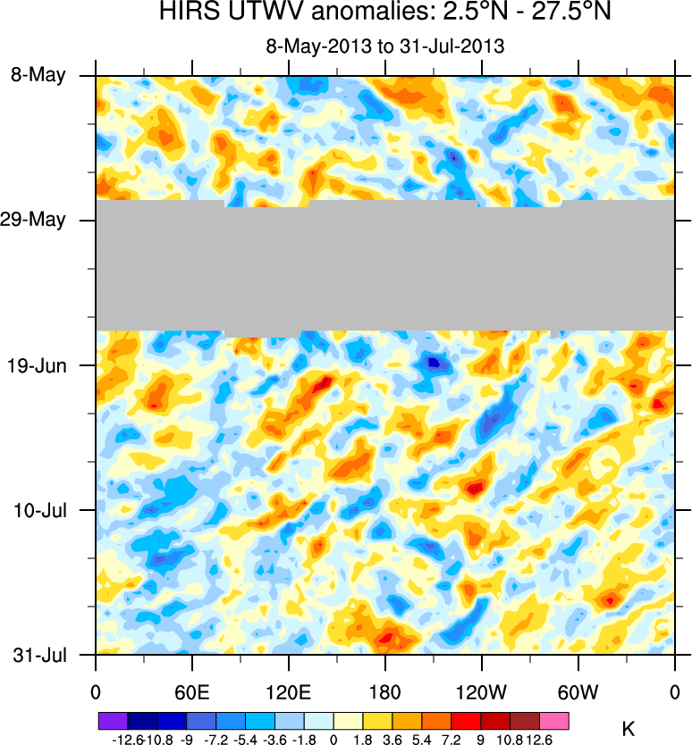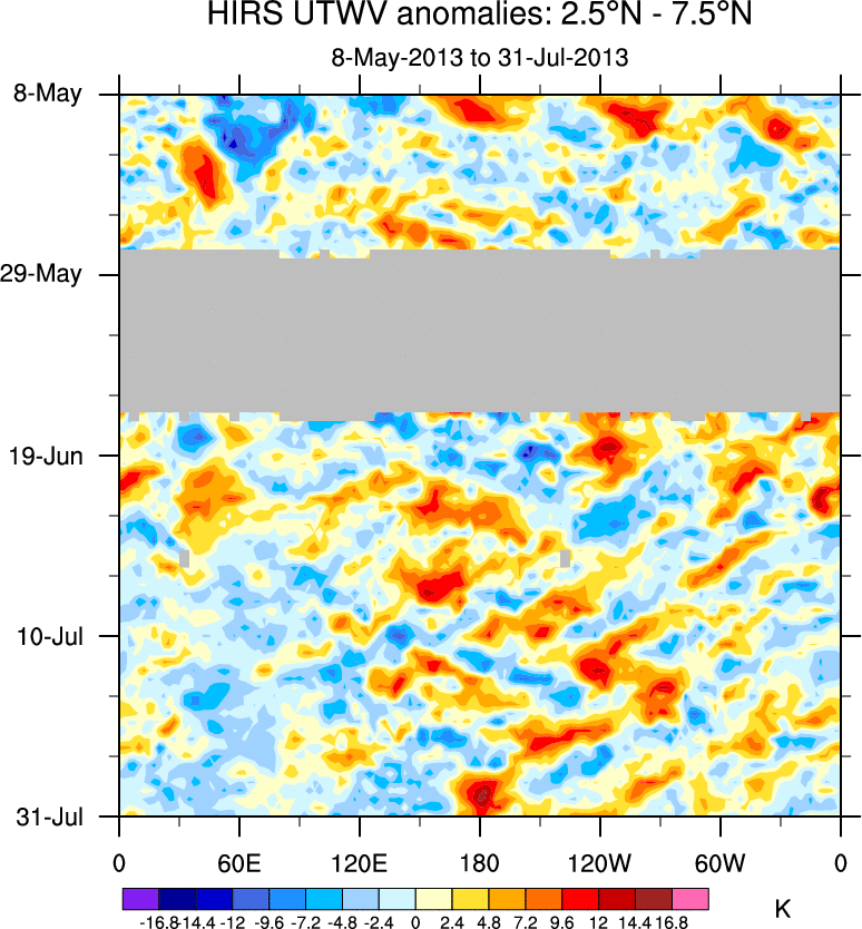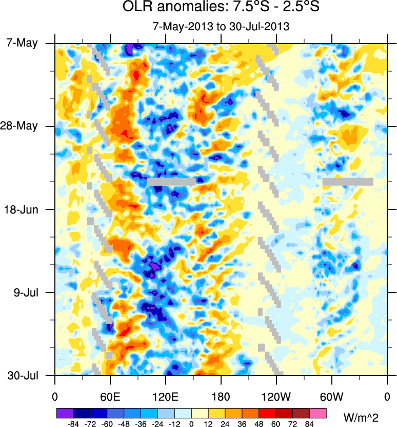 To identify tropical waves in near real-time, the OLR and UTWV data are filtered following Wheeler & Weickmann (2001 MWR). The daily anomalies are calculated using the first 3 harmonics of the seasonal cycle for 1979–2009. Missing values are then filled using linear interpolation in space and time. The most recent 365 days of anomalies are padded with 659 days of zeroes, and the result is filtered for each wave type.