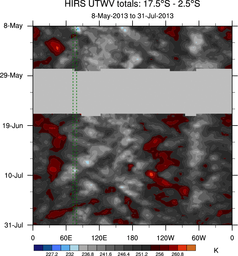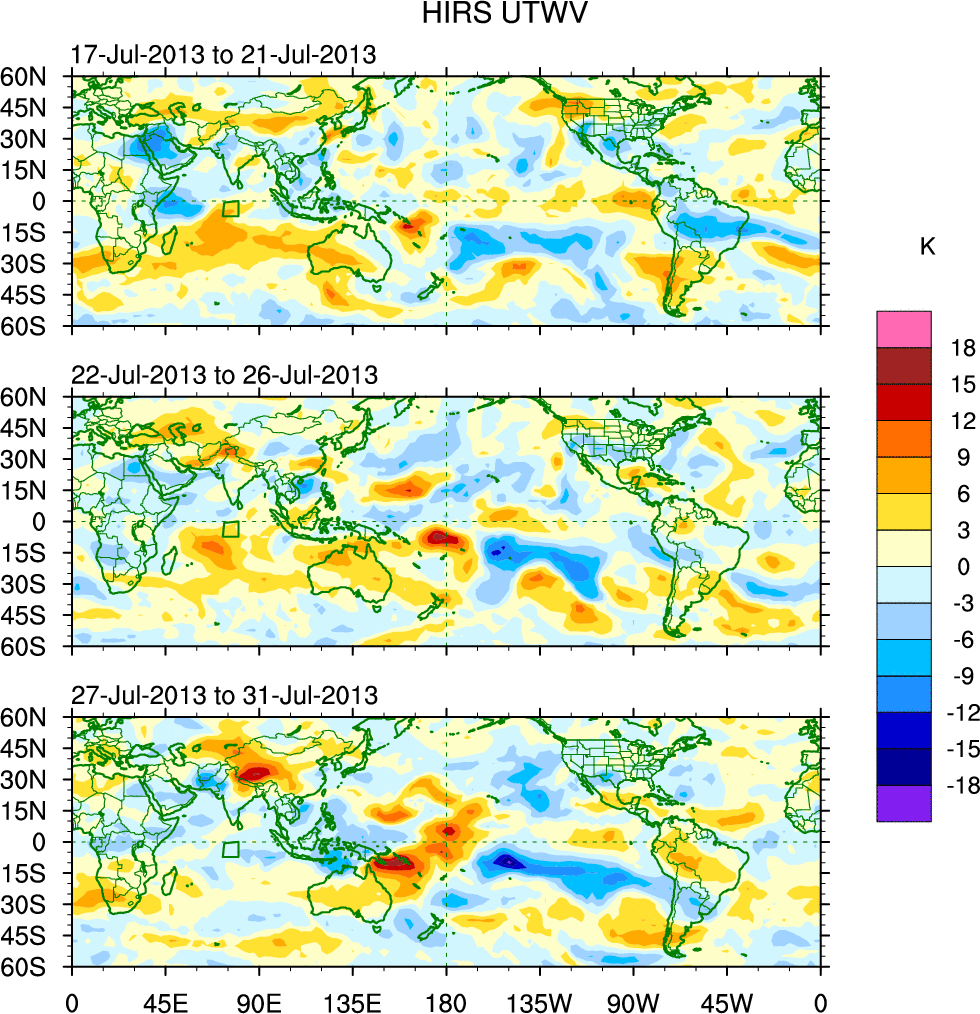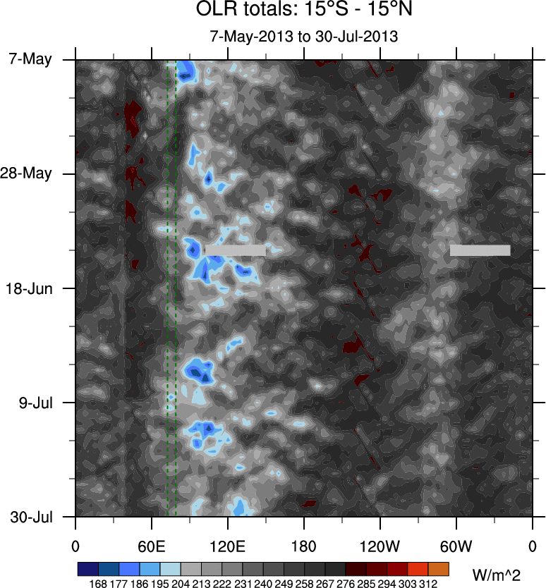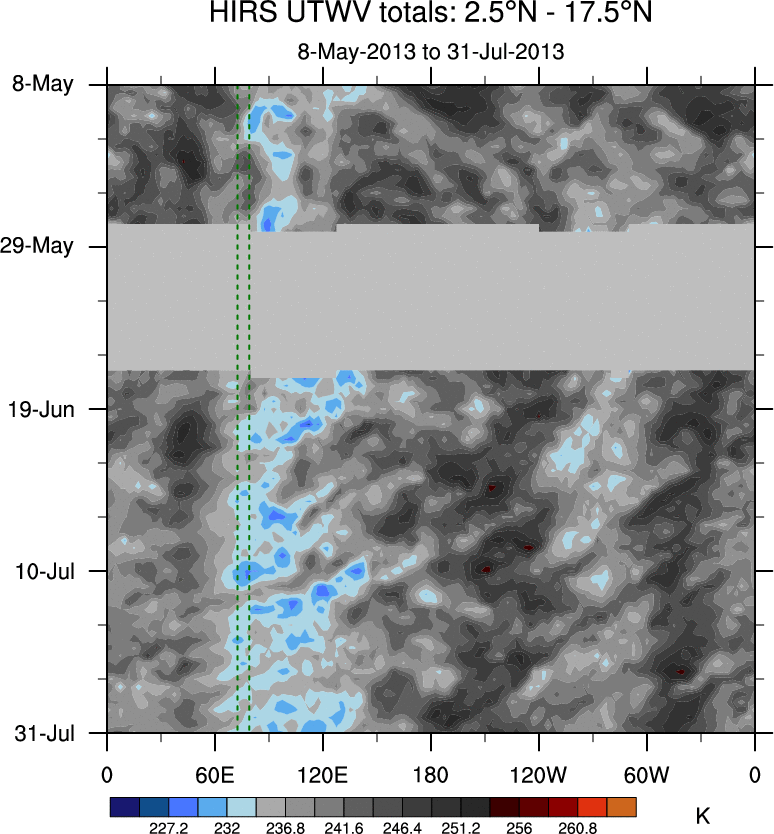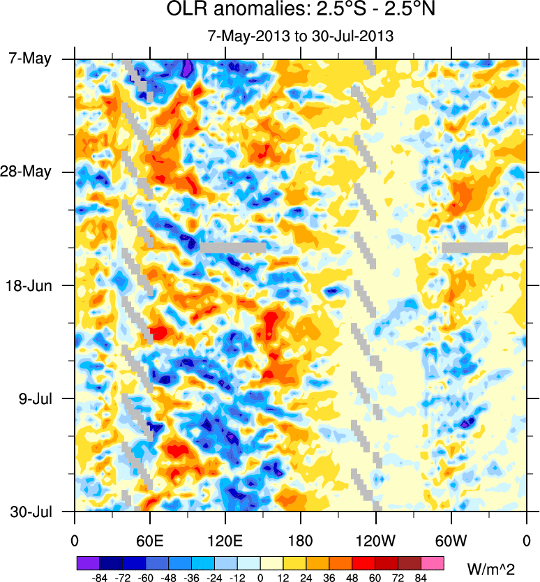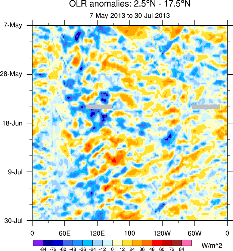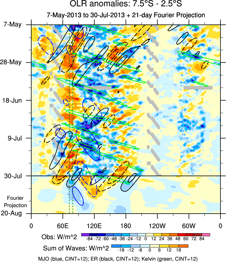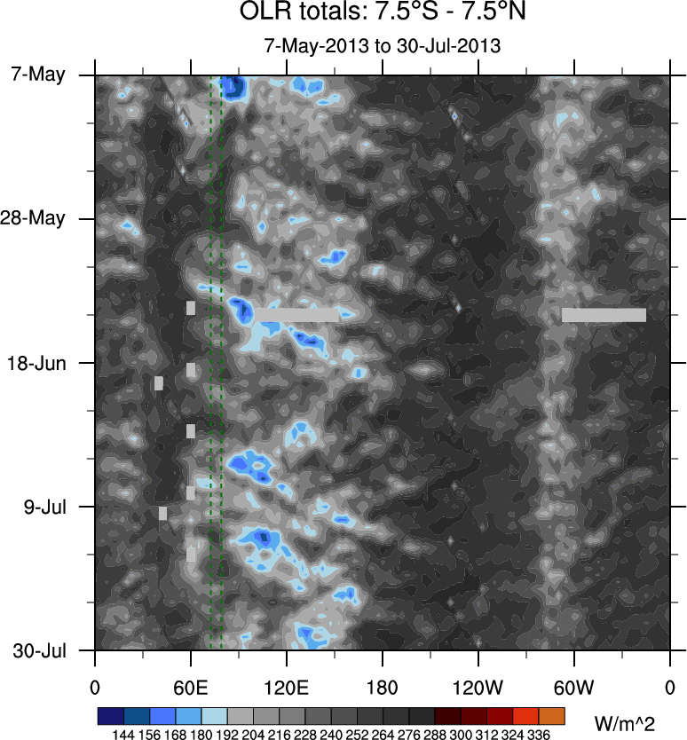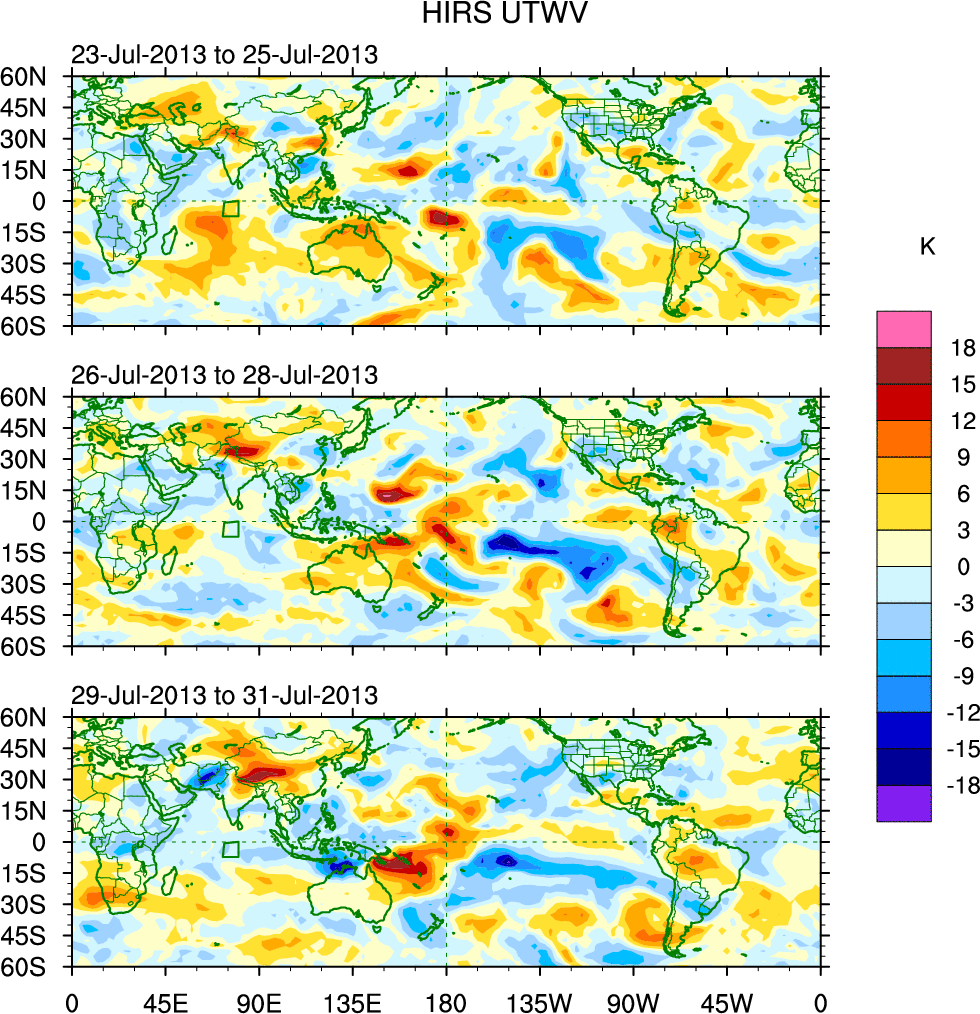 To identify tropical waves in near real-time, the OLR and UTWV data are filtered following Wheeler & Weickmann (2001 MWR). The daily anomalies are calculated using the first 3 harmonics of the seasonal cycle for 1979–2009. Missing values are then filled using linear interpolation in space and time. The most recent 365 days of anomalies are padded with 659 days of zeroes, and the result is filtered for each wave type.