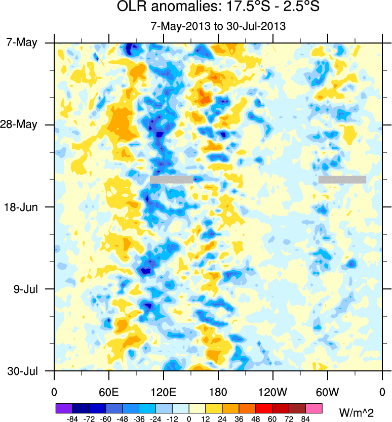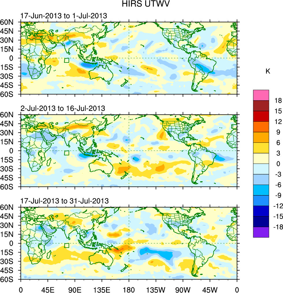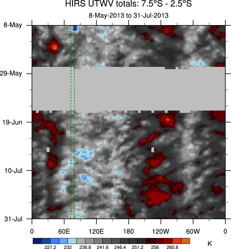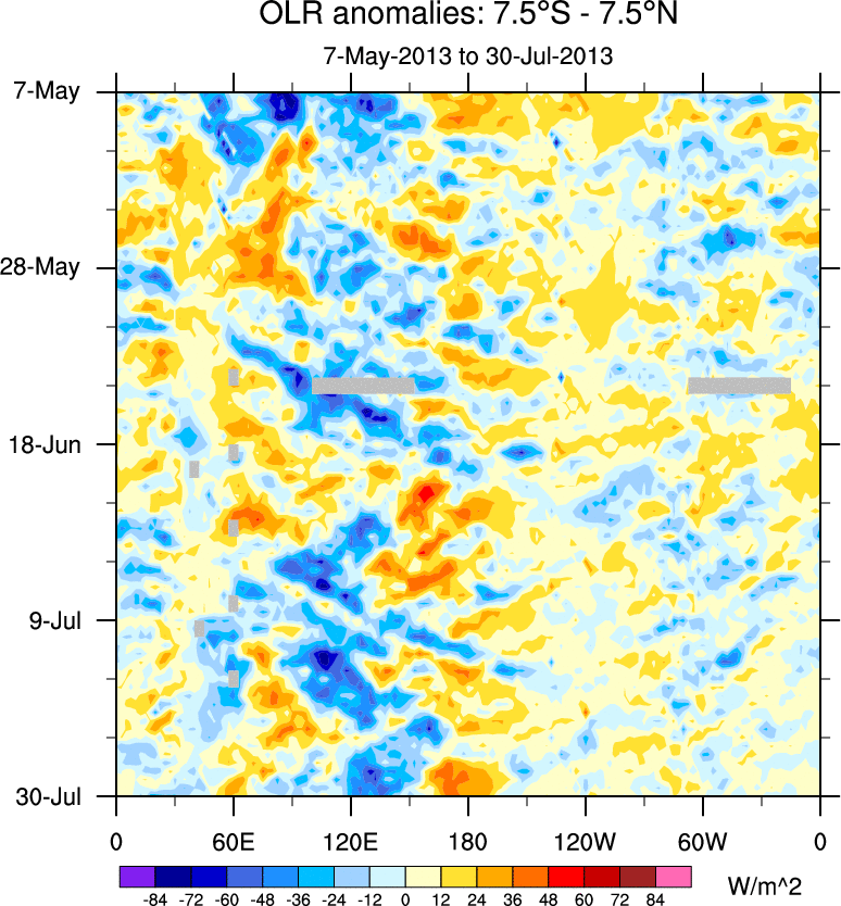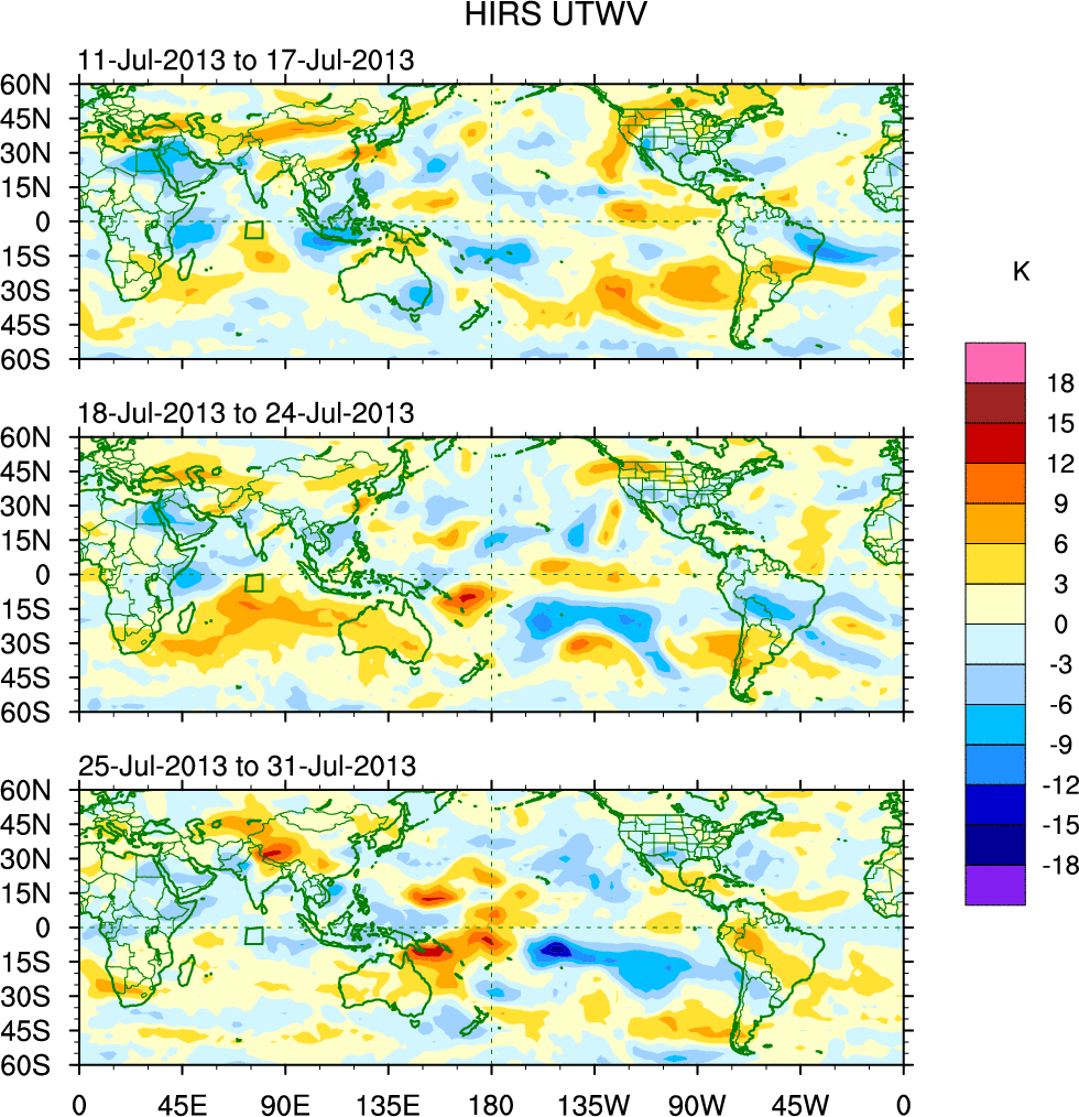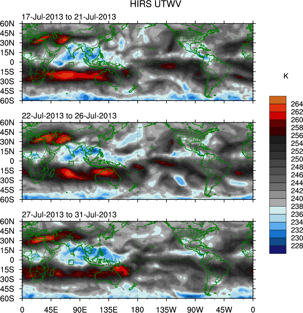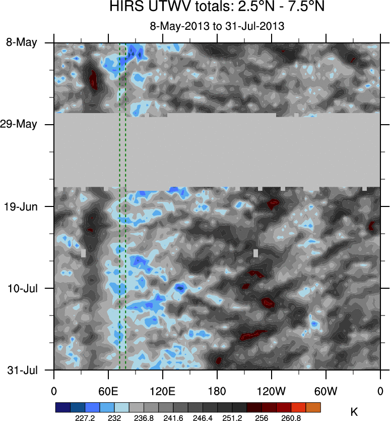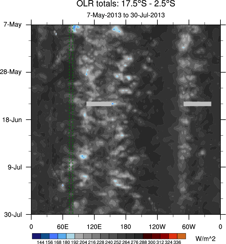 To identify tropical waves in near real-time, the OLR and UTWV data are filtered following Wheeler & Weickmann (2001 MWR). The daily anomalies are calculated using the first 3 harmonics of the seasonal cycle for 1979–2009. Missing values are then filled using linear interpolation in space and time. The most recent 365 days of anomalies are padded with 659 days of zeroes, and the result is filtered for each wave type.