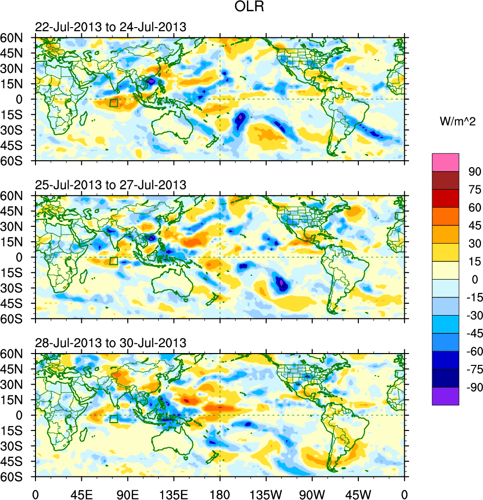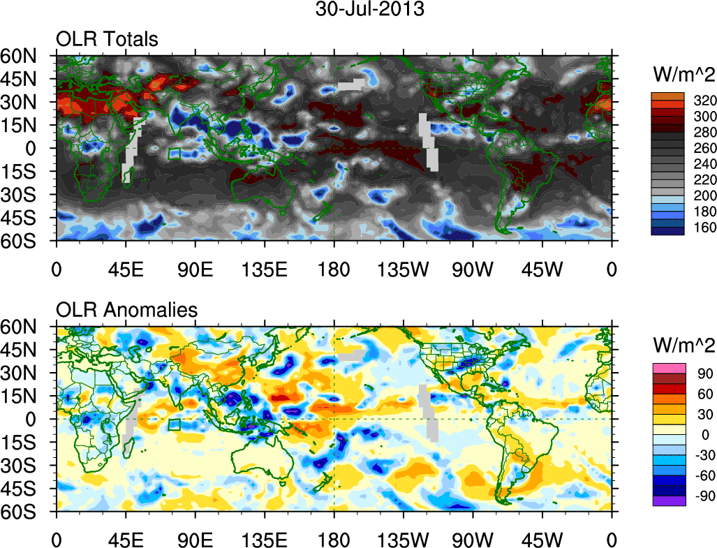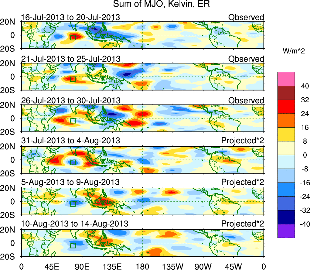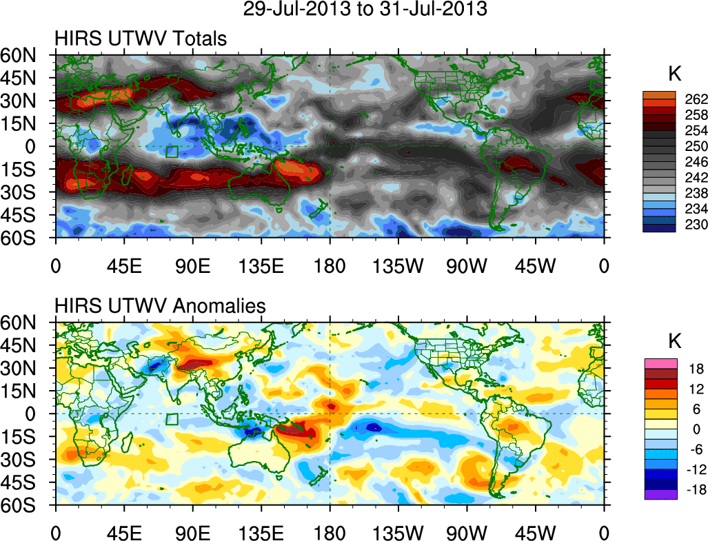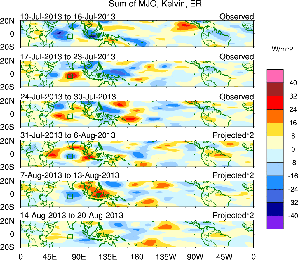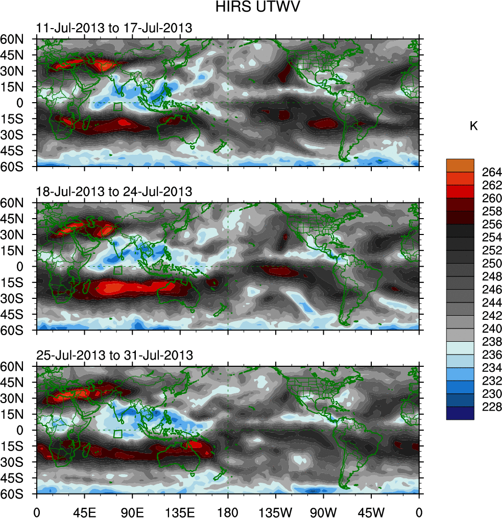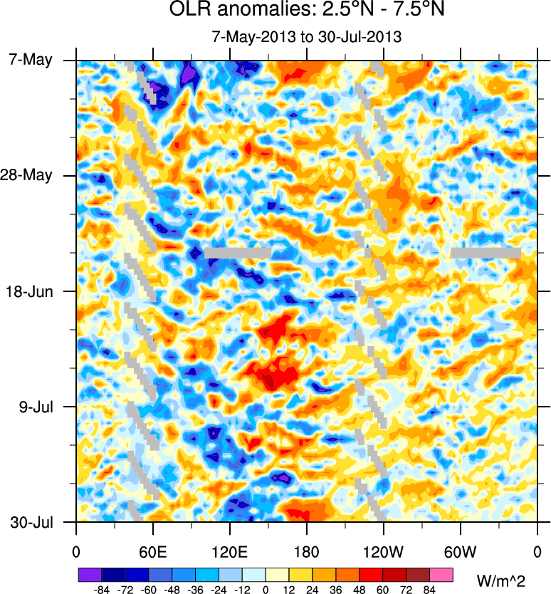 To identify tropical waves in near real-time, the OLR and UTWV data are filtered following Wheeler & Weickmann (2001 MWR). The daily anomalies are calculated using the first 3 harmonics of the seasonal cycle for 1979–2009. Missing values are then filled using linear interpolation in space and time. The most recent 365 days of anomalies are padded with 659 days of zeroes, and the result is filtered for each wave type.
