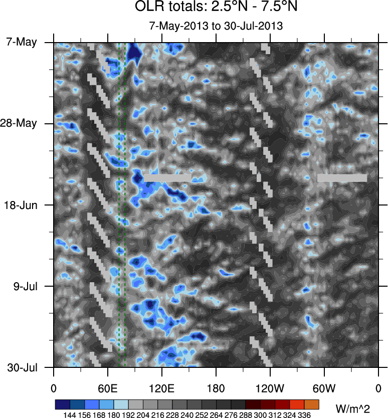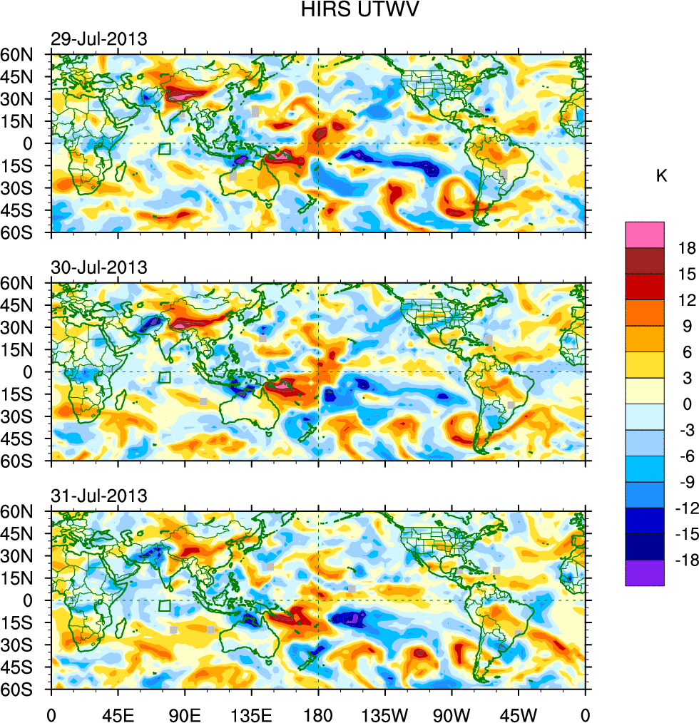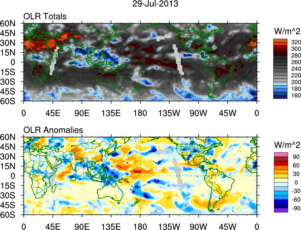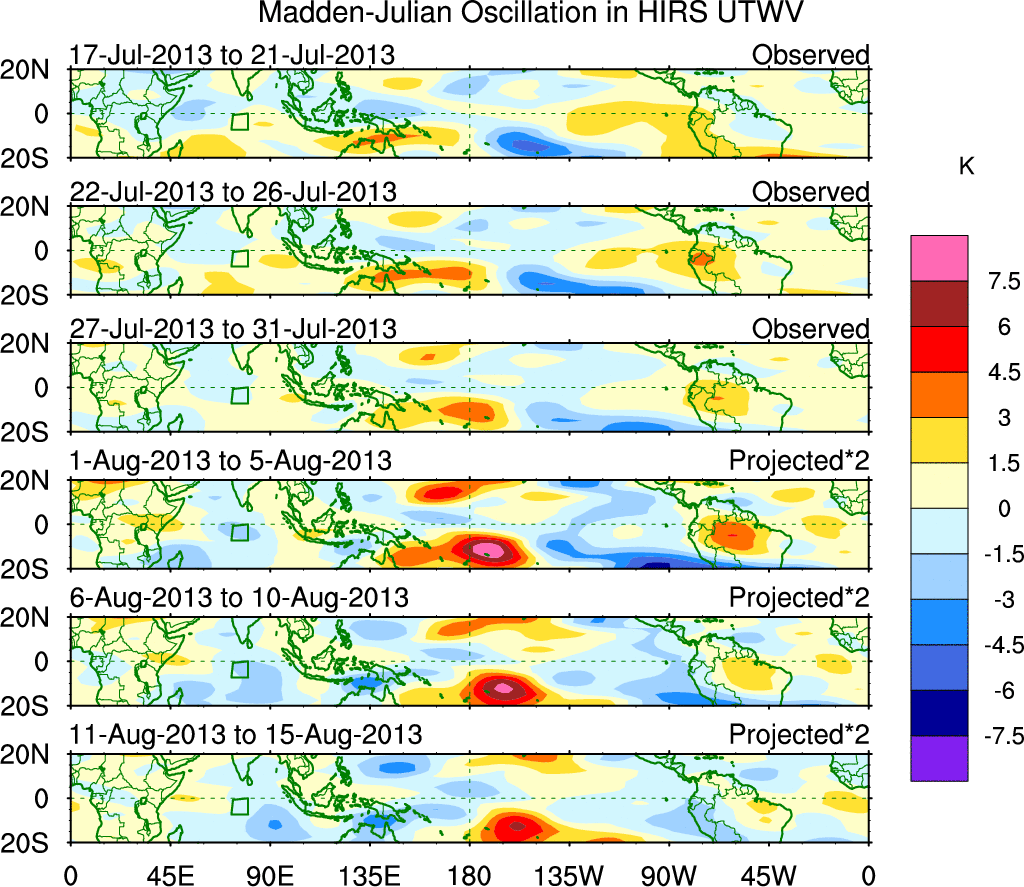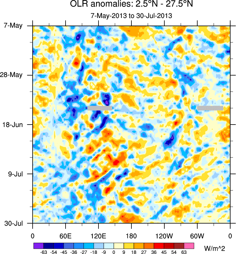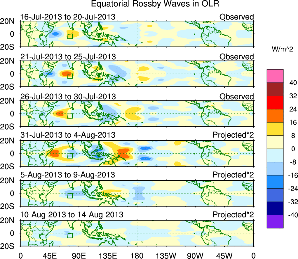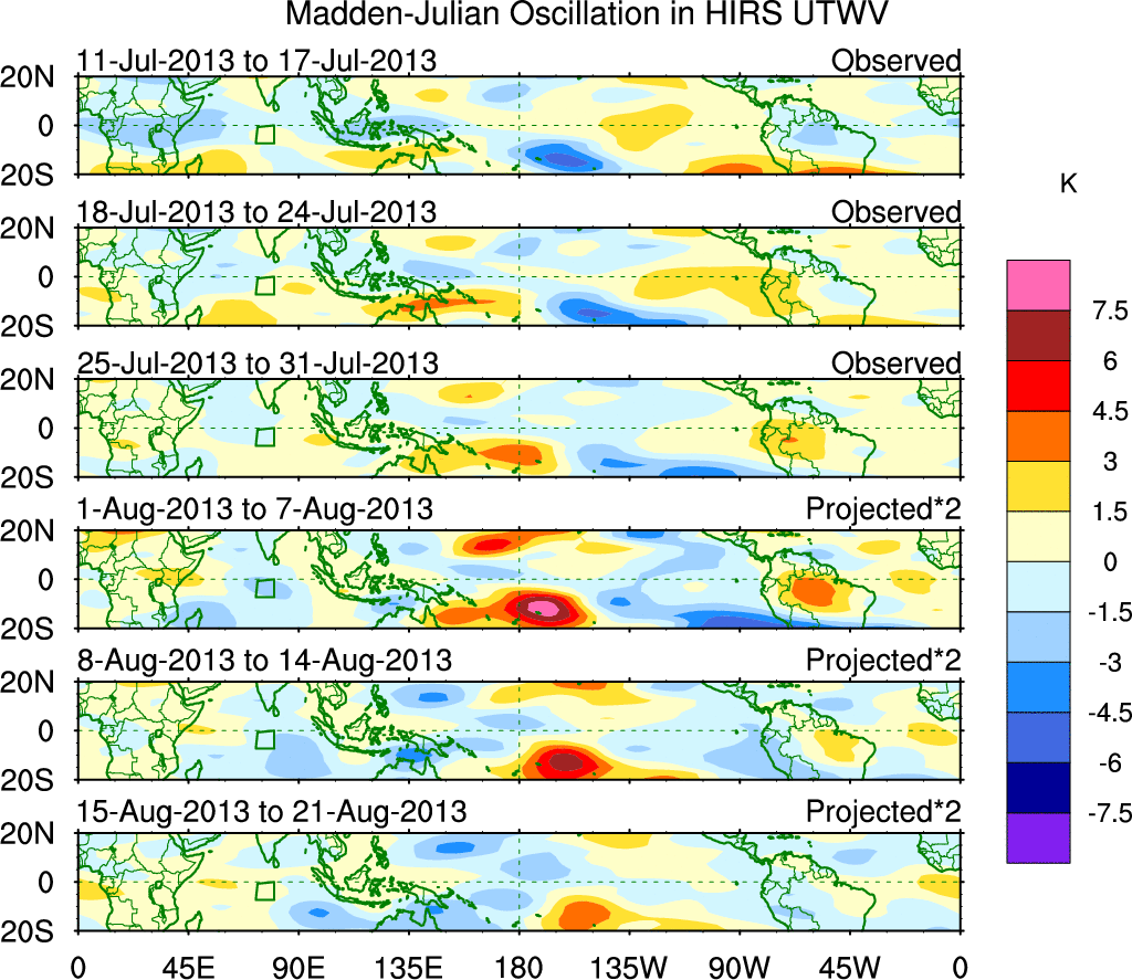 To identify tropical waves in near real-time, the OLR and UTWV data are filtered following Wheeler & Weickmann (2001 MWR). The daily anomalies are calculated using the first 3 harmonics of the seasonal cycle for 1979–2009. Missing values are then filled using linear interpolation in space and time. The most recent 365 days of anomalies are padded with 659 days of zeroes, and the result is filtered for each wave type.