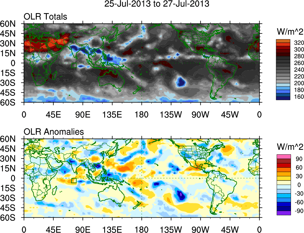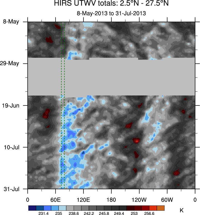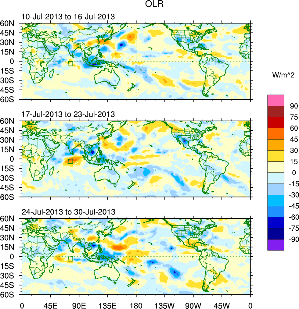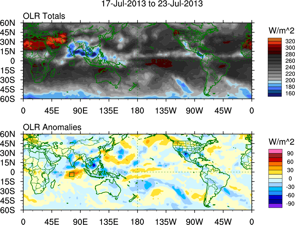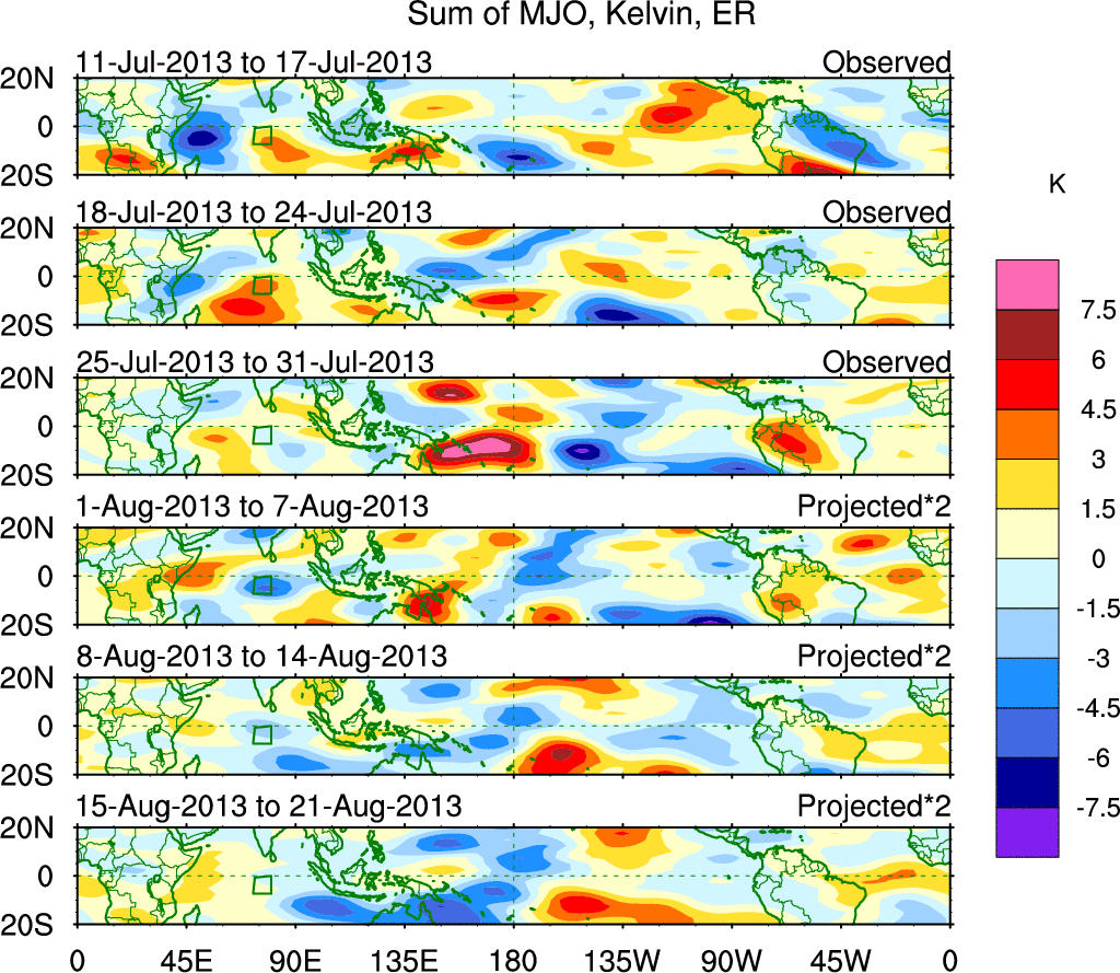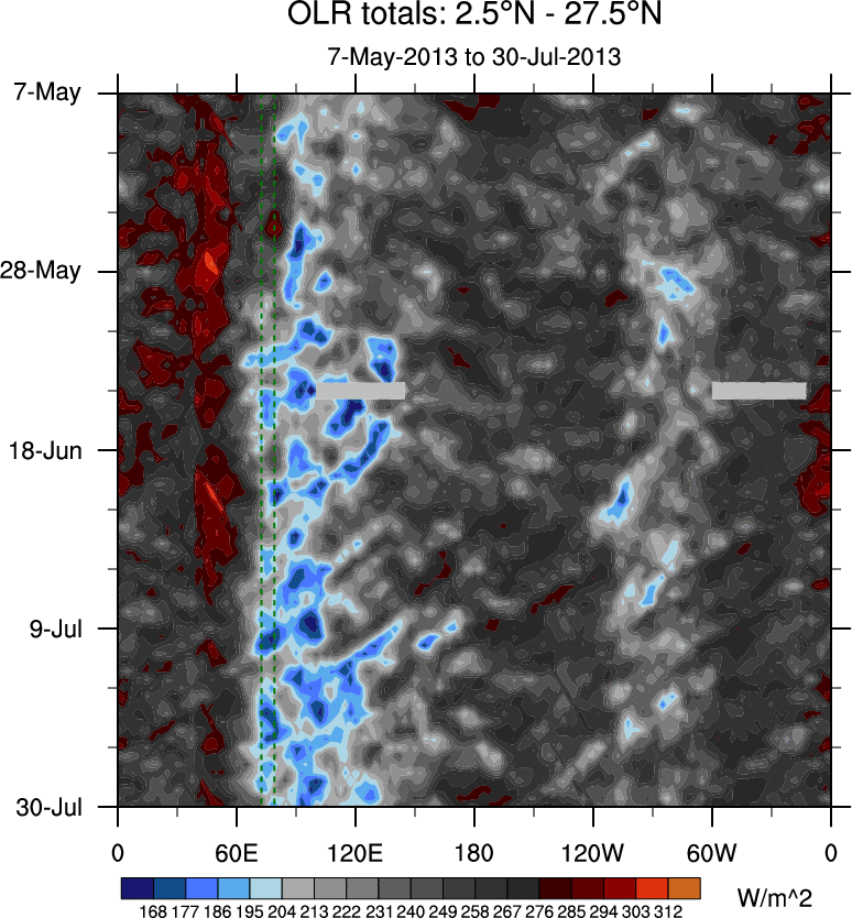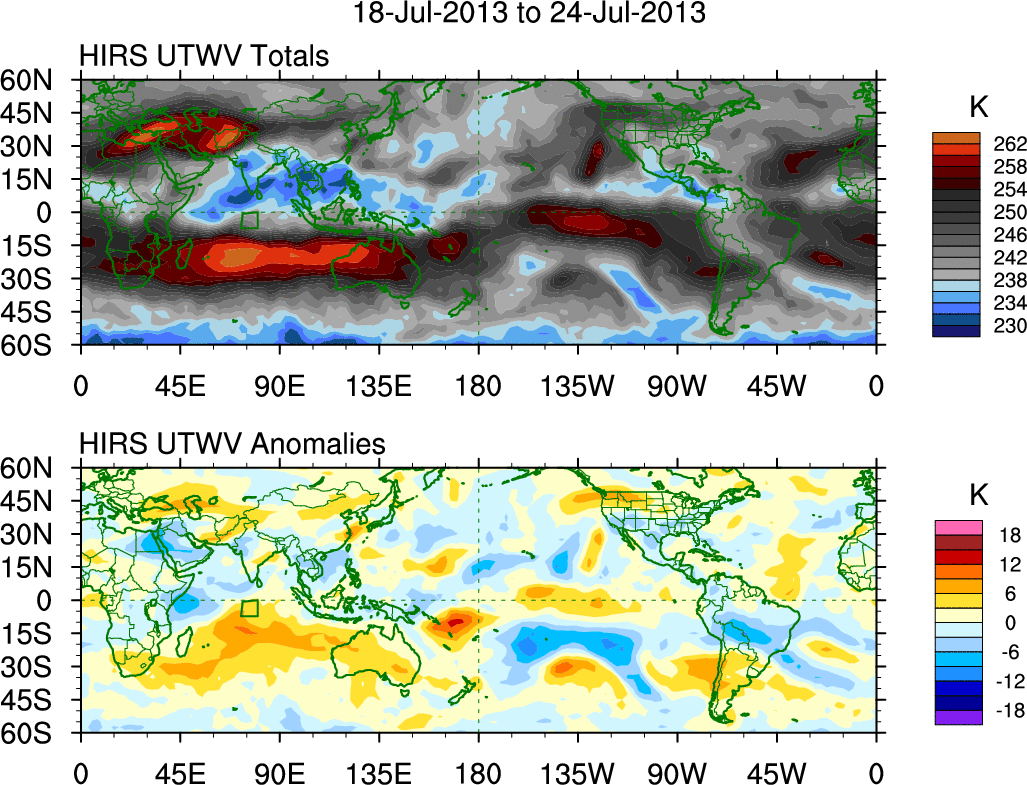 To identify tropical waves in near real-time, the OLR and UTWV data are filtered following Wheeler & Weickmann (2001 MWR). The daily anomalies are calculated using the first 3 harmonics of the seasonal cycle for 1979–2009. Missing values are then filled using linear interpolation in space and time. The most recent 365 days of anomalies are padded with 659 days of zeroes, and the result is filtered for each wave type.