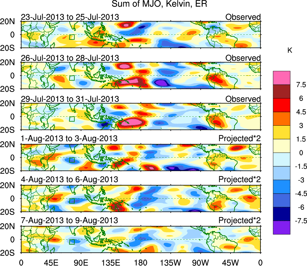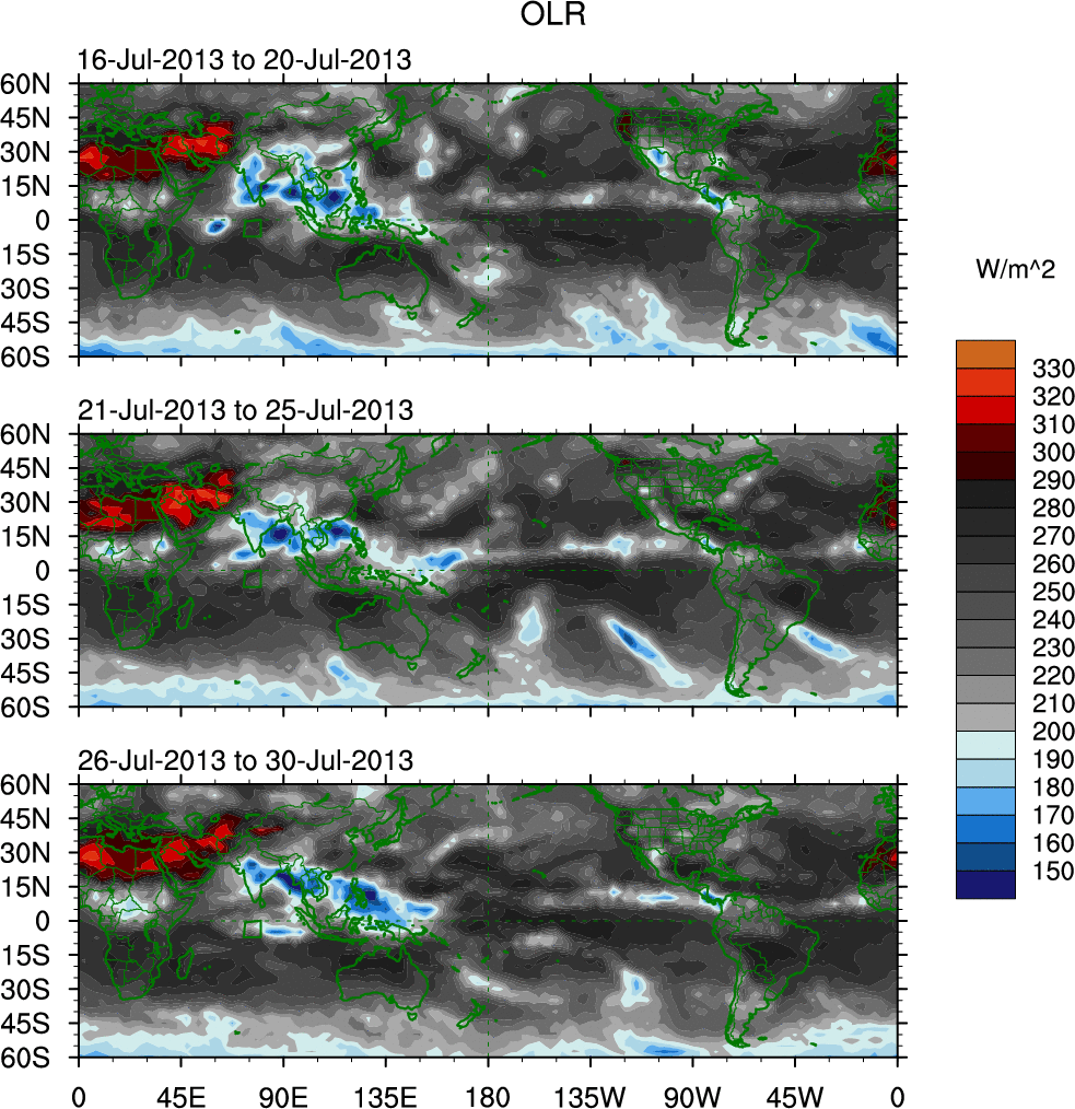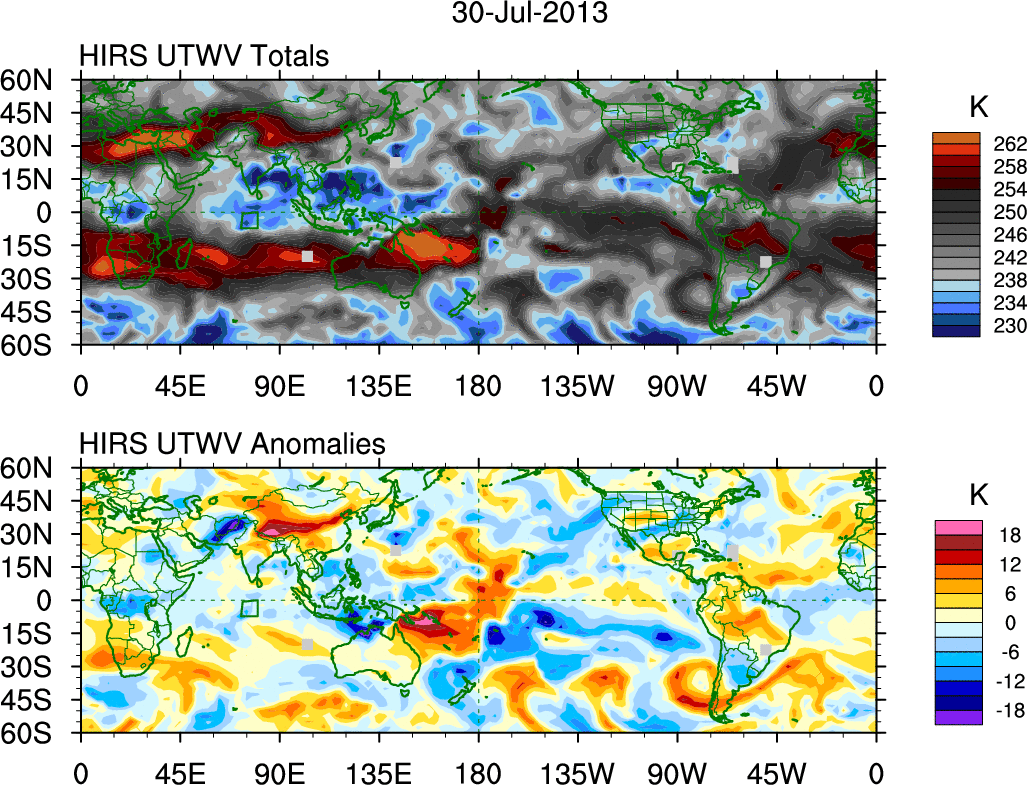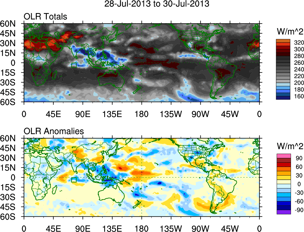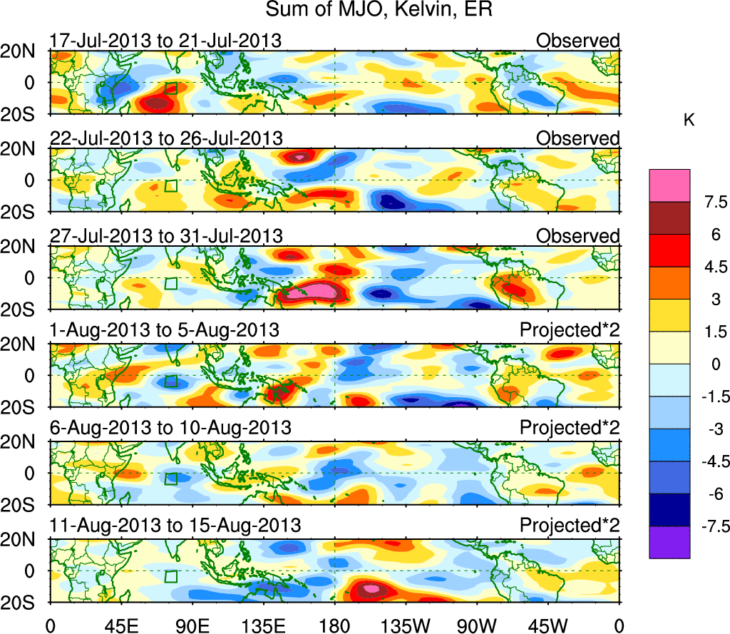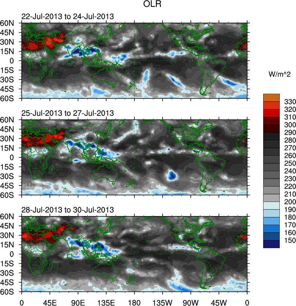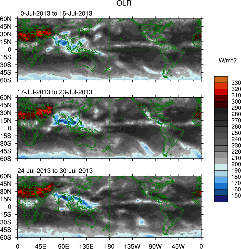 To identify tropical waves in near real-time, the OLR and UTWV data are filtered following Wheeler & Weickmann (2001 MWR). The daily anomalies are calculated using the first 3 harmonics of the seasonal cycle for 1979–2009. Missing values are then filled using linear interpolation in space and time. The most recent 365 days of anomalies are padded with 659 days of zeroes, and the result is filtered for each wave type.
