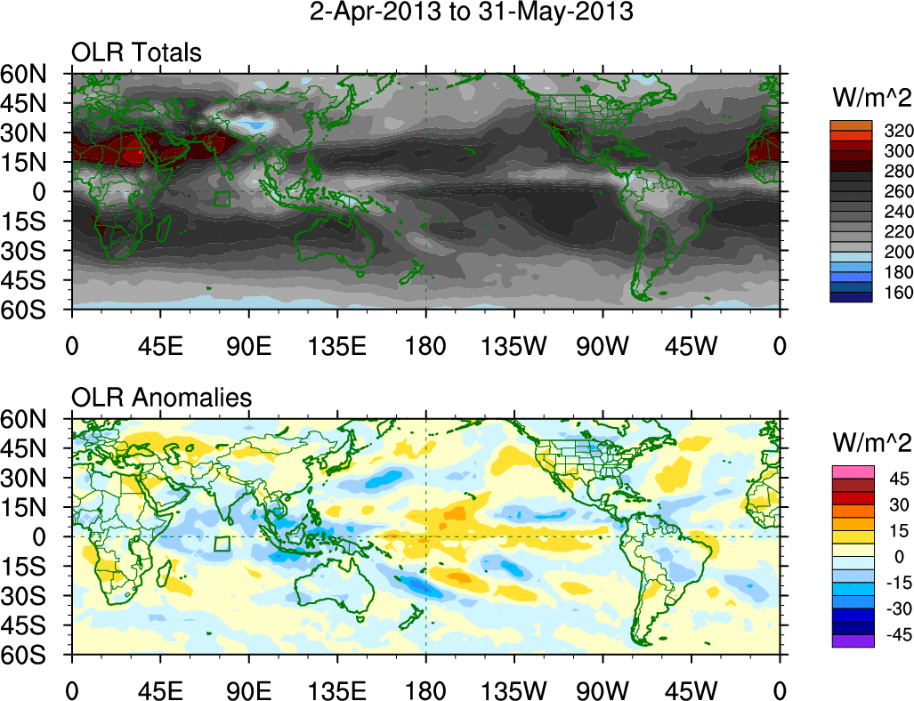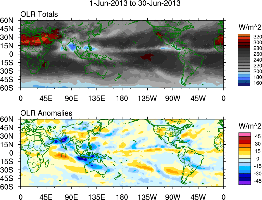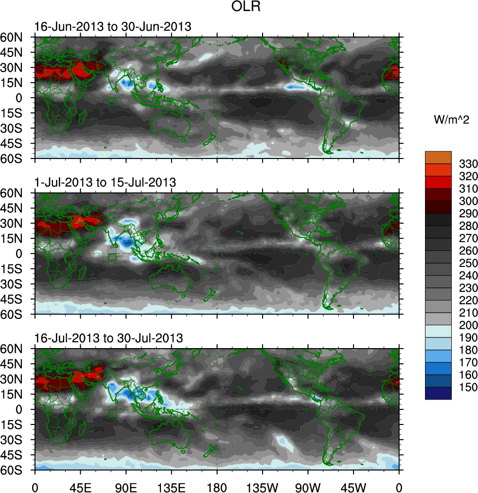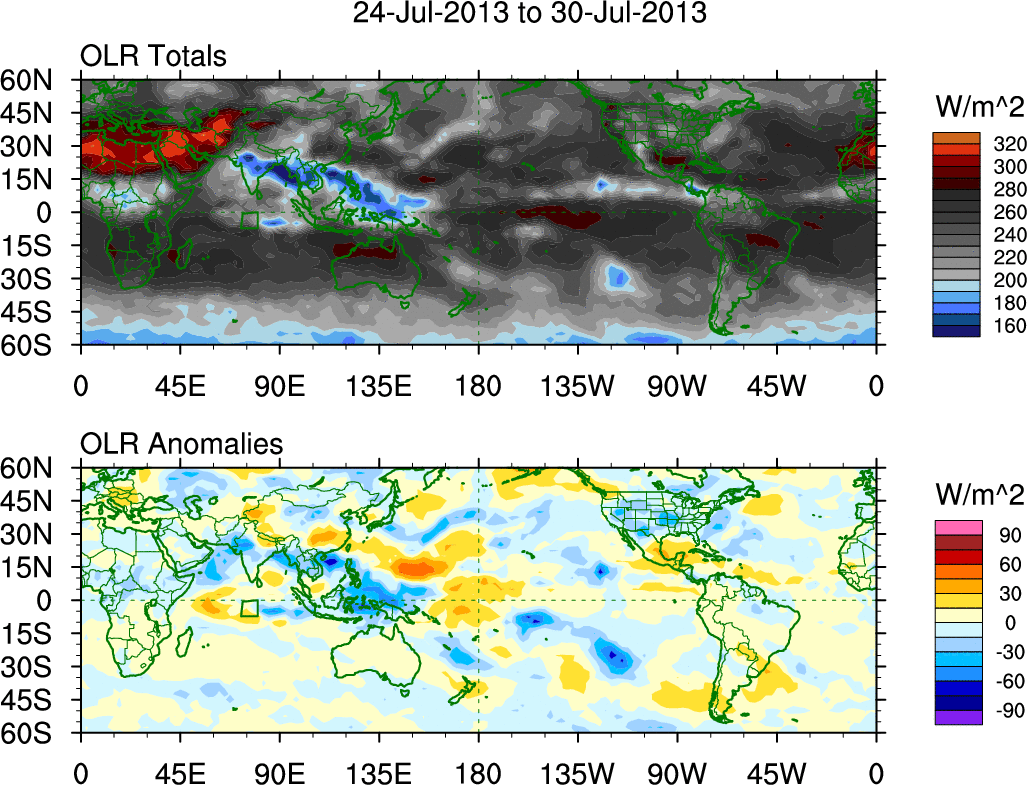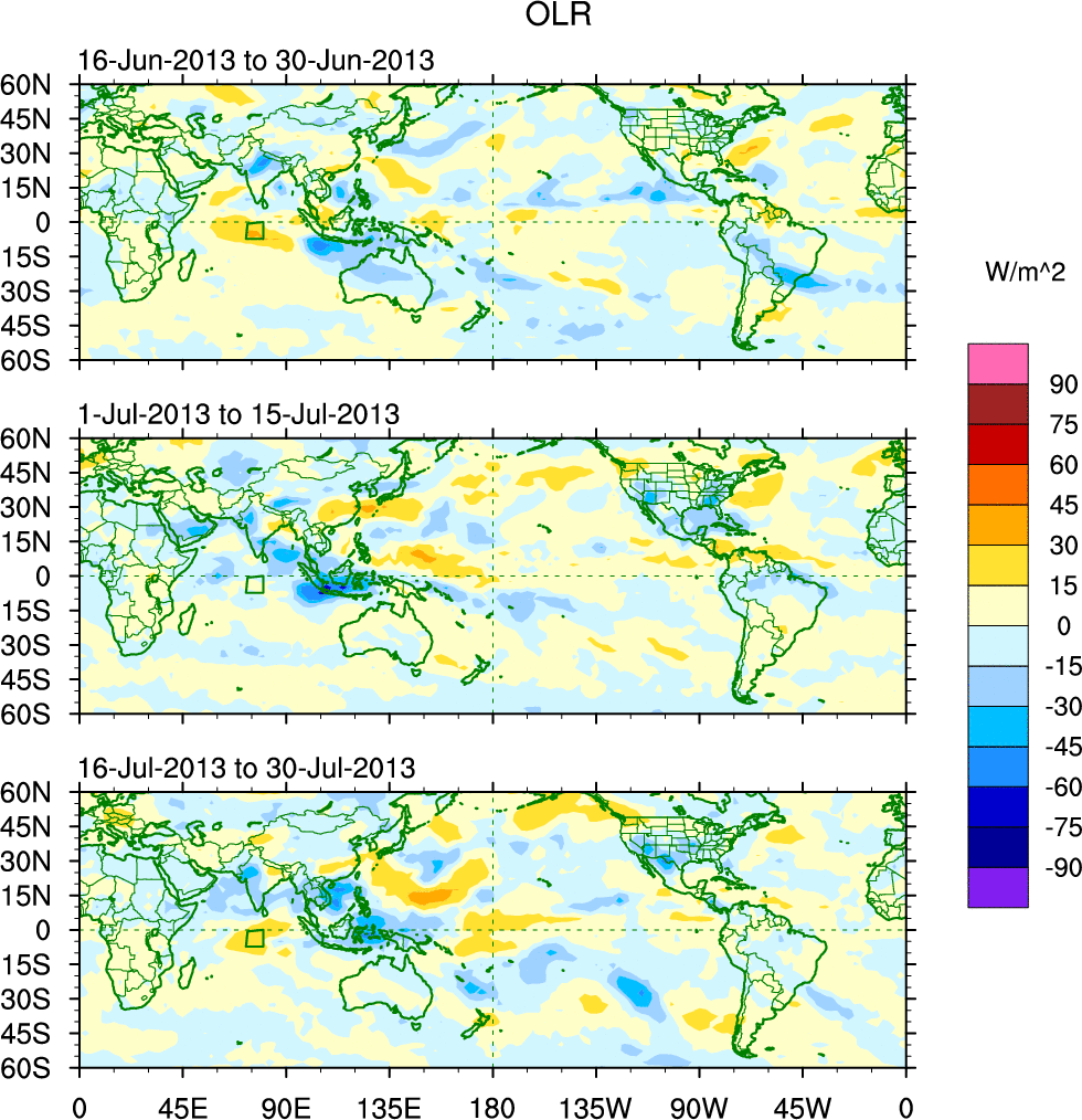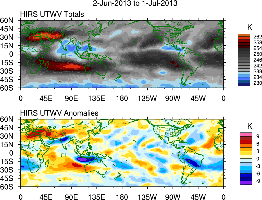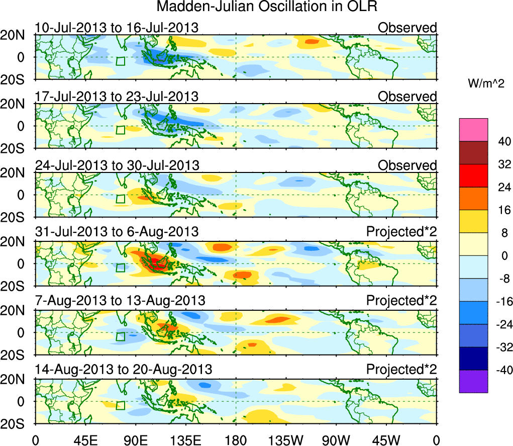 To identify tropical waves in near real-time, the OLR and UTWV data are filtered following Wheeler & Weickmann (2001 MWR). The daily anomalies are calculated using the first 3 harmonics of the seasonal cycle for 1979–2009. Missing values are then filled using linear interpolation in space and time. The most recent 365 days of anomalies are padded with 659 days of zeroes, and the result is filtered for each wave type.