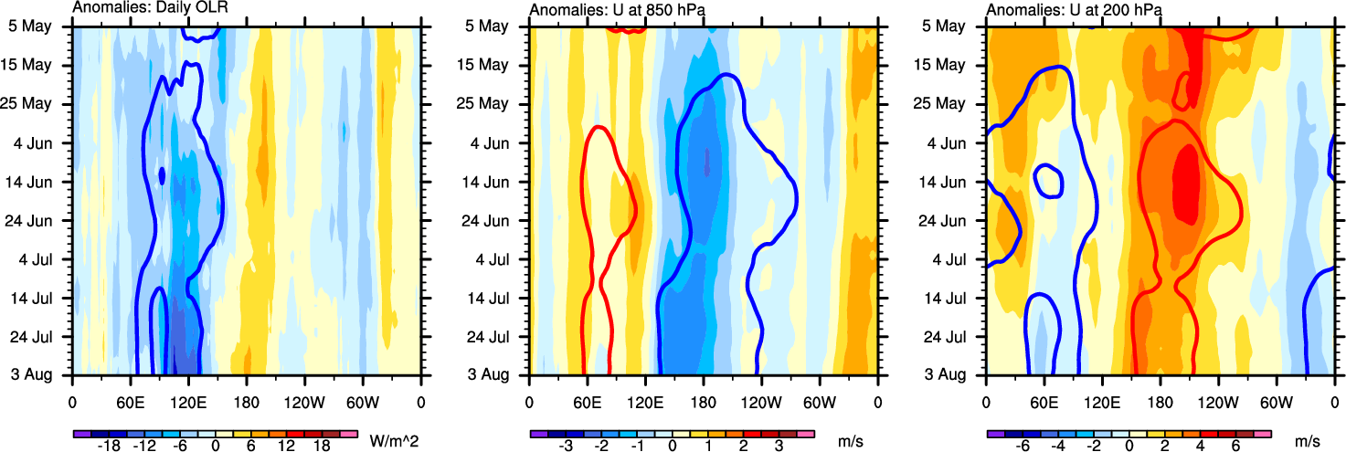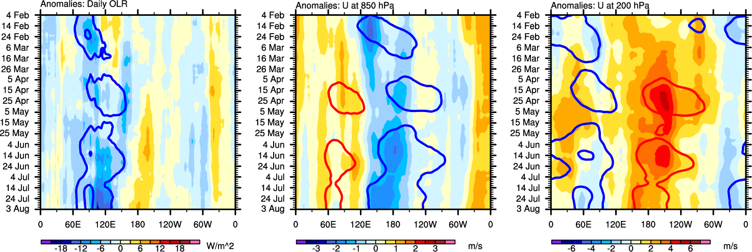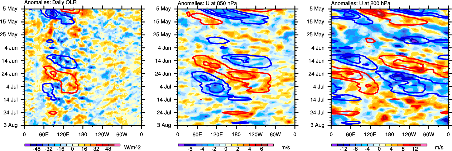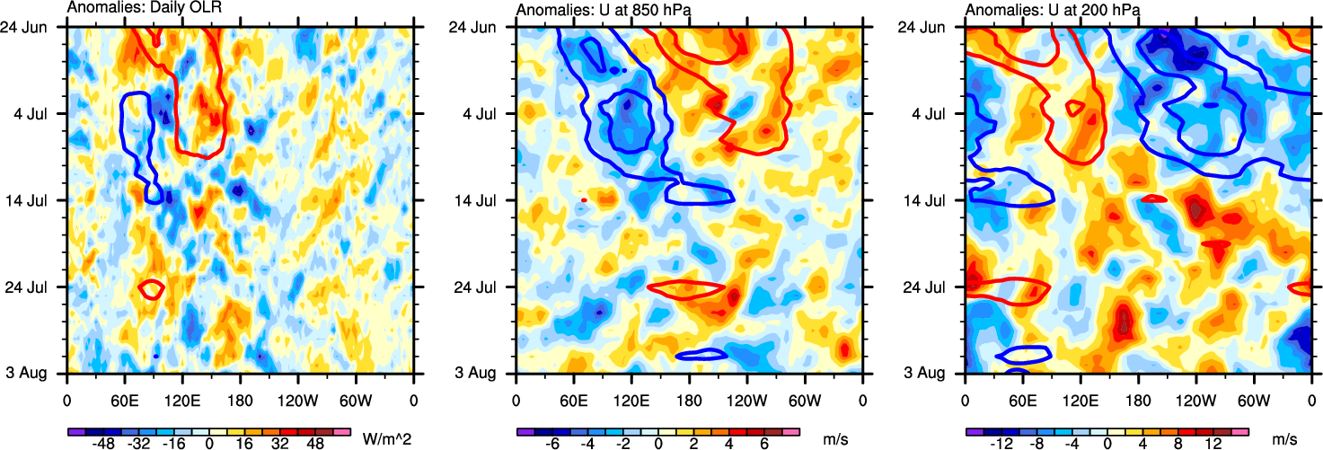 The Hovmollers show longitude-time plots for OLR, U-850, and U-200. The shading indicates the observed anomalies, while the contours are the projection of those anomalies onto the RMM EOFs.