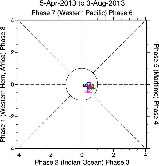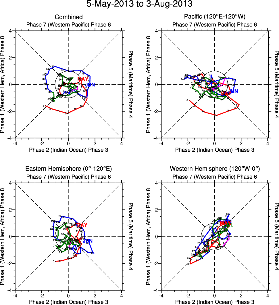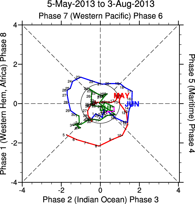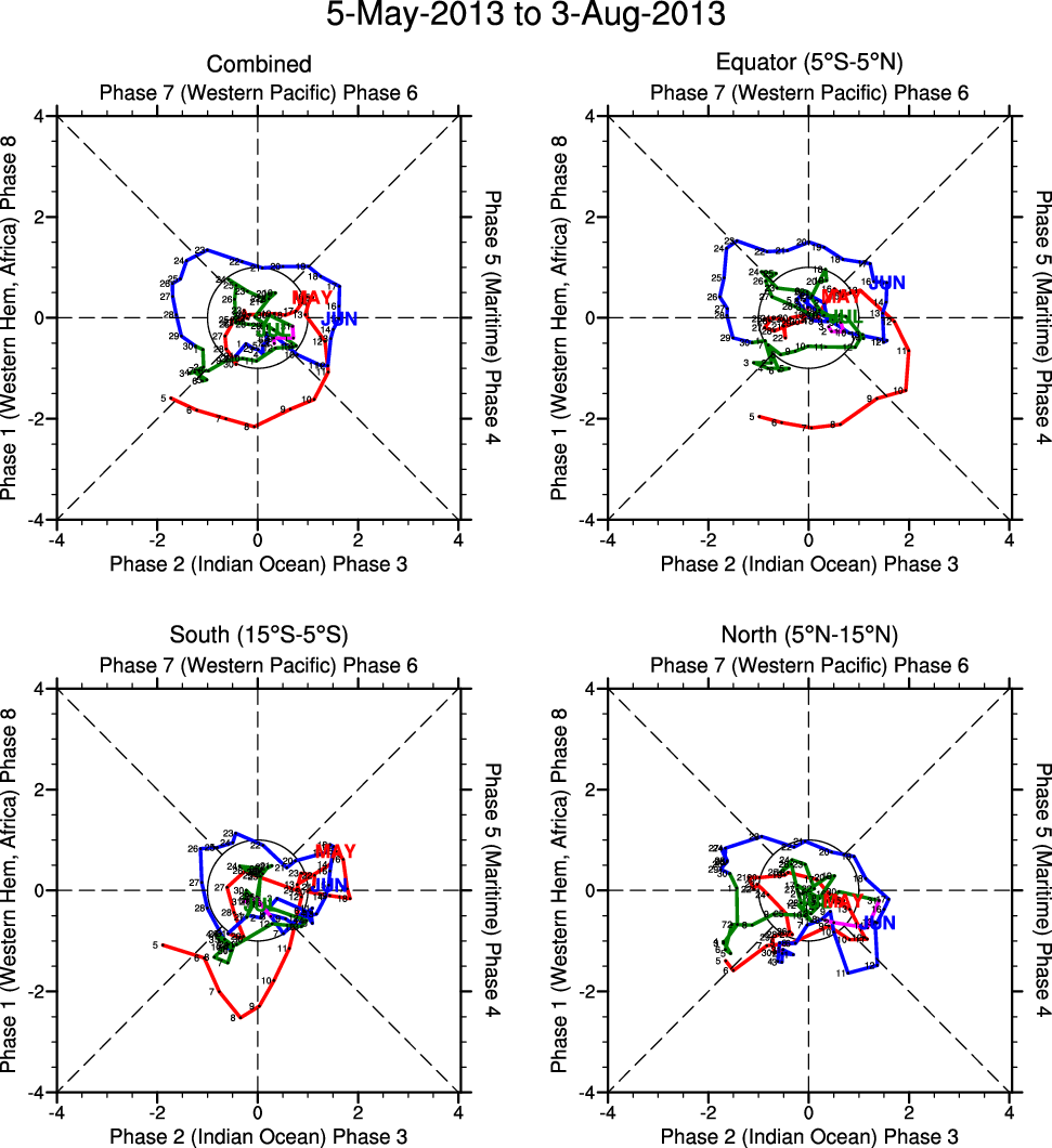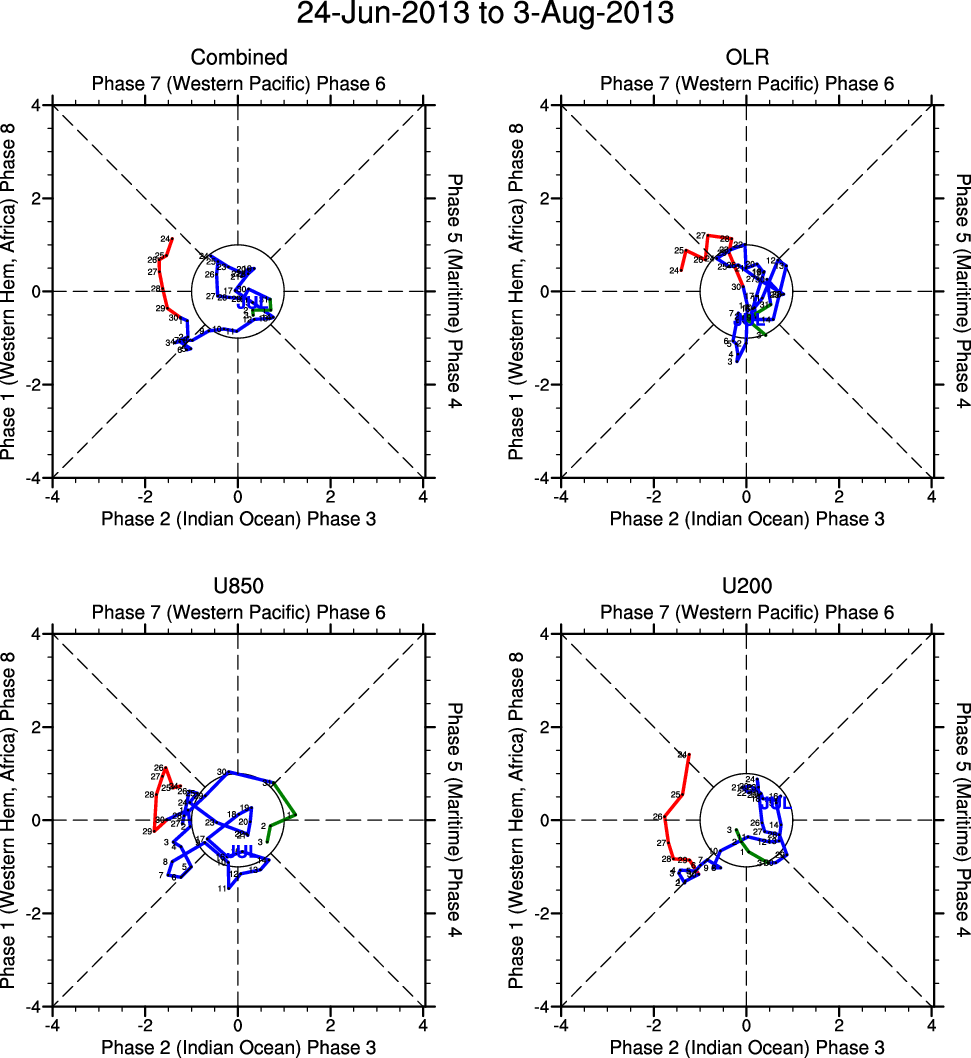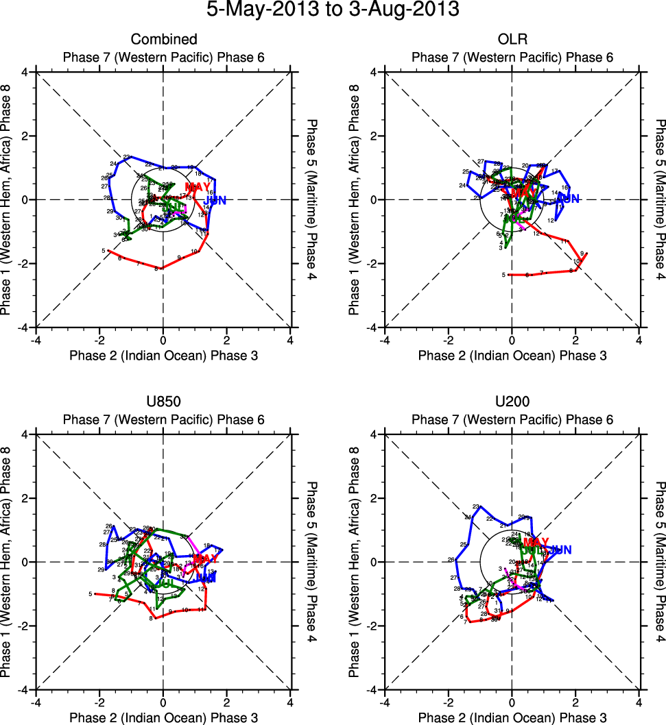 Wheeler and Hendon (2004) constructed the RMM index for monitoring the MJO. This index consists of the first two principal components (PCs) of OLR, 850-hPa zonal wind, and 200-hPa zonal wind averaged 15S-15N.