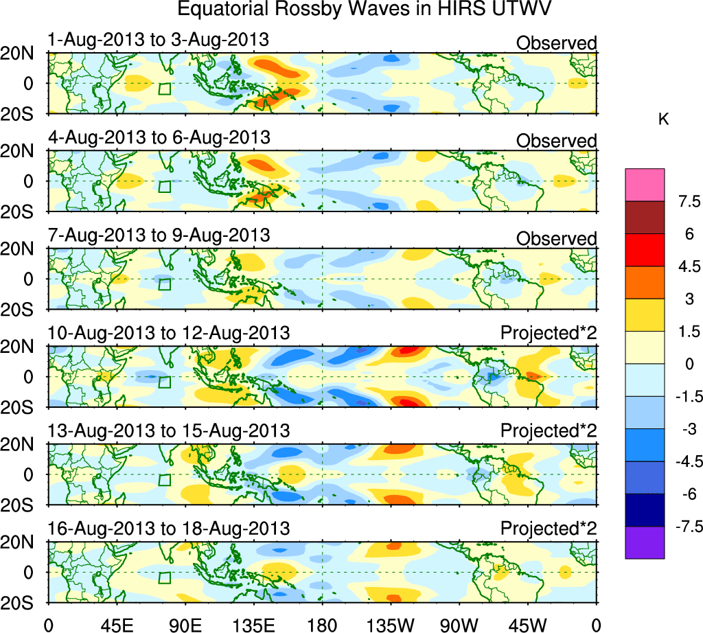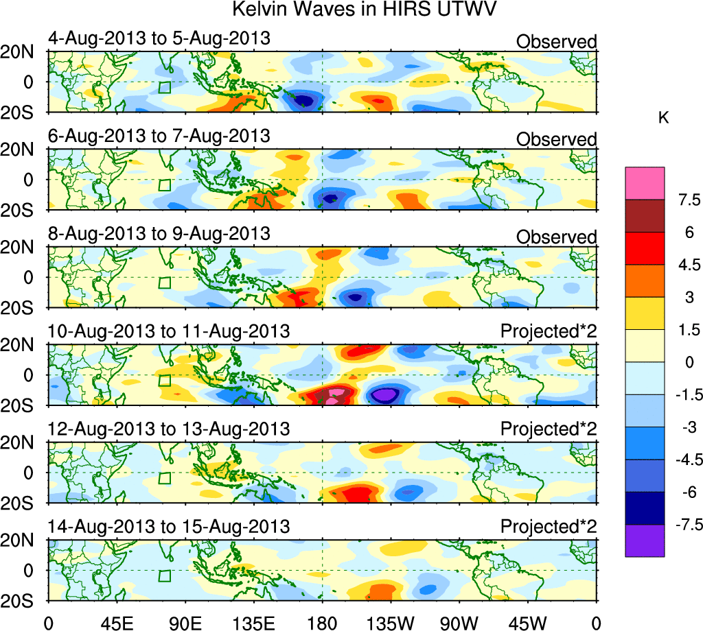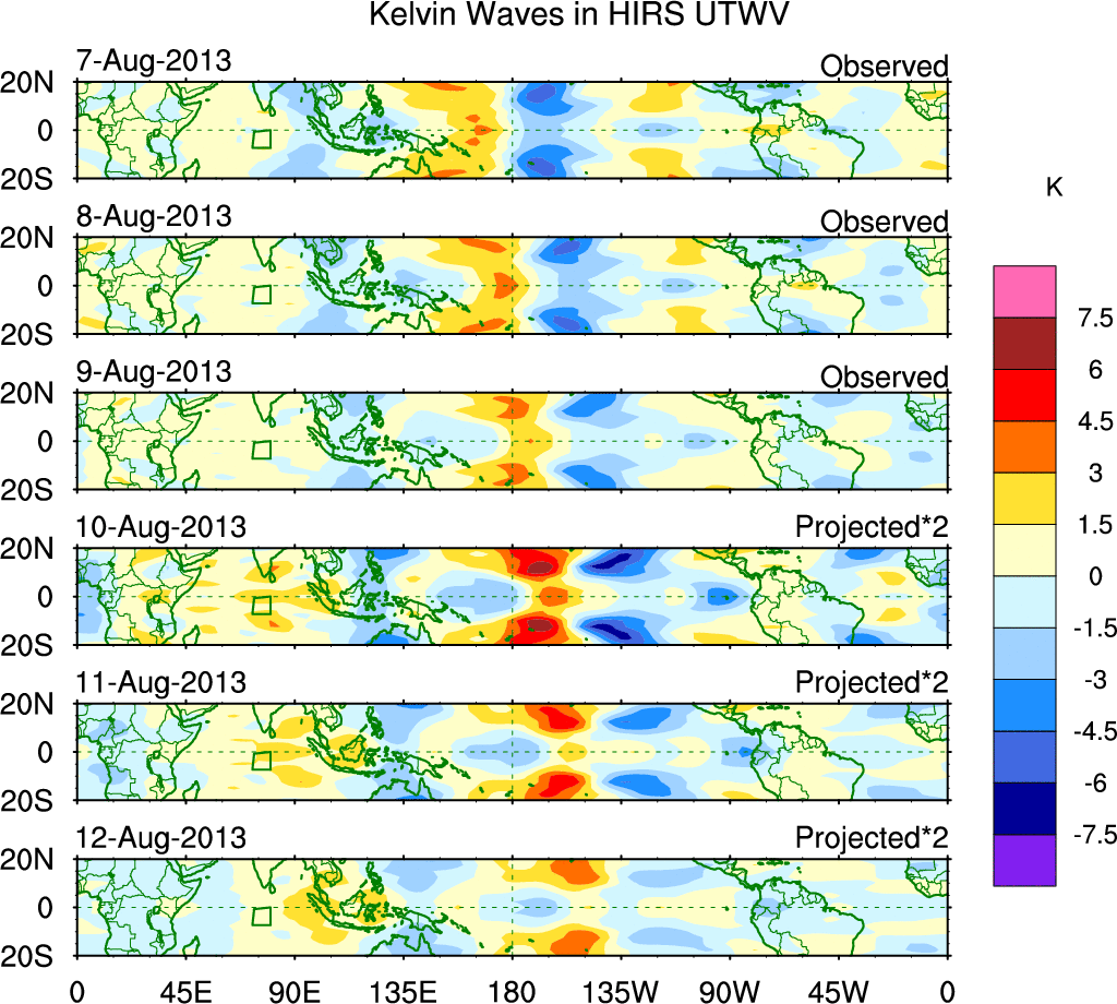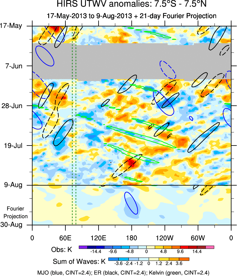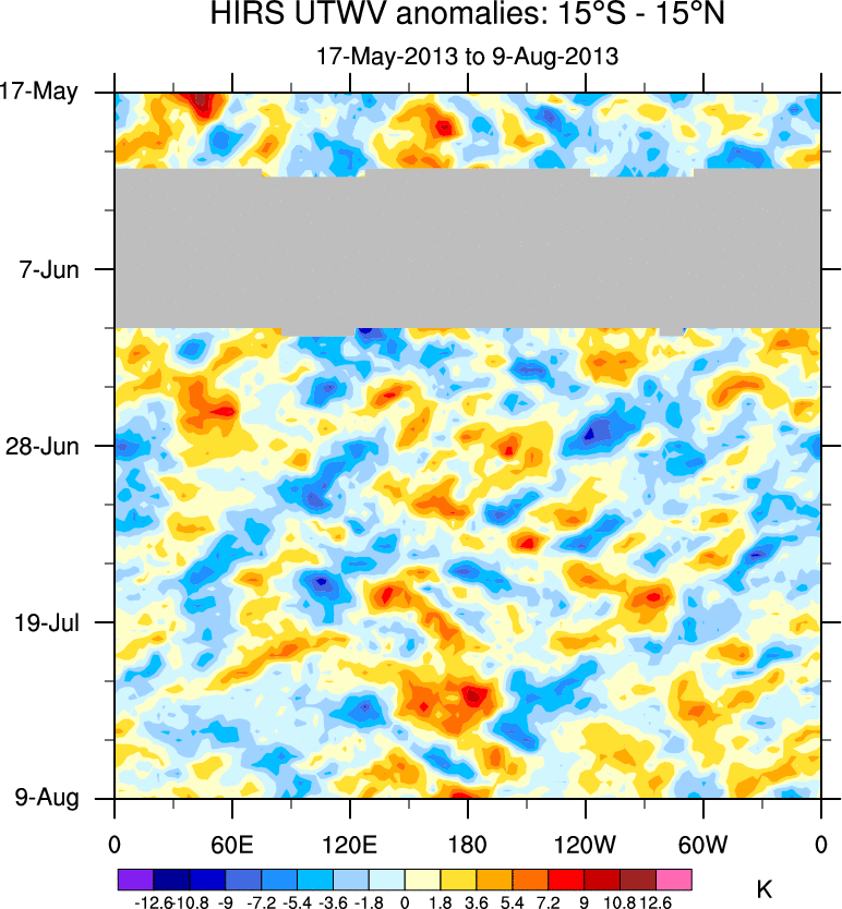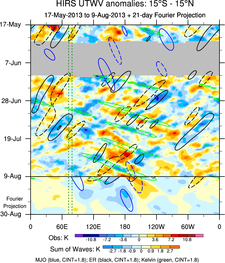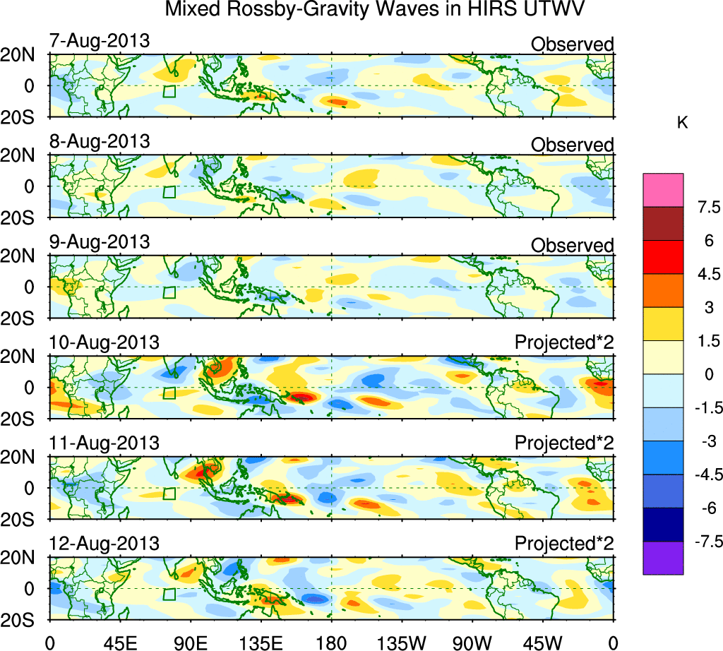 To identify tropical waves in near real-time, the OLR and UTWV data are filtered following Wheeler & Weickmann (2001 MWR). The daily anomalies are calculated using the first 3 harmonics of the seasonal cycle for 1979–2009. Missing values are then filled using linear interpolation in space and time. The most recent 365 days of anomalies are padded with 659 days of zeroes, and the result is filtered for each wave type.