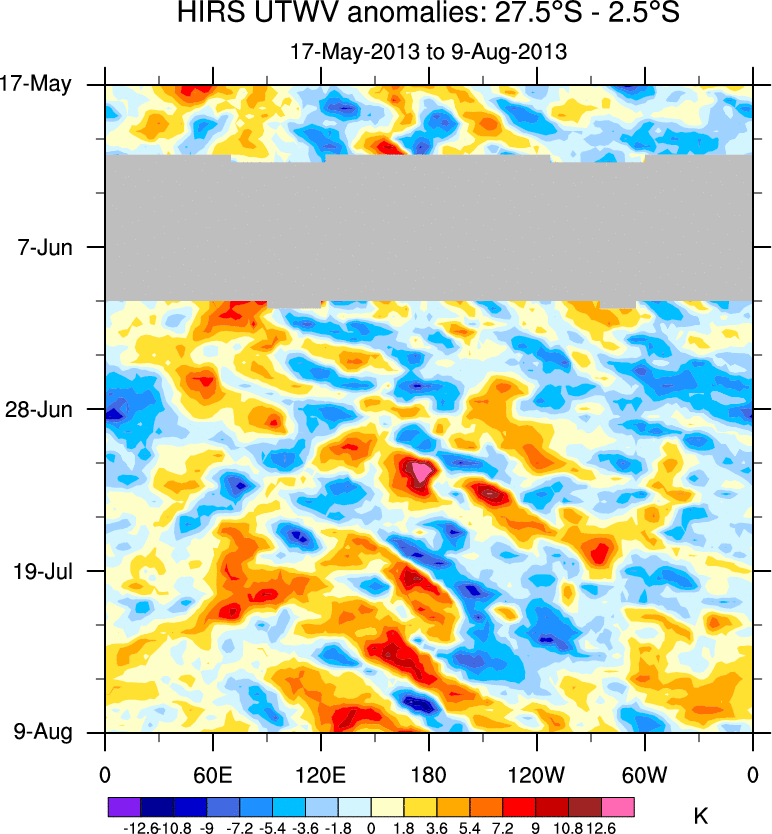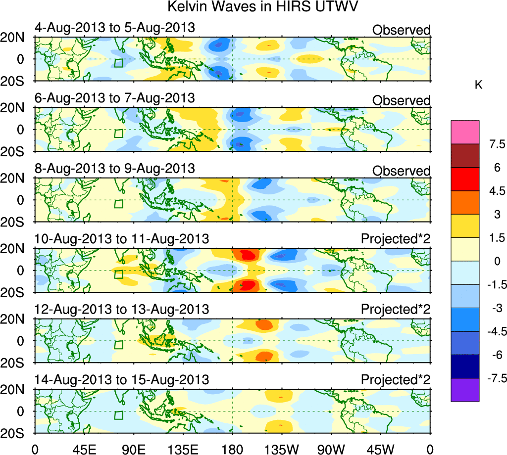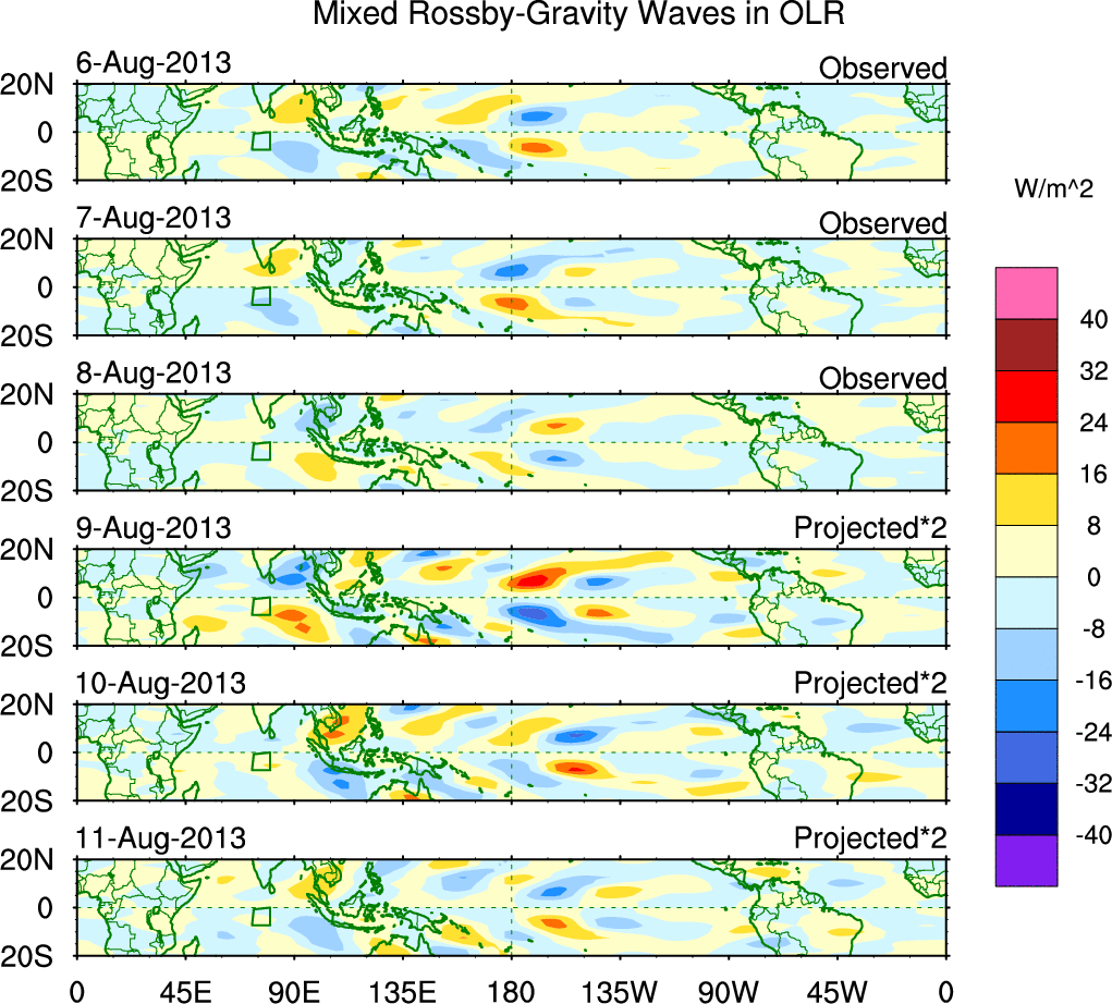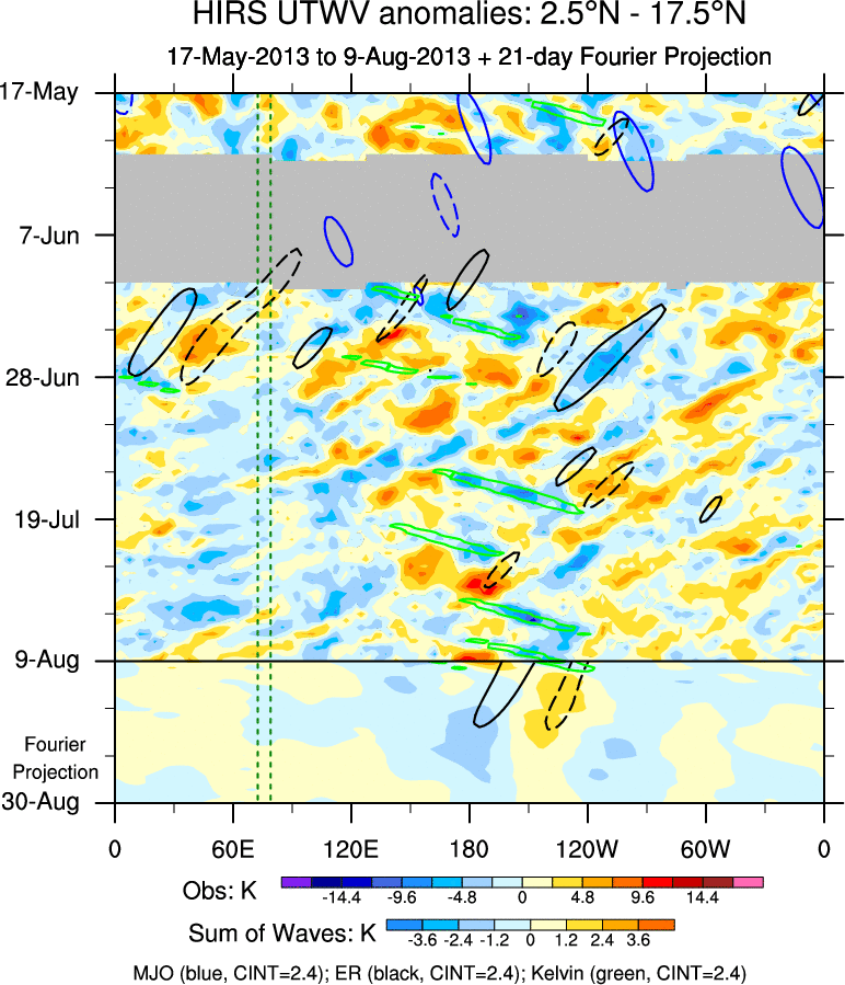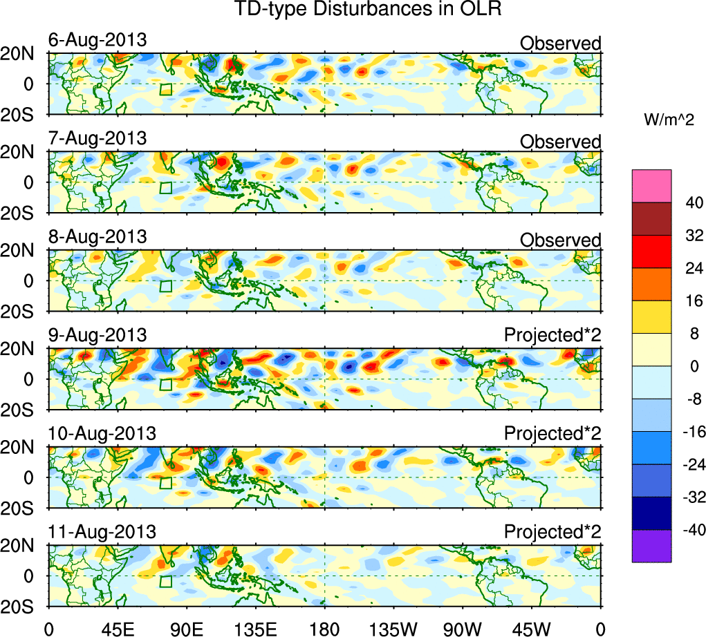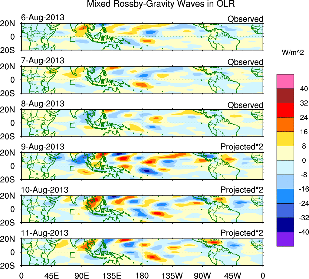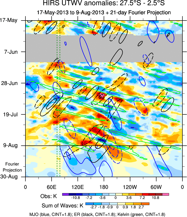 To identify tropical waves in near real-time, the OLR and UTWV data are filtered following Wheeler & Weickmann (2001 MWR). The daily anomalies are calculated using the first 3 harmonics of the seasonal cycle for 1979–2009. Missing values are then filled using linear interpolation in space and time. The most recent 365 days of anomalies are padded with 659 days of zeroes, and the result is filtered for each wave type.