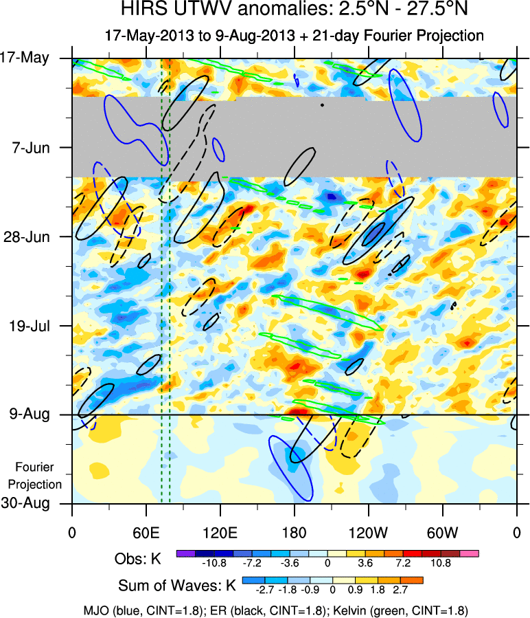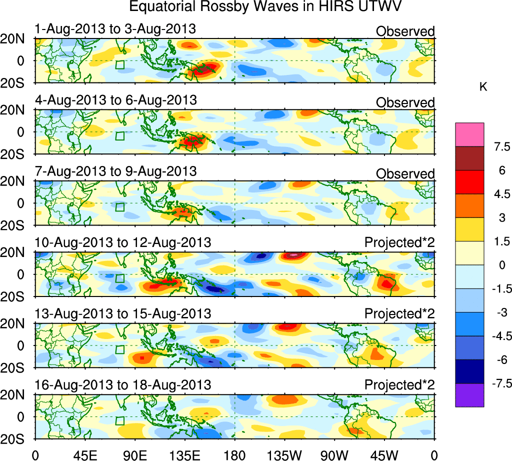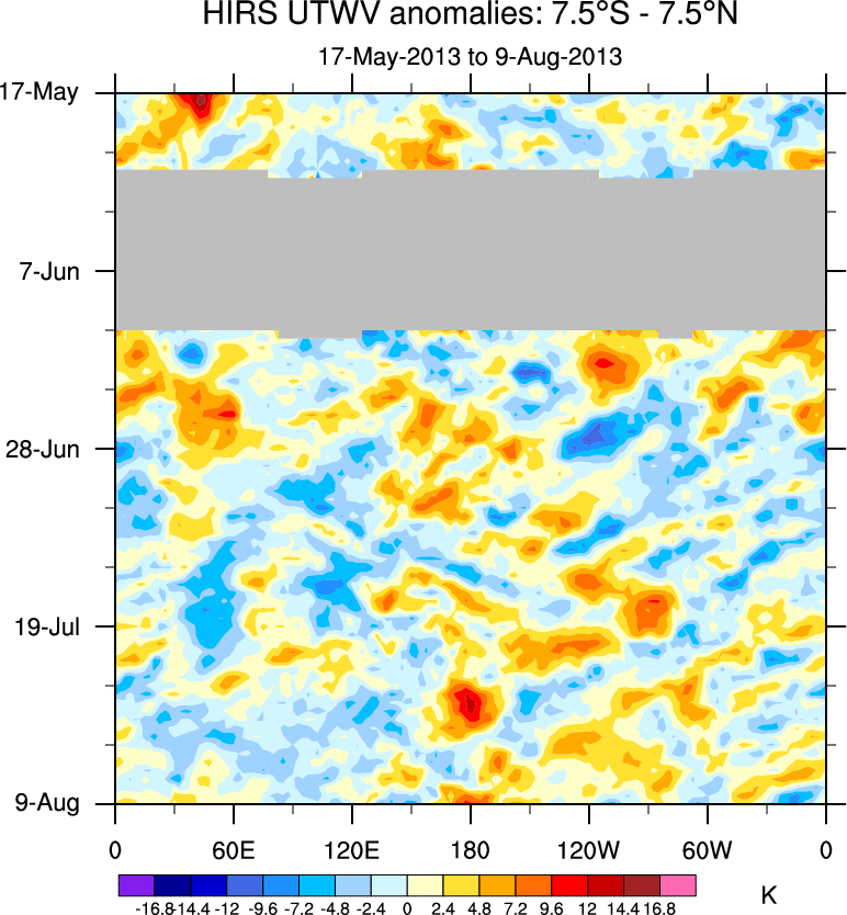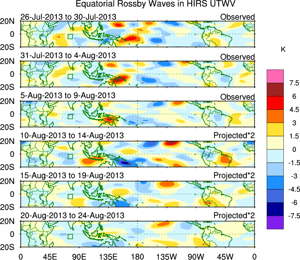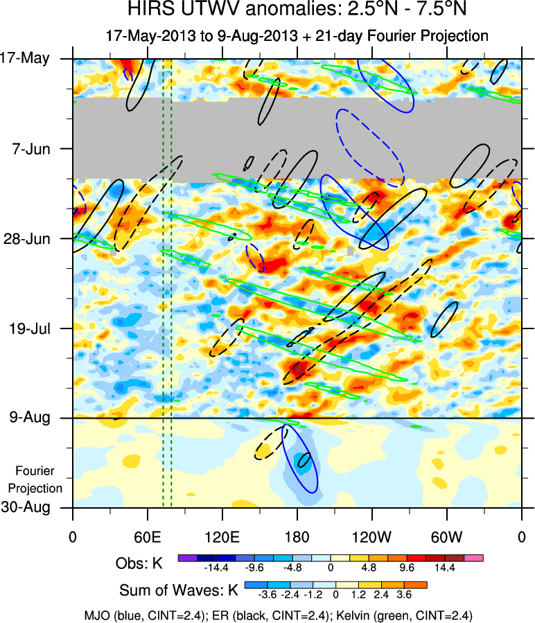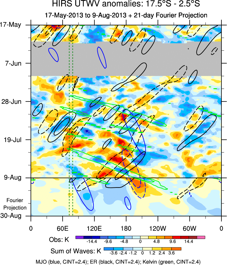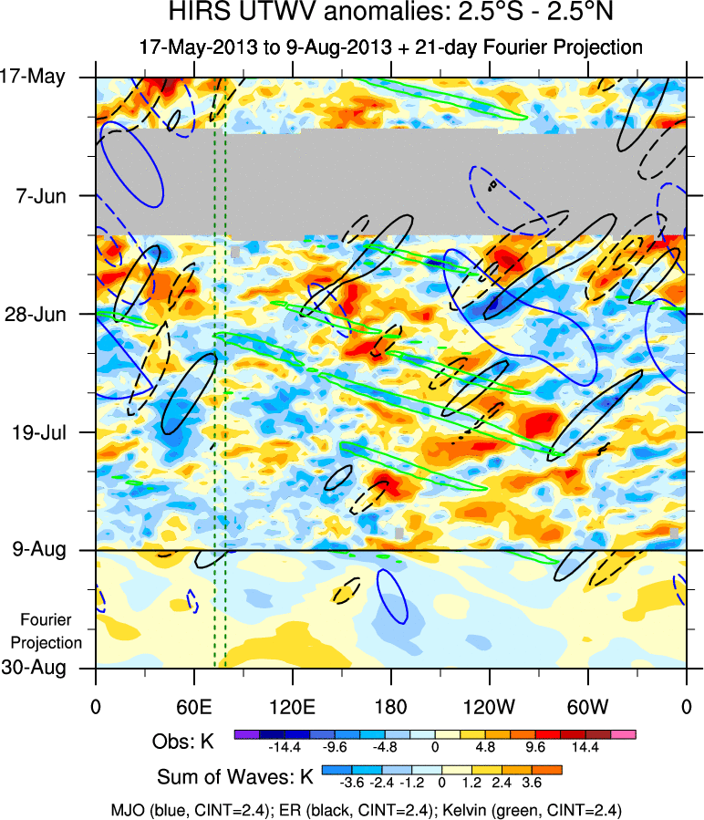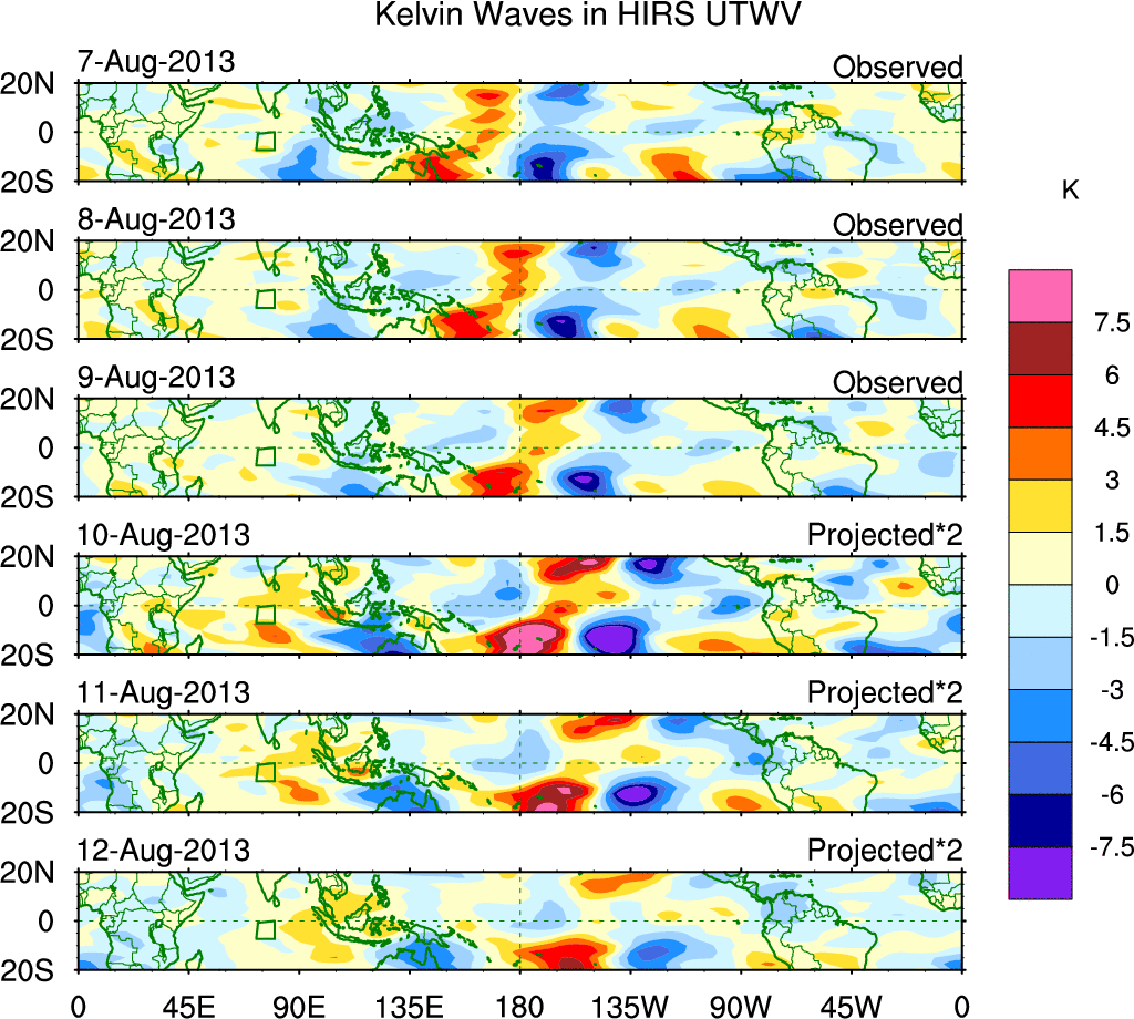 To identify tropical waves in near real-time, the OLR and UTWV data are filtered following Wheeler & Weickmann (2001 MWR). The daily anomalies are calculated using the first 3 harmonics of the seasonal cycle for 1979–2009. Missing values are then filled using linear interpolation in space and time. The most recent 365 days of anomalies are padded with 659 days of zeroes, and the result is filtered for each wave type.