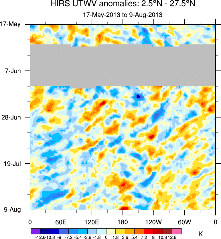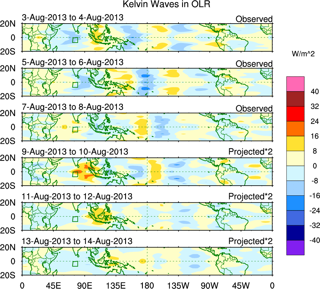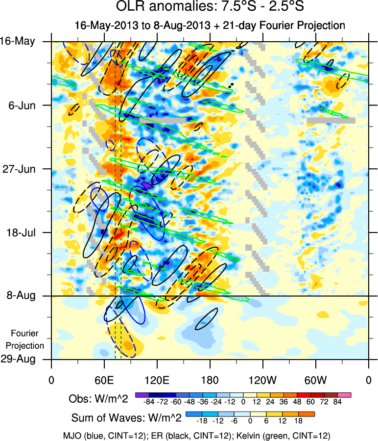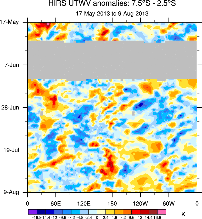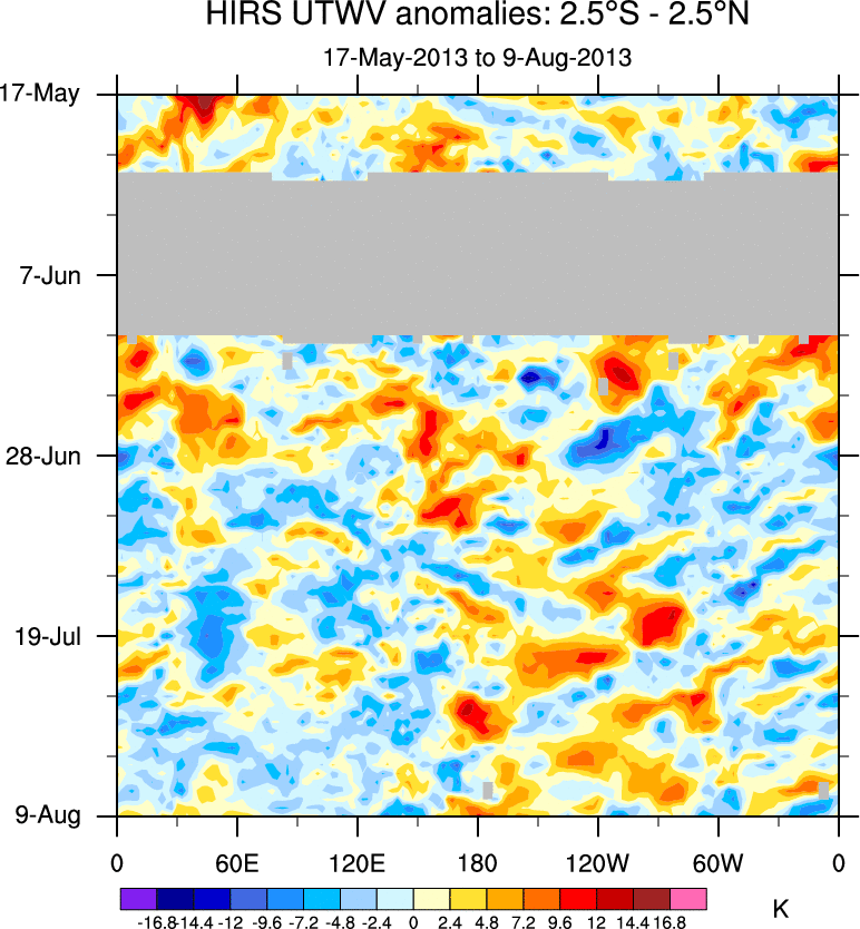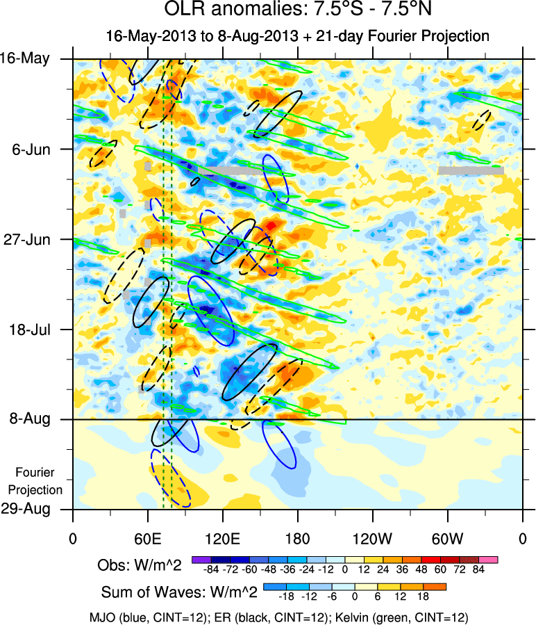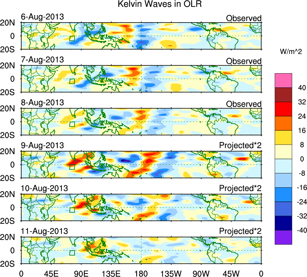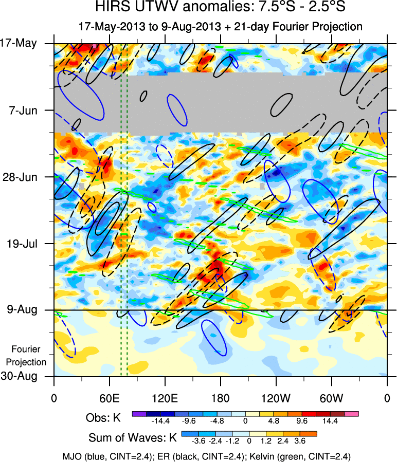 To identify tropical waves in near real-time, the OLR and UTWV data are filtered following Wheeler & Weickmann (2001 MWR). The daily anomalies are calculated using the first 3 harmonics of the seasonal cycle for 1979–2009. Missing values are then filled using linear interpolation in space and time. The most recent 365 days of anomalies are padded with 659 days of zeroes, and the result is filtered for each wave type.