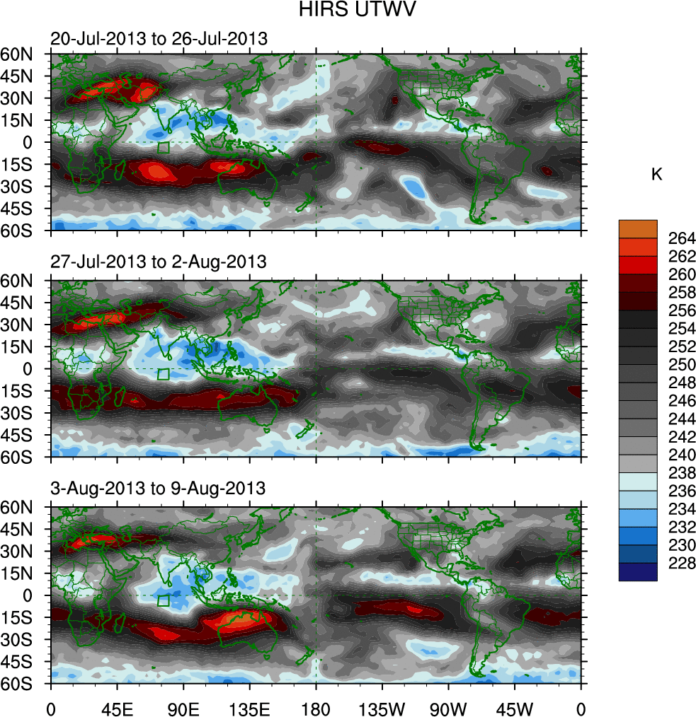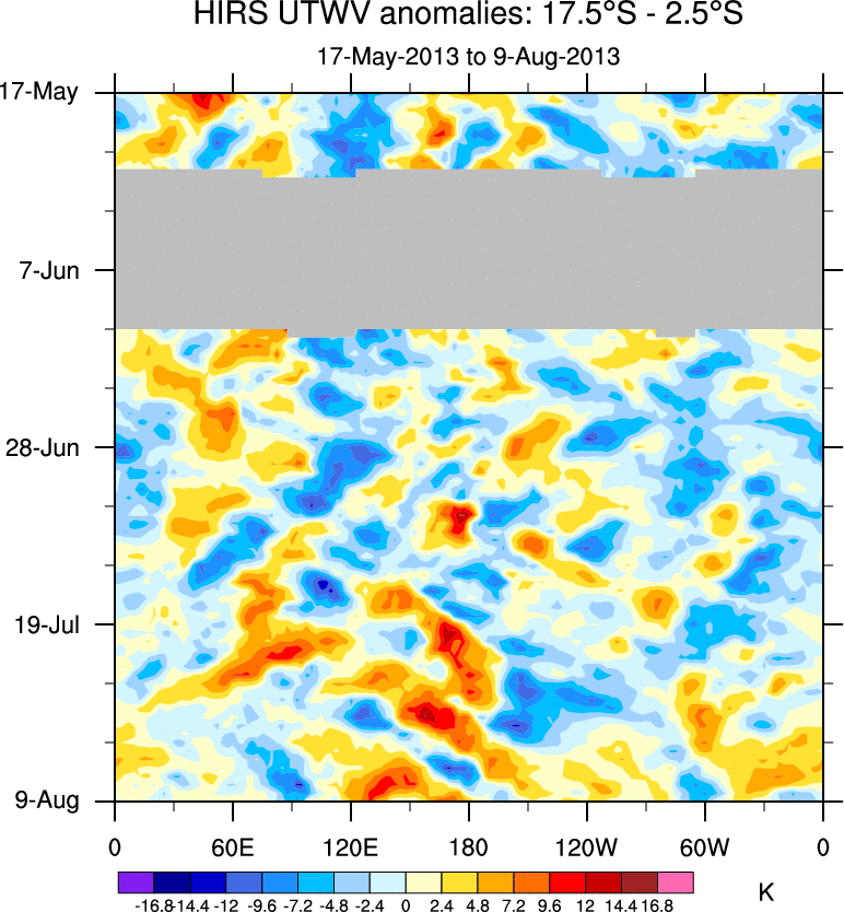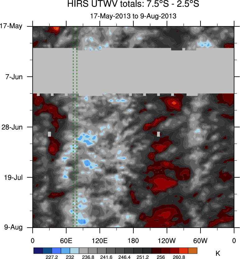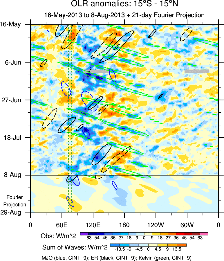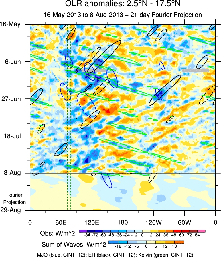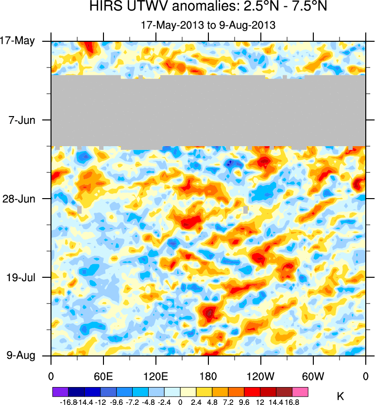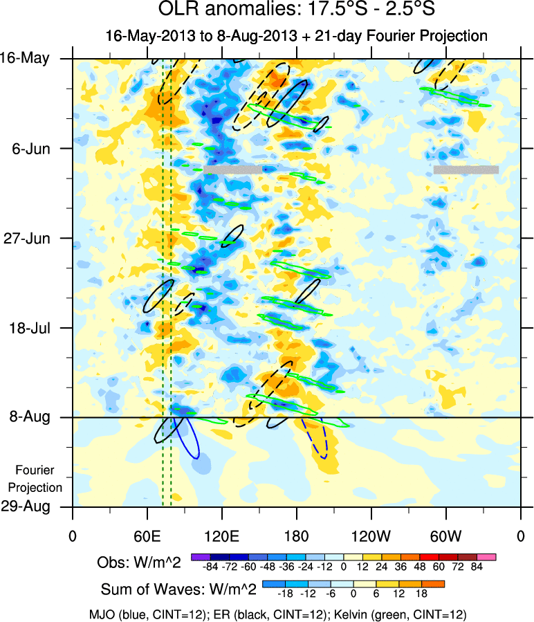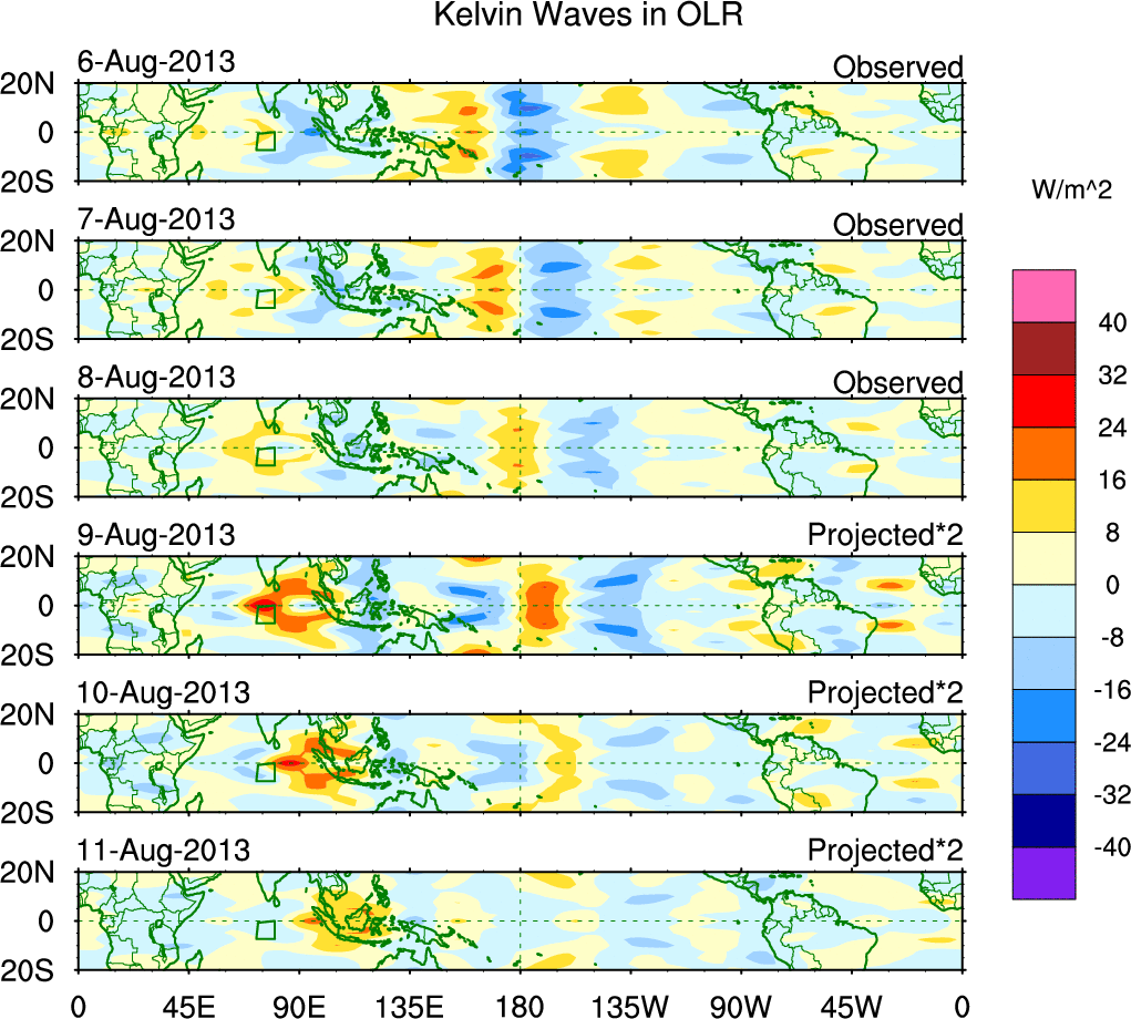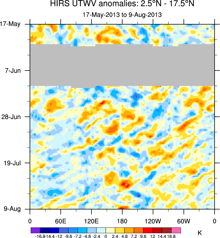 To identify tropical waves in near real-time, the OLR and UTWV data are filtered following Wheeler & Weickmann (2001 MWR). The daily anomalies are calculated using the first 3 harmonics of the seasonal cycle for 1979–2009. Missing values are then filled using linear interpolation in space and time. The most recent 365 days of anomalies are padded with 659 days of zeroes, and the result is filtered for each wave type.