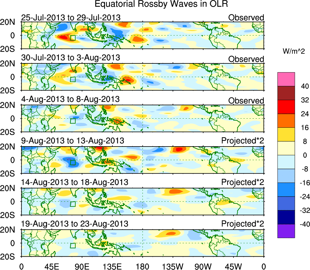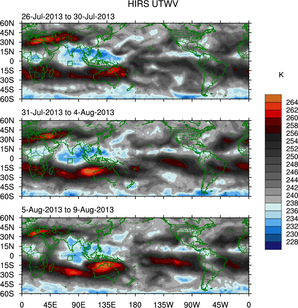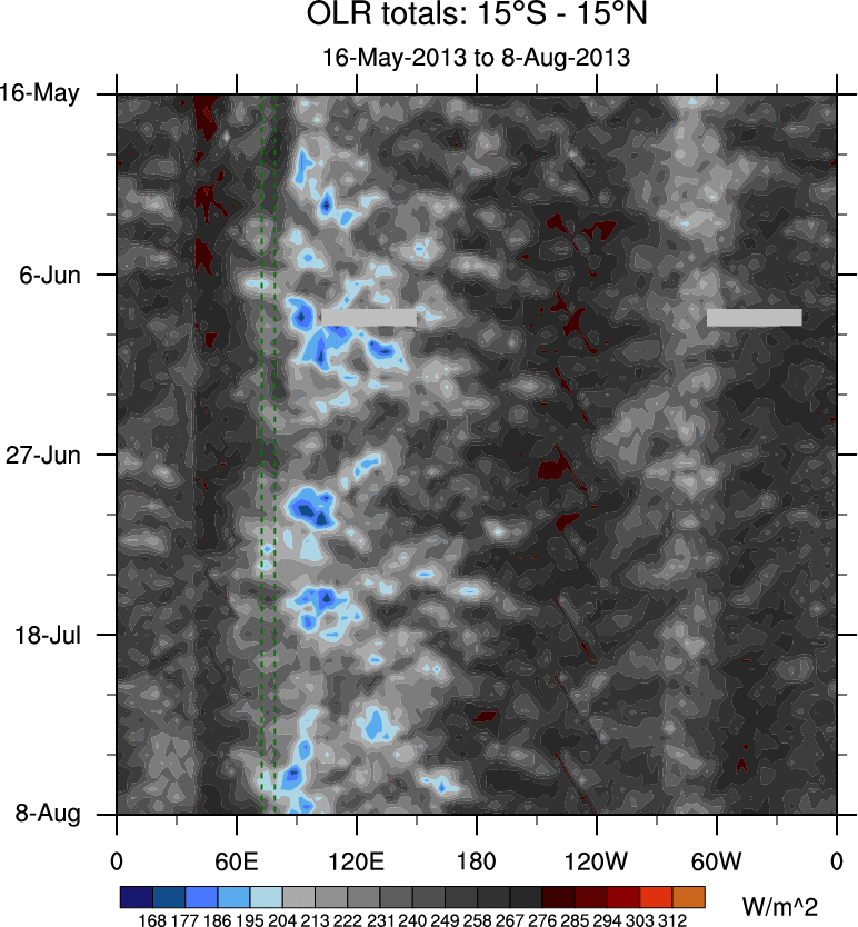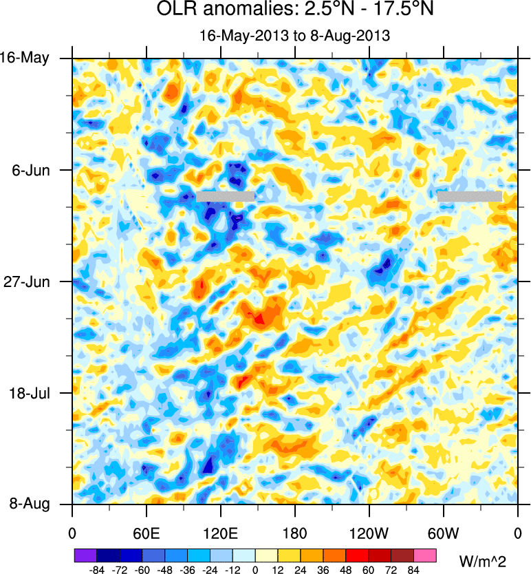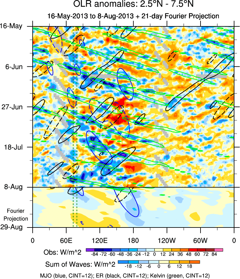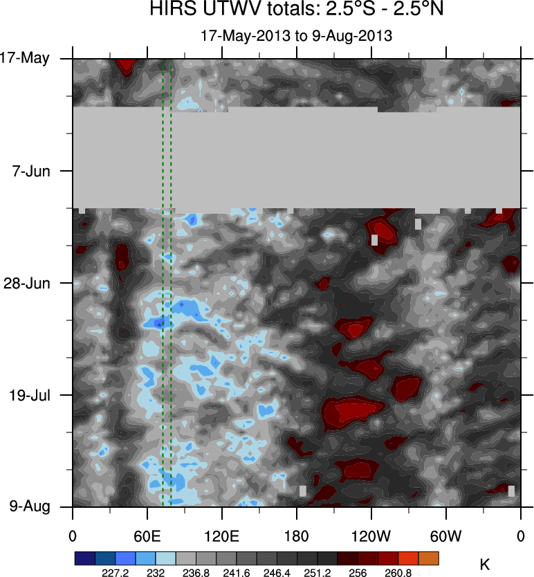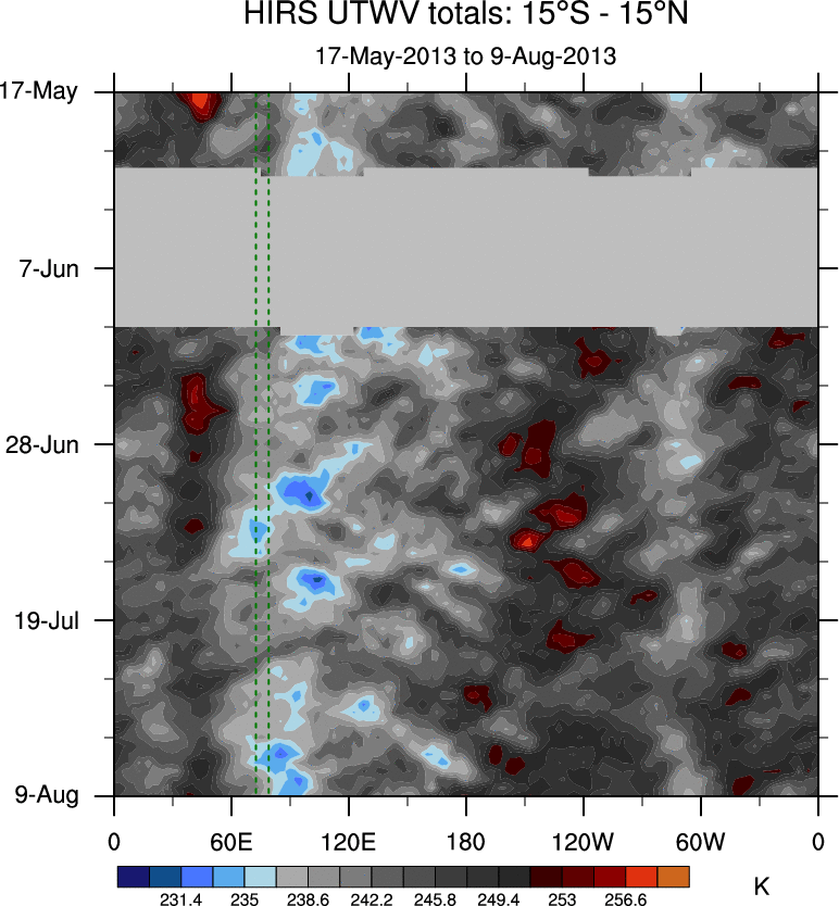 To identify tropical waves in near real-time, the OLR and UTWV data are filtered following Wheeler & Weickmann (2001 MWR). The daily anomalies are calculated using the first 3 harmonics of the seasonal cycle for 1979–2009. Missing values are then filled using linear interpolation in space and time. The most recent 365 days of anomalies are padded with 659 days of zeroes, and the result is filtered for each wave type.