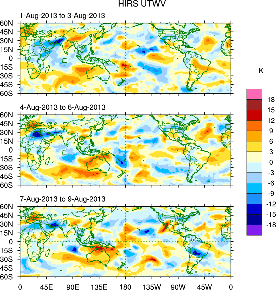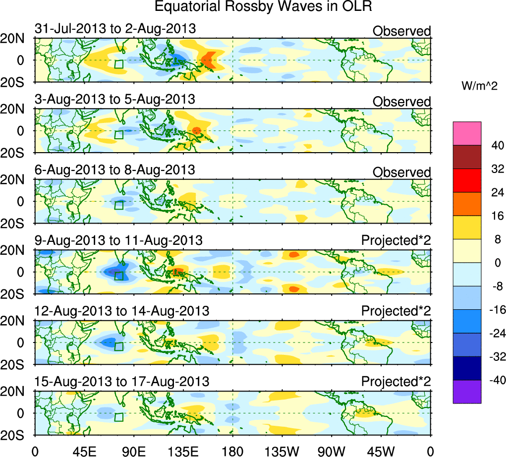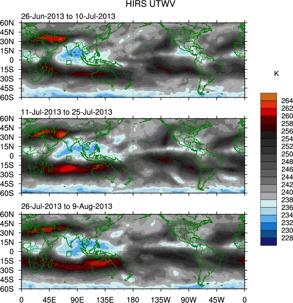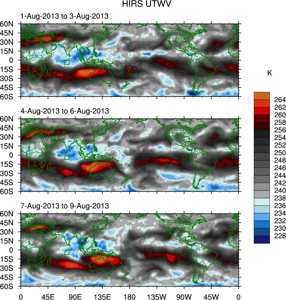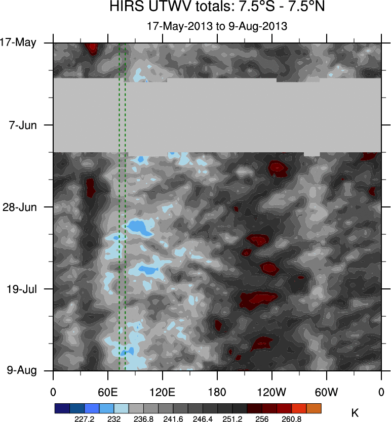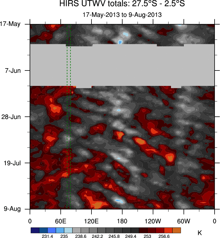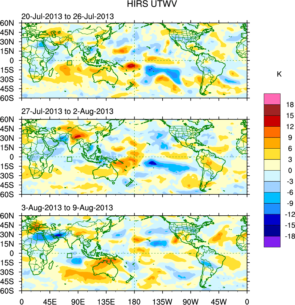 To identify tropical waves in near real-time, the OLR and UTWV data are filtered following Wheeler & Weickmann (2001 MWR). The daily anomalies are calculated using the first 3 harmonics of the seasonal cycle for 1979–2009. Missing values are then filled using linear interpolation in space and time. The most recent 365 days of anomalies are padded with 659 days of zeroes, and the result is filtered for each wave type.